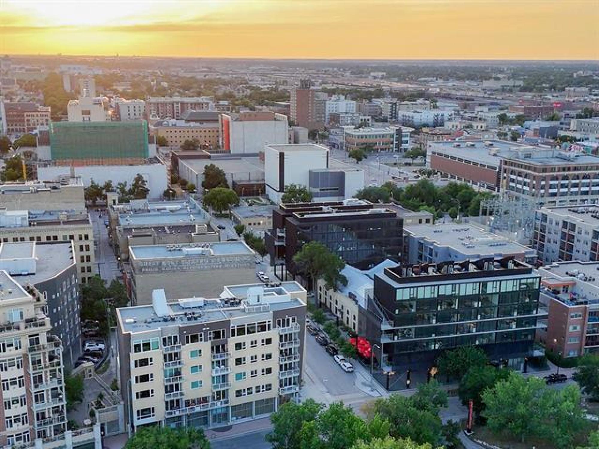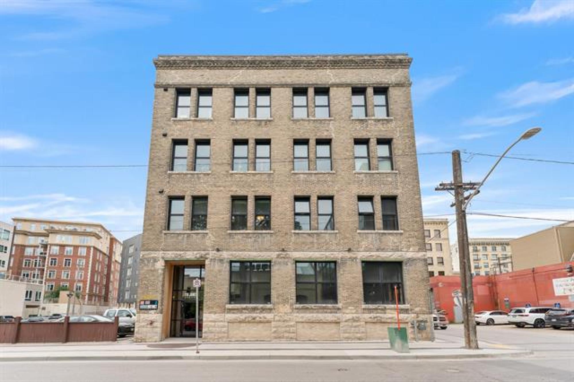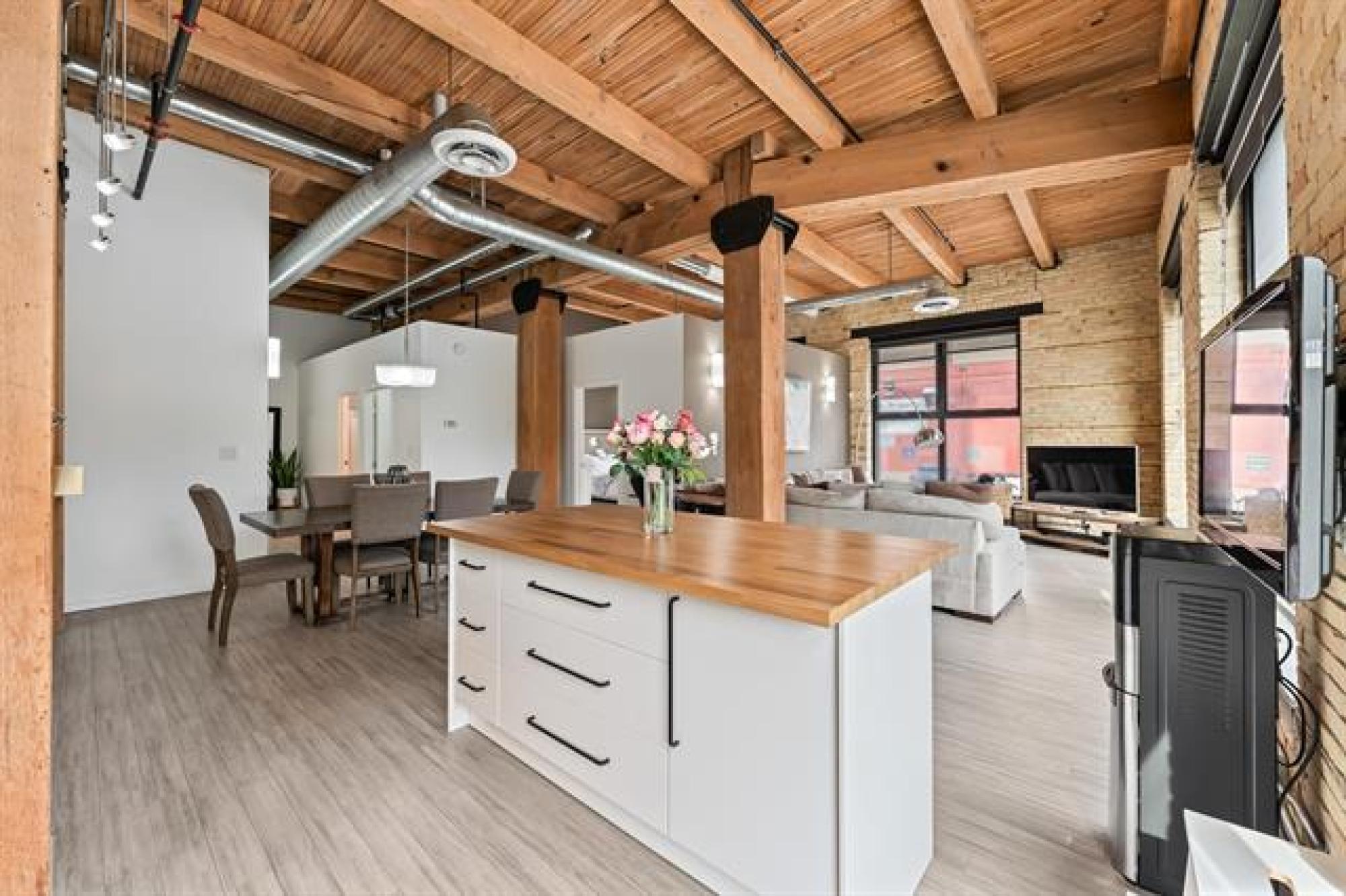 WOW! Now this is one super cool space! Almost 1200 sq foot corner Loft condo! Fabulous 7 foot floor to ceiling windows on 2 sides!! 10 foot ceilings! Exposed brick! Massive beams! Incredible wood ceiling! Very New York warehouse vibe with all the modern amenities one could hope for! Huge open feel that is flooded with light! Well appointed kitchen with large Island, perfect for entertaining and easily sits 4! Quartz counters! Tons of cabinets and counter space! Bedroom is spacious, has huge west facing windows and easily accommodates a king sized bed !Double closets and plenty of room for dressers! In suite laundry! Former display suite! Parking available right next door or across the street-(on availability). Perfect central and urban location as you are steps away from Restaurants, Theatres, Concert Hall, Bars, Brew Pubs, Coffee shops all the fun stuff that has everyone talking!! Festivals all summer long just a short walk away!Condo fees include almost all utilities! Large storage locker too! Pet friendly! Come check out why everyone loves life in the Exchange District! Check out the Youtube Video online!