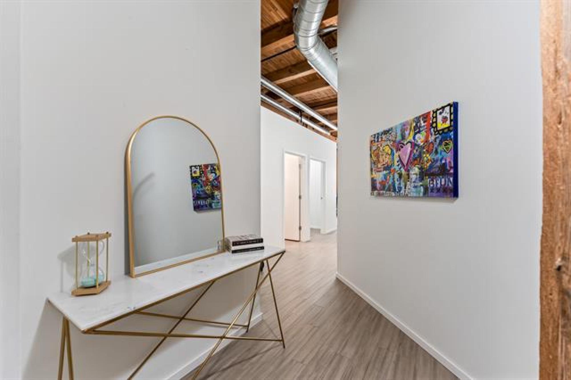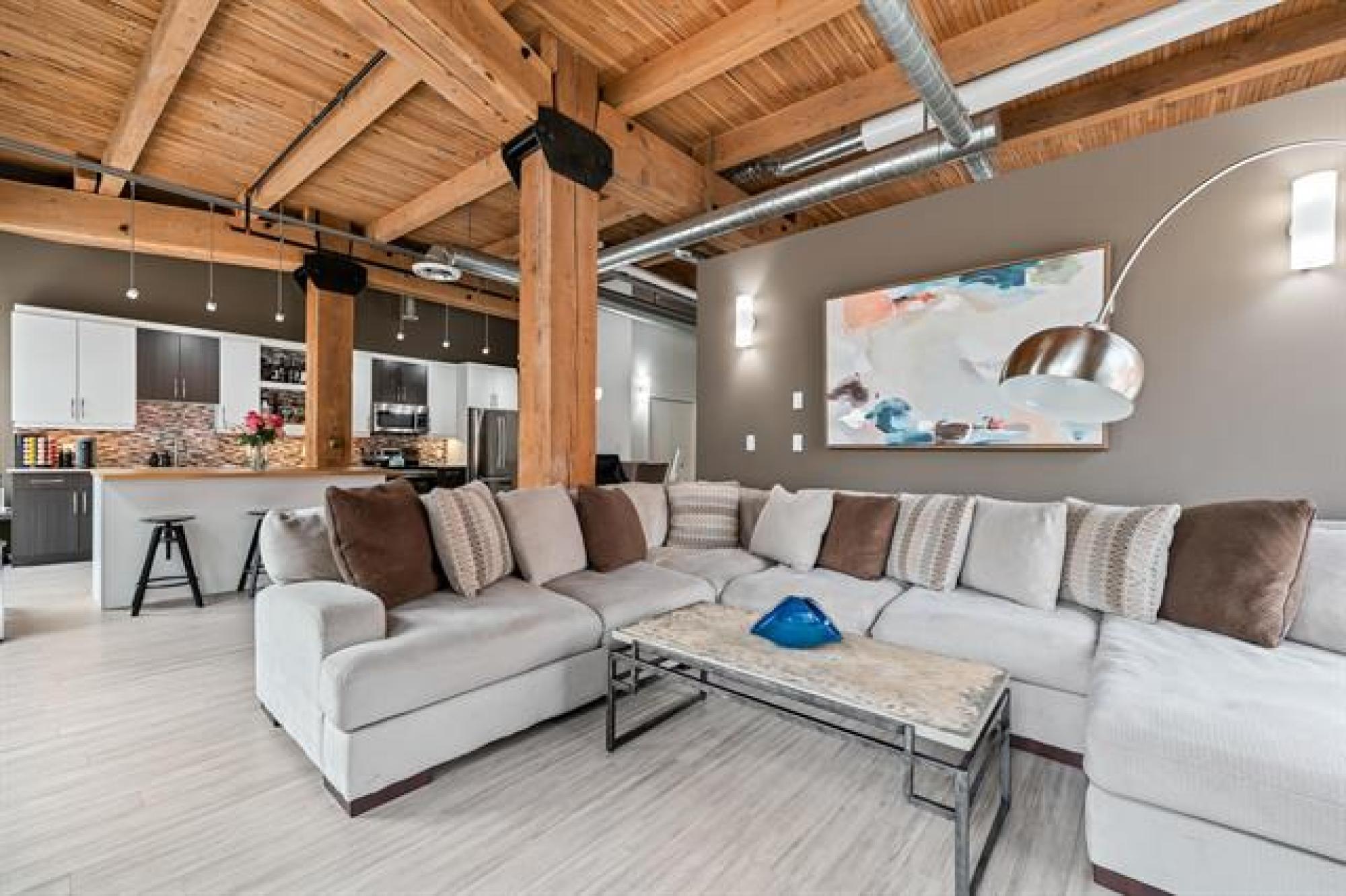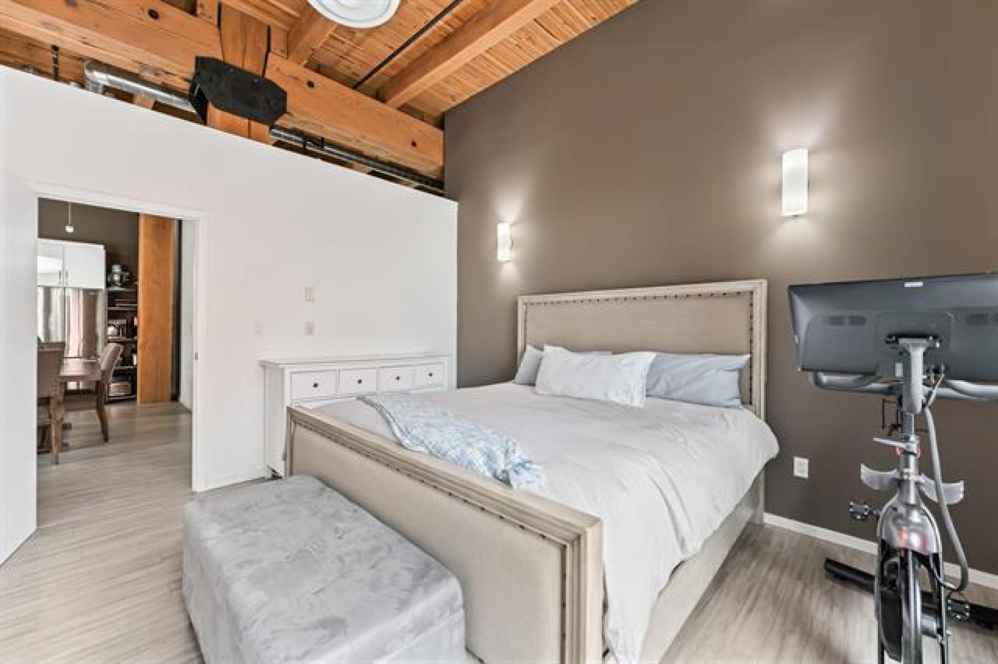 WOW! Now this is one super cool space! Almost 1200 sq foot corner Loft condo! Fabulous 7 foot floor to ceiling windows on 2 sides!! 10 foot ceilings! Exposed brick! Massive beams! Incredible wood ceiling! Very New York warehouse vibe with all the modern amenities one could hope for! Huge open feel that is flooded with light! Well appointed kitchen with large Island, perfect for entertaining and easily sits 4! Quartz counters! Tons of cabinets and counter space! Bedroom is spacious, has huge west facing windows and easily accommodates a king sized bed !Double closets and plenty of room for dressers! In suite laundry! Former display suite! Parking available right next door or across the street-(on availability). Perfect central and urban location as you are steps away from Restaurants, Theatres, Concert Hall, Bars, Brew Pubs, Coffee shops all the fun stuff that has everyone talking!! Festivals all summer long just a short walk away!Condo fees include almost all utilities! Large storage locker too! Pet friendly! Come check out why everyone loves life in the Exchange District! Check out the Youtube Video online!