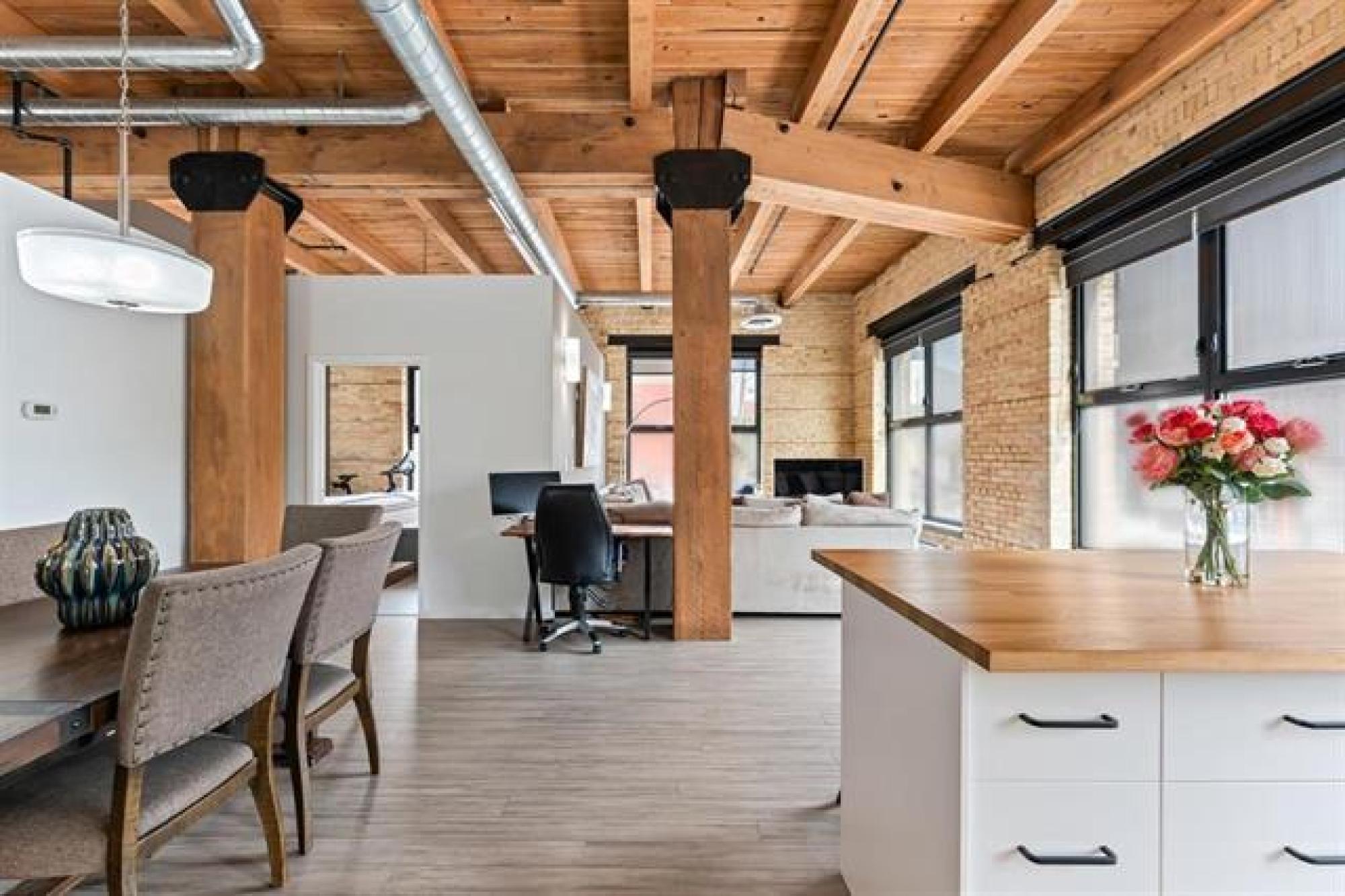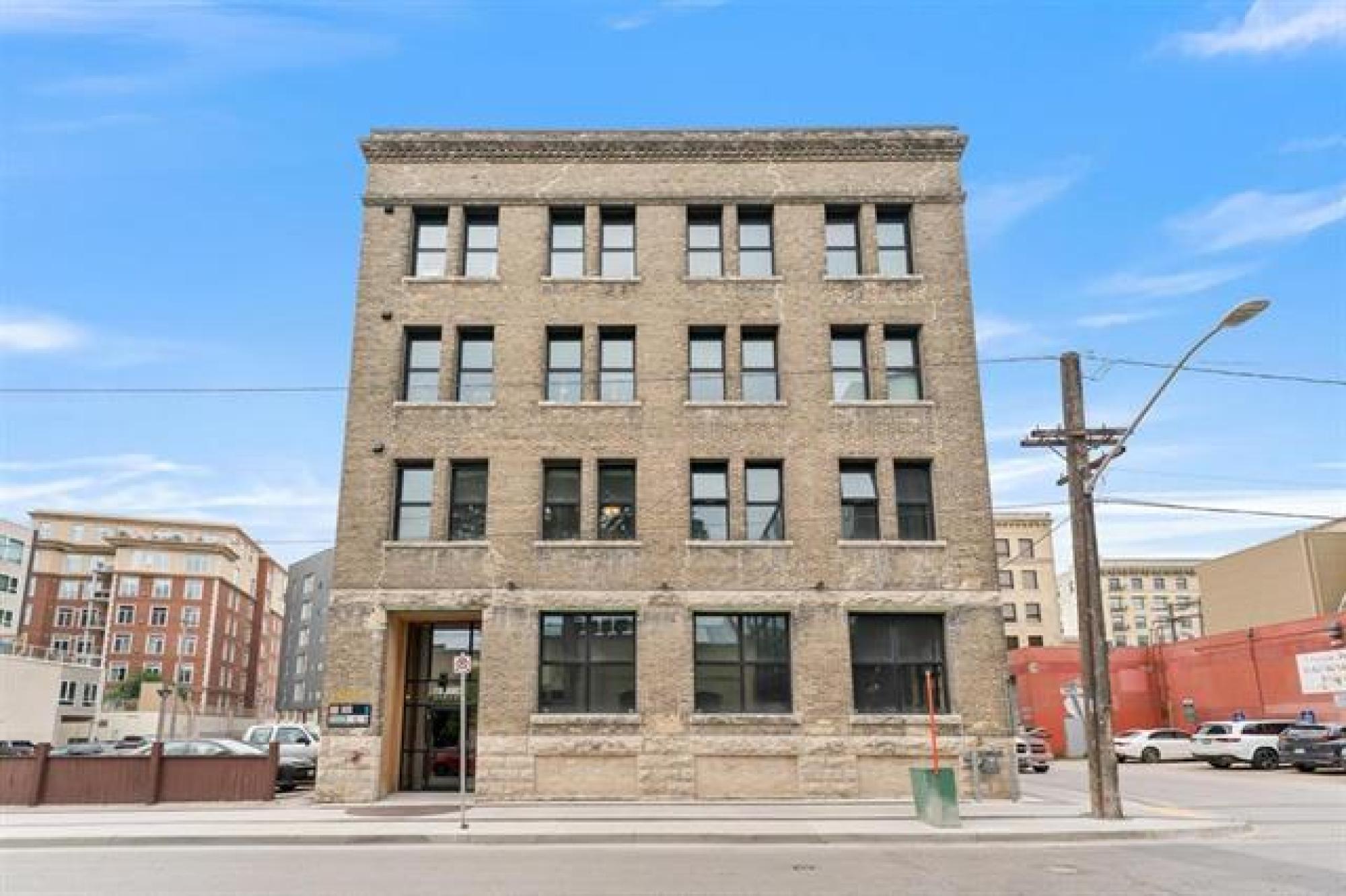 WOW! Can you say super cool? 1140 sq foot contemporary corner unit condo is flooded with light and floor to ceiling windows! Full of exposed brick and huge Fir beams! This 1 bedroom 1 bath condo is sure to impress! Super spacious open concept! This former Display suite will not disappoint-same owners for 9 years! Huge Island in the kitchen and tons of cabinet/counter space. Quartz and butcher block counters!! Spacious primary bedroom easily accommodates a King sized bed, has double closets and huge windows! This condo conversion offers all the modern amenities such as central air and new windows throughout but keeps the vibe of turn of the Century features! Condo fees include almost all utilities except internet! Steps away from the Theater District,The Centennial Concert Hall, coffee shops, tons of great restaurants bars and shops! Convenience stores,Comedy clubs and a new Cigar Bar opening soon! Amazing sense of community in the area,with always lots going on! Walk along the River path to the Forks with newly added Fitness stops and water fountains! Come check out what all the hype is about in Winnipegs Exchange District! You will love it!