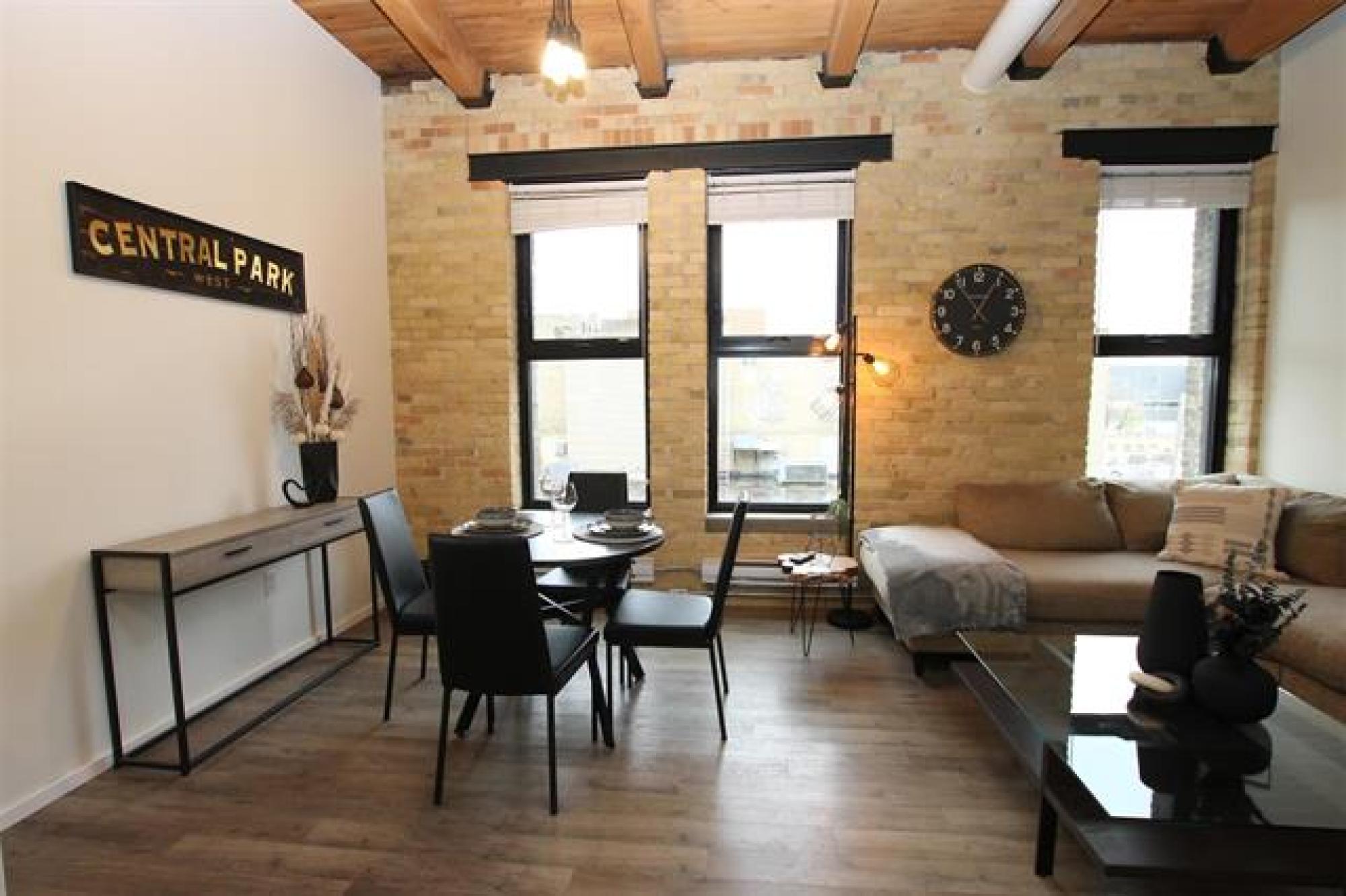 Showings start November 3. Live in the exchange! Enjoy many amenities like waterfront drive, greenspace, popular restaurants, lounges, baseball, concerts, events, and more only steps away. Featuring a loft style design with exposed brickwork & beams, soaring ceiling, and large windows for an airy feel. Classic white kitchen with a tiled back splash and SS fridge and stove, that is open to the living and dining areas. In-suite laundry & pet friendly! Condo fee of $511.25/m includes heat, water, electricity, and storage locker. Both TV's and couch can be included. Parking available in the lot next door. Make your move!