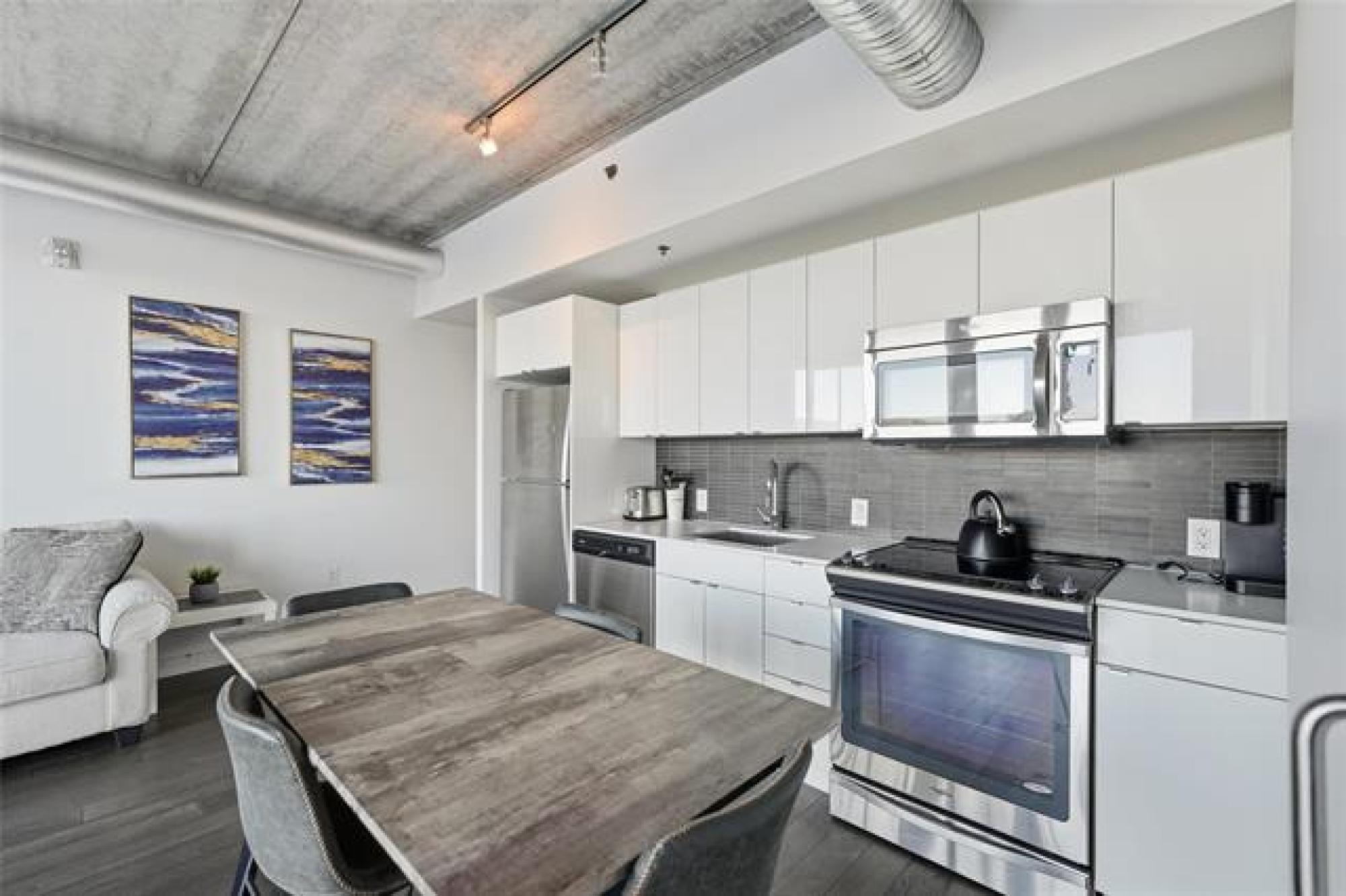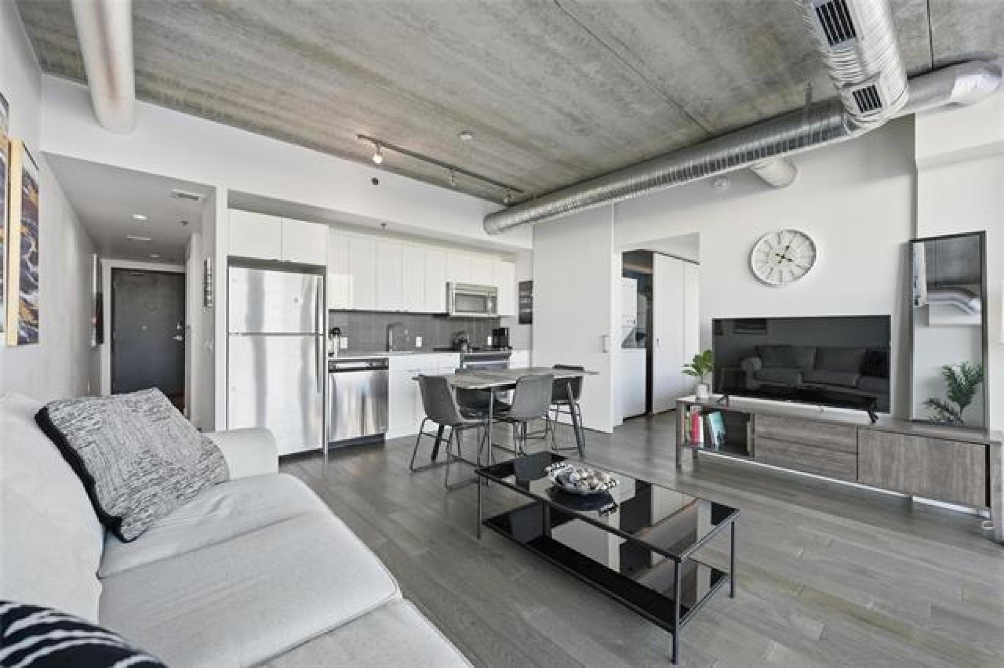 Stunning 587 sqft 1-bedroom condo offering incredible city views and an unbeatable downtown lifestyle. This modern concrete building features floor-to-ceiling windows that flood the space with natural light, sleek quartz countertops, stainless steel appliances, and convenient in-suite laundry. The open-concept layout is perfectly designed to maximize space, style, and comfort. Step out onto your private balcony to relax, unwind, and take in the vibrant city scenery. The building itself is packed with impressive amenities, including a beautiful rooftop terrace and lounge, BBQ area, gym, and many more great features designed to elevate your everyday living. Whether you’re hosting friends, working out, or enjoying a quiet moment above the city, there’s something here for everyone. This condo is an ideal opportunity for a young professional looking for a modern urban home, or an investor seeking a highly desirable, low-maintenance property. Downtown living at its best—close to restaurants, shopping, entertainment, and everything the city has to offer.