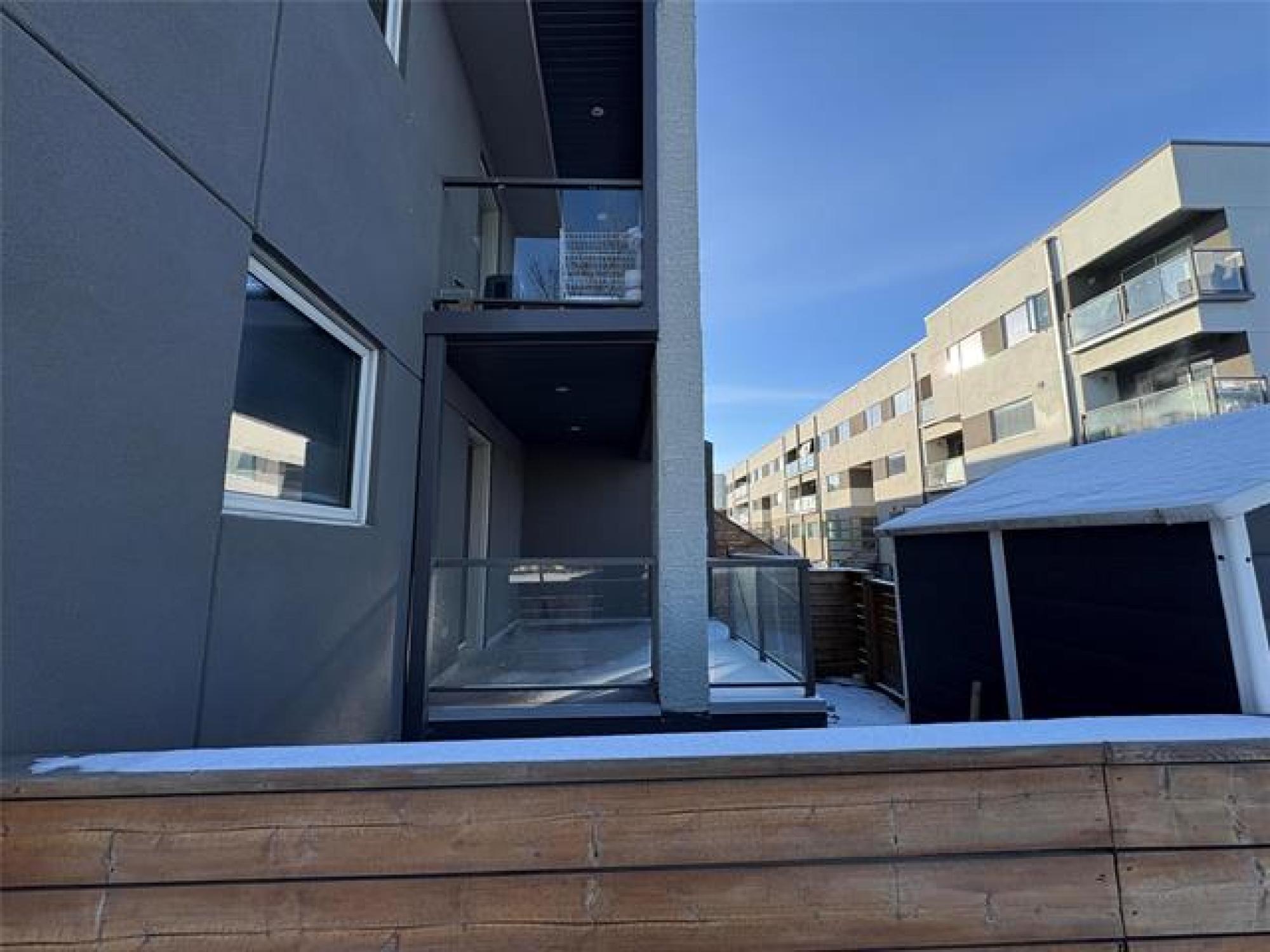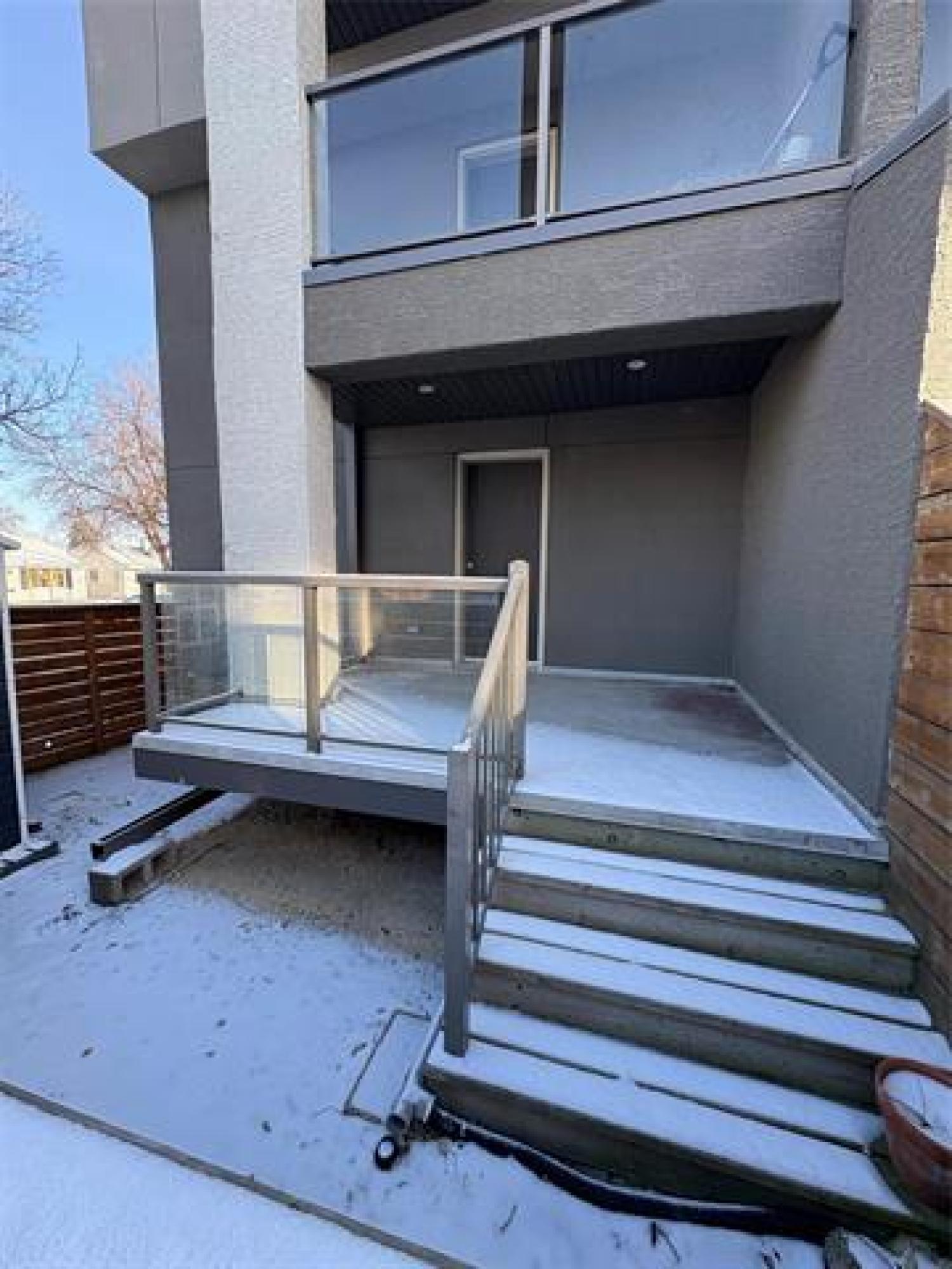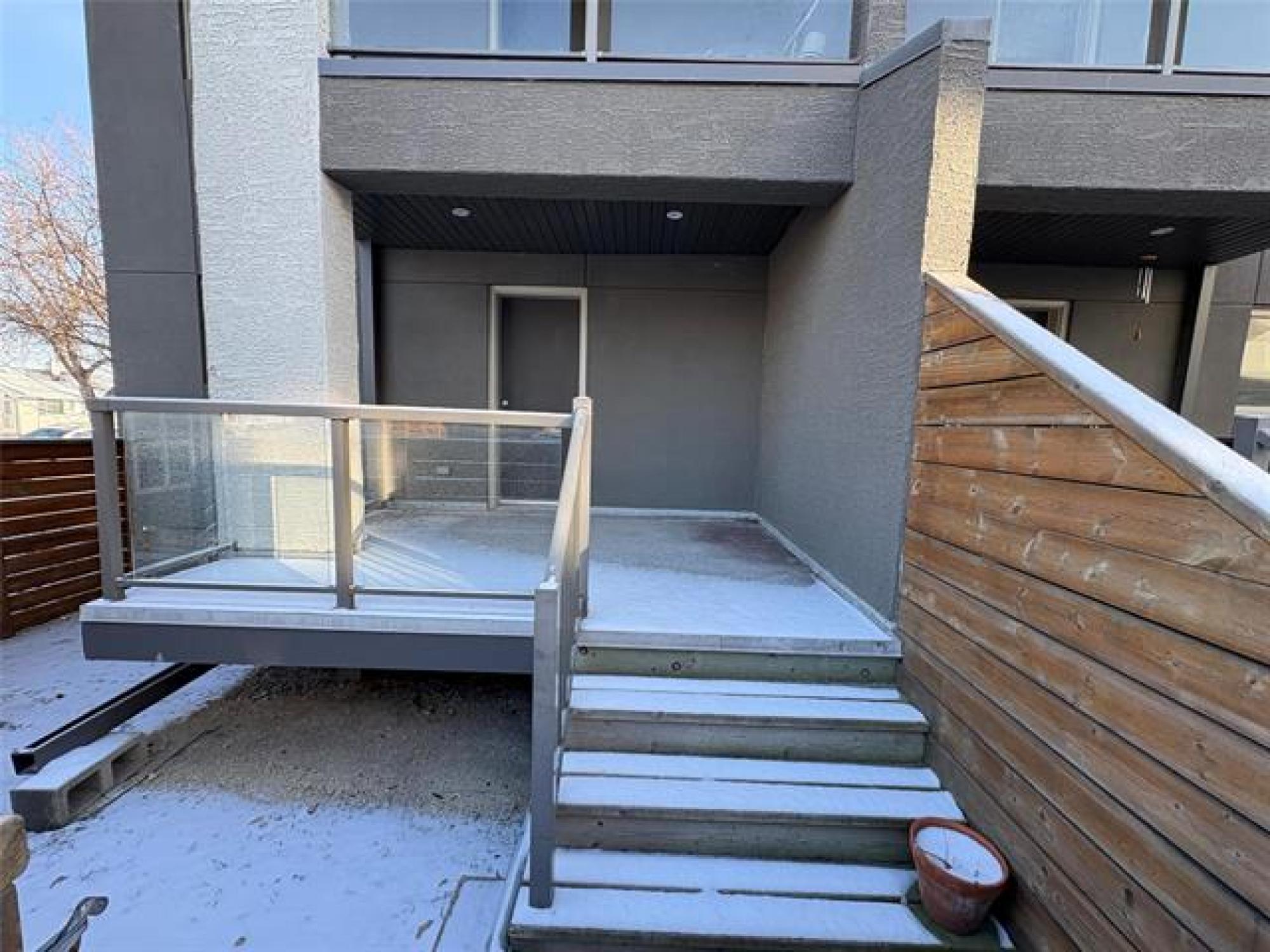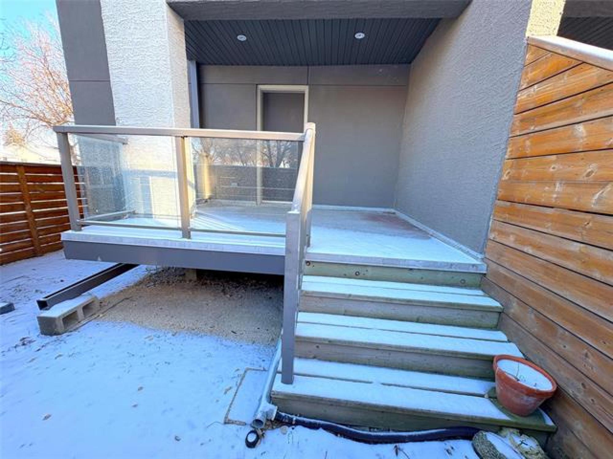 Showing starts now, offers as received. Bright, modern two bedroom, one and a half bathroom home with an open concept main floor and plenty of natural light. The living area features laminate flooring, an electric fireplace, pre wired rear speakers, 12 pot lights with dimmers for a warm, adjustable setting. The kitchen includes a large island, stylish backsplash, single partition sink with a modern tap, and matching stainless steel appliances. All countertops are quartz, with a wall backsplash in the lower level three piece washroom. Enjoy comfort with in suite laundry. Very efficient geothermal heating and cooling, electric hot water tank, triple pane windows, and a central fire alarm system. Front and back door guards add extra peace of mind. All windows have aluminum blinds. The main bathroom offers an updated rain showerhead. A deck with glass and aluminum railing and special vinyl flooring overlooks the fenced yard. There is also an outdoor shed for extra storage. Extra wide parking stall is in front of the unit. Close to transit, Youngs Supermarket, Sisler High School, Lord Nelson School, and shopping. Ideal for first time buyers or downsizing. Book your viewing today for this move in ready home