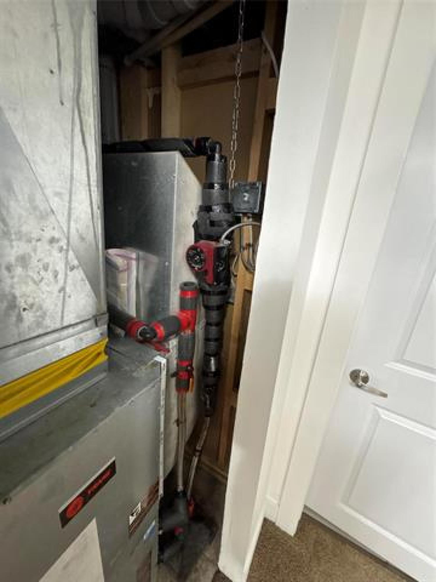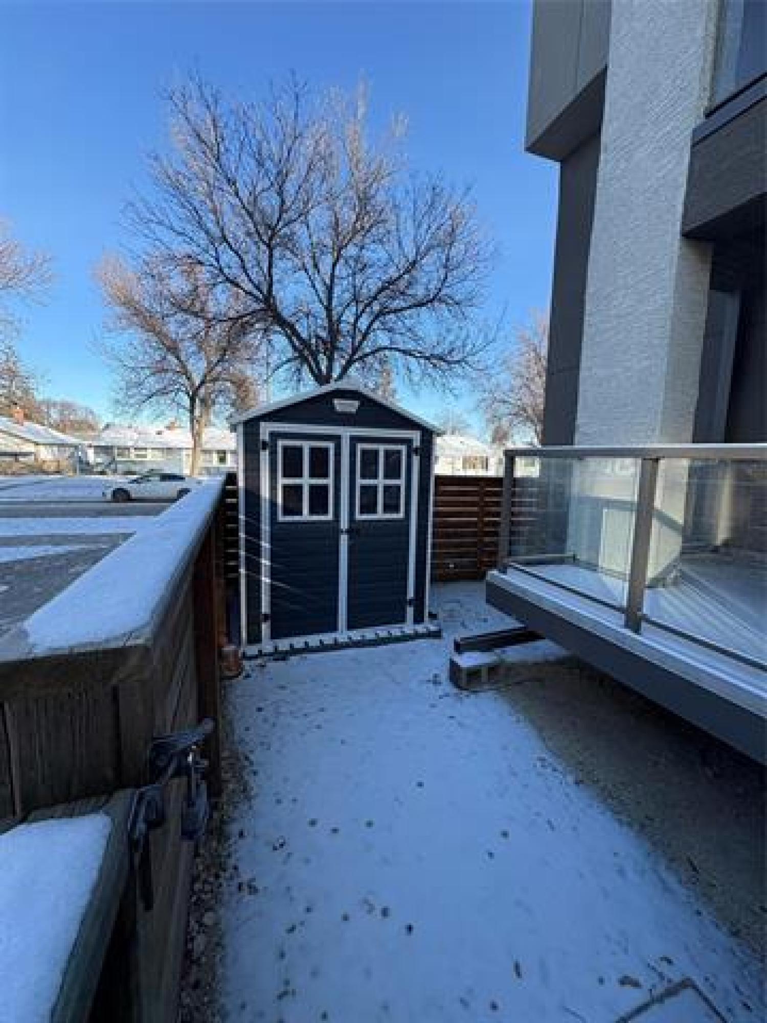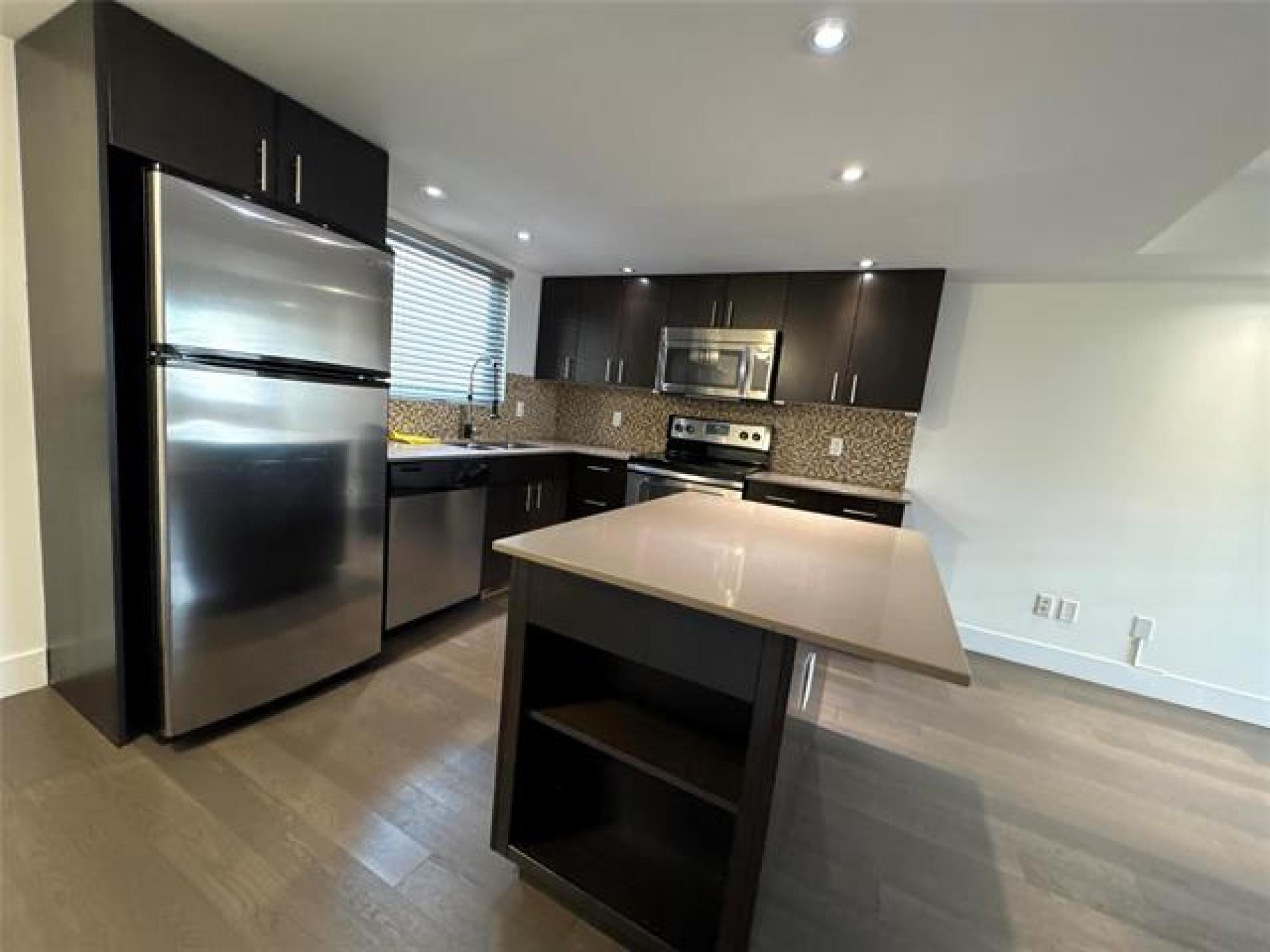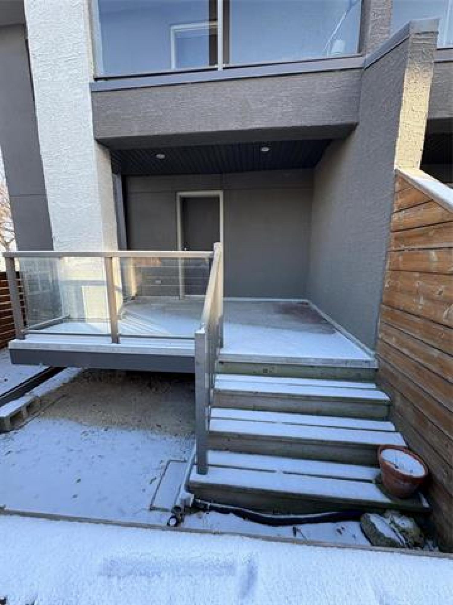 Showing starts now, offers as received. Bright, modern two bedroom, one and a half bathroom home with an open concept main floor and plenty of natural light. The living area features laminate flooring, an electric fireplace, pre wired rear speakers, 12 pot lights with dimmers for a warm, adjustable setting. The kitchen includes a large island, stylish backsplash, single partition sink with a modern tap, and matching stainless steel appliances. All countertops are quartz, with a wall backsplash in the lower level three piece washroom. Enjoy comfort with in suite laundry. Very efficient geothermal heating and cooling, electric hot water tank, triple pane windows, and a central fire alarm system. Front and back door guards add extra peace of mind. All windows have aluminum blinds. The main bathroom offers an updated rain showerhead. A deck with glass and aluminum railing and special vinyl flooring overlooks the fenced yard. There is also an outdoor shed for extra storage. Extra wide parking stall is in front of the unit. Close to transit, Youngs Supermarket, Sisler High School, Lord Nelson School, and shopping. Ideal for first time buyers or downsizing. Book your viewing today for this move in ready home