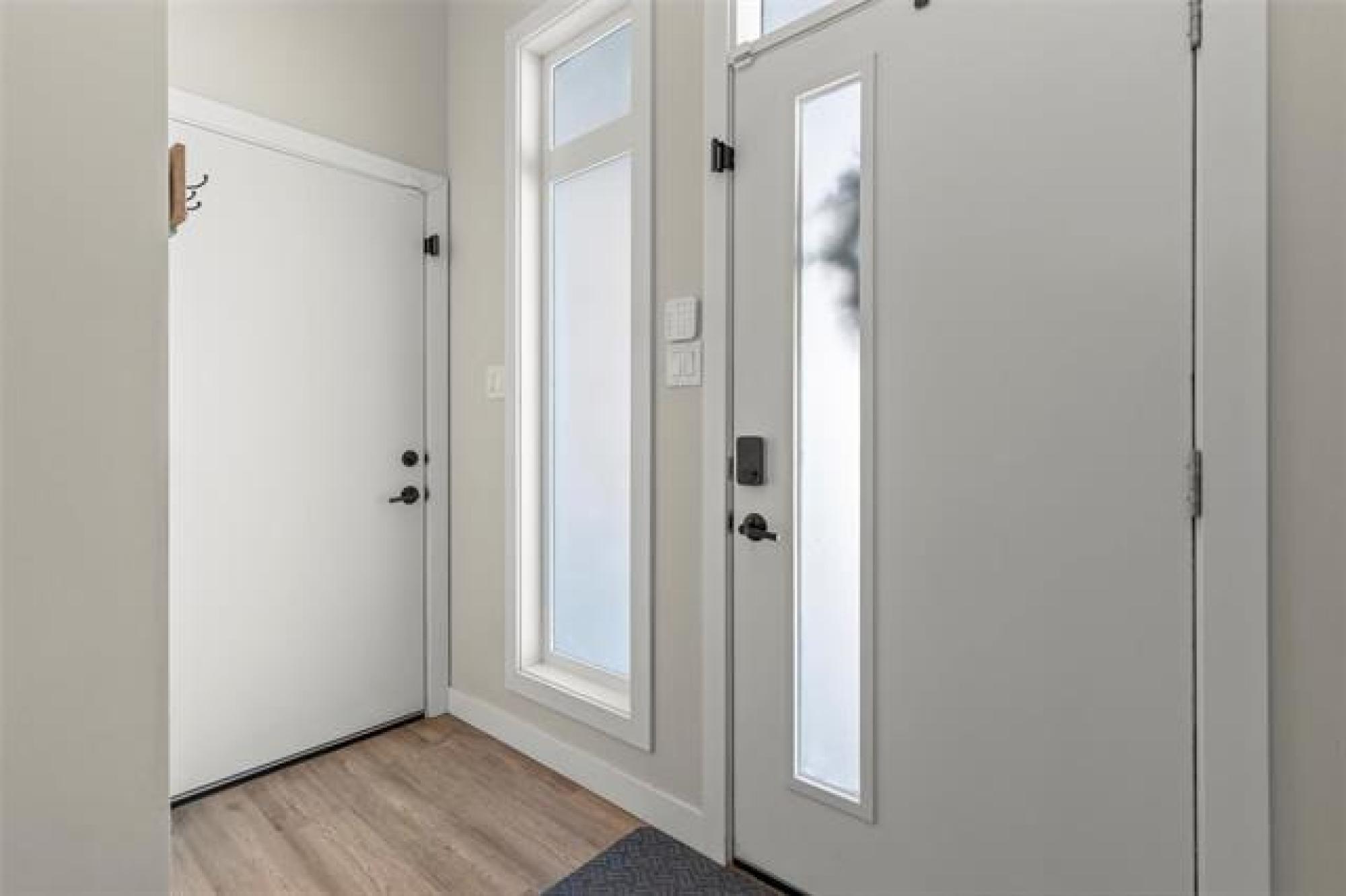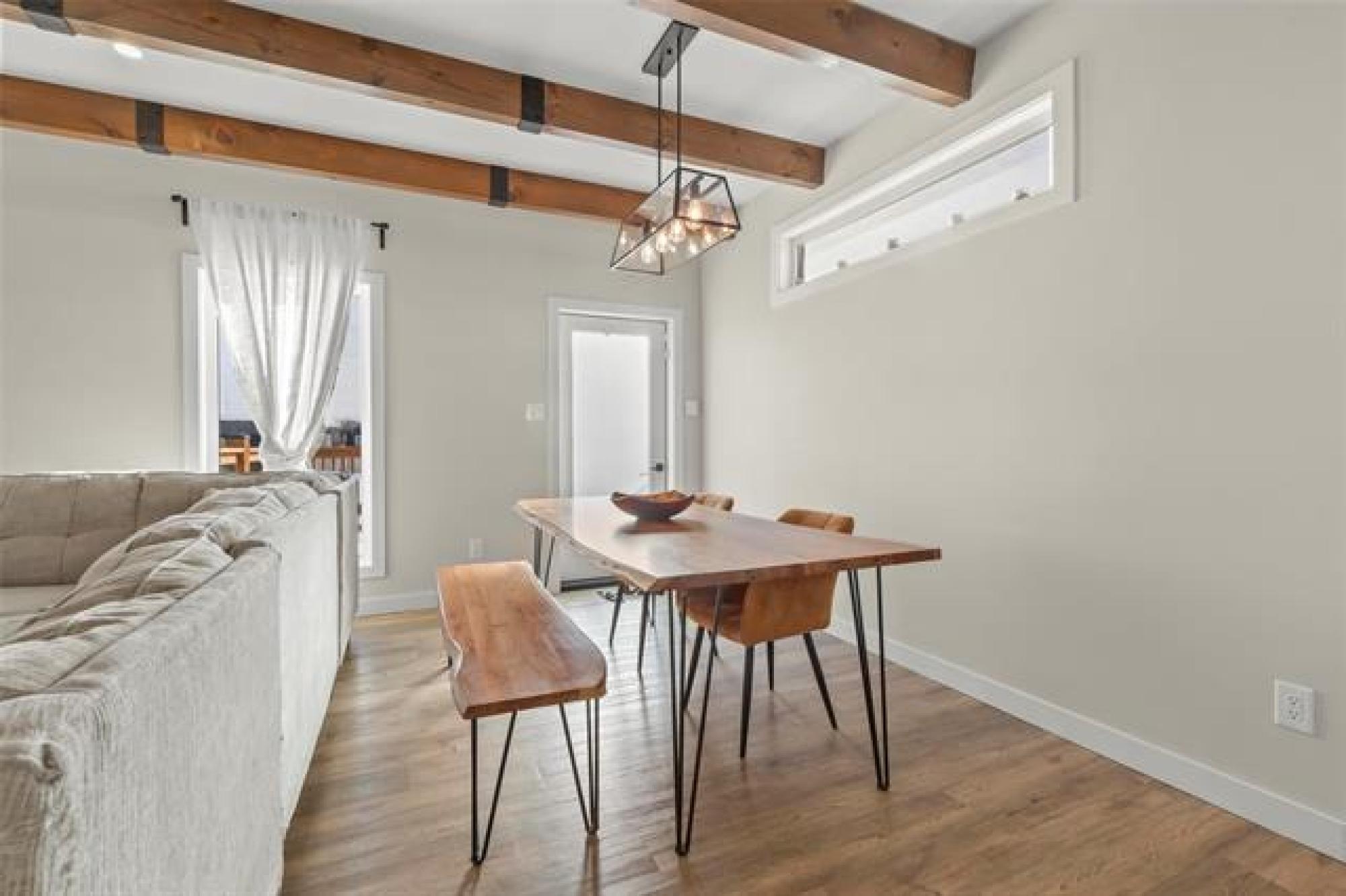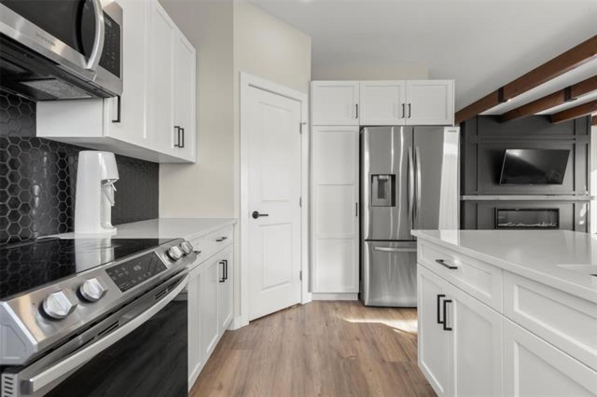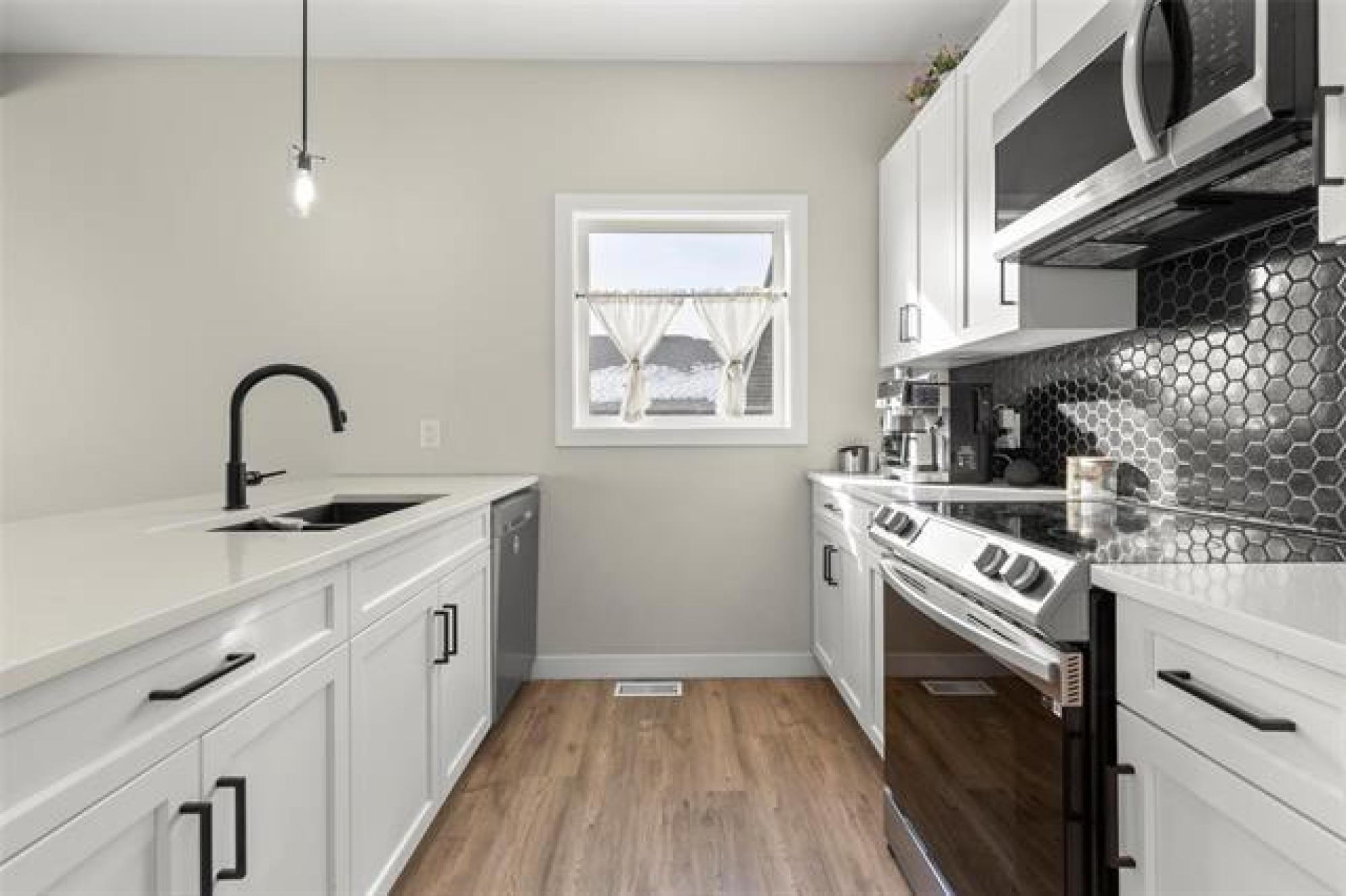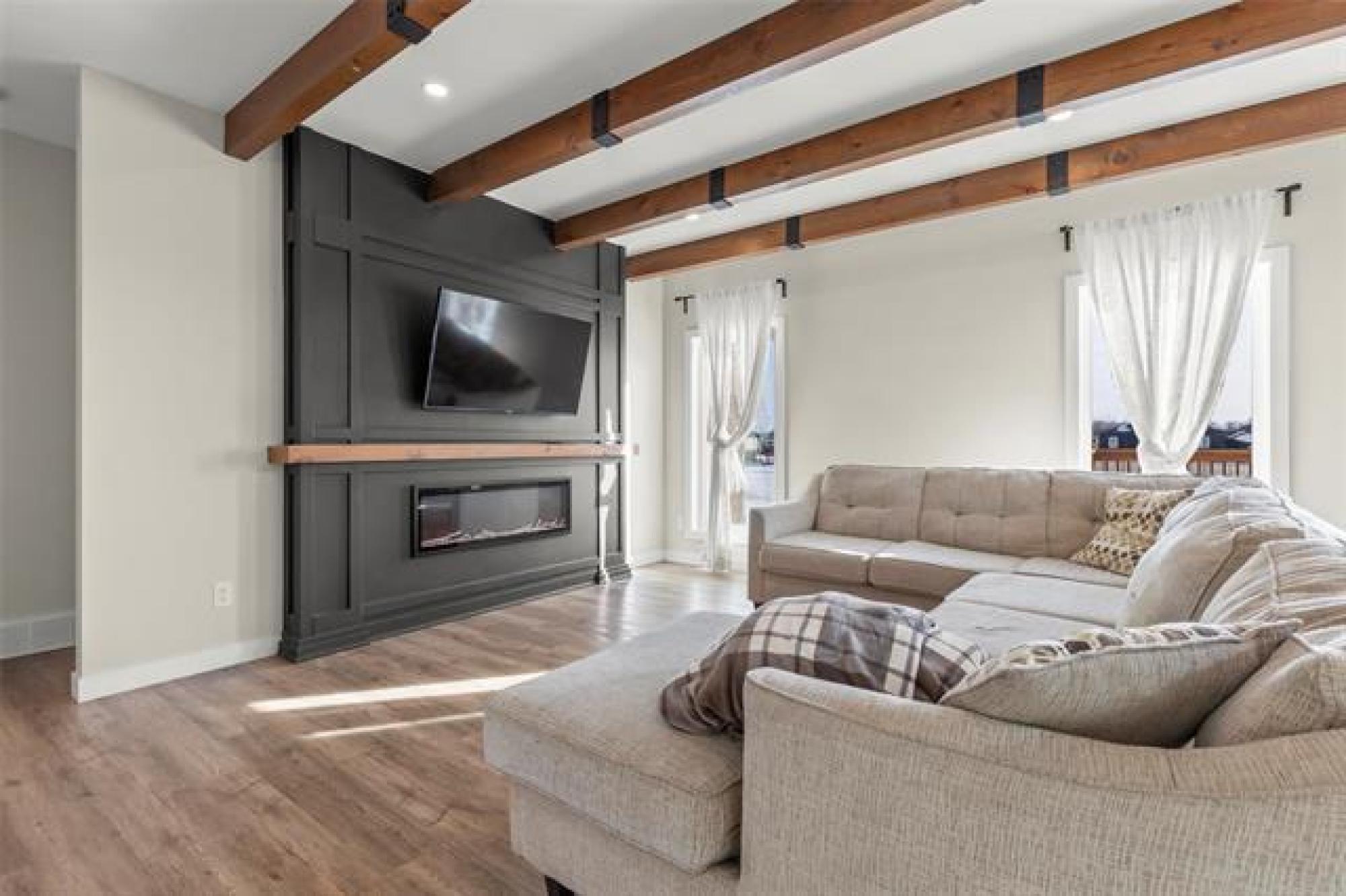 Beautiful contemporary 2 bedroom, 2 bathroom bi-level backing onto greenspace and located near park and treed river walking trails. Stylish galley kitchen features quartz countertops, tiled backsplash, soft-close doors and drawers, and a walk-in pantry. Bright living room offers a feature wall, electric fireplace, and striking ceiling beams. Primary bedroom includes double closets and a 4-piece ensuite. Second bedroom and 4 piece main bath complete the main floor. Outside you'll find a fantastic two-tier deck with firepit area. Other features include hard surface flooring throughout the main floor, central A/C, water softener, ICF basement and double attached garage. Excellent curb appeal with composite, stucco, and brick exterior, black windows, and faux wood accents.