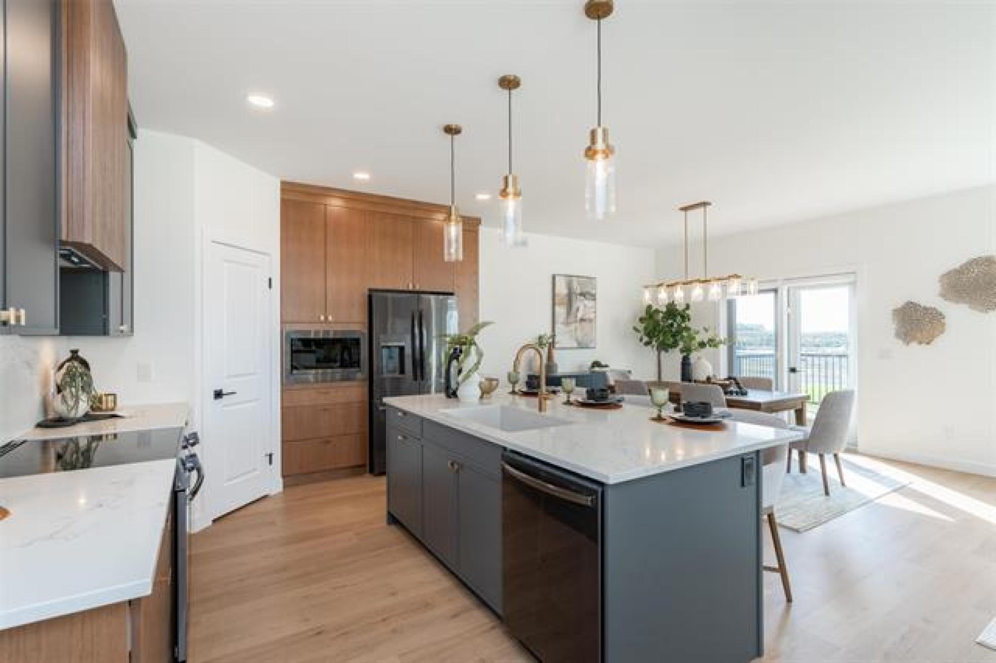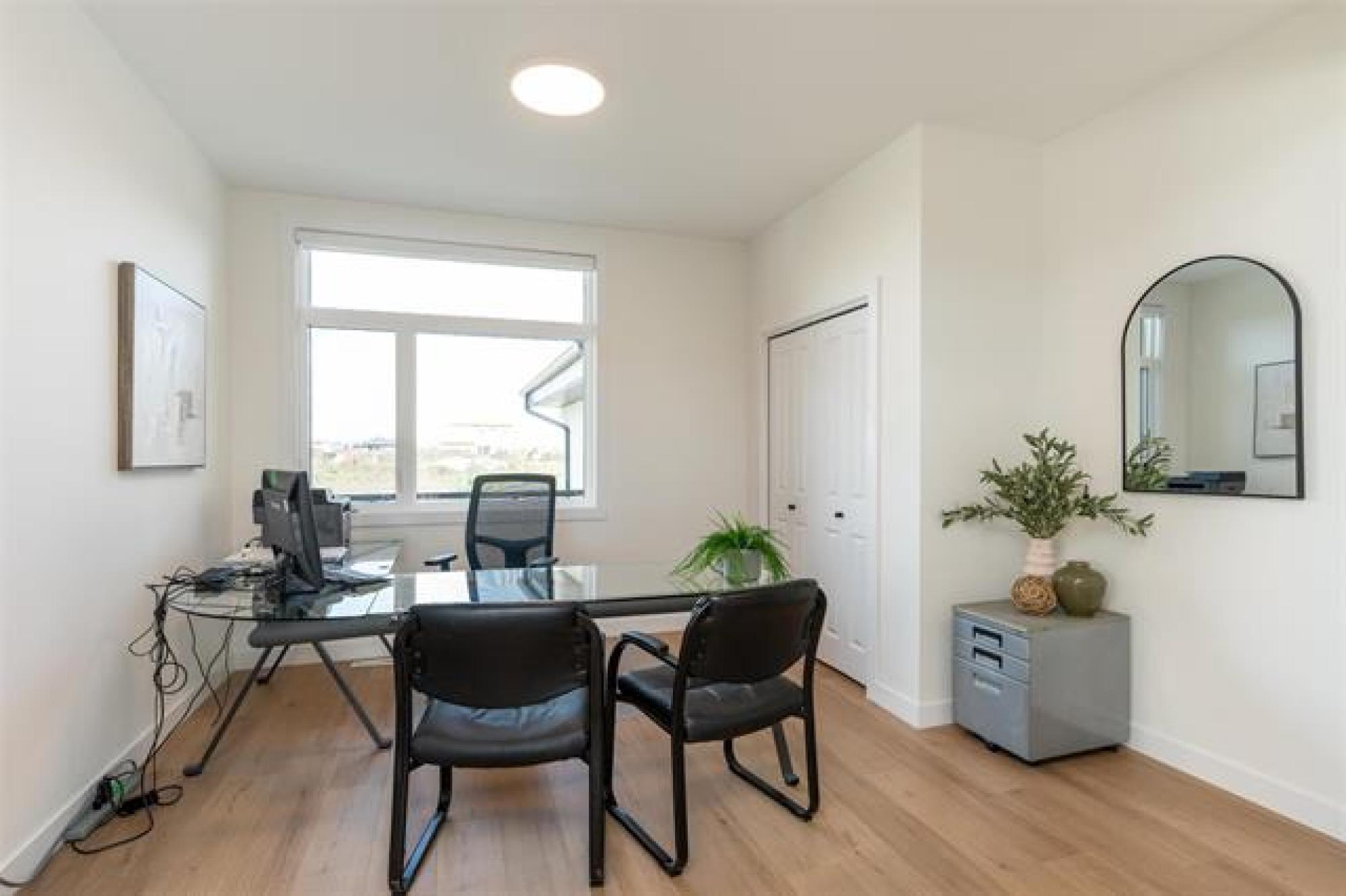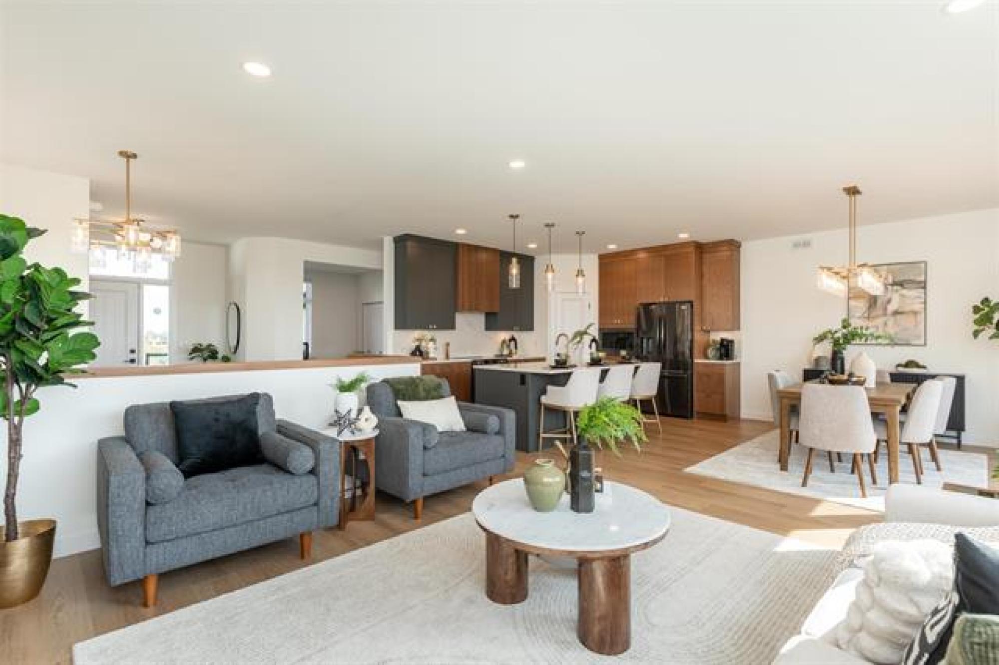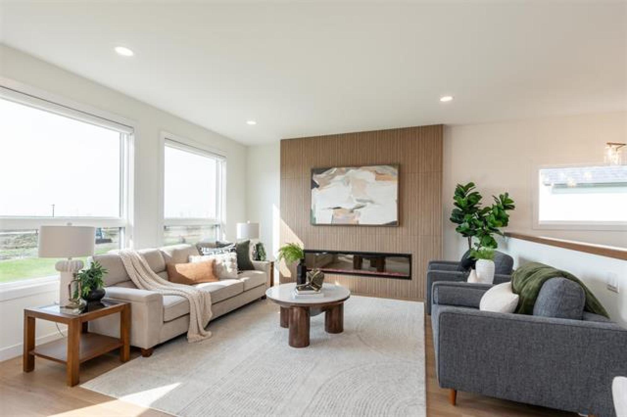 Discover exceptional design and modern comfort in this 1,739 sq. ft. show home in the desirable community of Oak Bluff. This home offers a 3-bedroom layout, with one converted to an open-concept flex/office space. The main floor features 9’ ceilings, glass railings, and laminate flooring throughout. The great room includes an electric fireplace with ceramic tile surround. The chef-style kitchen offers a large island, quartz countertops, tile backsplash, upgraded cabinets, and black stainless appliances, with upgraded plumbing, lighting & windows throughout, fill the space with natural light. The primary bedroom features a spacious walk-in closet and a deluxe ensuite-double vanity, custom tile shower & refined finishes. The lower level is ready for future development with steel beam and 9' ceilings. Outdoor features include a composite rear deck and fully landscaped. The contemporary exterior highlights stone accents, a front porch with aluminum railings and glass, and an exceptional oversized garage with workshop for ample storage and project space. Beautiful, functional, and crafted with timeless design,this Oak Bluff home is one you won’t want to miss.Includes industry leading warranty 1-2-5-10 year