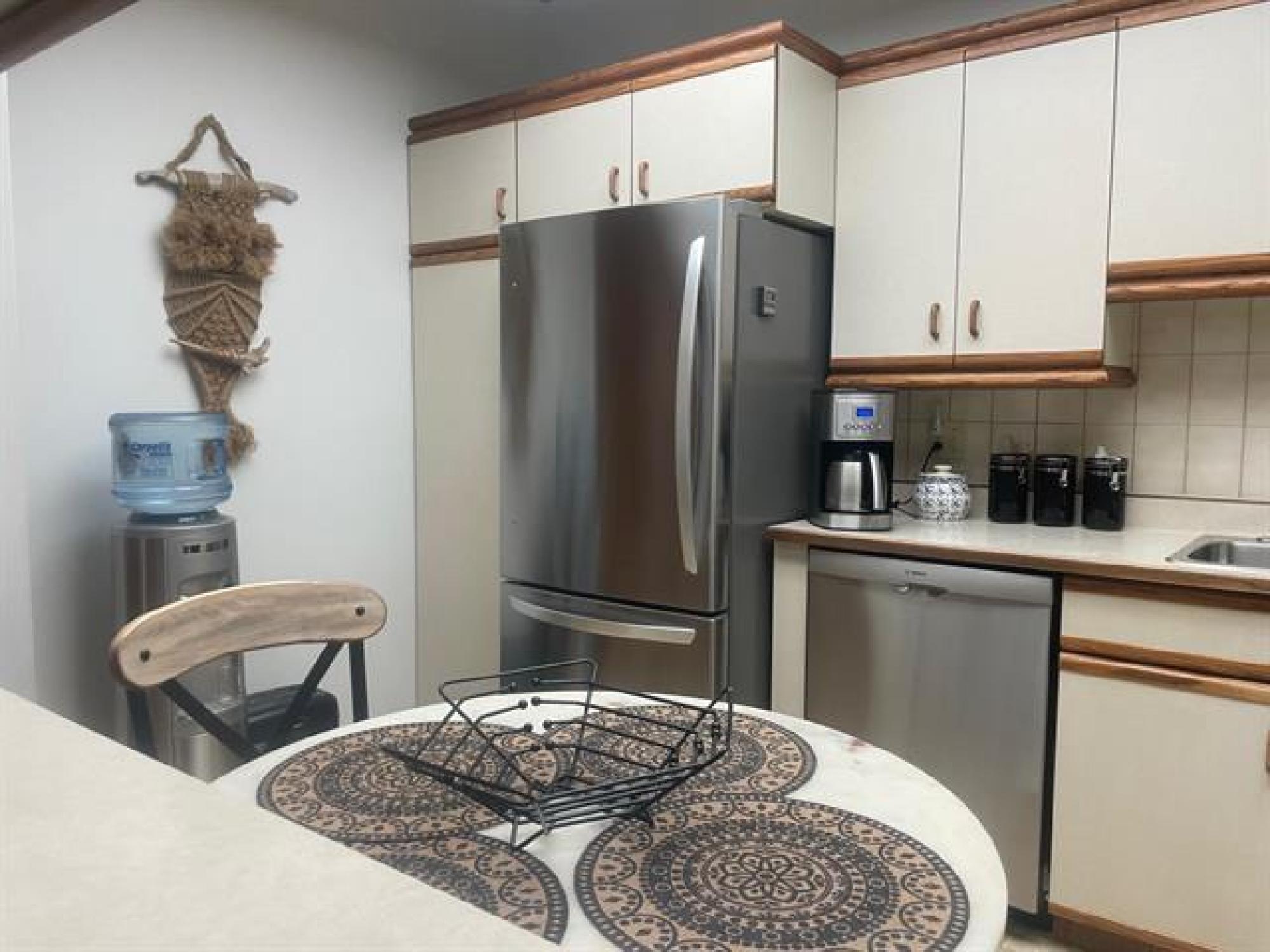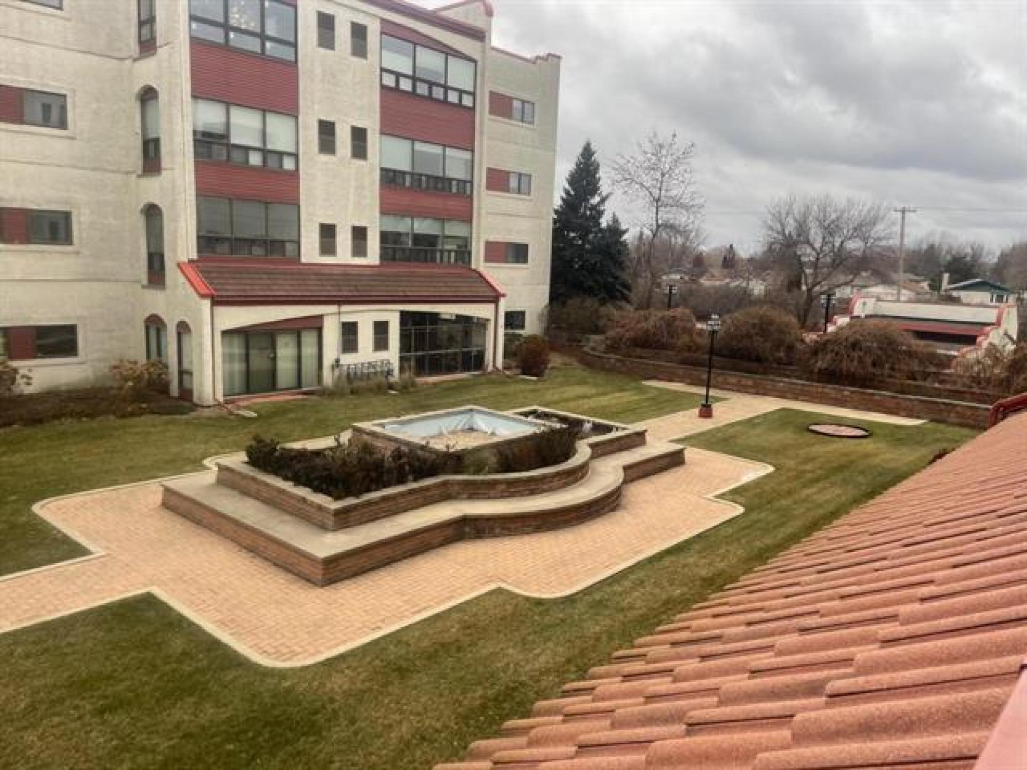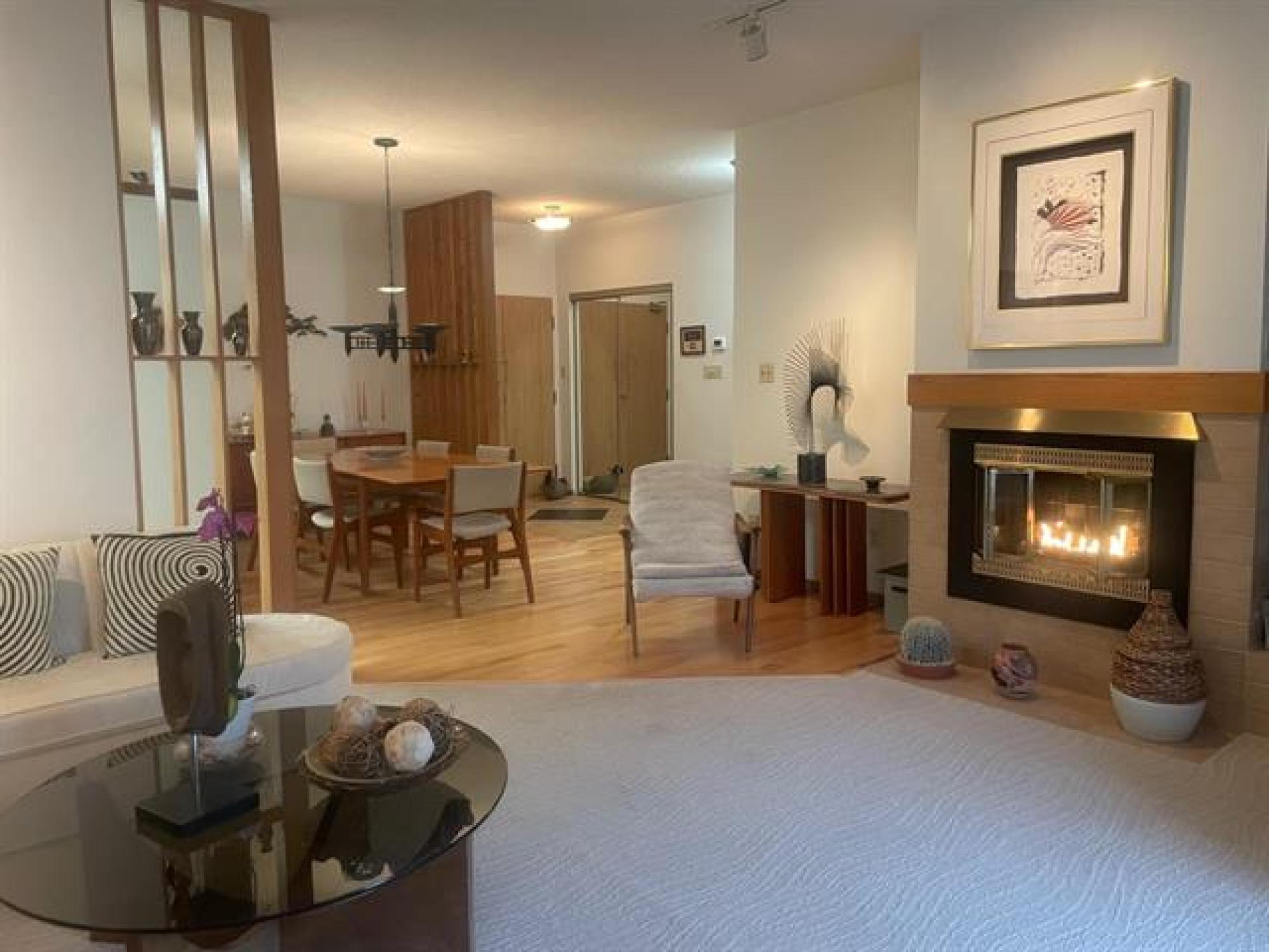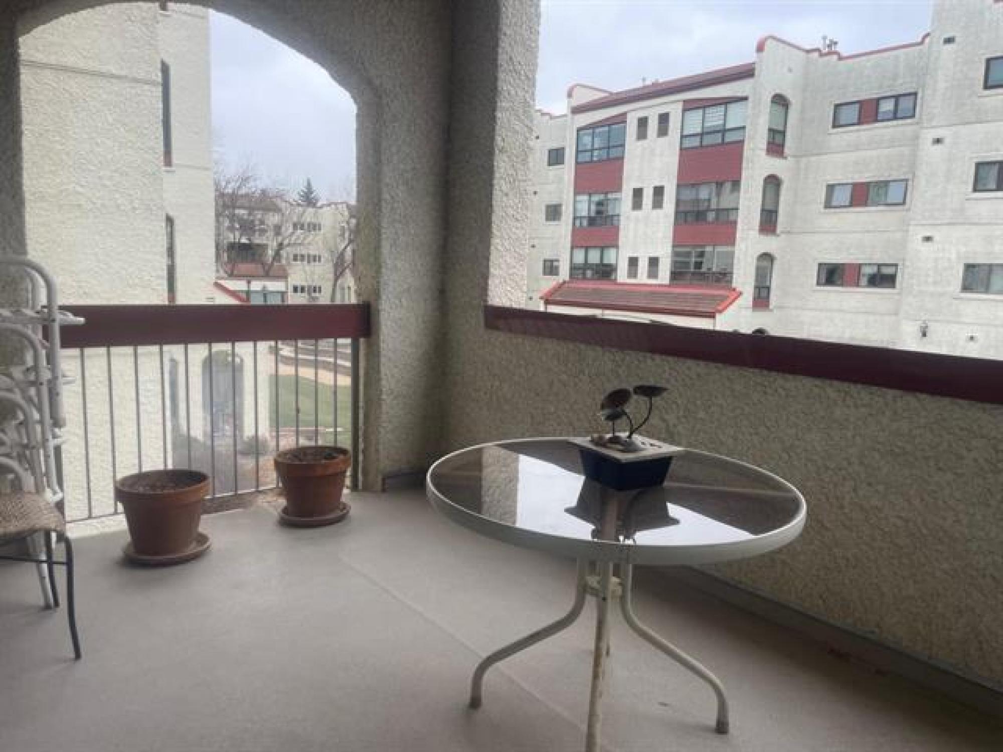 This spacious south facing 2 bedroom, 2 bathroom unit has been beautifully looked after. Upgrades include new blinds, fridge (2025), stove (2022), new carpets and hardwoods and newer washer and dryer. Living room features a gas fireplace, patio doors to balconey viewing the beautiful courtyards. Kitchen looks out to the dining room area. Large primary bedroom with double closets and 3 piece ensuite. Second bedroom is perfect for guests or office. A main bath with jacuzzi tub and convenient insuite laundry complete the unit. 2 heated underground parking stalls (with owners' shared car wash) make the cold winters a little easier. Storage locker in secured area off parking garage. Concete building, private location, lots of visitor parking, easy access to shopping and transit.