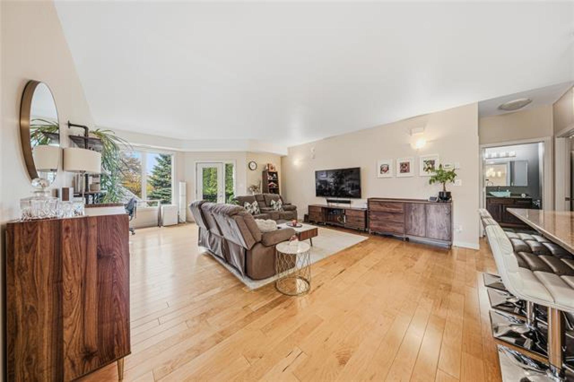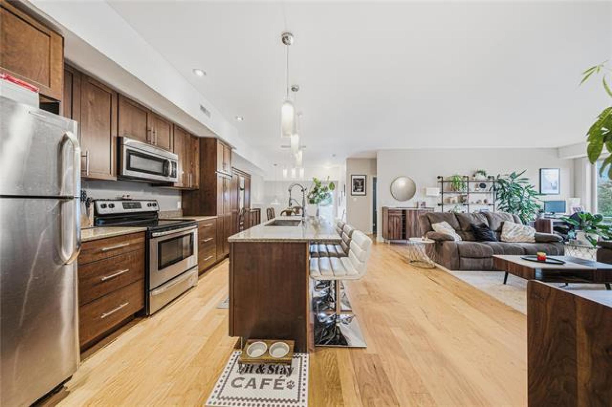 Offers as received! Welcome to this exceptional condo lifestyle! Truly rare find offering 2 Bedrooms, 2 full Bathrooms, and 2 parking spots! This spacious 1226 sq ft corner suite offers a well-appointed open layout, and feels open, airy and bright! High ceilings, loads of windows, quality finishings throughout! Stunning hardwood floors. Enjoy a large eat-in style kitchen featuring shaker-style maple cabinetry, pantry, pull out drawers with soft close feature, granite counters and island with seating! Stainless-steel fridge, stove, dishwasher and microwave included. Formal dining - perfect for entertaining family and friends. Extra-large living room area to accommodate all of your cherished furnishings. Garden door to balcony for BBQ and a breath of fresh air - complete with outdoor storage room! Primary bedroom offers a walk in closet, and boasts room for king size bed! Laundry room with stacking washer and dryer. Pets welcome. Easy access to downtown, all shopping and amenities. Excellent investment to call home! Arrange your viewing today!