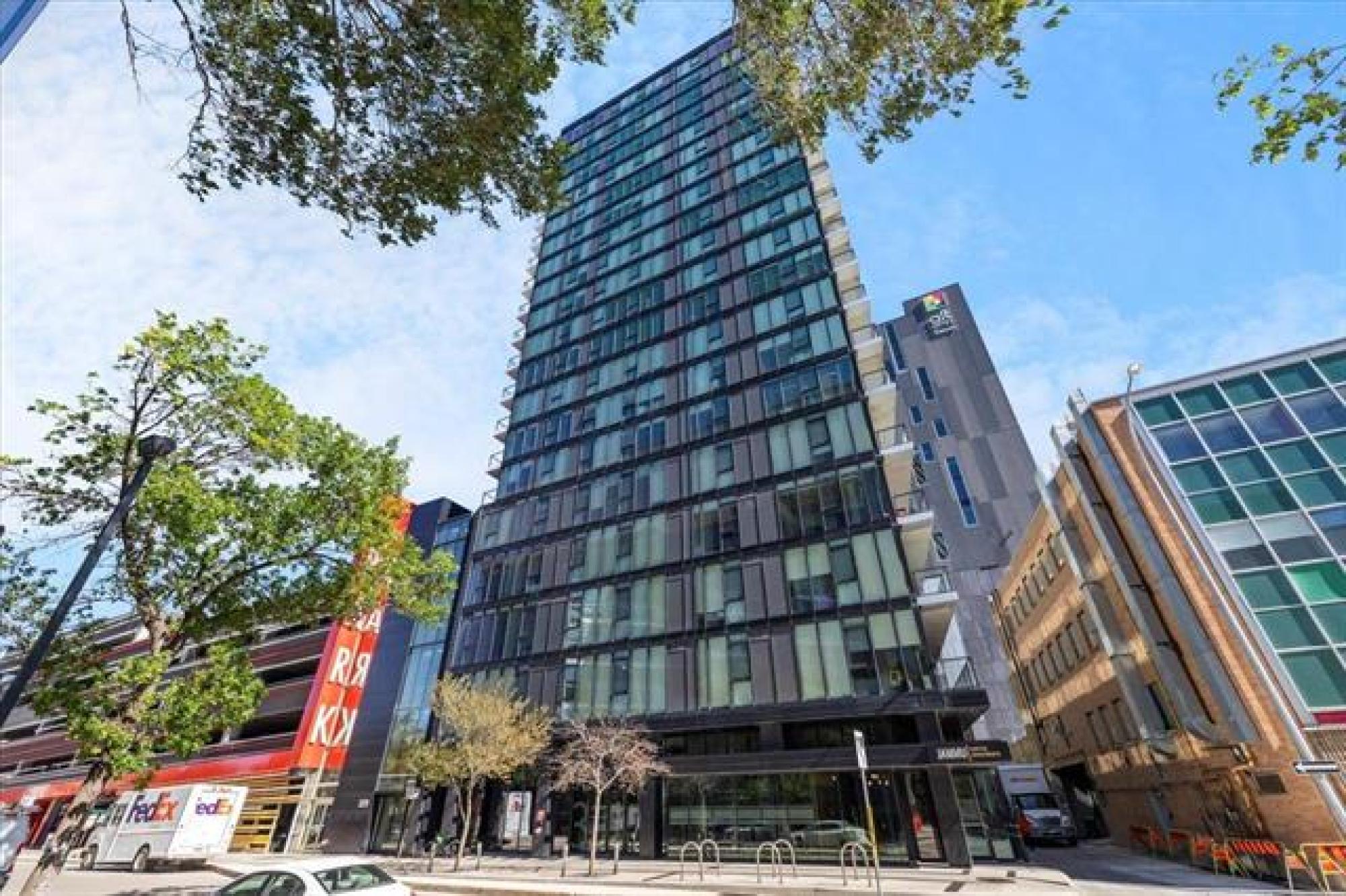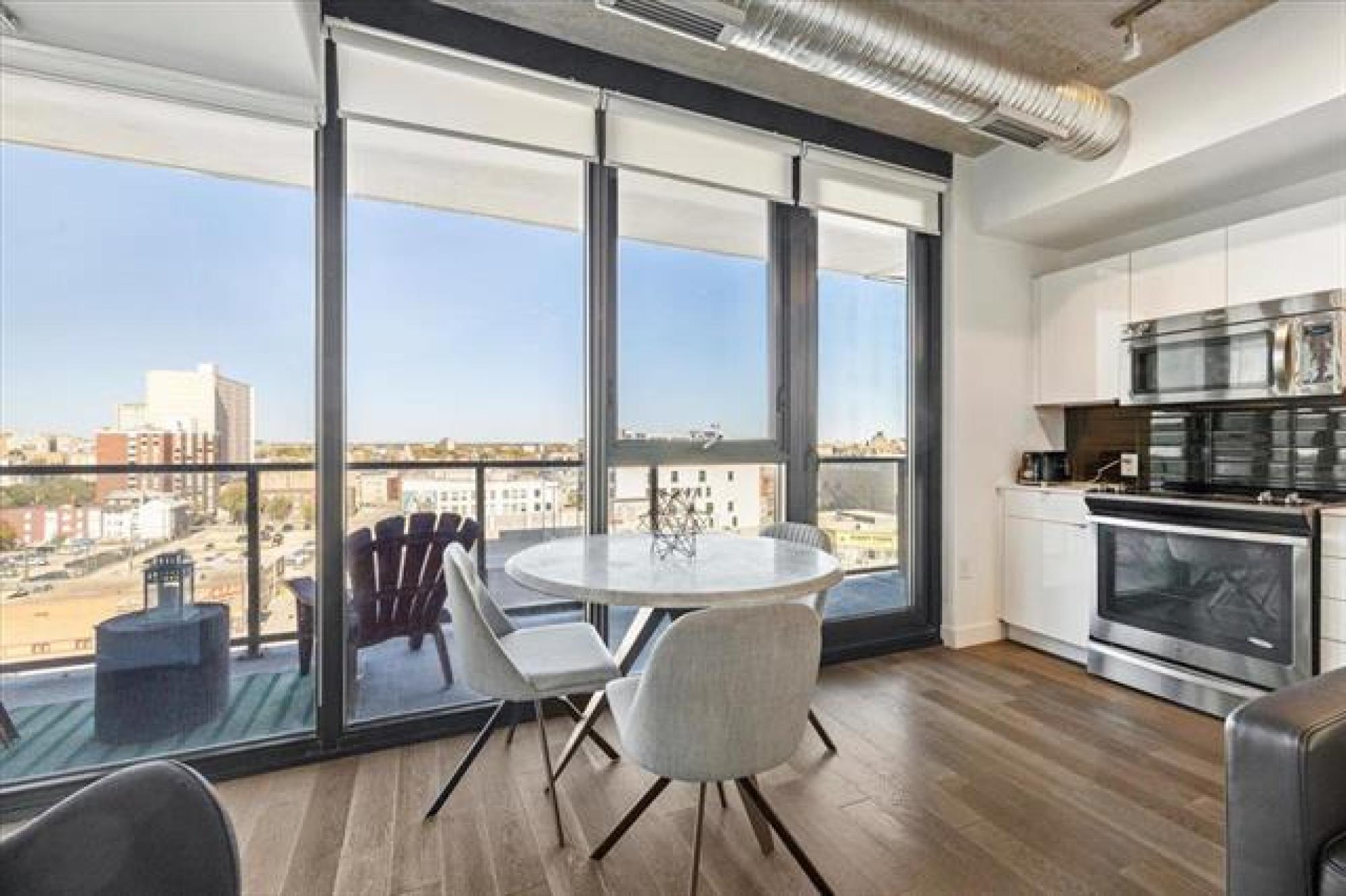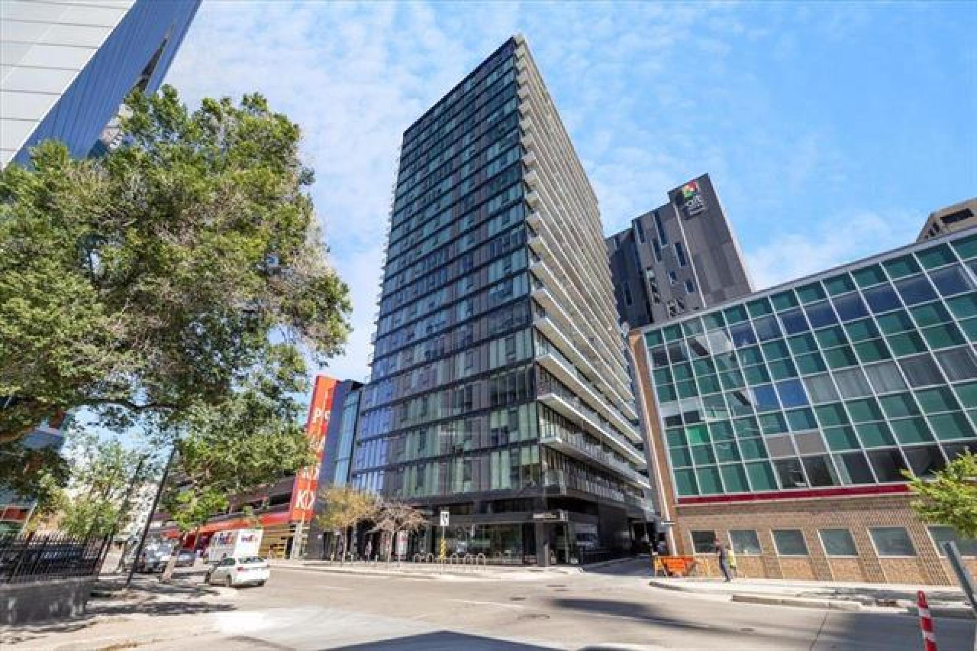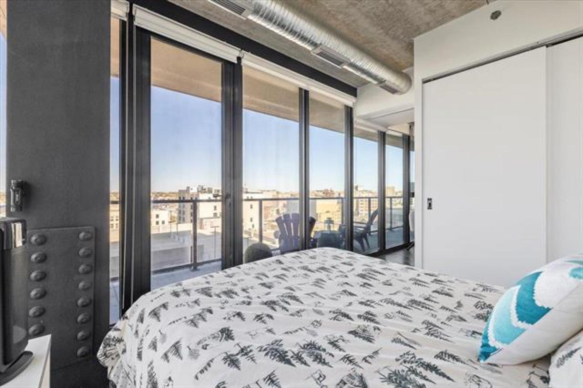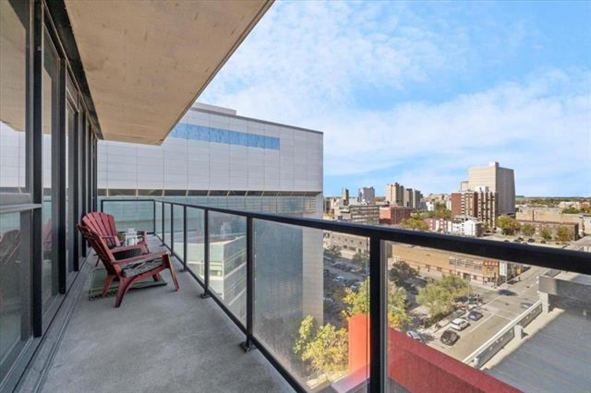 Experience downtown living in the prestigious "Glass House" with gated parking. This stunning 9th-floor corner unit features exposed concrete and steel beams, floor-to-ceiling windows, and custom blinds for privacy. Wake up to panoramic city views that create the perfect backdrop for entertaining. Striking barn doors open to two well-proportioned bedrooms, while the gourmet kitchen impresses with high-gloss cabinets, quartz countertops, stylish backsplash, and full stainless steel appliance package. Your private 144 sq ft covered balcony offers fresh air and city views, or head to the spectacular 21st-floor rooftop terrace with BBQ facilities, fire lounge, and breathtaking wraparound views. The enclosed rooftop lounge provides year-round entertaining space. Premium amenities include a 24-hour fitness center and private theater. Canada Life Centre, True North Square, and Winnipeg's finest dining and nightlife are just steps away. Available furnished or unfurnished—perfect for busy professionals. This is your gateway to Winnipeg's most sophisticated urban lifestyle.