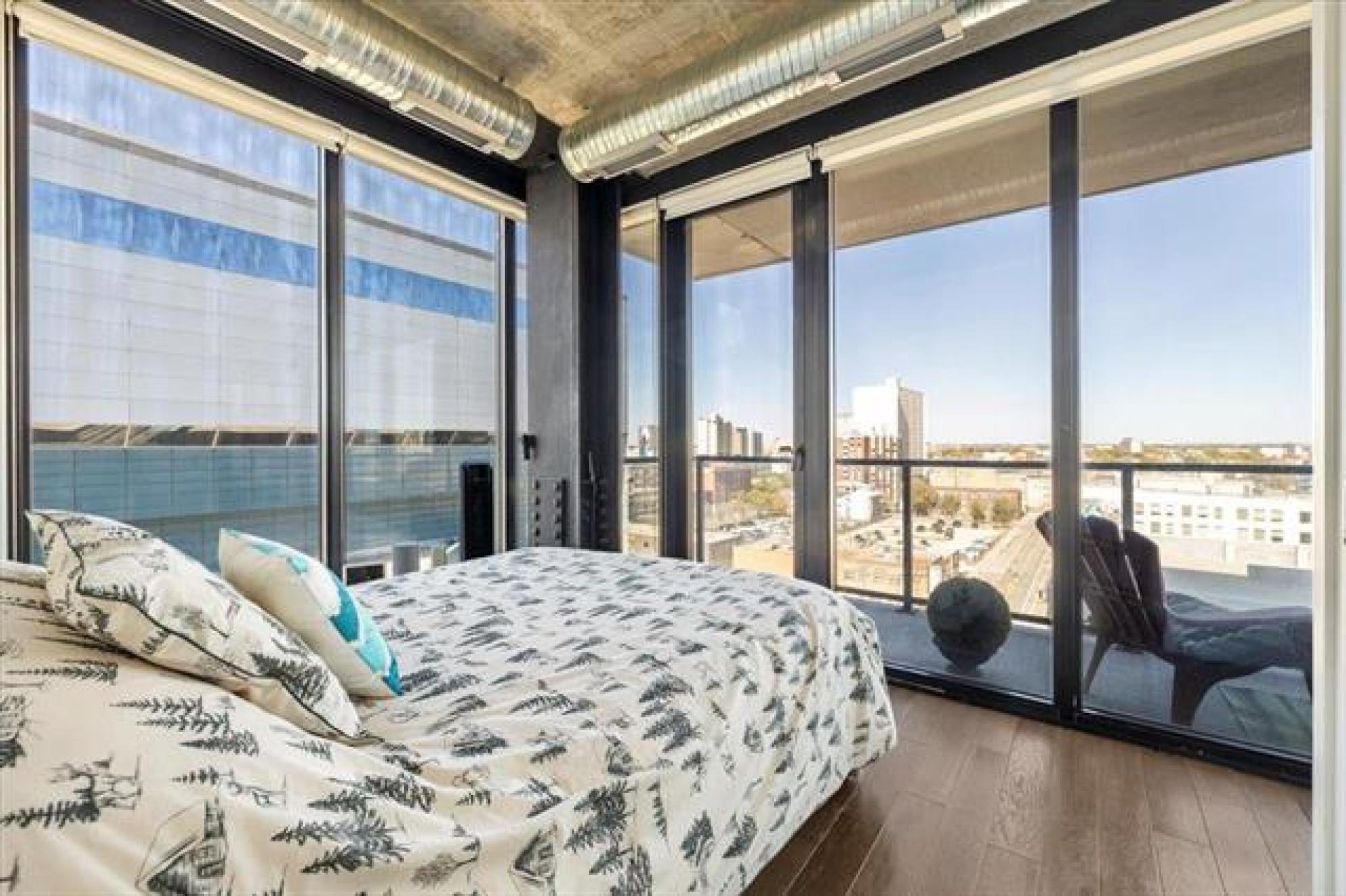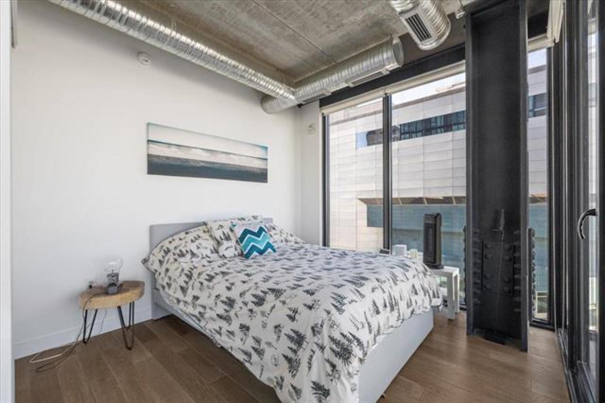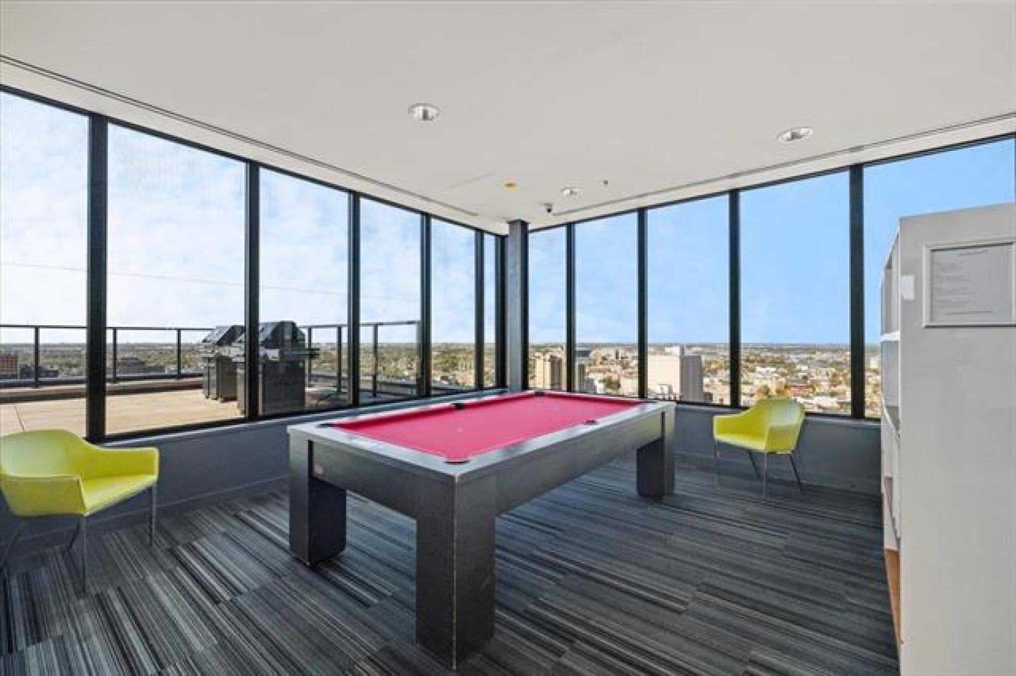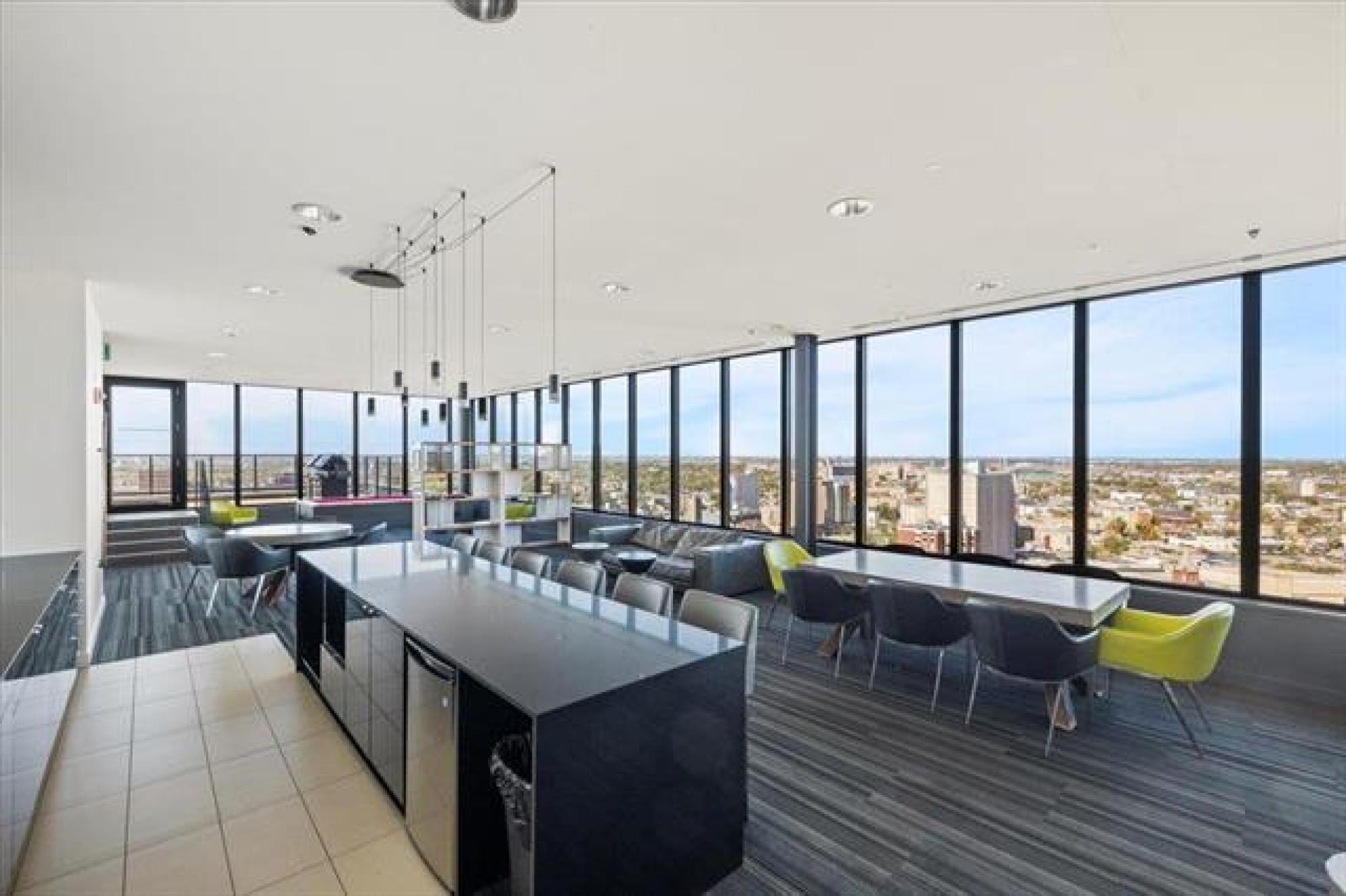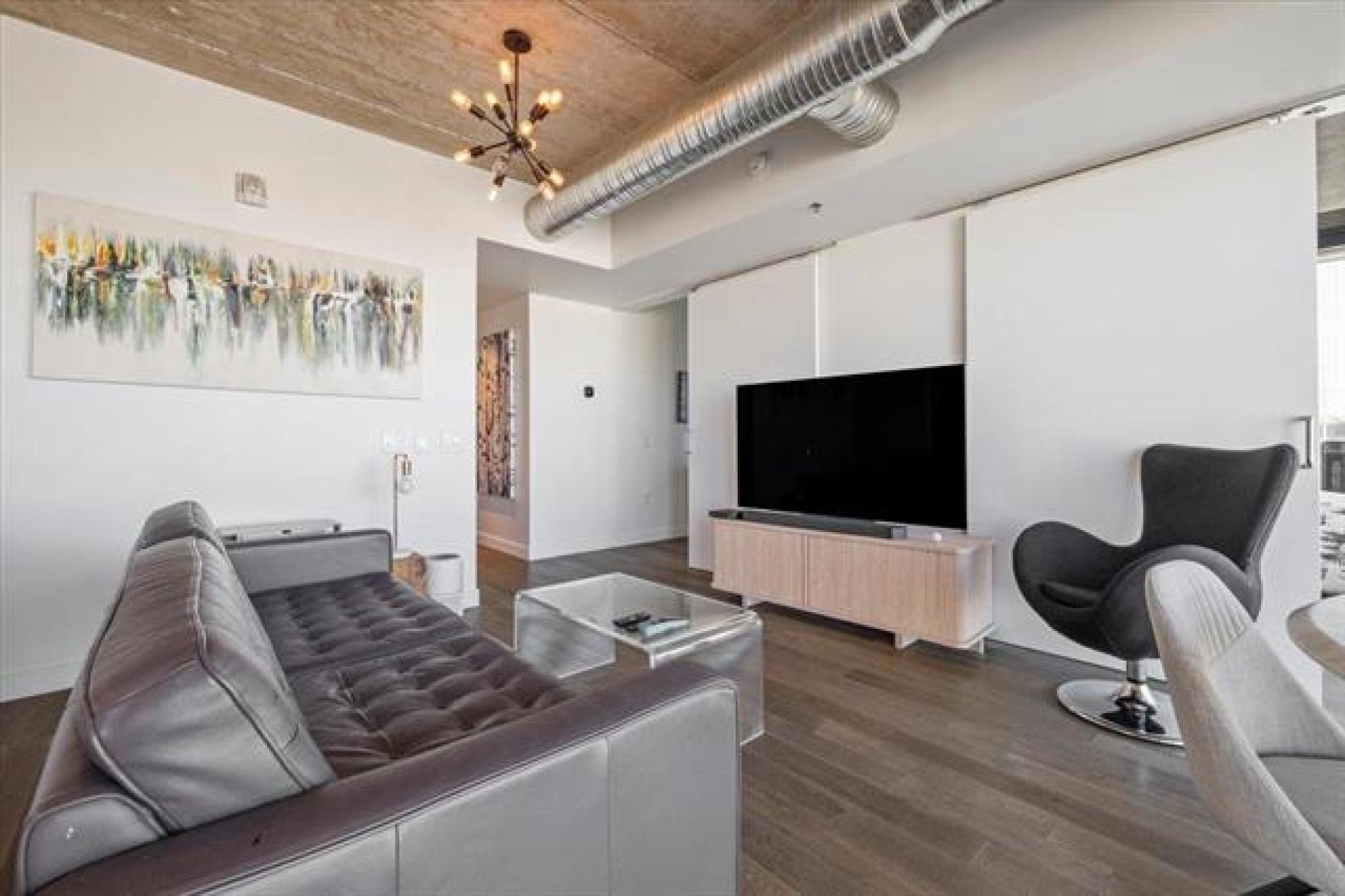 Experience downtown living in the prestigious "Glass House" with gated parking. This stunning 9th-floor corner unit features exposed concrete and steel beams, floor-to-ceiling windows, and custom blinds for privacy. Wake up to panoramic city views that create the perfect backdrop for entertaining. Striking barn doors open to two well-proportioned bedrooms, while the gourmet kitchen impresses with high-gloss cabinets, quartz countertops, stylish backsplash, and full stainless steel appliance package. Your private 144 sq ft covered balcony offers fresh air and city views, or head to the spectacular 21st-floor rooftop terrace with BBQ facilities, fire lounge, and breathtaking wraparound views. The enclosed rooftop lounge provides year-round entertaining space. Premium amenities include a 24-hour fitness center and private theater. Canada Life Centre, True North Square, and Winnipeg's finest dining and nightlife are just steps away. Available furnished or unfurnished—perfect for busy professionals. This is your gateway to Winnipeg's most sophisticated urban lifestyle.