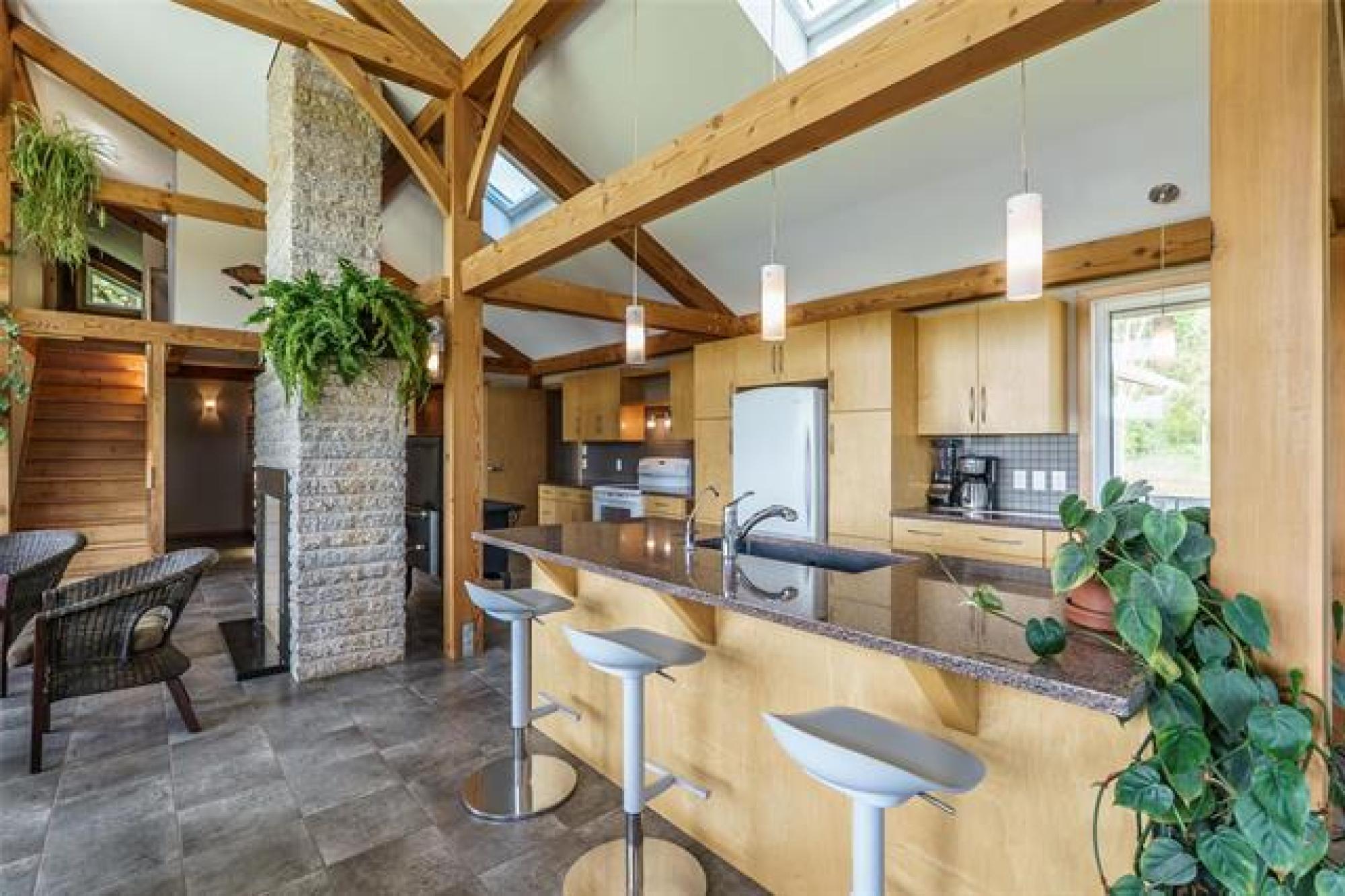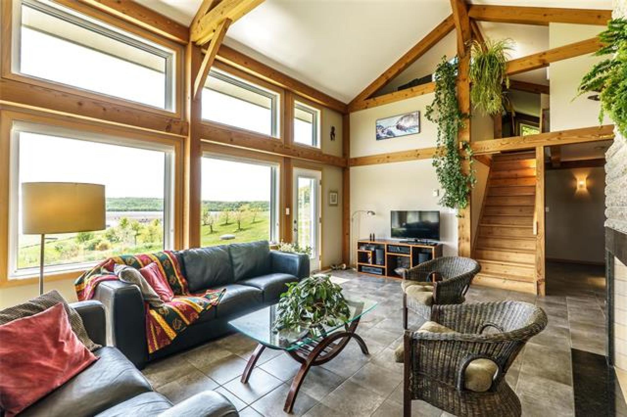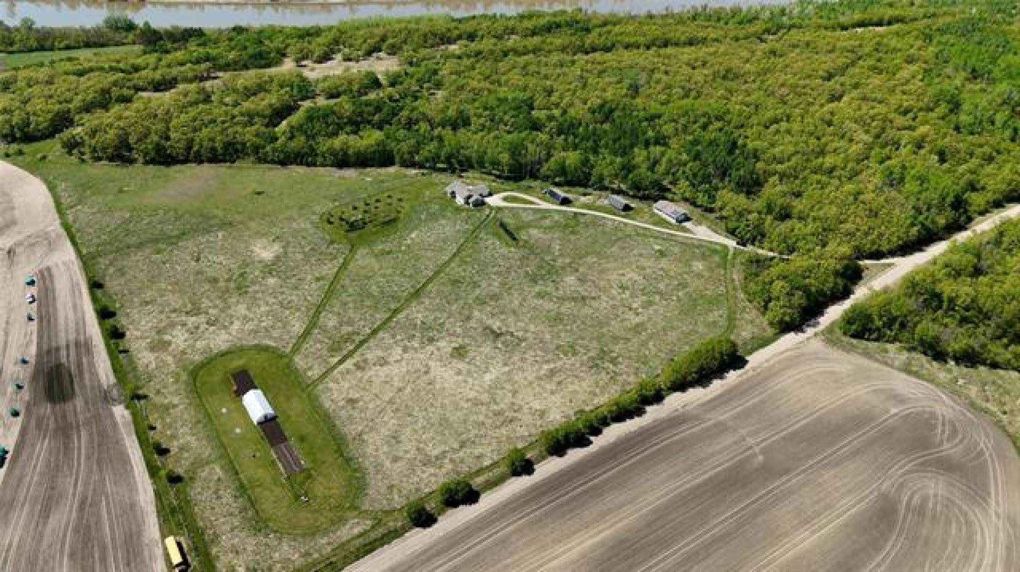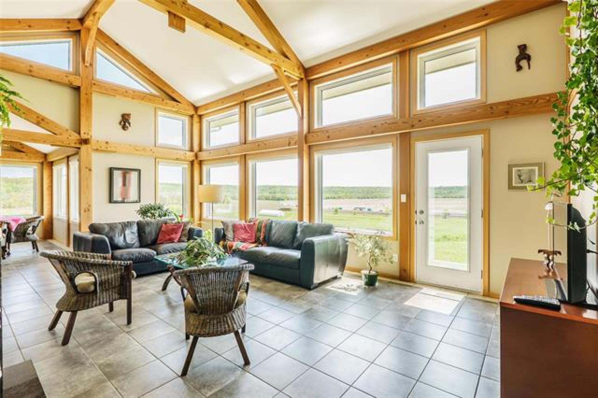See it today & Offers as Received *** Reduce your carbon footprint with proposed Hydro power as a backup! One-of-a-Kind waterfront Douglas Fir Timber Frame Off-grid home on nearly 96 Scenic Acres of land in the shape of a teardrop and flanked by the Assiniboine River. Perfect for a hobby farm and famous for foraging, berries and cherries, the land offers a piece of heritage - it has a lookout that gazes over the Hogsback which marries a historical significance with Chief Yellowquill. Built into the hillside and constructed with quality craftsmanship, this passive solar-designed home combines elegance and efficiency.. Open-concept layout featuring a Manitoba granite kitchen with a large island, a Rumford fireplace and panoramic valley views. With 1,958 sqft of living space in main home including 2 bedrooms (with potential division for a 3rd), and a 4-piece bath. In-floor radiant heat and A/C included! Outbuildings include a fully insulated workshop/garage/studio with bathroom and kitchenette (extra 1050 sqft of living space), and two utility buildings perfect for storage or expansion. A stone's throw away from Bittersweet Cross Country Ski Trails, this property features fully sustainable living!