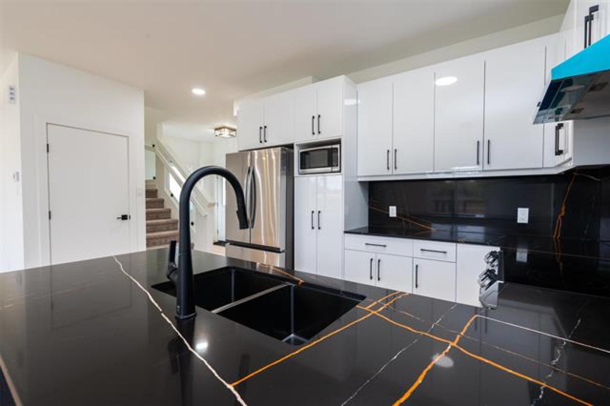 SHOWINGS START NOW, OFFERS ARE REVIEWED WITHIN 24 HOURS OF RECEIVING THEM...Discover this stunning 3-bedroom, 2.5-bath, 1,520 sq. ft. home in the up-and-coming Aspen Creek Trails. The main floor features an open-concept design with a showpiece kitchen boasting high-gloss cabinetry, quartz countertops with waterfall edge and backsplash, and sleek black finishes. A custom feature wall with electric fireplace adds style and warmth. Upstairs, the primary suite offers a tray ceiling with uplighting, walk-in closet, and a tiled ensuite shower, while two additional bedrooms include built-in wardrobes. Convenient second-floor laundry hookups save time and effort. The home sits on a large pie-shaped lot with a double attached garage and a side entrance to the lower level, ready for future development. As a brand-new build, you’ll enjoy peace of mind with modern systems—no need to worry about furnace, A/C, or HVAC replacements for years to come. A perfect blend of upgrades, style, and function—this home is a must-see!