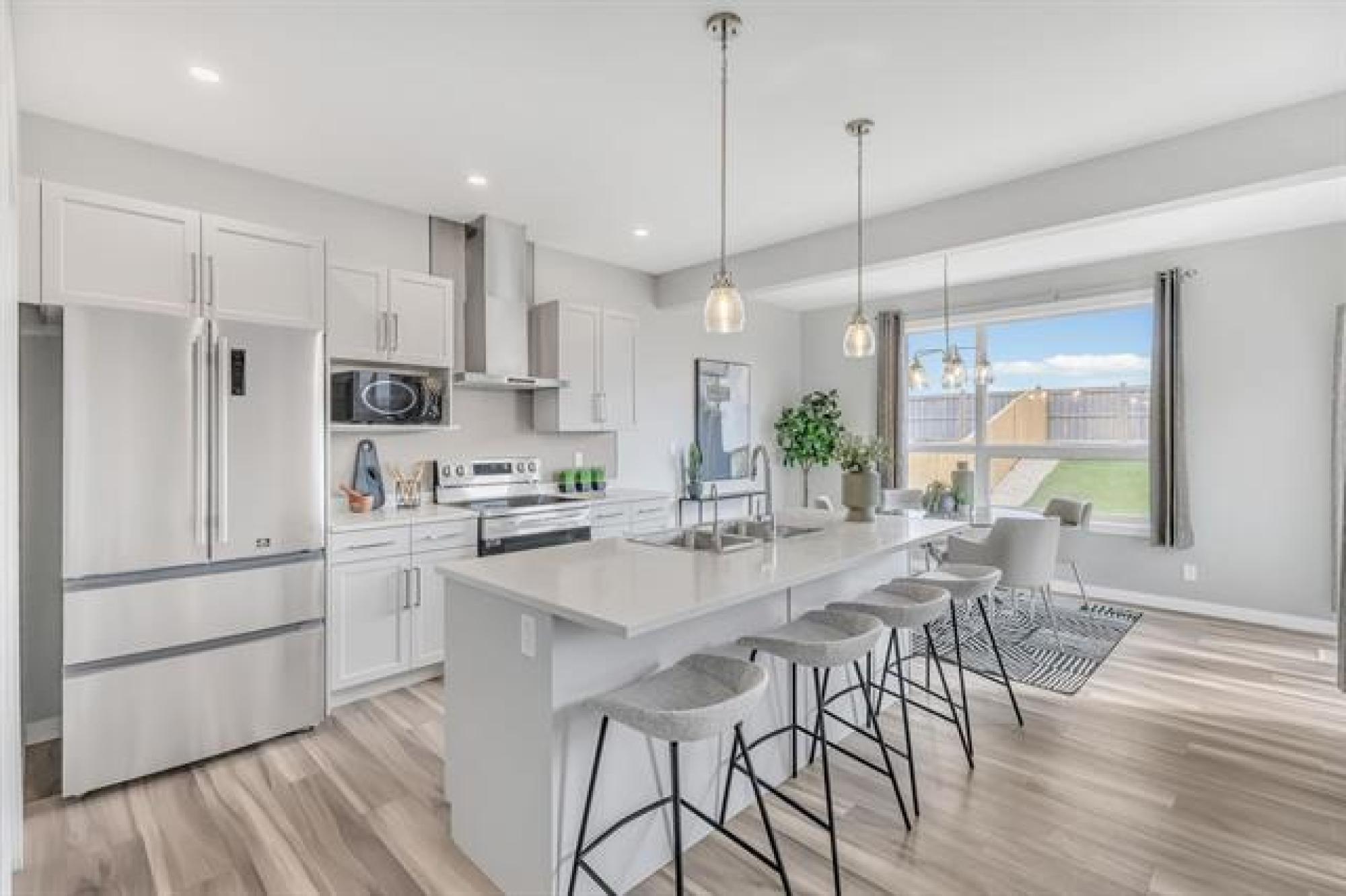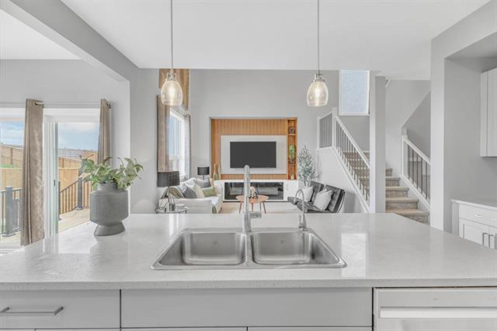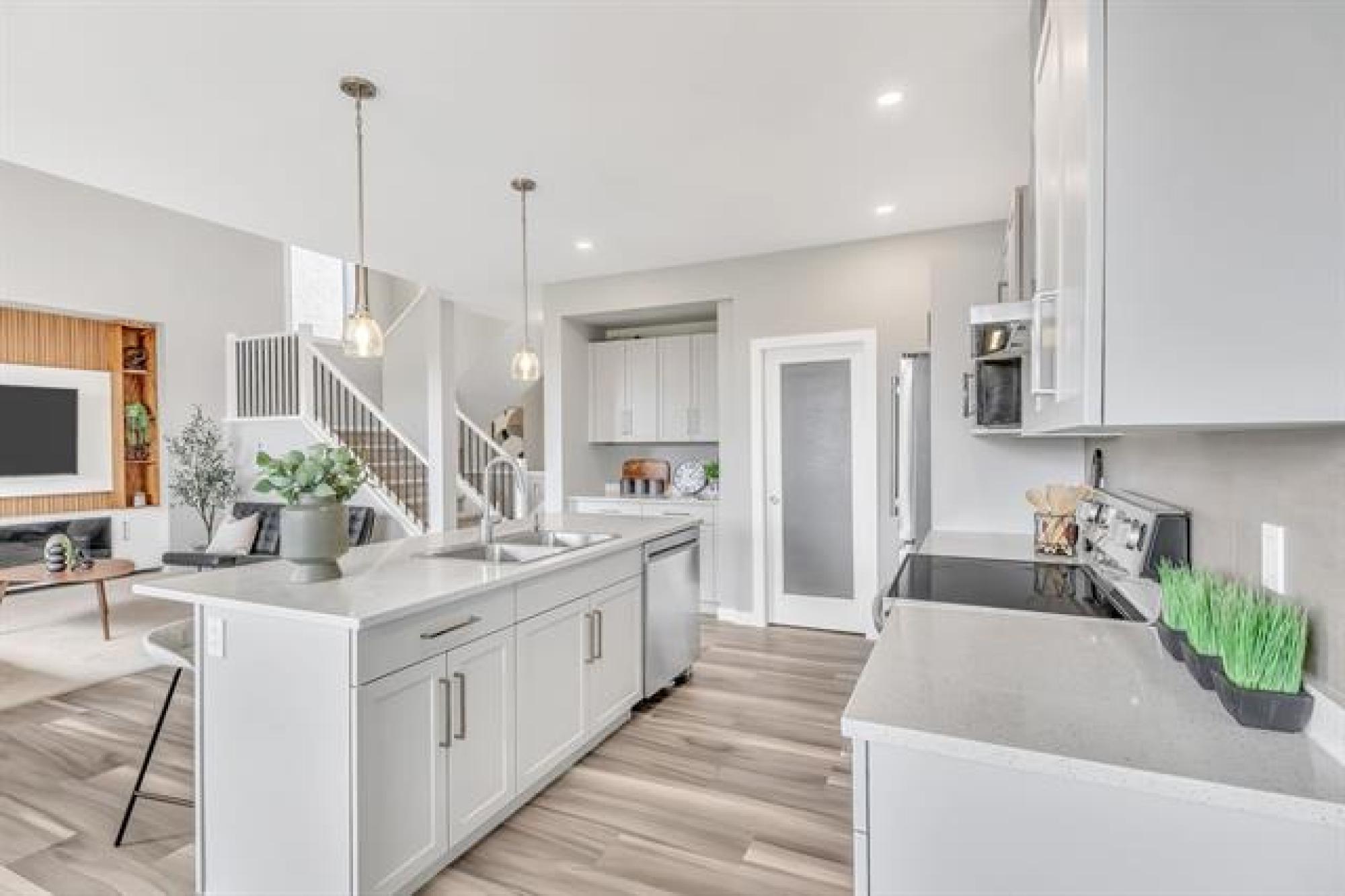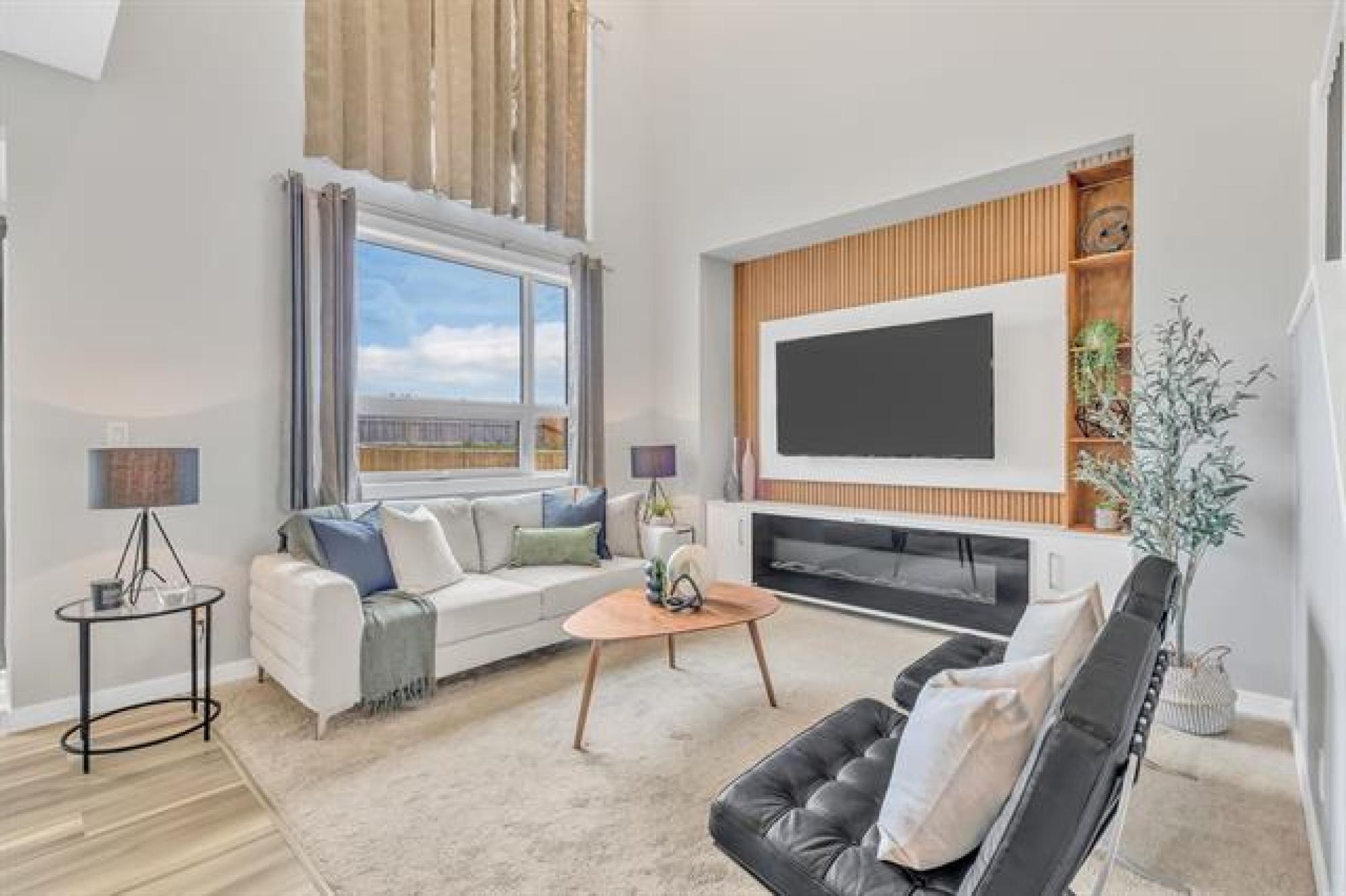 SHOW HOME LIKE 1,831 sq. ft. two-storey blends modern style with functional design. Featuring 3 spacious bedrooms and 3 bathrooms, it’s ideal for families. A large front foyer welcomes you into an open-concept main floor with luxury vinyl plank flooring, quartz countertops, and oversized windows filling the home with natural light. The kitchen boasts a walk-in pantry and island, flowing seamlessly to the living room with a dramatic two-storey ceiling and striking fireplace feature wall—perfect for entertaining. A main floor powder room adds convenience. Upstairs, find a handy laundry room, two generous secondary bedrooms, and a gorgeous primary suite with walk-in closet and private ensuite. The fully insulated basement offers potential for another bedroom, bath, or rec room. Enjoy the double attached garage, extra-wide driveway, landscaped yard, and deck for summer BBQs. With curb appeal that stands out, this move-in-ready home offers style, comfort, and room to grow!