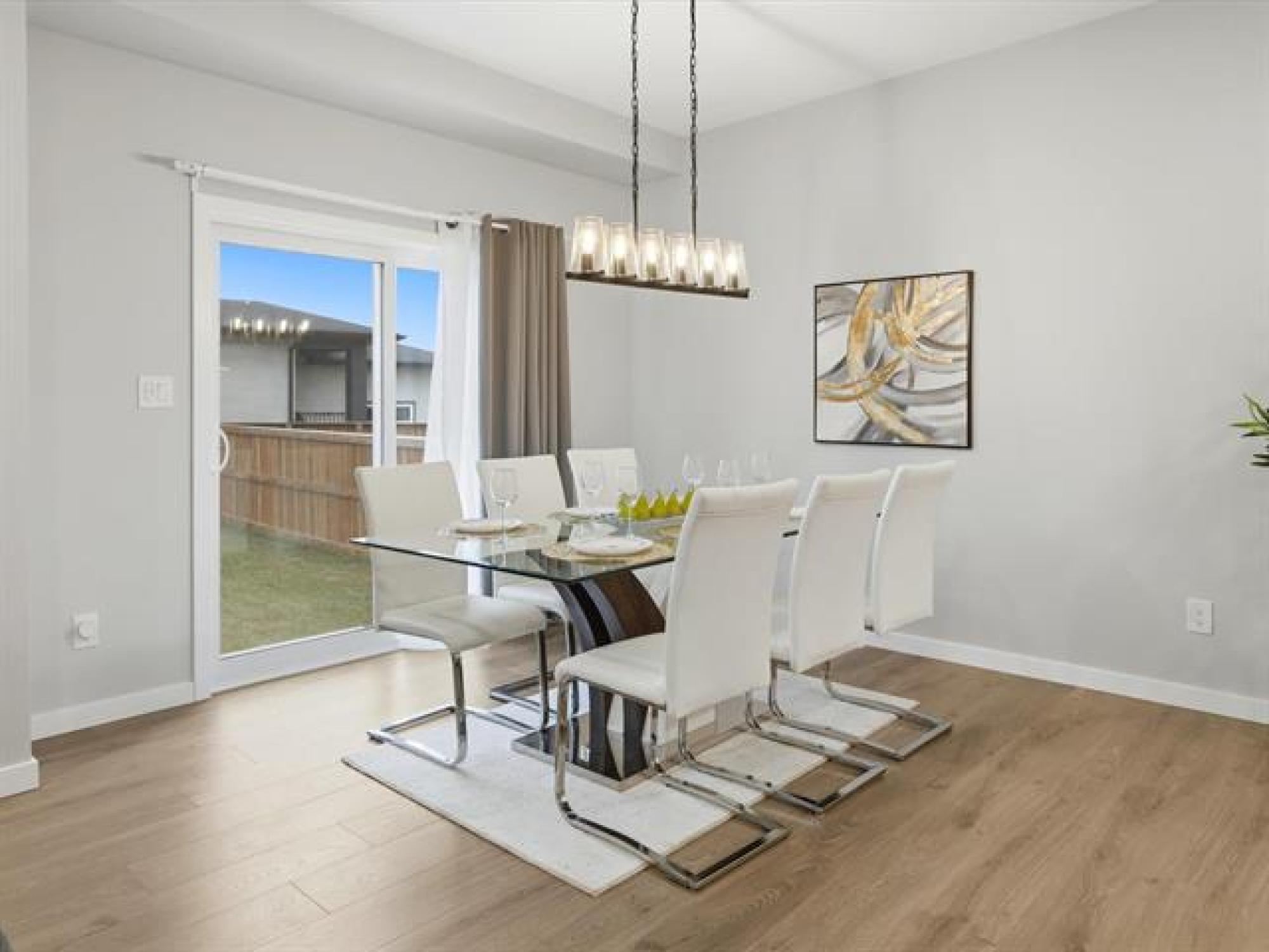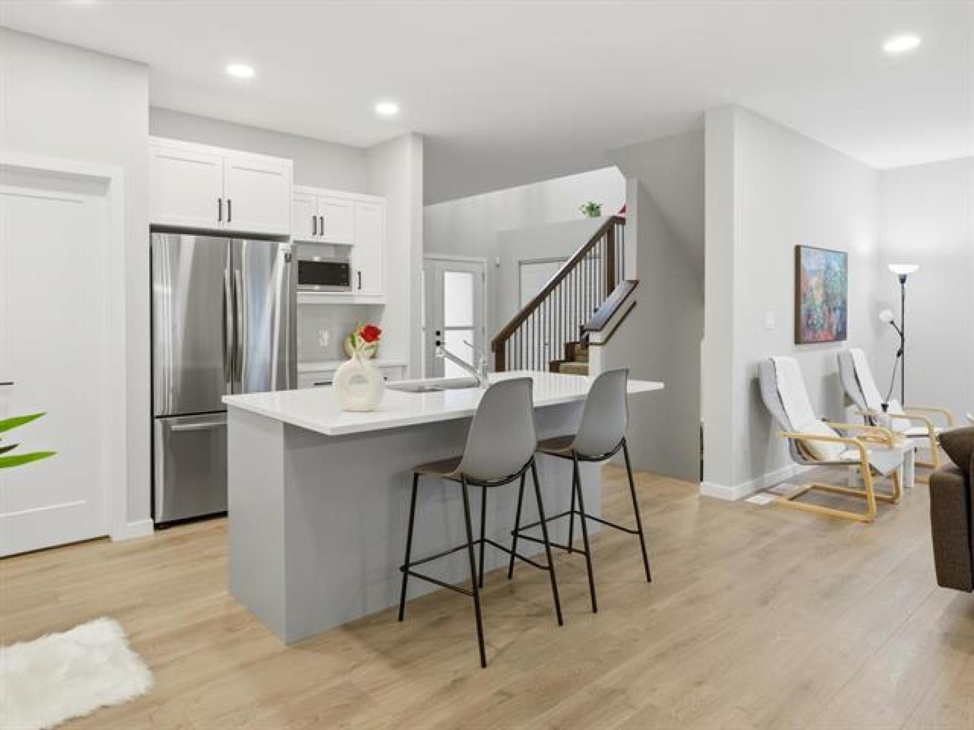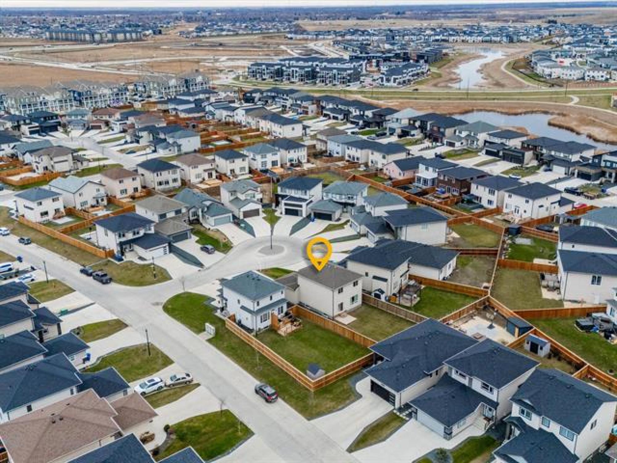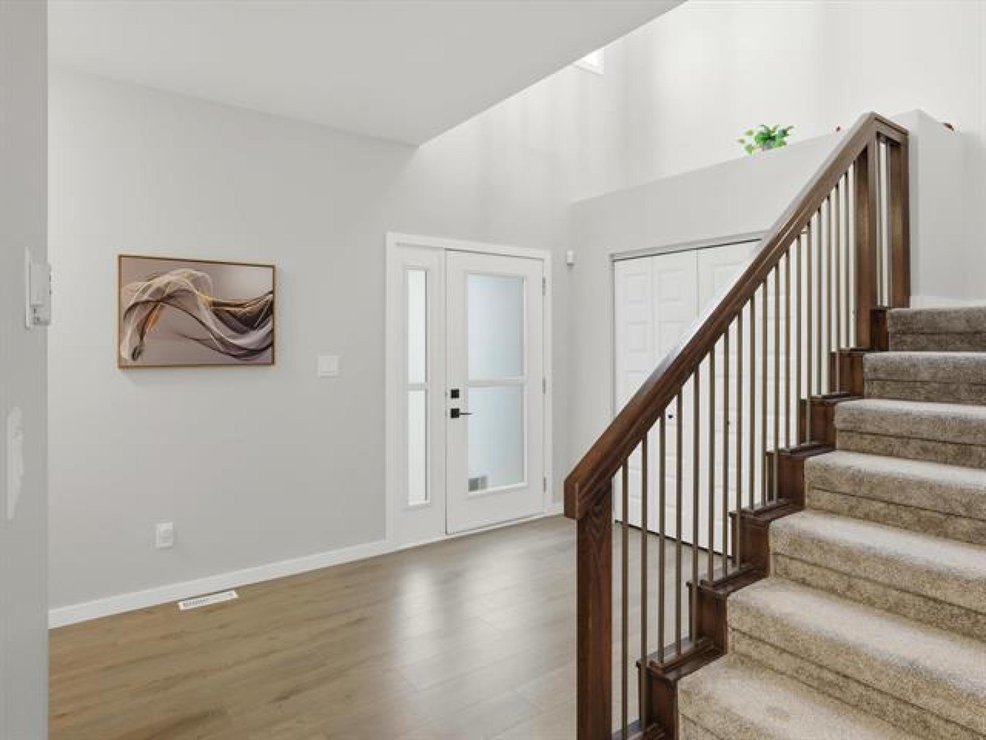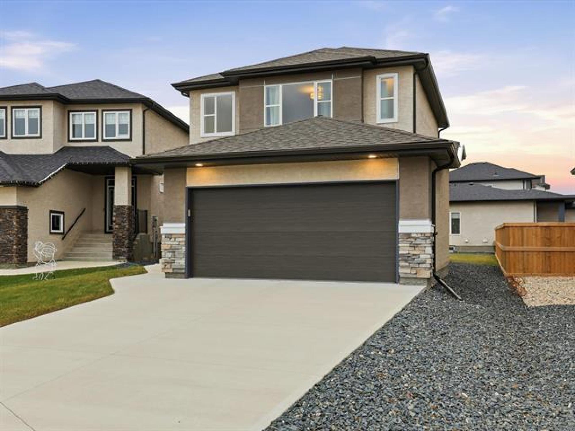 SS now. Offers November 26th. Measurements +/- Jogs. Open House: Sat & Sun, 2–4 PM. Welcome to 8 Dunedin, a beautifully upgraded 2021-built, 1,629 sq. ft. two-storey in the desirable community of Prairie Pointe. This modern home offers great curb appeal with stone accents, acrylic stucco, and black-finished fixtures. Step into the impressive 18-ft open-to-below foyer with 9-ft main-floor ceilings, creating a bright and spacious entrance. The main level features a generous living room and an open-concept kitchen with soft-closing cabinets, quartz countertops, stainless steel appliances, a stylish backsplash, a large pantry, and a well-sized dining area—perfect for daily living and entertaining. A convenient half bathroom completes the main floor. The upper level includes a spacious primary bedroom with a walk-in closet and ensuite, two additional bedrooms (one with its own walk-in closet), a full bathroom, and upper-floor laundry. The fully fenced backyard features a deck and plenty of space to enjoy. Additional highlights include laminate flooring, spindle railings, and a double attached garage. Don’t miss this fantastic move-in-ready home in a sought-after neighbourhood! DON'T MISS