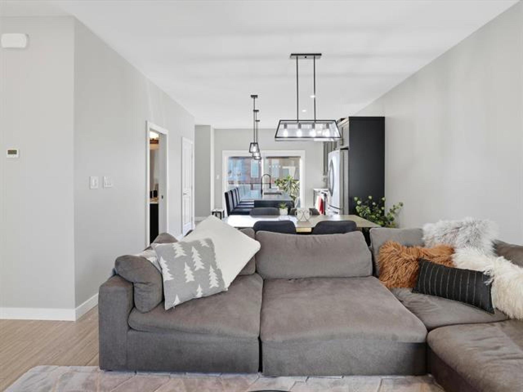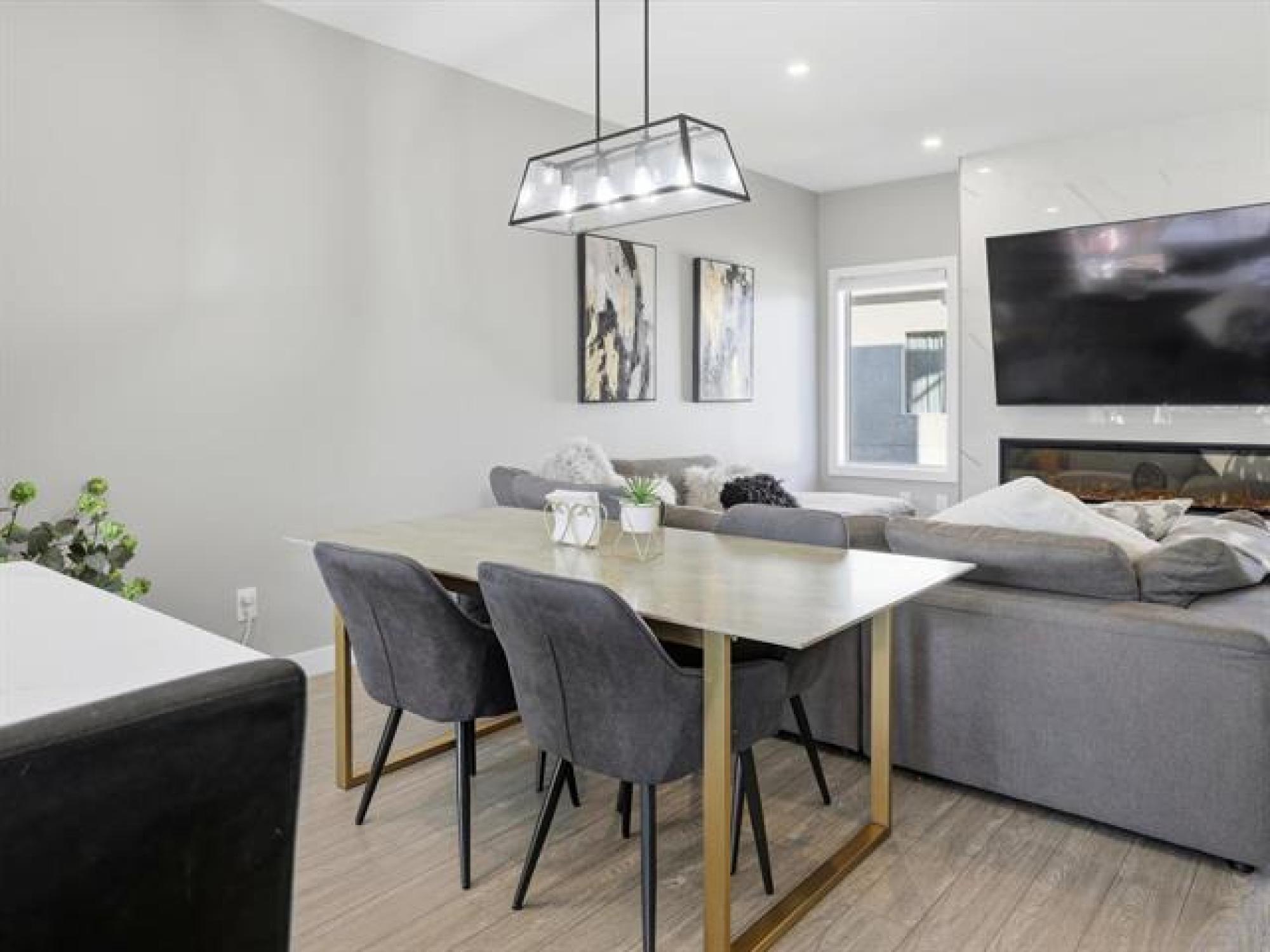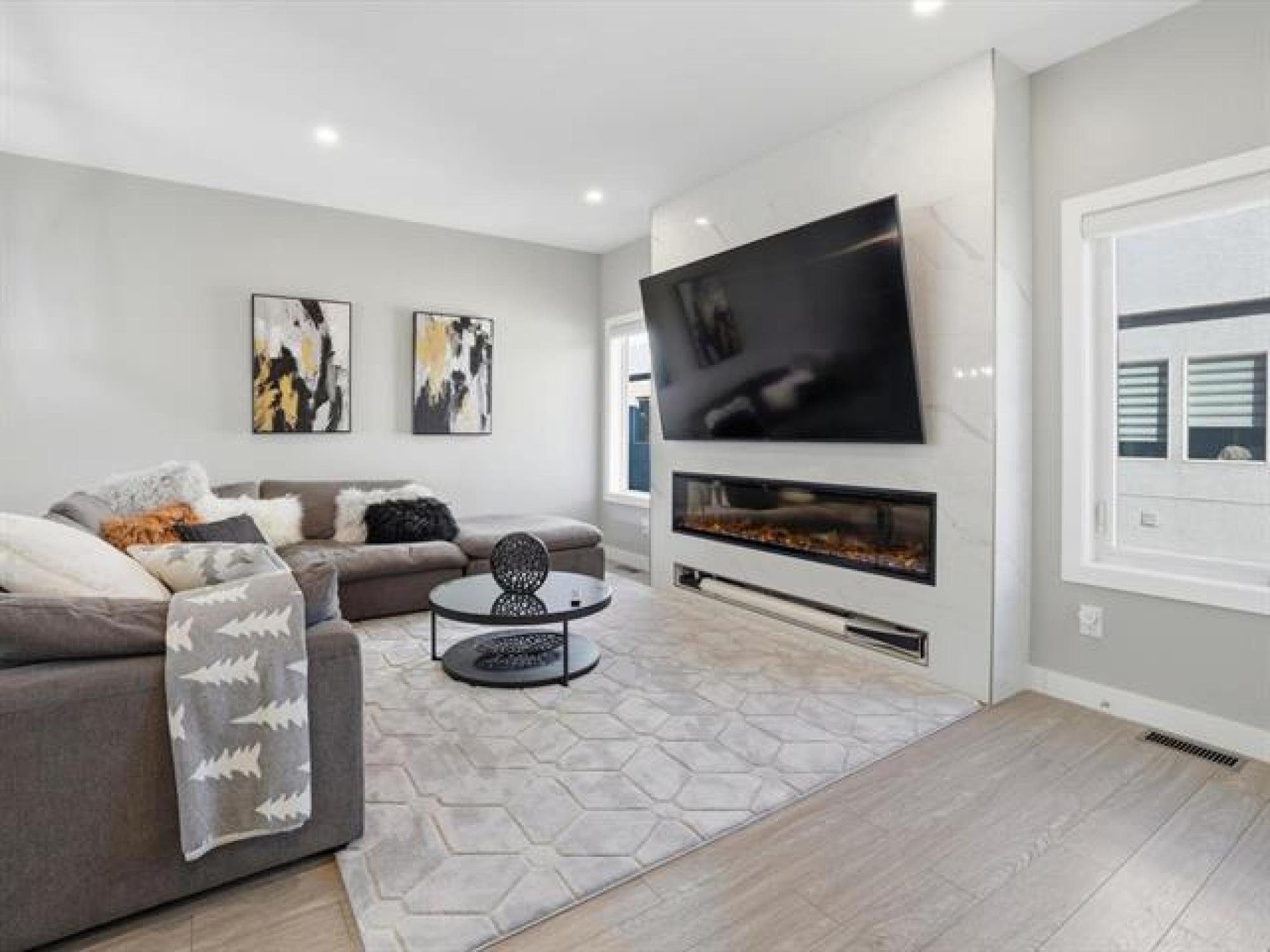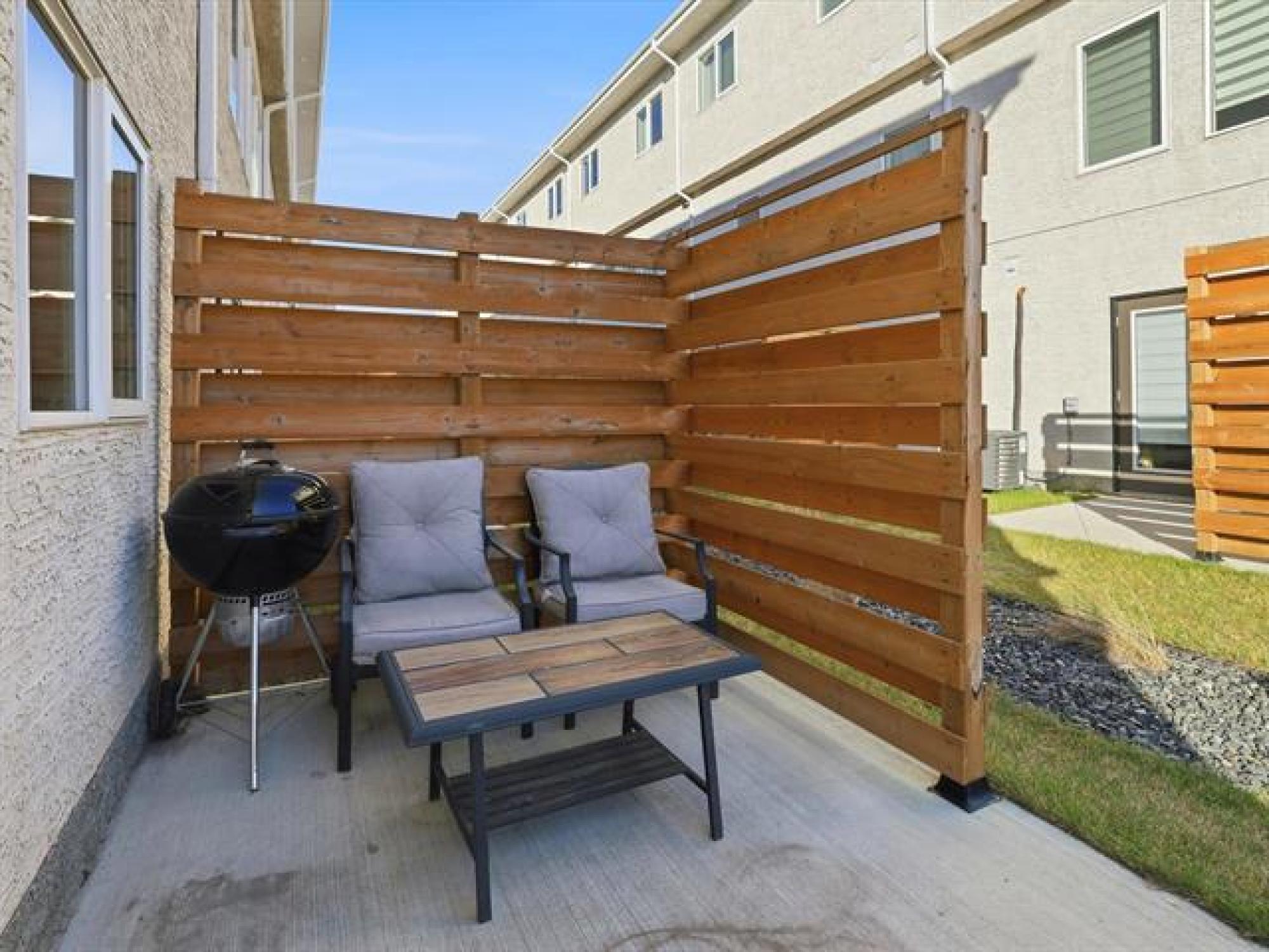 S/S Now. Offers reviewed as received. Step inside this bright corner-unit townhouse and enjoy an open, welcoming layout! The main floor features a seamless living, dining, and kitchen space with a custom fireplace feature wall that elevates the room. The upgraded kitchen adds both style and function with quartz countertops, raised cabinetry, a custom backsplash, upgraded appliances, and black cabinetry with gold hardware. A convenient powder room for guests completes this level. On the ground floor, a bonus flex room with access to the back patio offers great versatility—whether you need a home office, gym, or an extra space to unwind. Upstairs, you’ll find three generous bedrooms and a full 4-piece bath. The primary suite is a standout, featuring soaring ceilings, large windows that bring in plenty of natural light, a private balcony, a walk-in closet, and a 3-piece ensuite. Second-floor laundry adds extra ease to daily routines. With a single attached garage and a bright, modern interior, this townhouse combines comfort, style, and convenience in one of the most desirable pockets in Southwest Winnipeg steps from parks, trails, transit, and everyday amenities in and around Prairie Pointe.