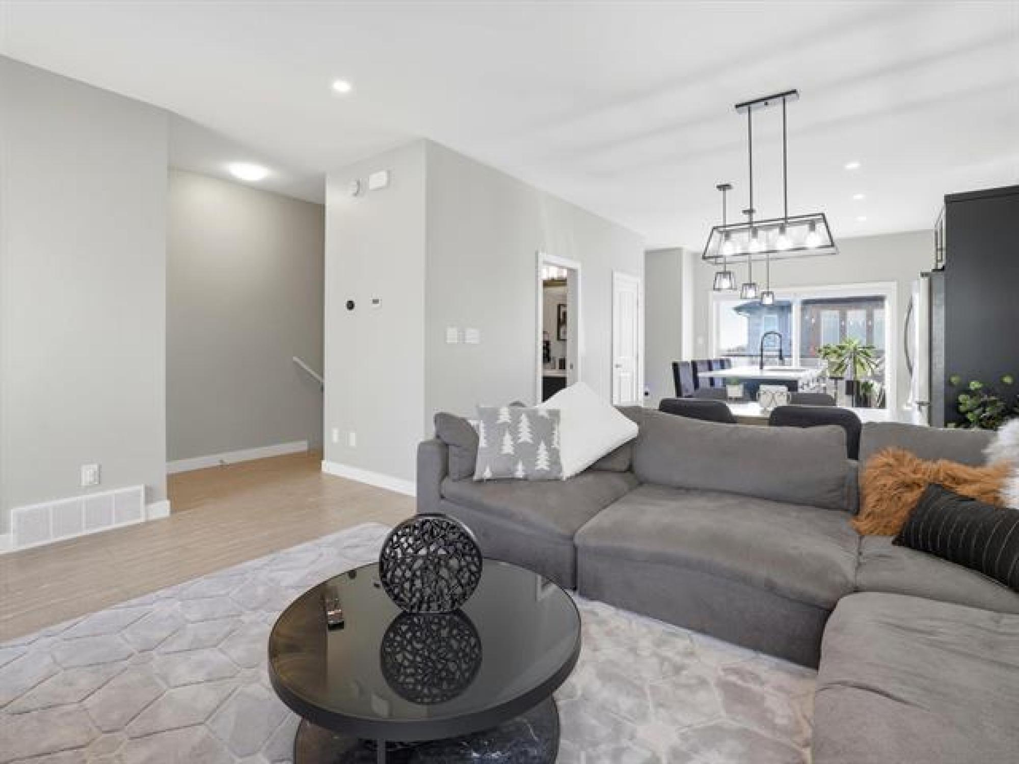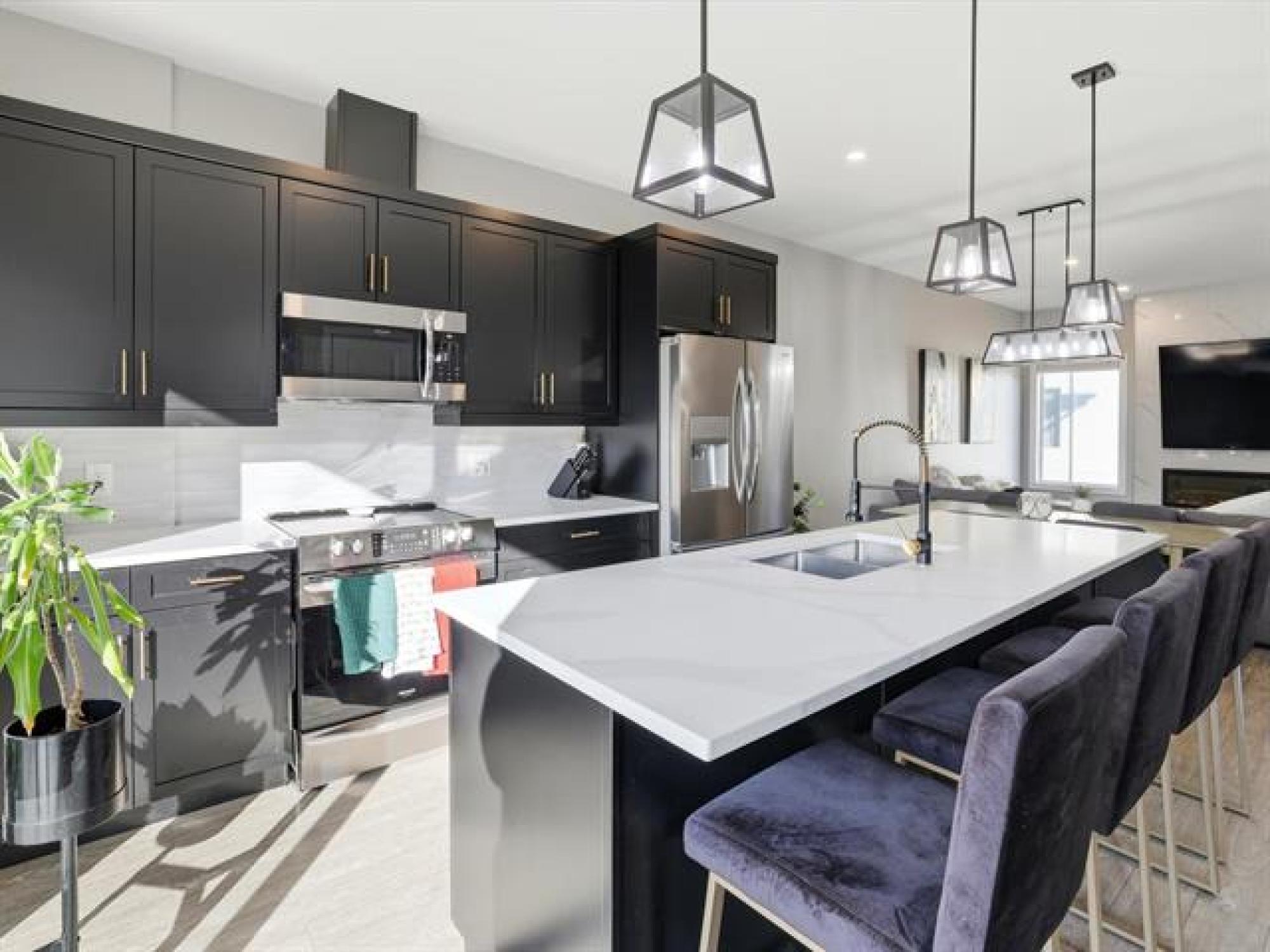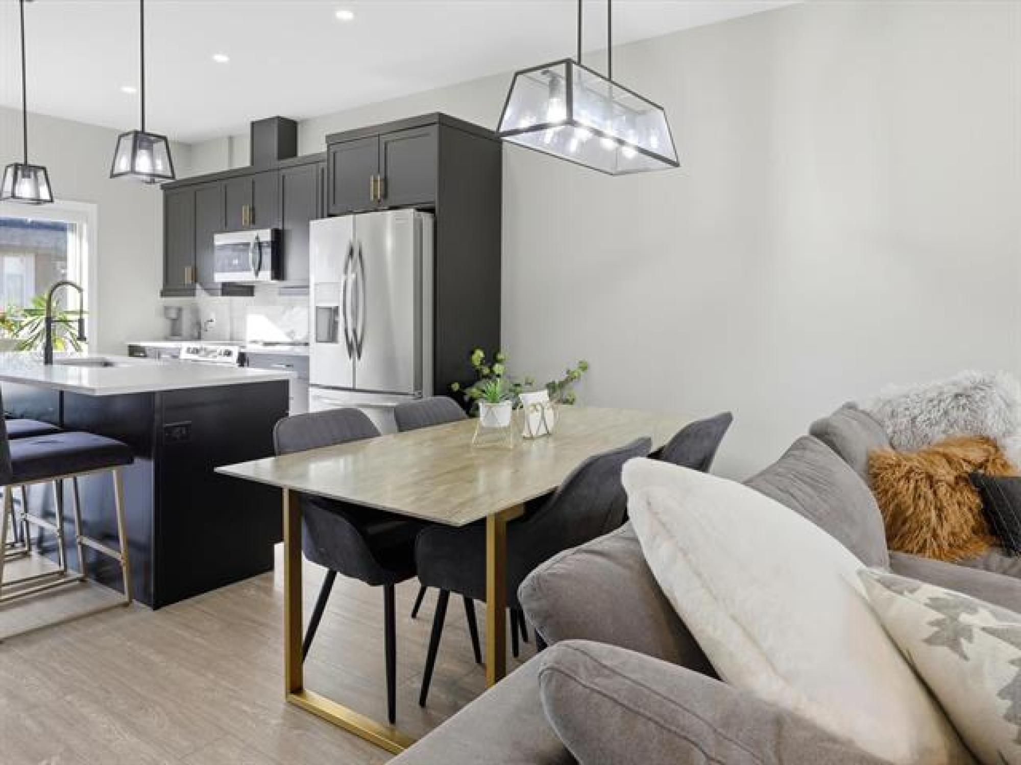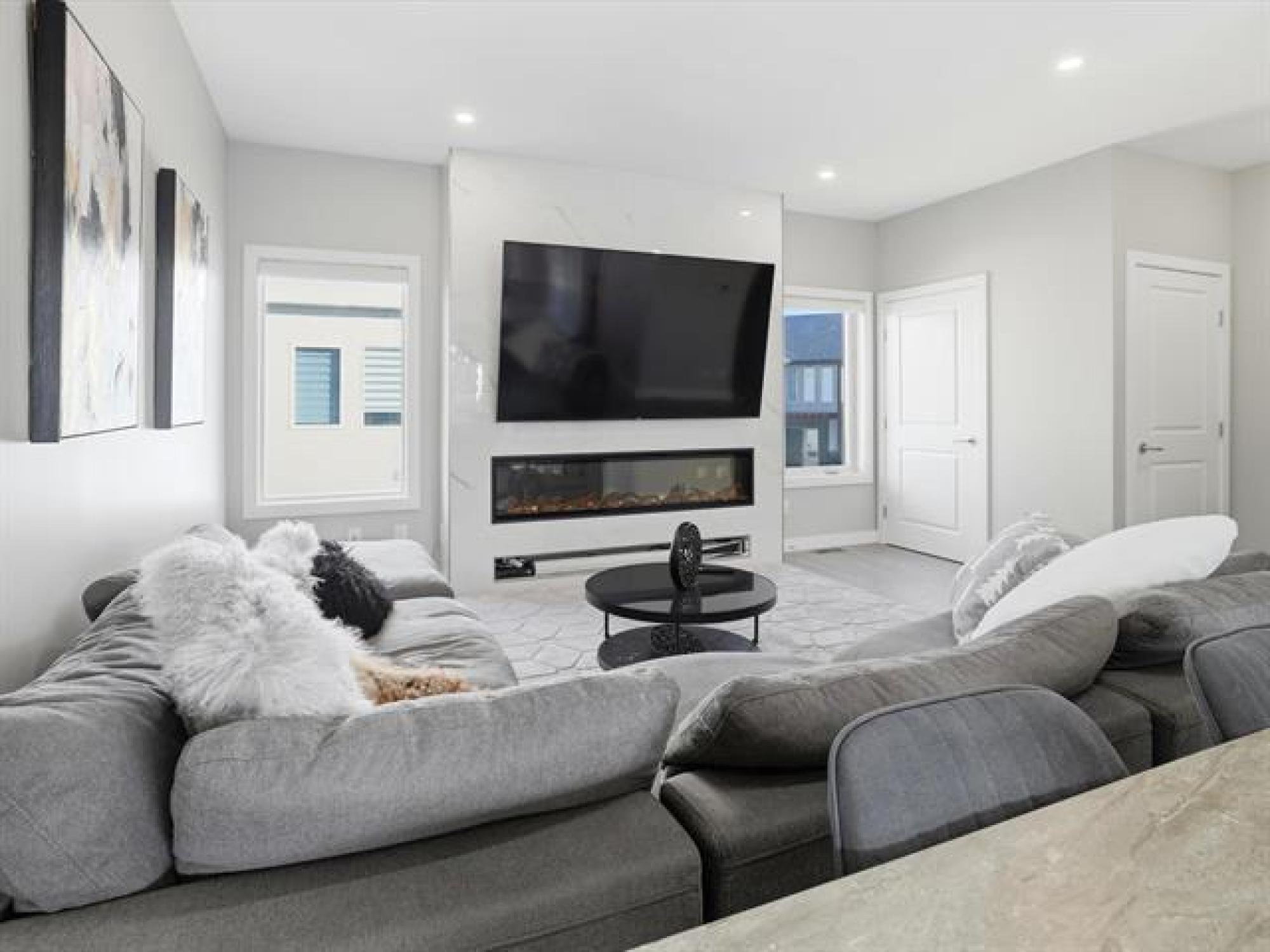 S/S Now. Offers reviewed as received. Step inside this bright corner-unit townhouse and enjoy an open, welcoming layout! The main floor features a seamless living, dining, and kitchen space with a custom fireplace feature wall that elevates the room. The upgraded kitchen adds both style and function with quartz countertops, raised cabinetry, a custom backsplash, upgraded appliances, and black cabinetry with gold hardware. A convenient powder room for guests completes this level. On the ground floor, a bonus flex room with access to the back patio offers great versatility—whether you need a home office, gym, or an extra space to unwind. Upstairs, you’ll find three generous bedrooms and a full 4-piece bath. The primary suite is a standout, featuring soaring ceilings, large windows that bring in plenty of natural light, a private balcony, a walk-in closet, and a 3-piece ensuite. Second-floor laundry adds extra ease to daily routines. With a single attached garage and a bright, modern interior, this townhouse combines comfort, style, and convenience in one of the most desirable pockets in Southwest Winnipeg steps from parks, trails, transit, and everyday amenities in and around Prairie Pointe.