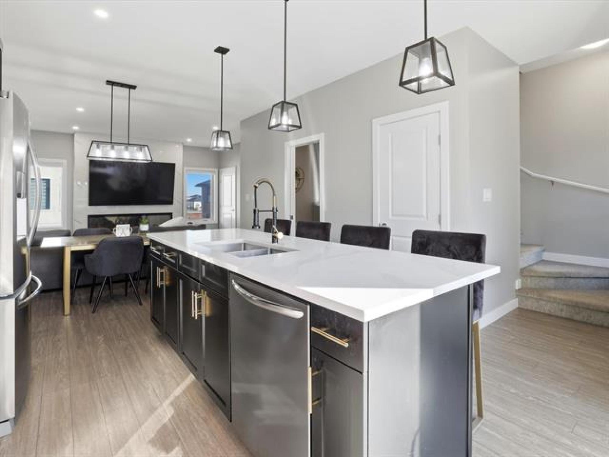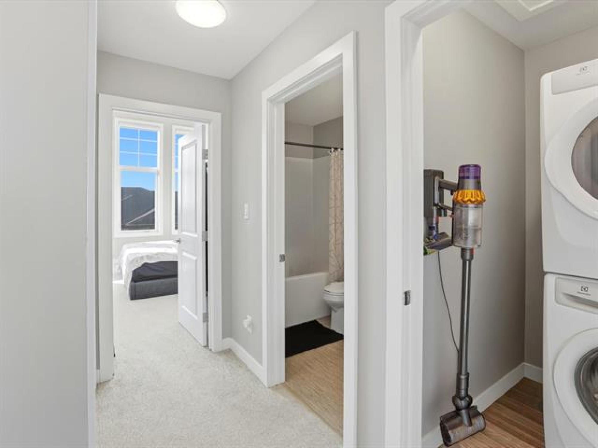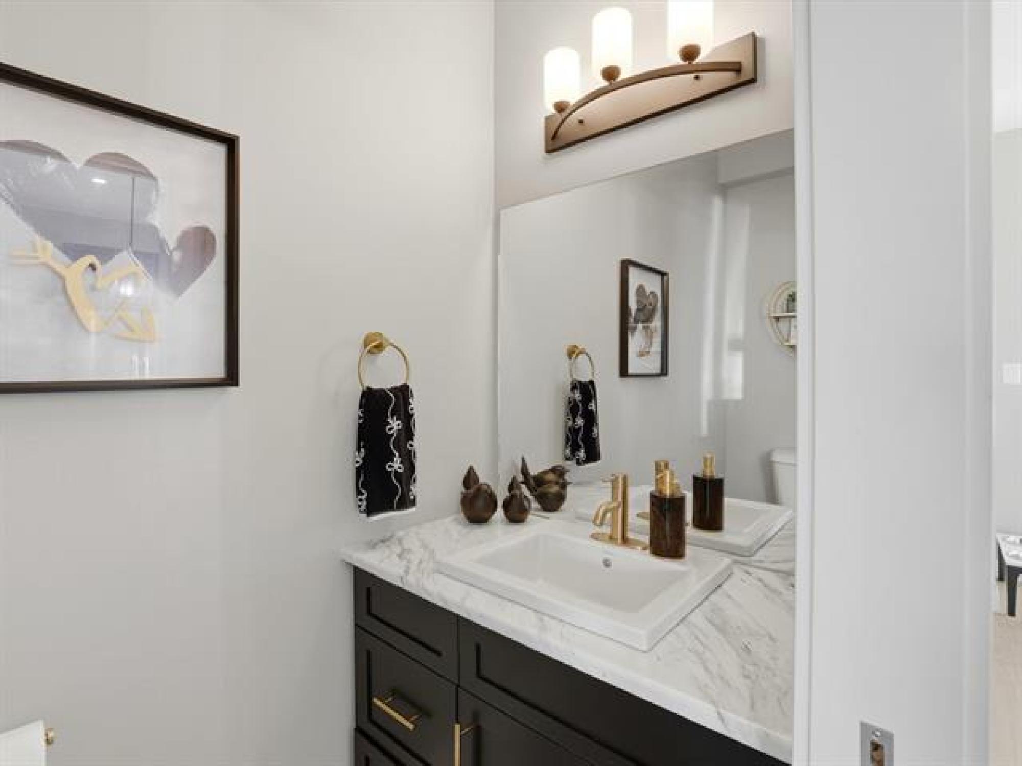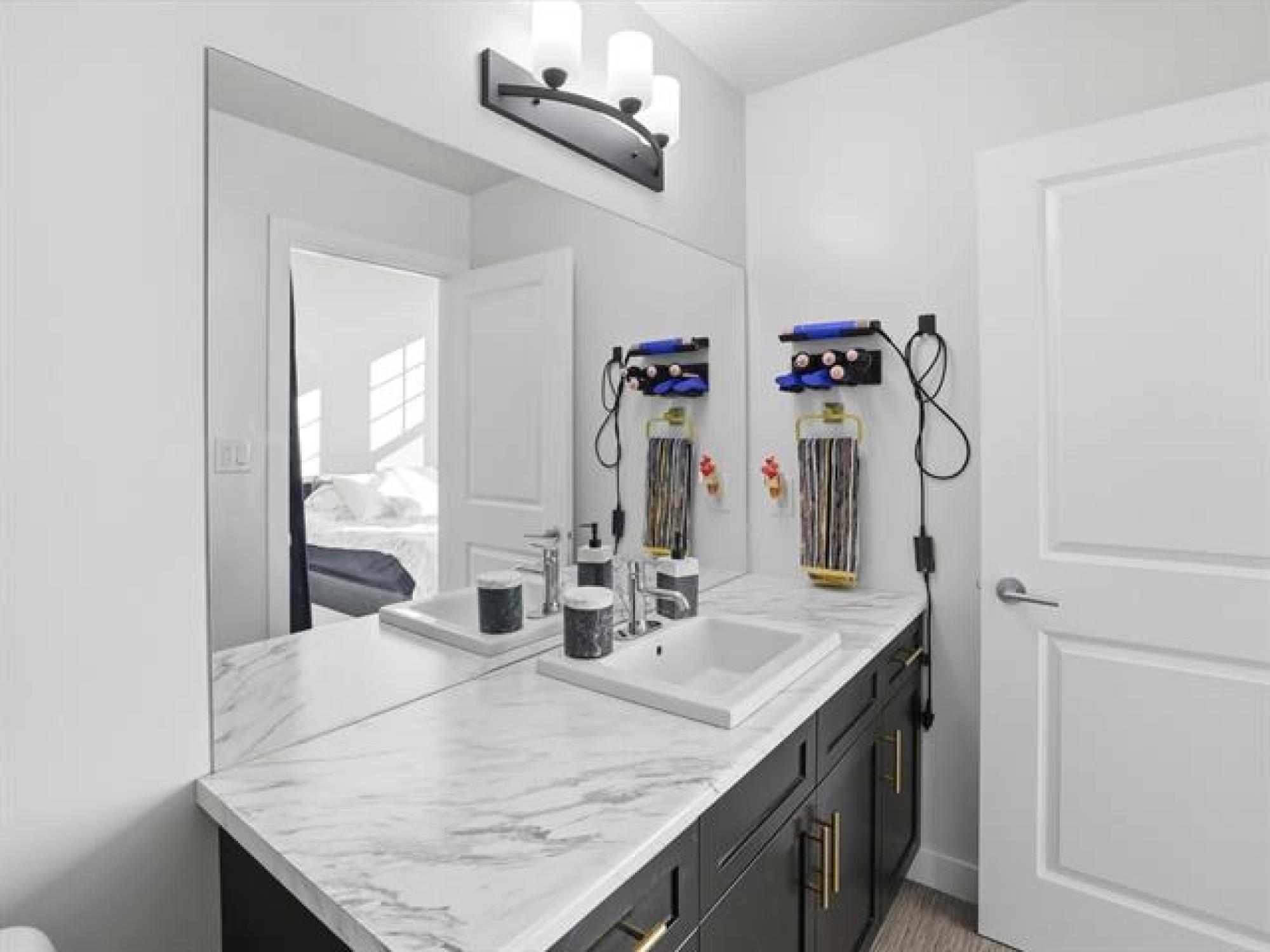 S/S Now. Offers reviewed as received. Step inside this bright corner-unit townhouse and enjoy an open, welcoming layout! The main floor features a seamless living, dining, and kitchen space with a custom fireplace feature wall that elevates the room. The upgraded kitchen adds both style and function with quartz countertops, raised cabinetry, a custom backsplash, upgraded appliances, and black cabinetry with gold hardware. A convenient powder room for guests completes this level. On the ground floor, a bonus flex room with access to the back patio offers great versatility—whether you need a home office, gym, or an extra space to unwind. Upstairs, you’ll find three generous bedrooms and a full 4-piece bath. The primary suite is a standout, featuring soaring ceilings, large windows that bring in plenty of natural light, a private balcony, a walk-in closet, and a 3-piece ensuite. Second-floor laundry adds extra ease to daily routines. With a single attached garage and a bright, modern interior, this townhouse combines comfort, style, and convenience in one of the most desirable pockets in Southwest Winnipeg steps from parks, trails, transit, and everyday amenities in and around Prairie Pointe.