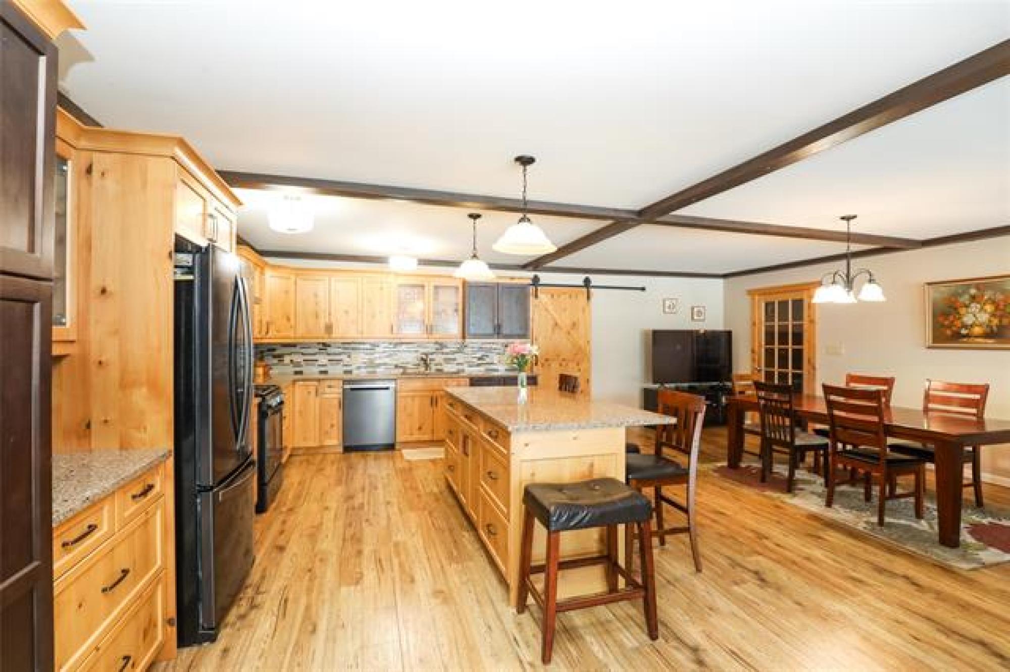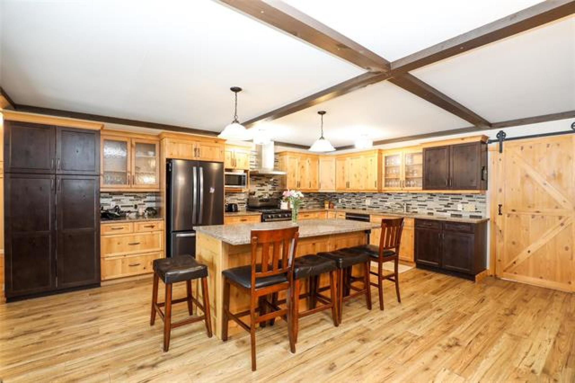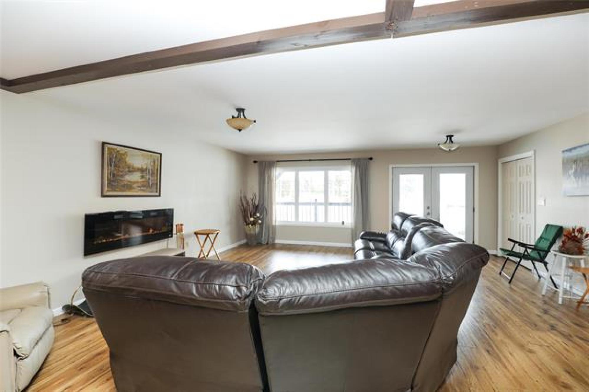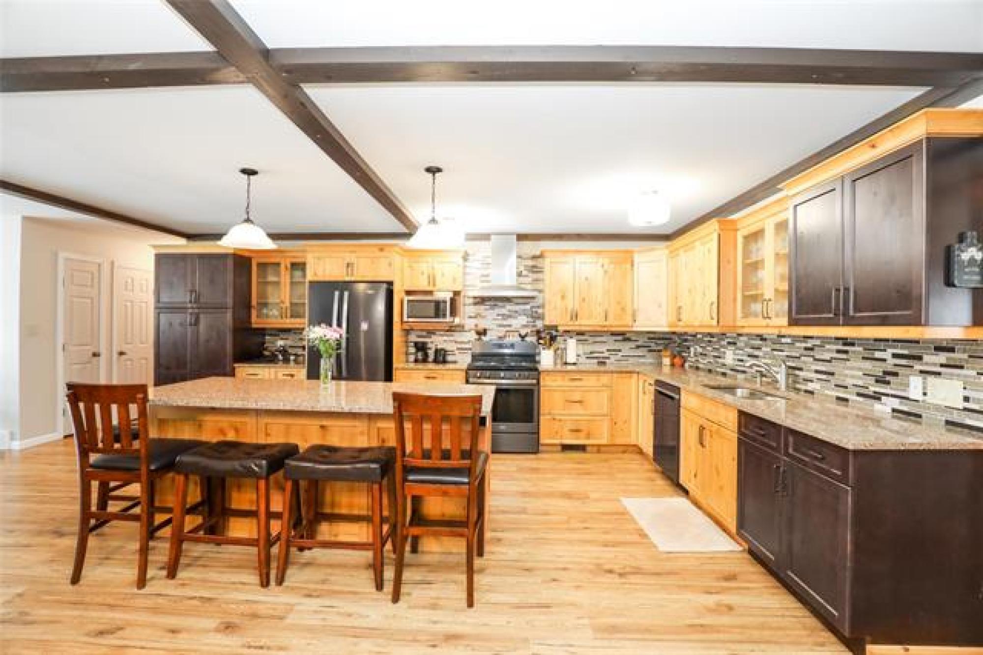 Pavement all the way to this peaceful 5 acre property with a spacious home, a 30' x40' shop, and large garden area! Only 20 minutes from Steinbach, this country gem offers the space and privacy you’ve been looking for! The home impresses with an open-concept layout, perfect for everyday living and enough room for gathering with family or friends. The living room features a large picture window and sleek electric fireplace. The kitchen features two-tone custom Alderwood cabinetry, granite countertops, high-end gas stove, stainless steel appliances, tile backsplash and spacious island. The oversized dining area features a sliding barn door that opens into a warm, inviting family room with vaulted wood ceilings and a 2nd fireplace. From there, step into the cozy 4-season sunroom with rich wood paneling and access to the covered back deck. The primary suite offers a walk-in closet and ensuite. Two more bedrooms, a 4-piece bath, and a large mudroom with laundry and storage complete the floor plan. Need more space? With an extra wall, this home could easily convert to 4 or even 5 bedrooms! Location and features are ideal for home business or a growing family - or both!