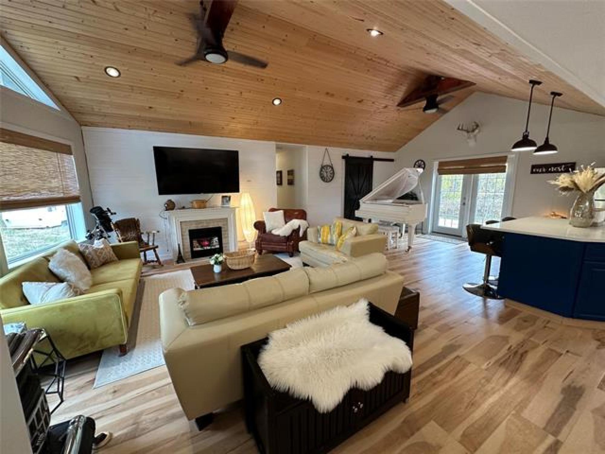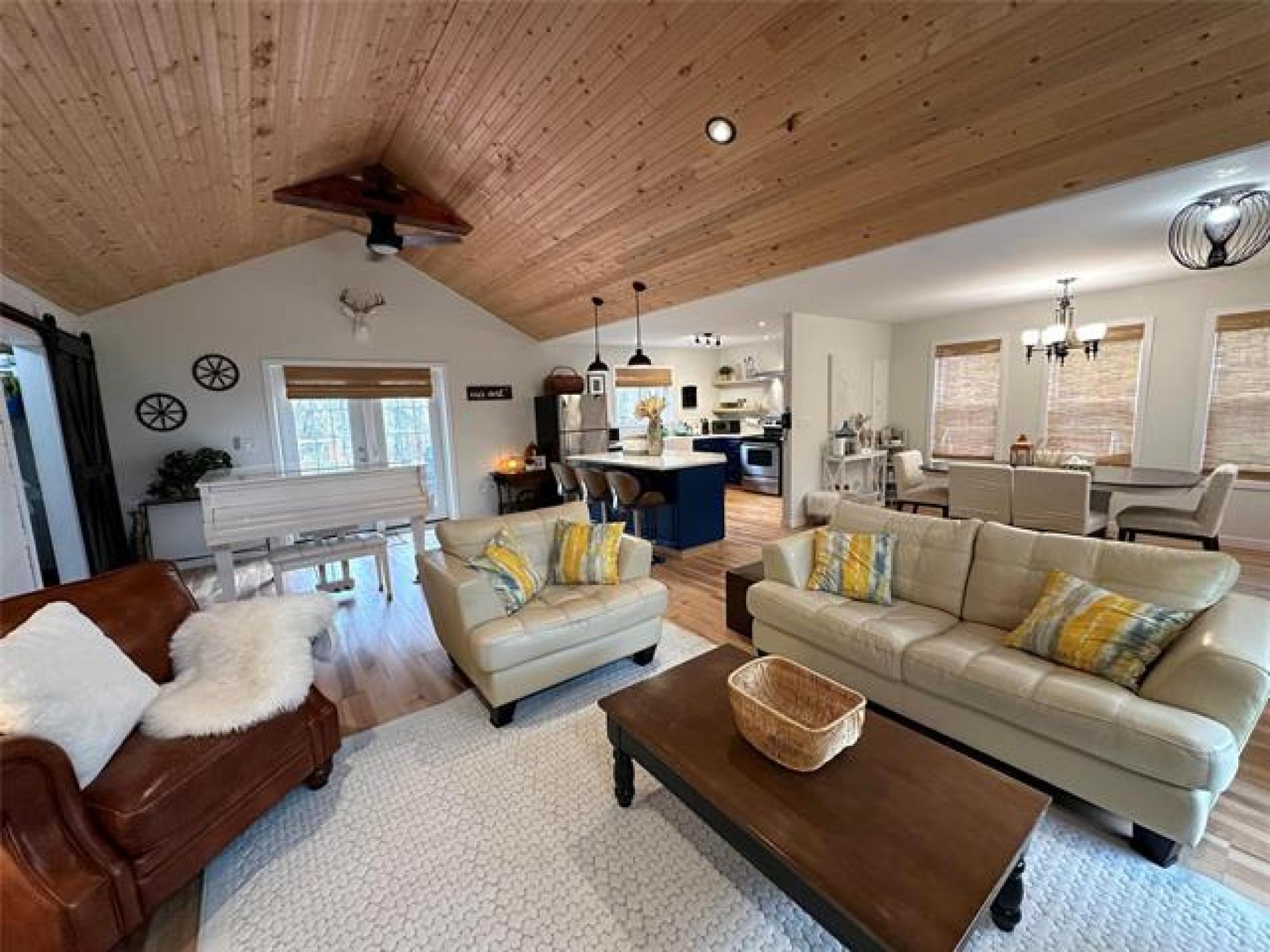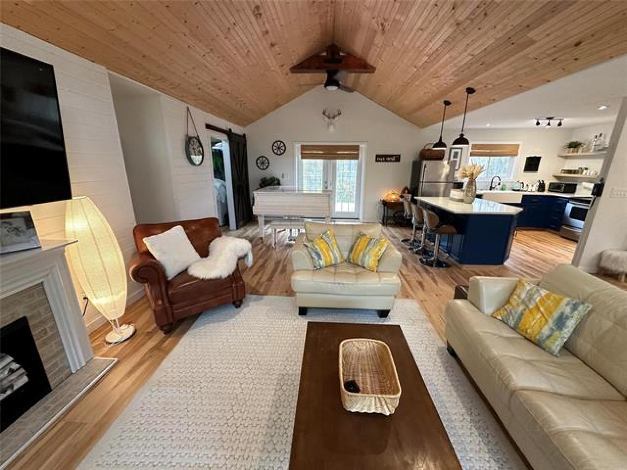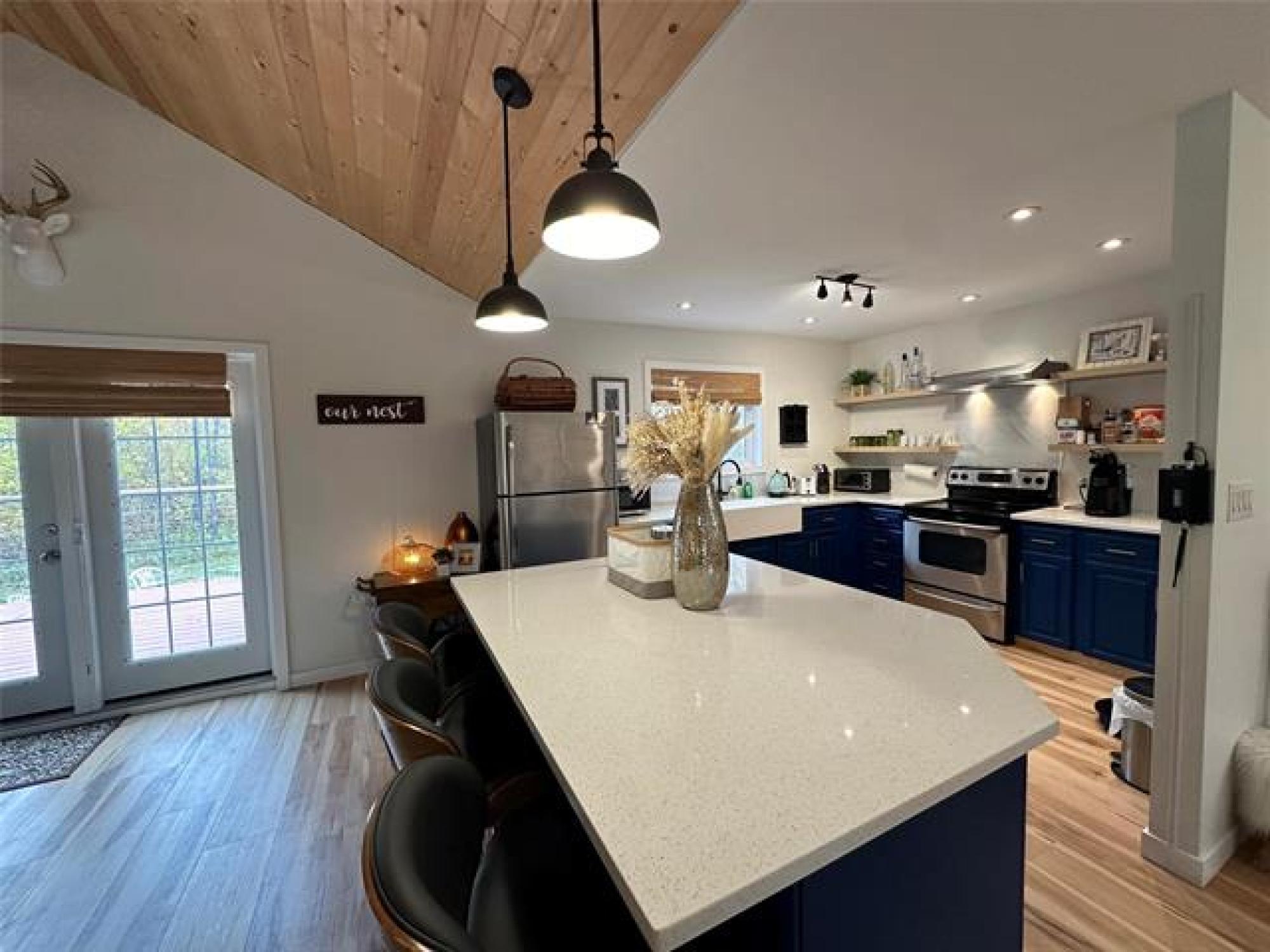 Just like new! Started in 2018, but just completed recently!! Absolutely gorgeous, with vaulted pine ceilings and quartz countertops. Built to code on a poured concrete footing, with 2x6 construction, Drilled Well, Steel roof, Forced air Furnace and Central A/C. This 1200 square foot, 3 bedroom, 2 bath home or cottage features a wide open plan with a sunroom/ entrance that opens in to the Living/Dining Room and Kitchen, and Garden doors to the Huge Composite deck and spacious rear yard, complete with kids play equipment and Firepit area. Did I mention that this is a one acre corner property only 1 block from the lake??!! Theres a composite deck on the front as well, wired overflow parking for an RV or 2 if company shows up! So Much Value! A Must See!!