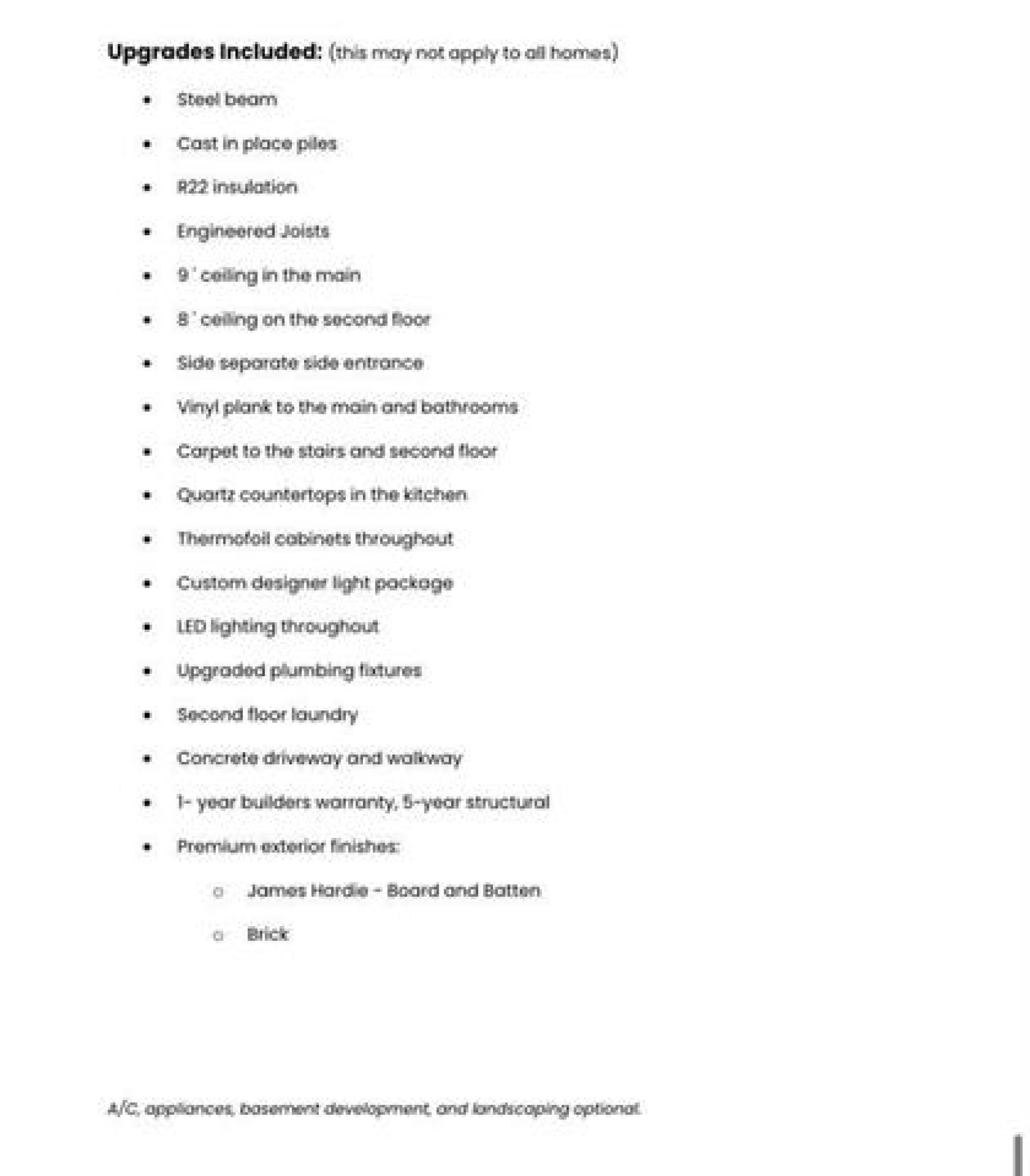 Fall possession on this under construction Canterbury Crossing side by side. Only 1 units left. Why settle for old when you can own brand new? Discover your dream home in this exclusive custom-built, single-attached, two-story home. Offering 1,472 sq ft of thoughtfully designed living space with a single attached garage, this home is perfect for raising a family in a safe and friendly cul-de-sac community. This home includes 4 bedrooms, 3 full baths and featuring 3 piece ensuite. Built with premium materials, including steel beams, cast-in-place piles, you will enjoy 9' ceilings on the main floor with wall to wall plank flooring, quartz countertops (kitchen), custom lighting, and a bonus side entrance. Wall to wall carpet upstairs with laundry room (plank) and primary suite w/walk, ensuite (plank) located the front, 2 more bedrooms at the back with 4 piece bathroom (plank). The exterior boasts durable James Hardie siding and brick, and each home from this builder comes with a 1-year builder’s warranty and a 5-year structural warranty. Secure your dream home today! Massive lot!