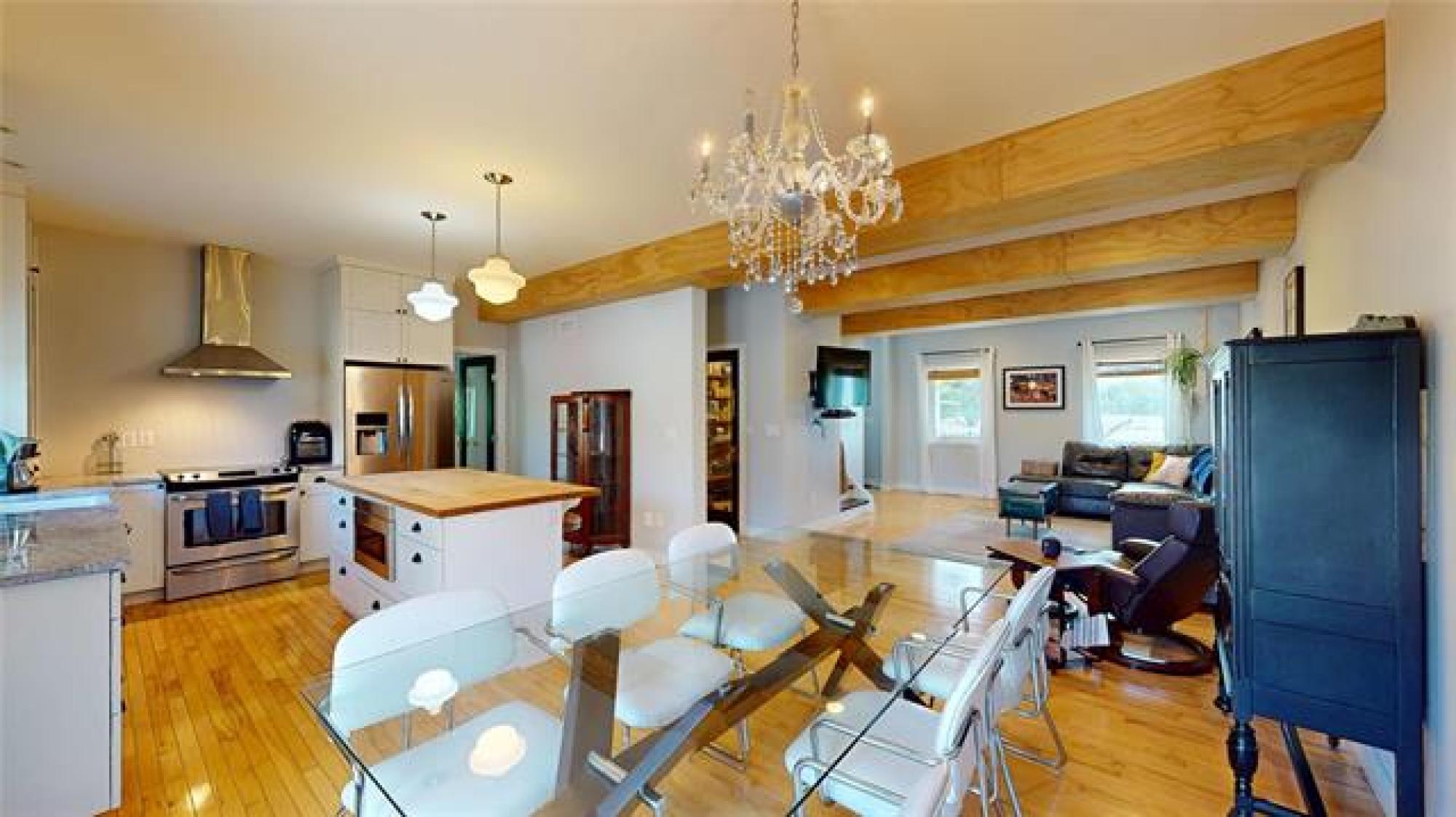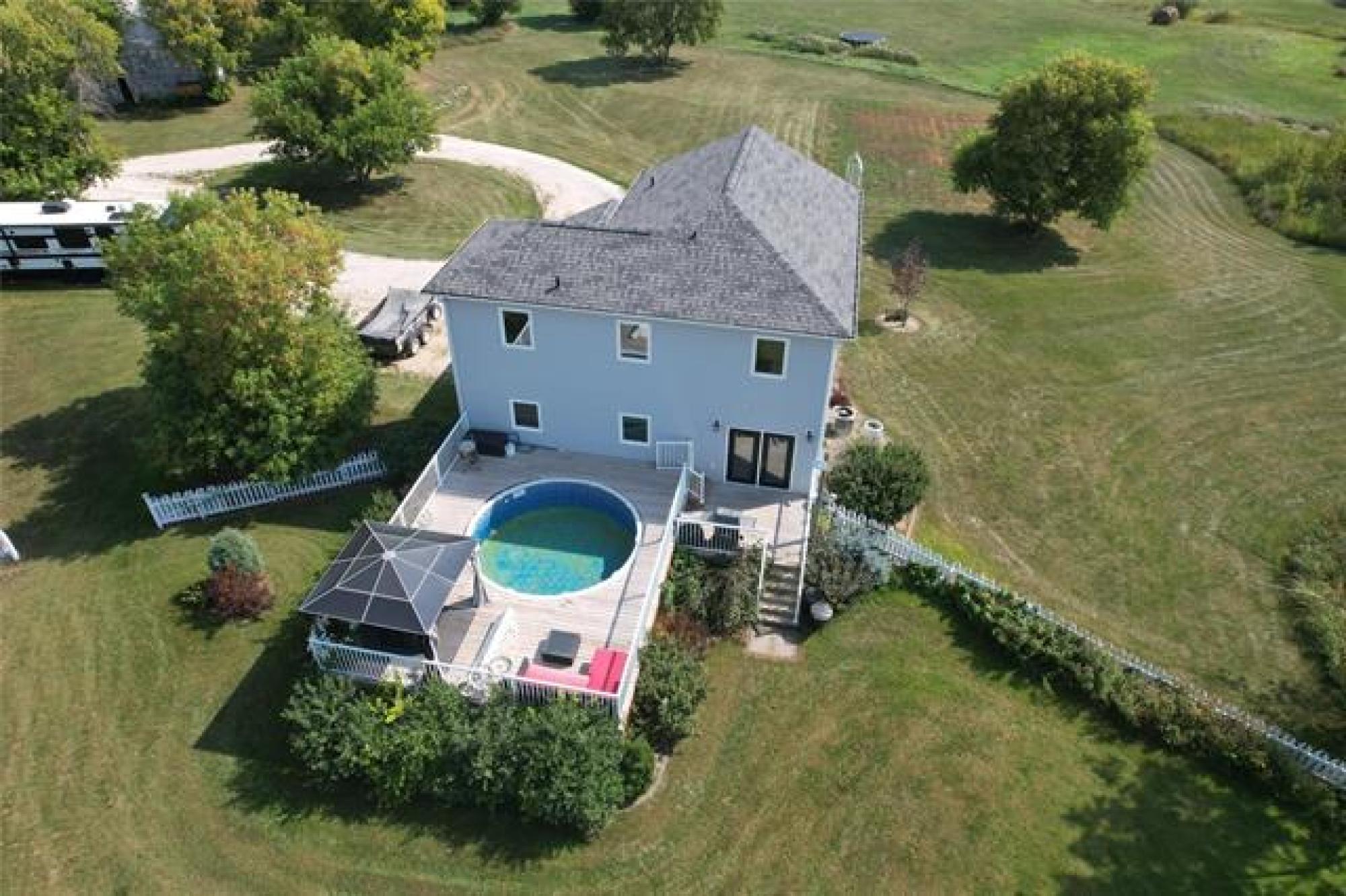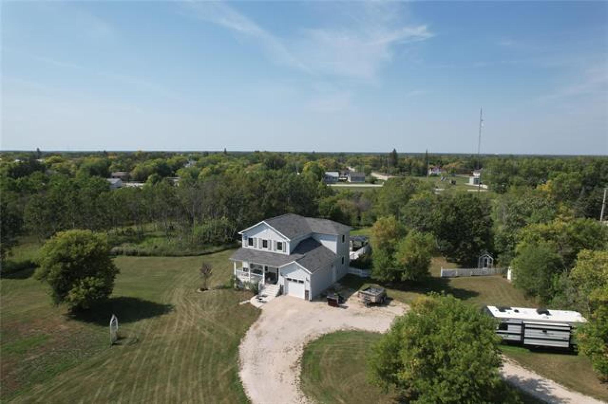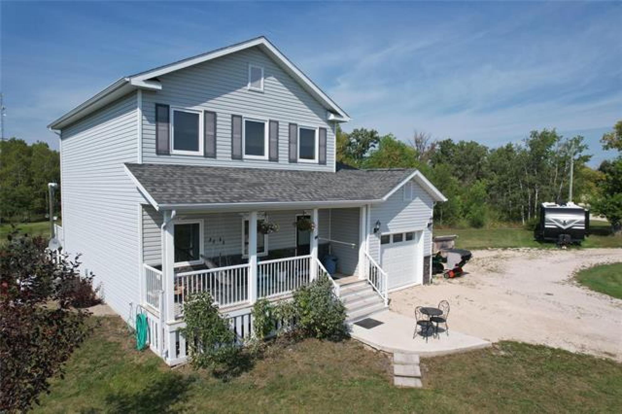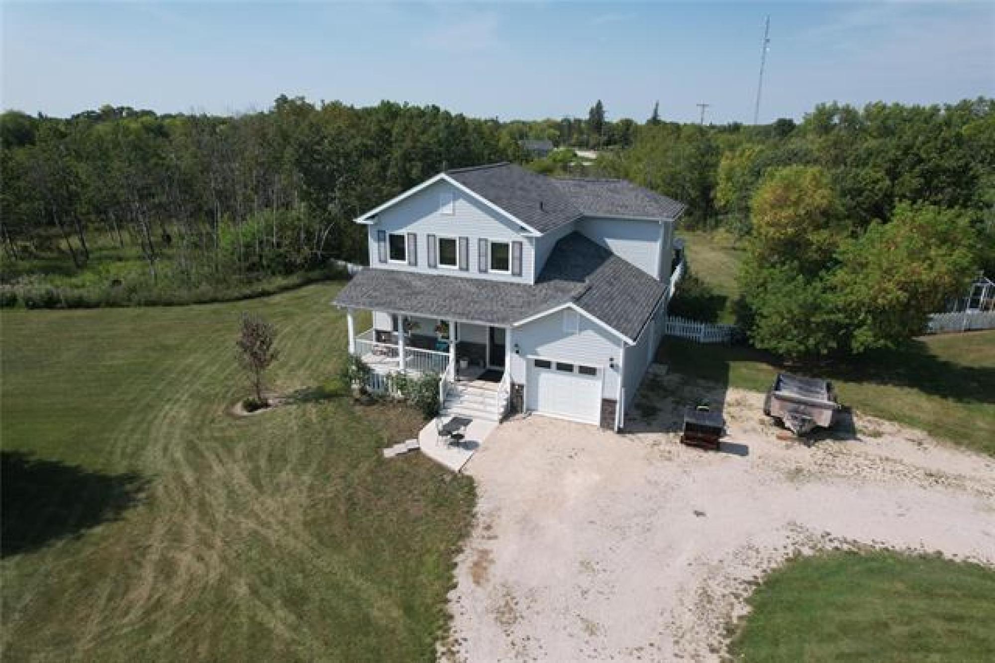 Beautifully treed and private 6.44 acres on the outskirts of Lundar. Quality built and finished, this unique home was completed in 2017. Featuring maple hardwood floors throughout and abundant natural light through many large windows, it is sure to be love at first sight! Check out the virtual tour and aerial video for a closer look. Front foyer with coat closet leads to living room with open beam ceiling and lovely dining room with garden doors to deck with pool. The island kitchen offers lots of cabinets and counter space, farmhouse sink, built in dishwasher, hood fan and large pantry in hall. Main floor office or bedroom with two piece ensuite bath. Upper level offers three bedrooms, main bath and laundry area. Primary bedroom has walk in closet and three piece ensuite bath. Forced air electric heat and central air conditioning, includes all appliances. Built on piles, sump pump. Insulated attached garage with automatic opener and in floor heat. Circular driveway and lots of parking. Quonset with concrete floor new in 2018. Gorgeous yard featuring fabulous deck with above ground pool. Country living within walking distance to town! This fantastic property is clean, well maintained and move in ready