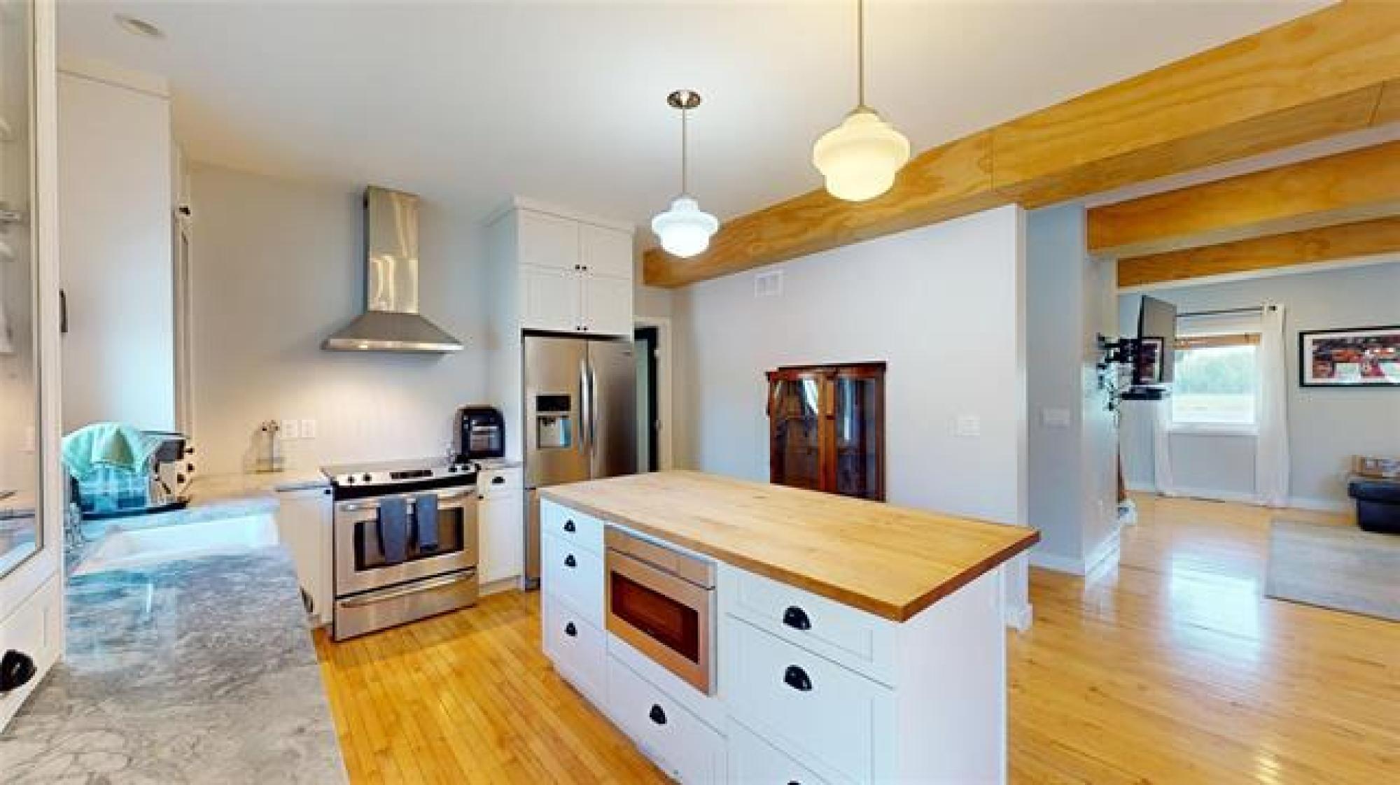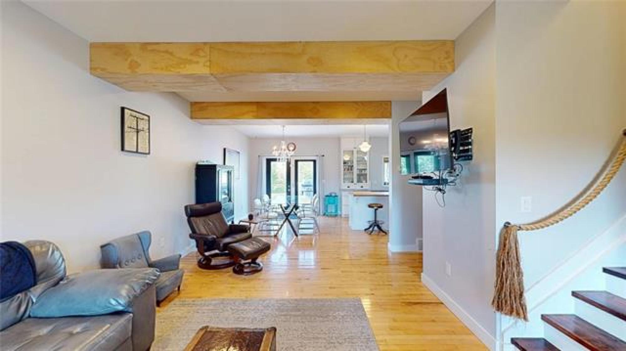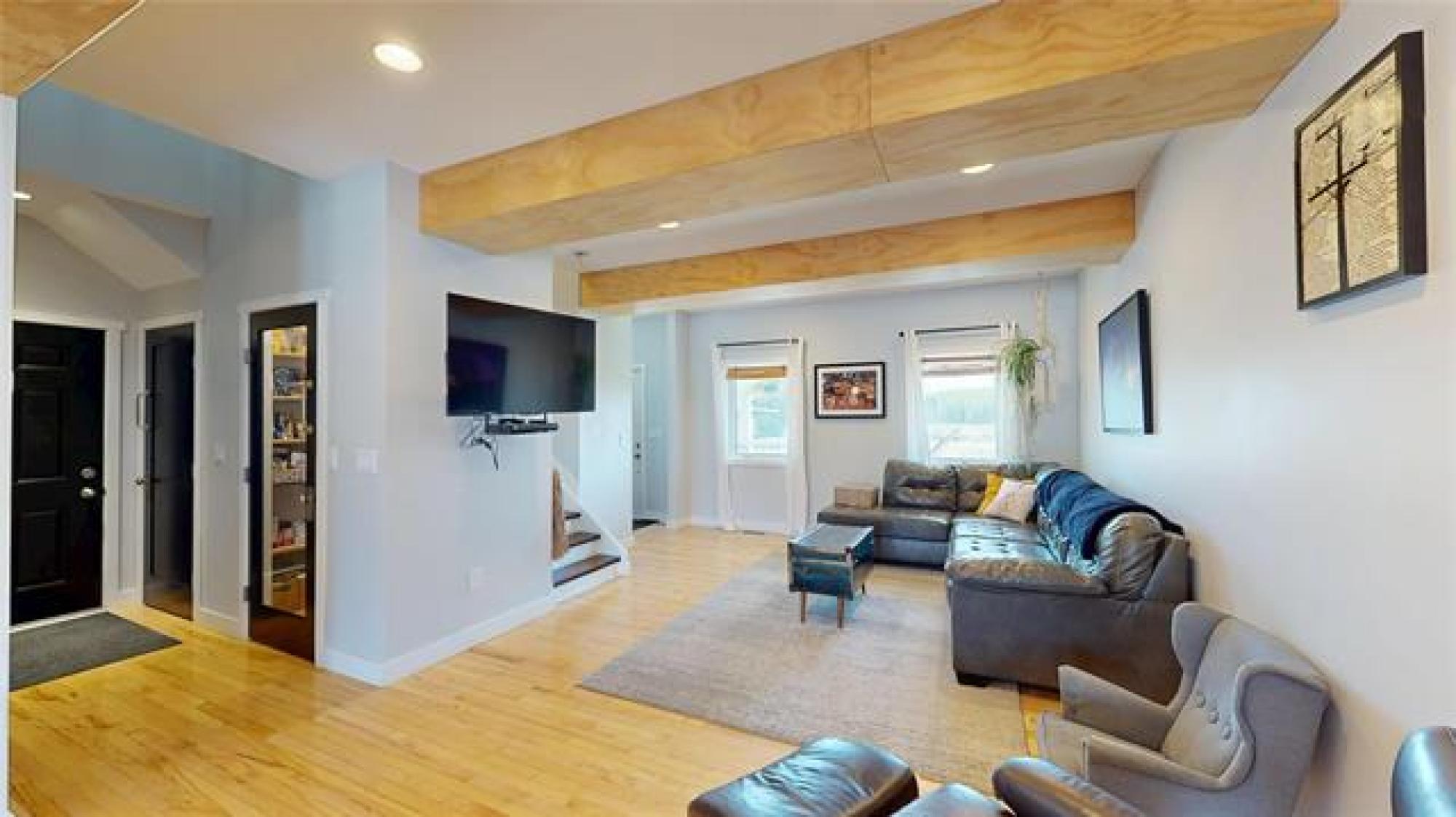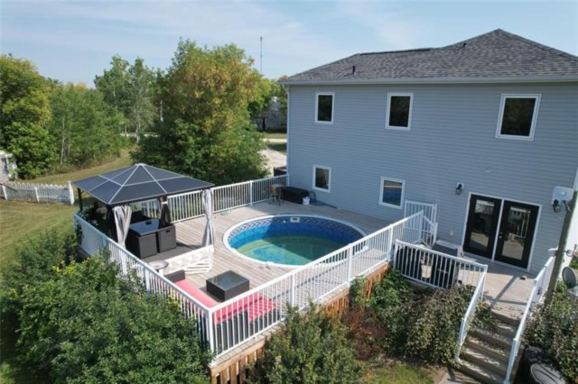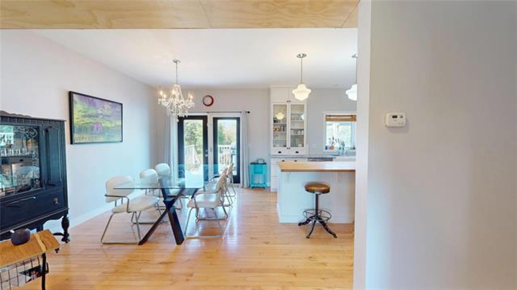 Beautifully treed and private 6.44 acres on the outskirts of Lundar. Quality built and finished, this unique home was completed in 2017. Featuring maple hardwood floors throughout and abundant natural light through many large windows, it is sure to be love at first sight! Check out the virtual tour and aerial video for a closer look. Front foyer with coat closet leads to living room with open beam ceiling and lovely dining room with garden doors to deck with pool. The island kitchen offers lots of cabinets and counter space, farmhouse sink, built in dishwasher, hood fan and large pantry in hall. Main floor office or bedroom with two piece ensuite bath. Upper level offers three bedrooms, main bath and laundry area. Primary bedroom has walk in closet and three piece ensuite bath. Forced air electric heat and central air conditioning, includes all appliances. Built on piles, sump pump. Insulated attached garage with automatic opener and in floor heat. Circular driveway and lots of parking. Quonset with concrete floor new in 2018. Gorgeous yard featuring fabulous deck with above ground pool. Country living within walking distance to town! This fantastic property is clean, well maintained and move in ready