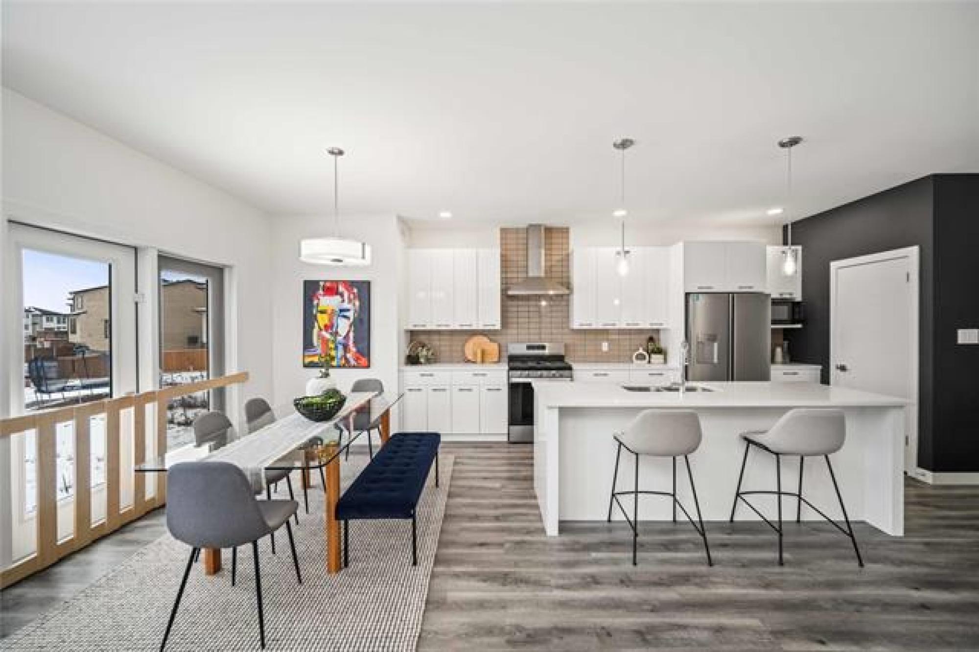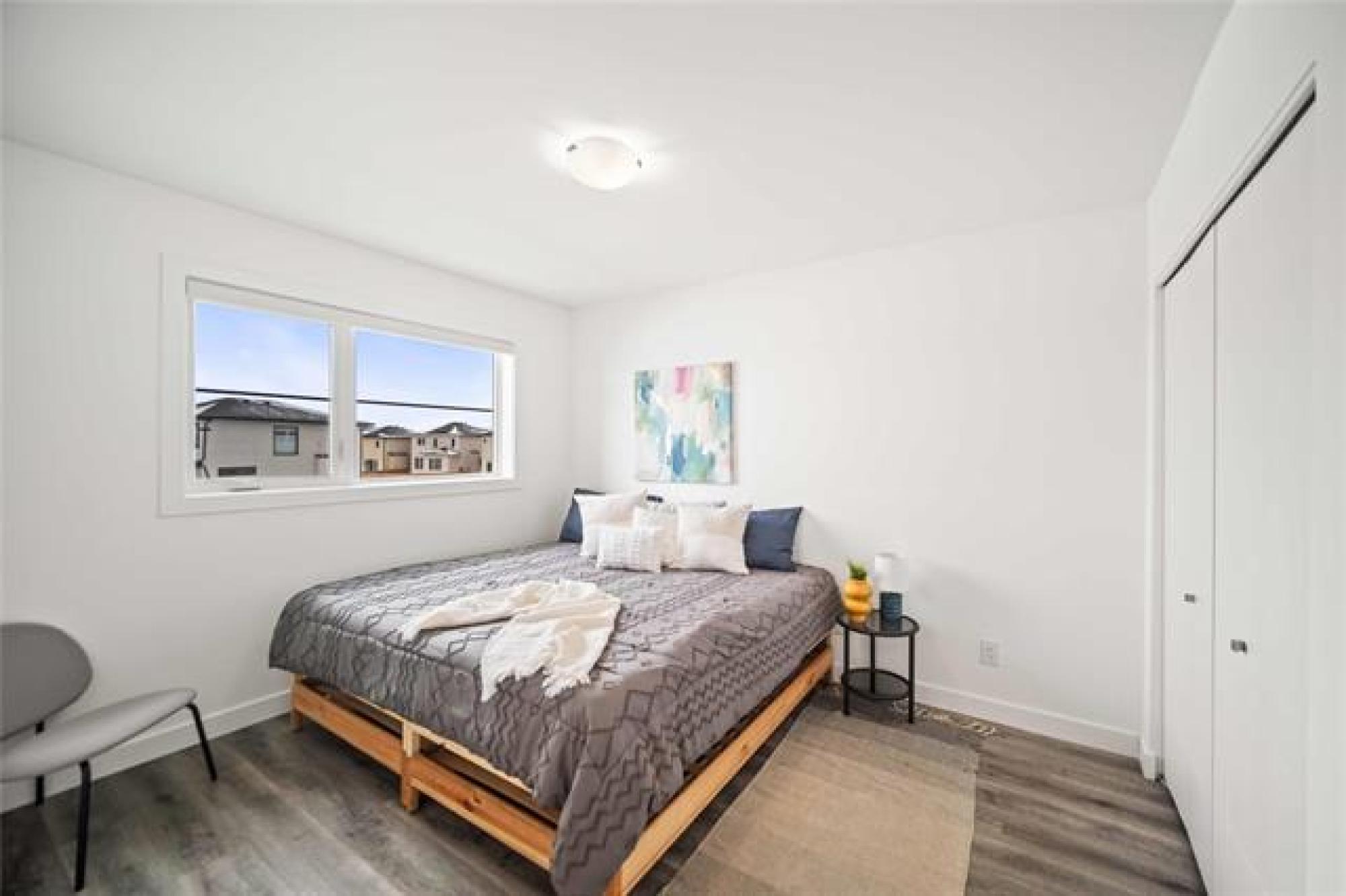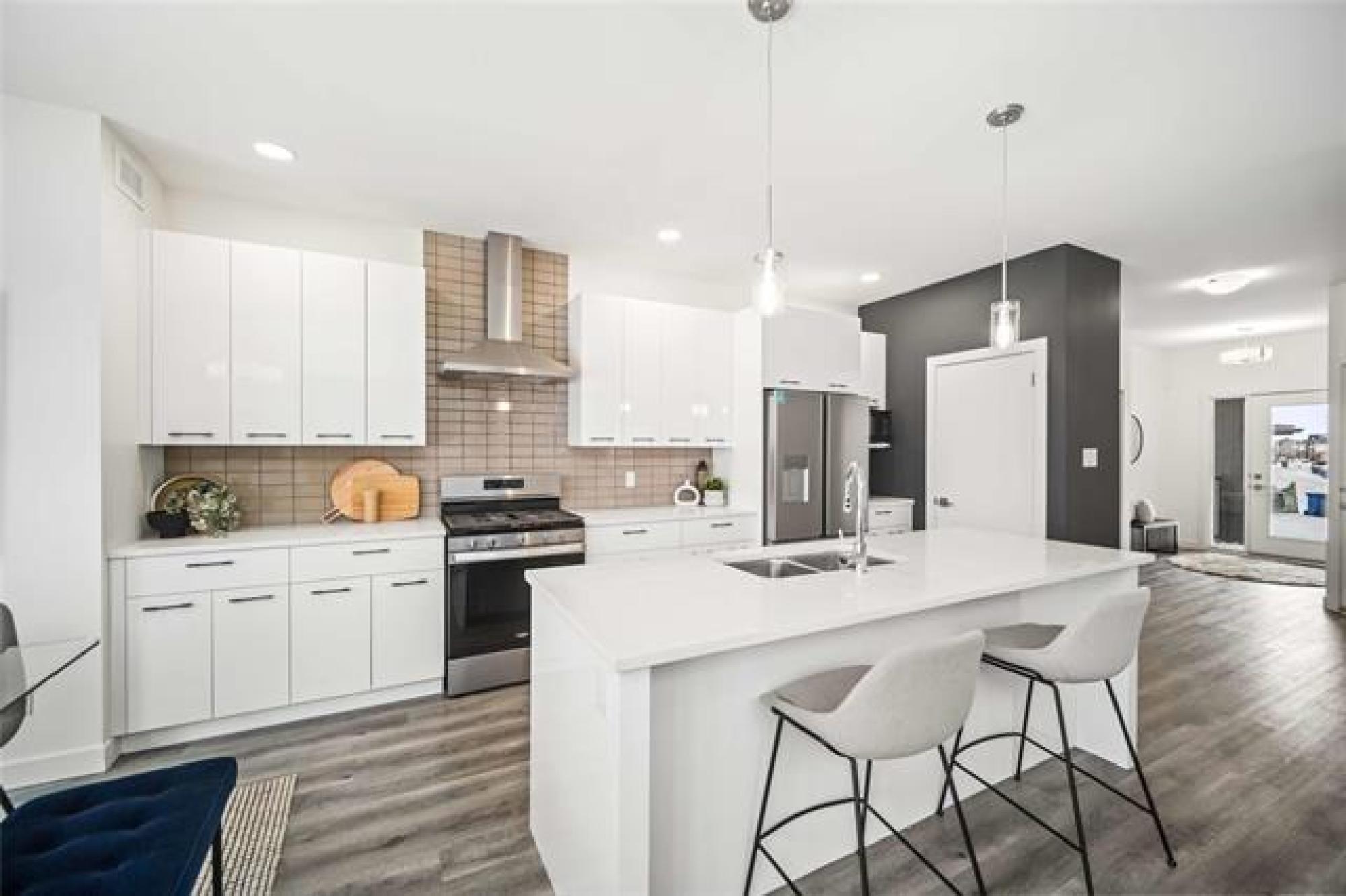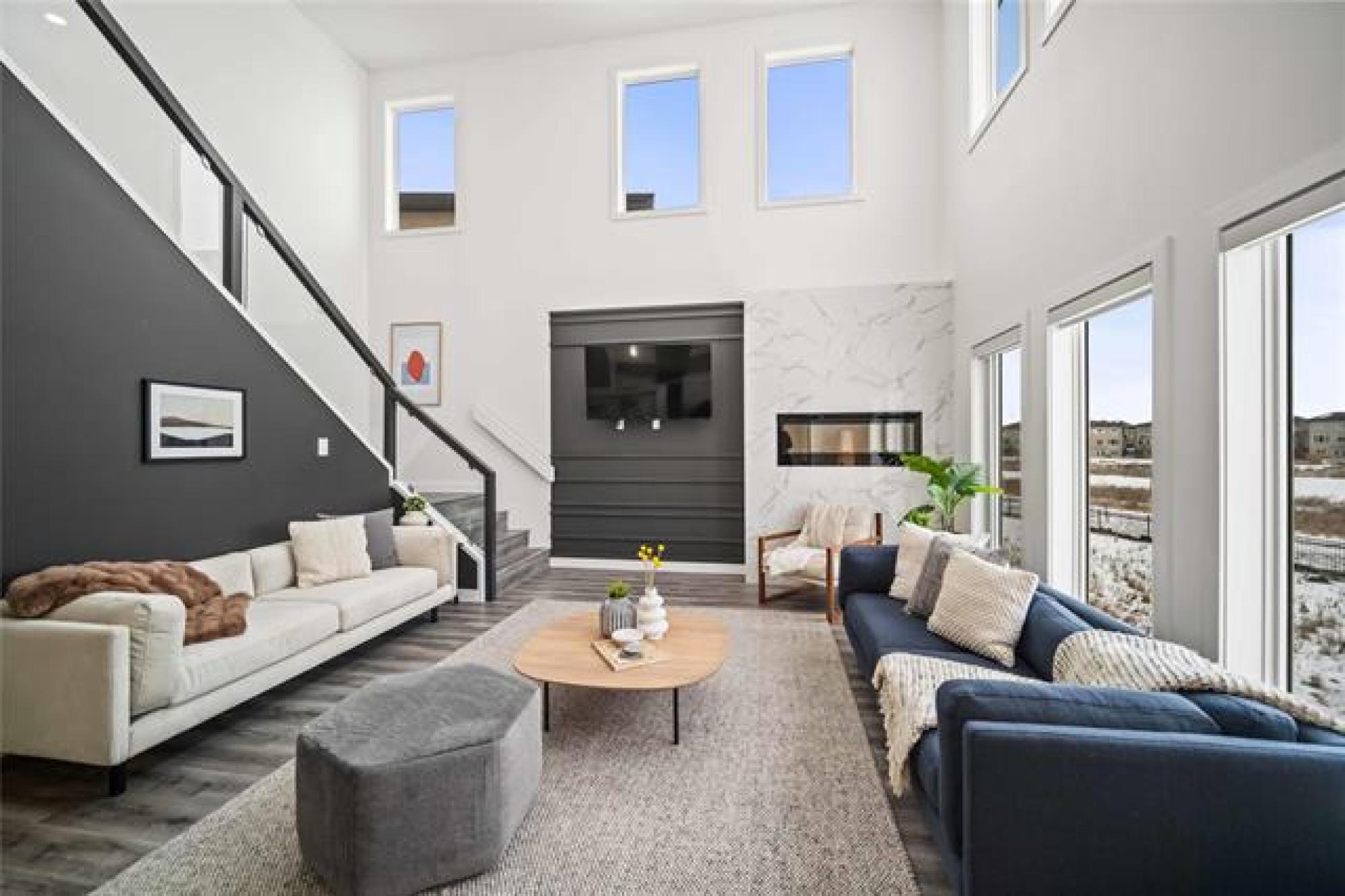 Offers as received. OPEN HOUSE SUNDAY DECEMBER 14 2:00-4:00PM. Incredible value and rarely available 2,018 sf 2-storey backing onto the like and situated on a HUGE pie shaped lot in Prairie Pointe. This home has an open concept great room plan with a large front entrance the leads into the eat-in kitchen that has tons of white cabinetry with a large island, quartz countertops, stainless steel appliances w/gas range, backsplash and pantry. The adjoining family room has 2-storey ceiling height with TONS of windows as well as an electric fireplace. There is a large 4th bedroom on the main floor that is perfect for family or guests and is complete with a full bathroom on the main floor. Upstairs there are 3 large bedrooms with the primary having lake views with a large walk-in closet and dlx ensuite bathroom. Downstairs the basement is fully finished with large look-out windows and lots of space to make this rec-room your own. This home is loaded with upgrades and unbeatable value in the neighborhood.