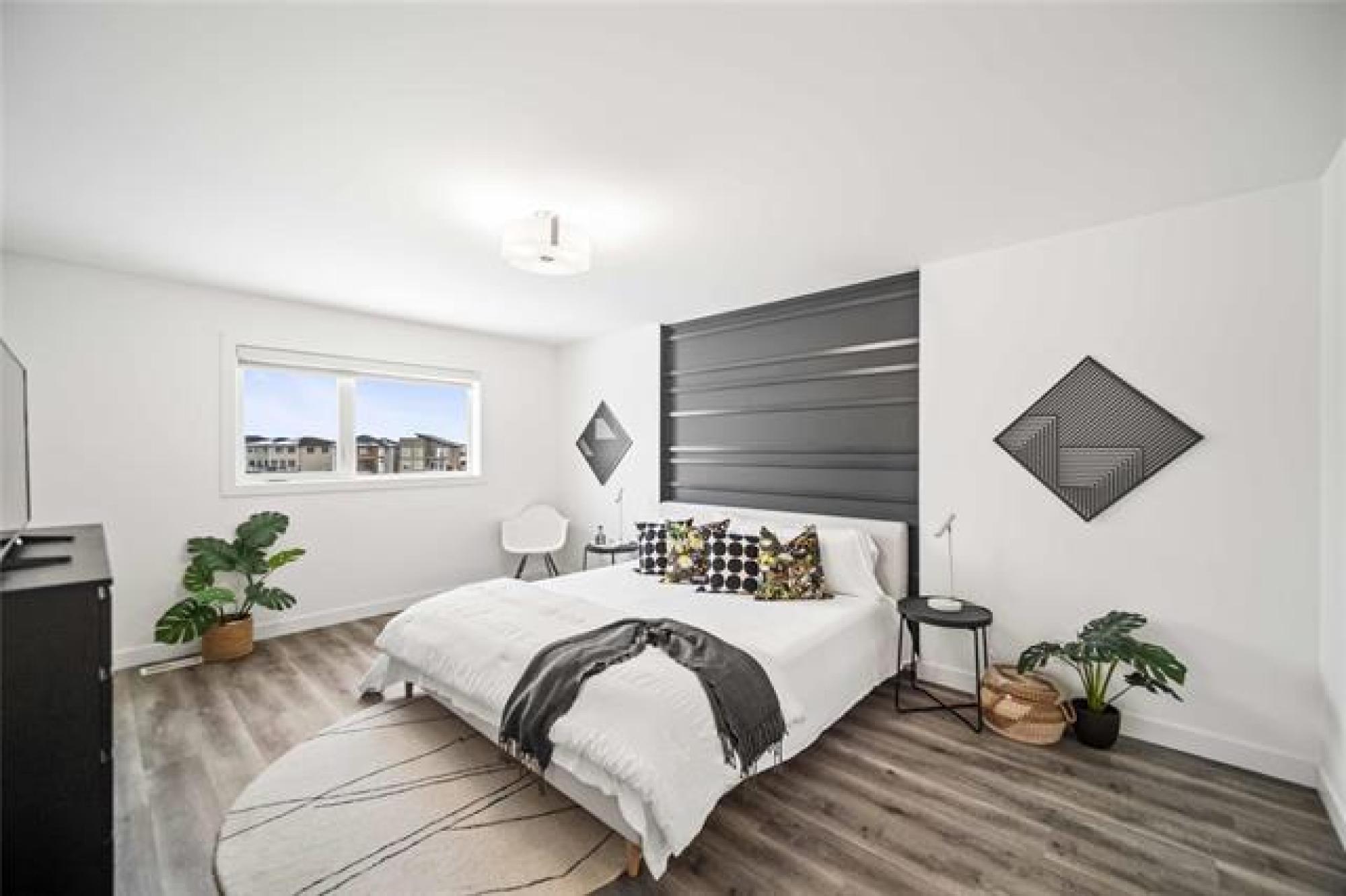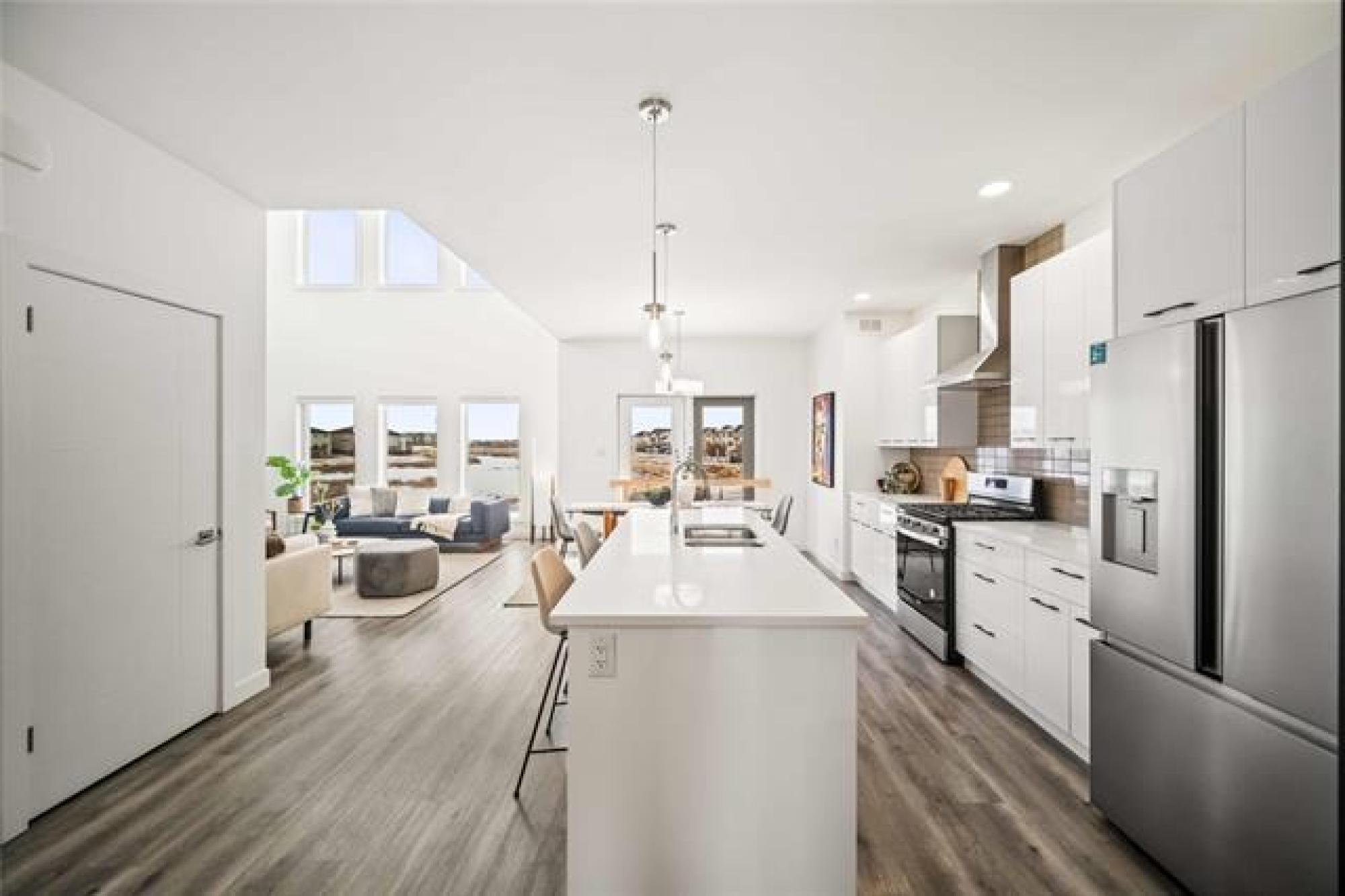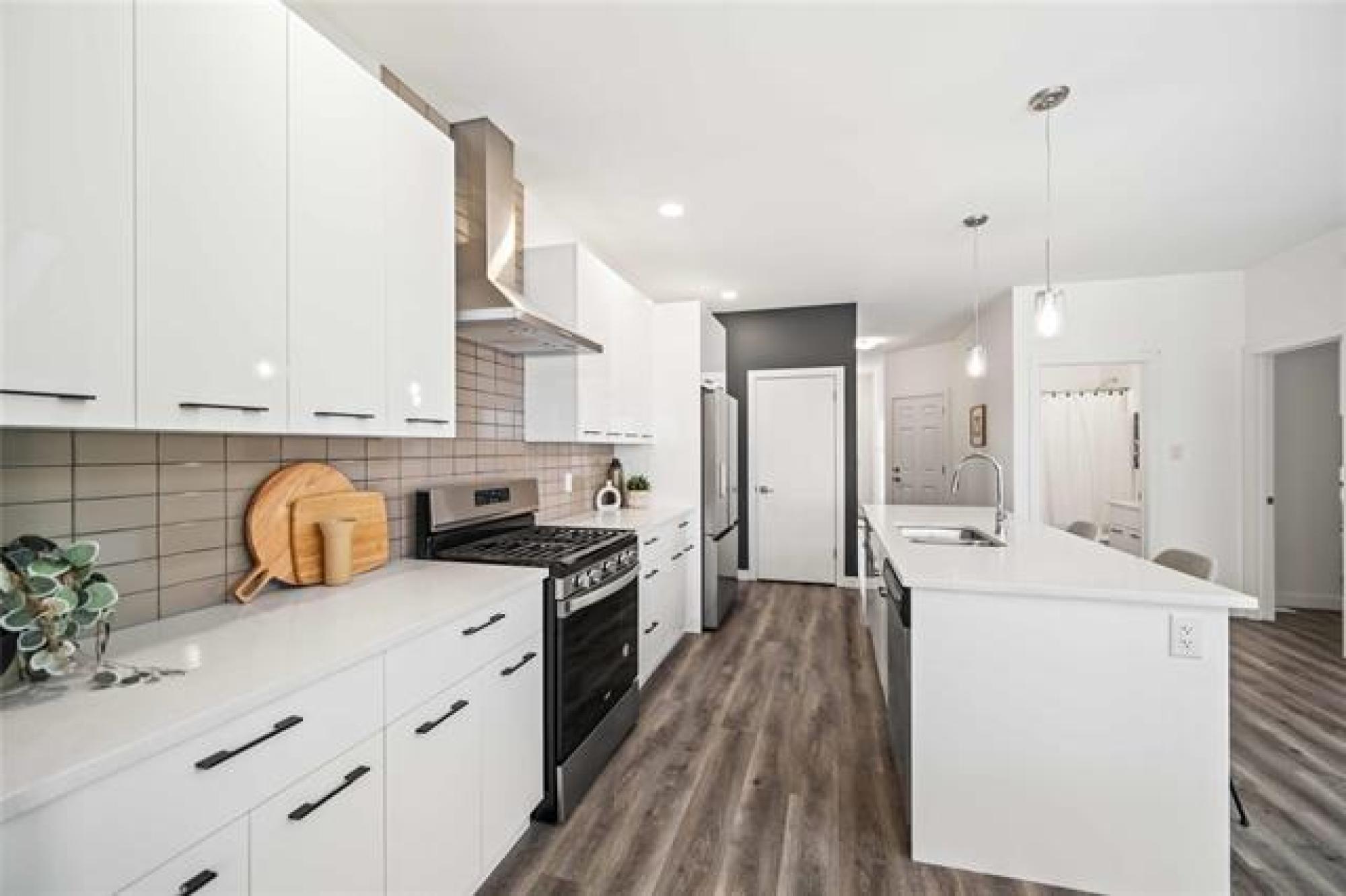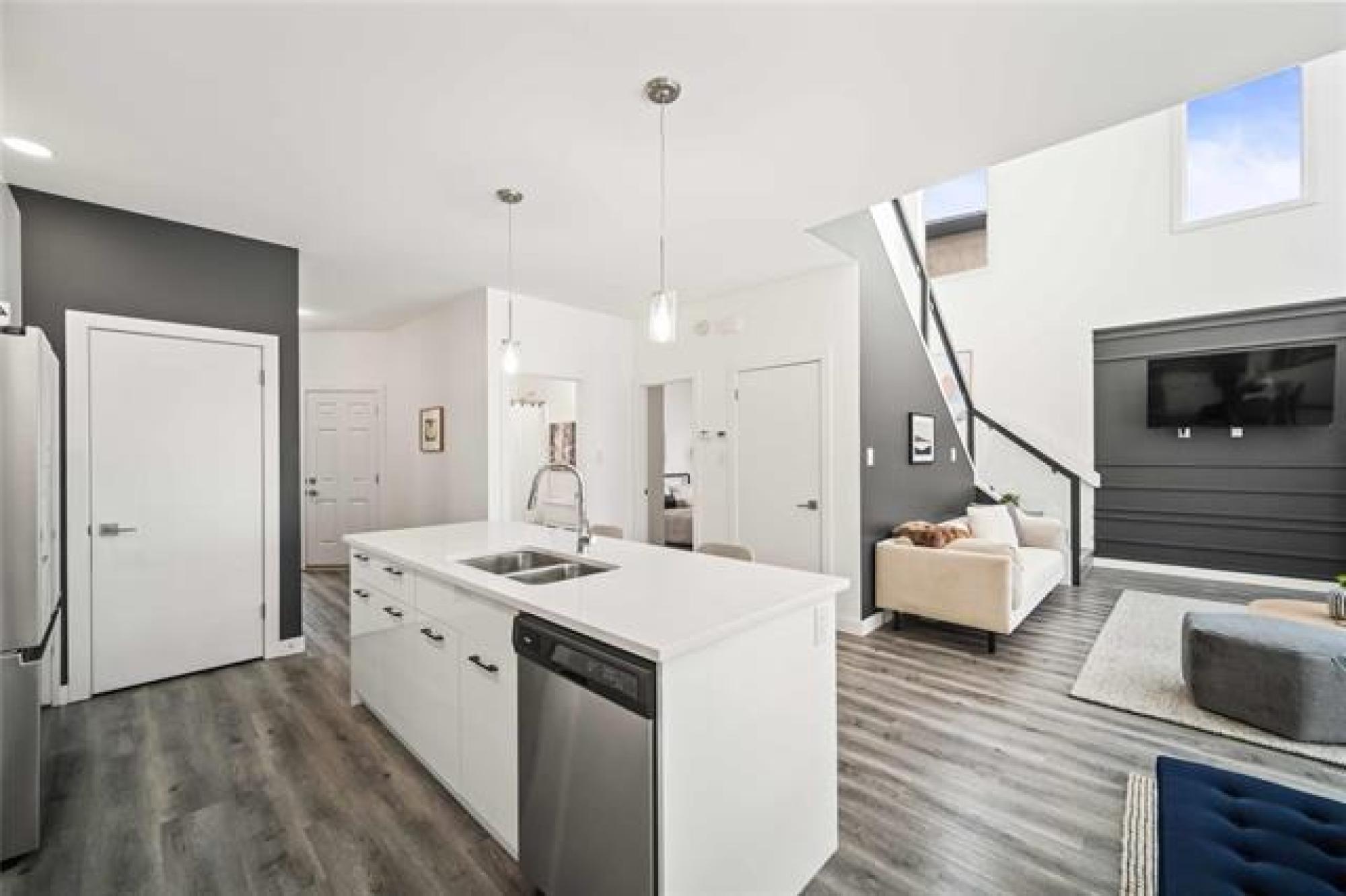 Offers as received. OPEN HOUSE SUNDAY DECEMBER 14 2:00-4:00PM. Incredible value and rarely available 2,018 sf 2-storey backing onto the like and situated on a HUGE pie shaped lot in Prairie Pointe. This home has an open concept great room plan with a large front entrance the leads into the eat-in kitchen that has tons of white cabinetry with a large island, quartz countertops, stainless steel appliances w/gas range, backsplash and pantry. The adjoining family room has 2-storey ceiling height with TONS of windows as well as an electric fireplace. There is a large 4th bedroom on the main floor that is perfect for family or guests and is complete with a full bathroom on the main floor. Upstairs there are 3 large bedrooms with the primary having lake views with a large walk-in closet and dlx ensuite bathroom. Downstairs the basement is fully finished with large look-out windows and lots of space to make this rec-room your own. This home is loaded with upgrades and unbeatable value in the neighborhood.