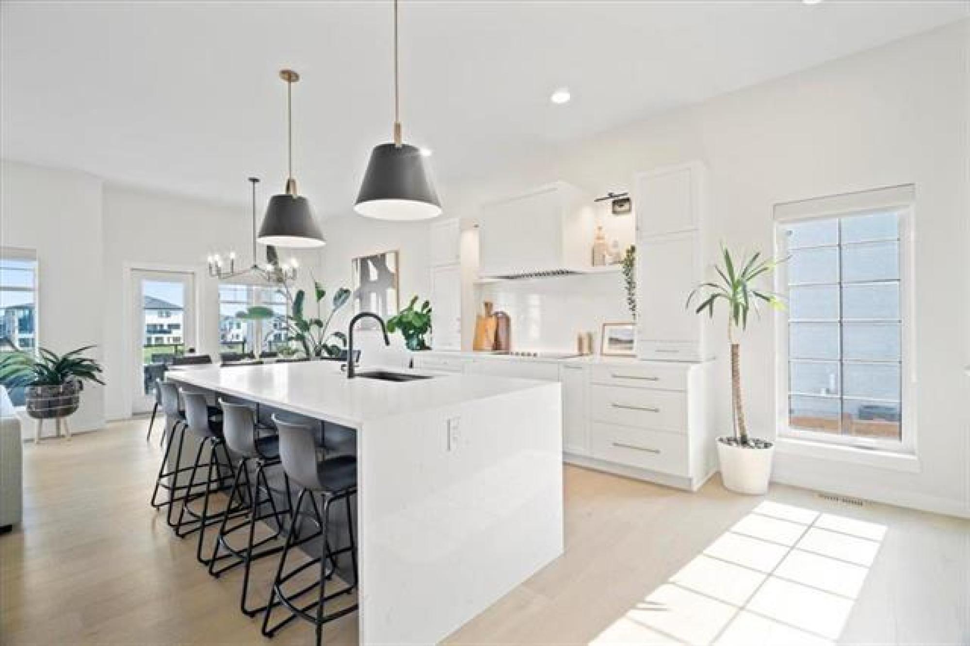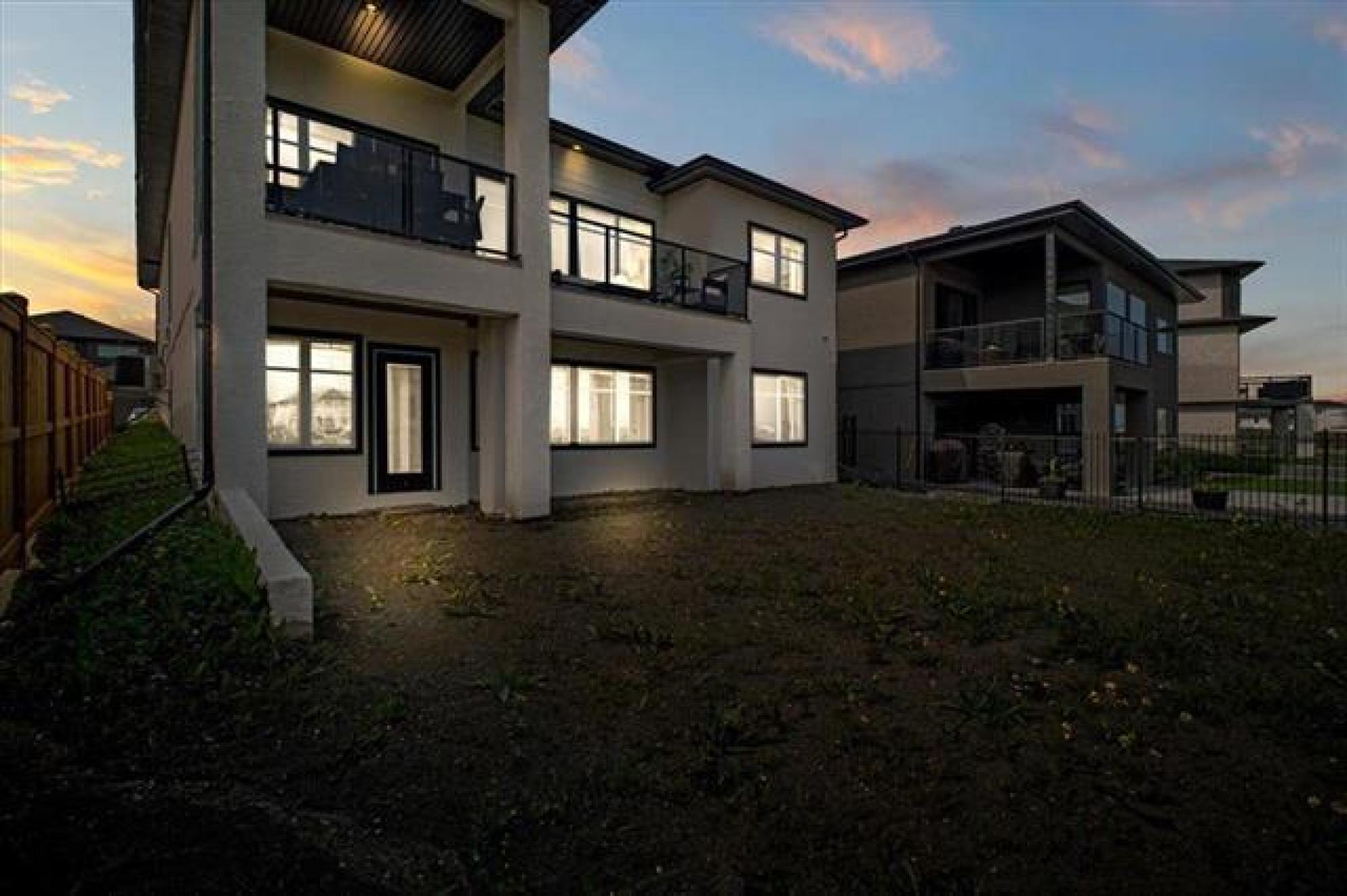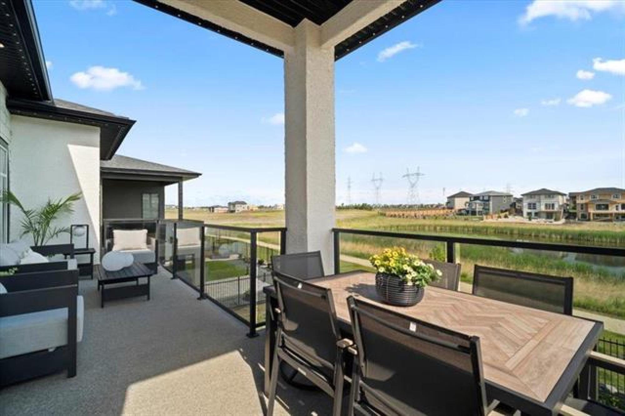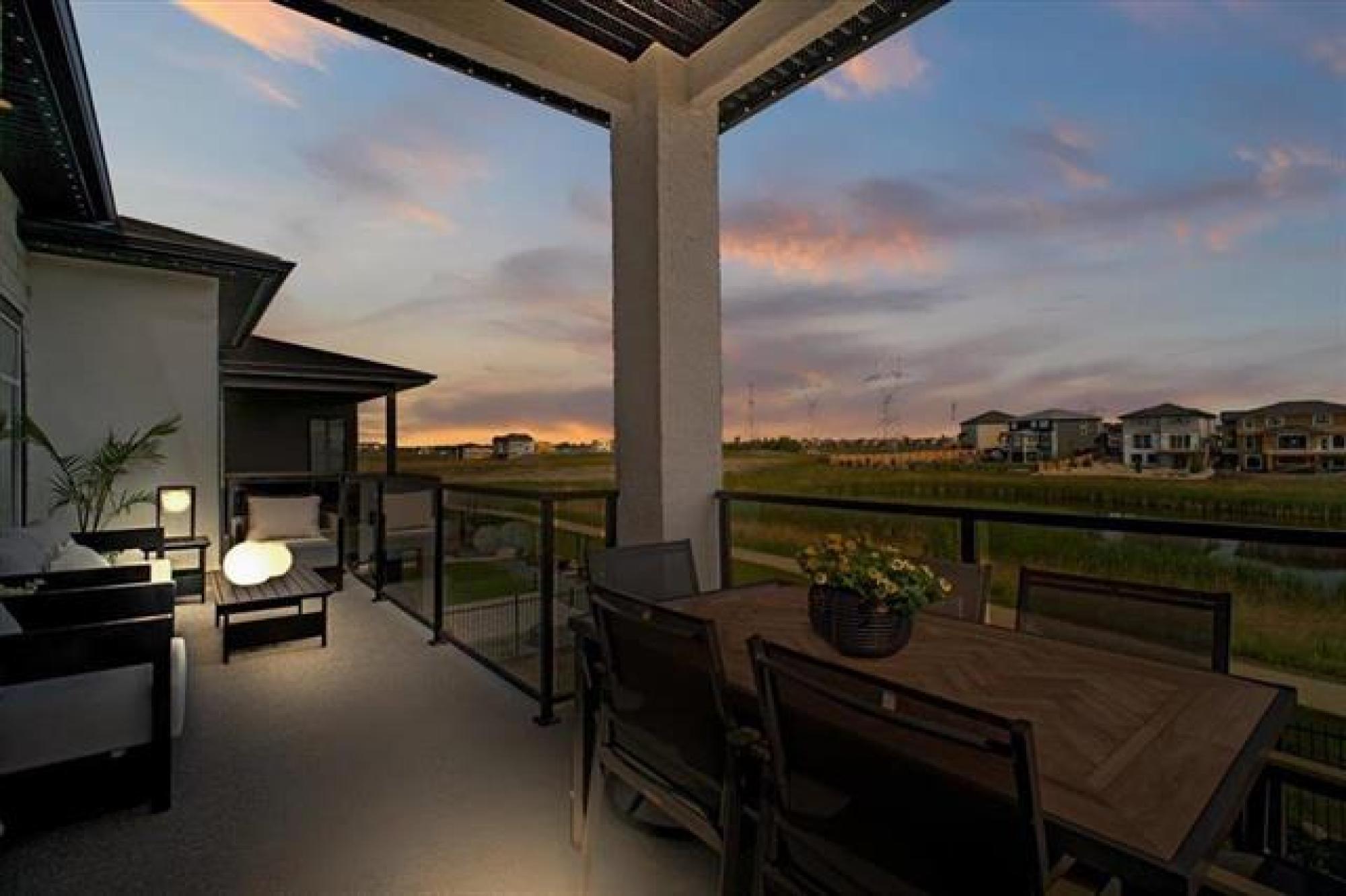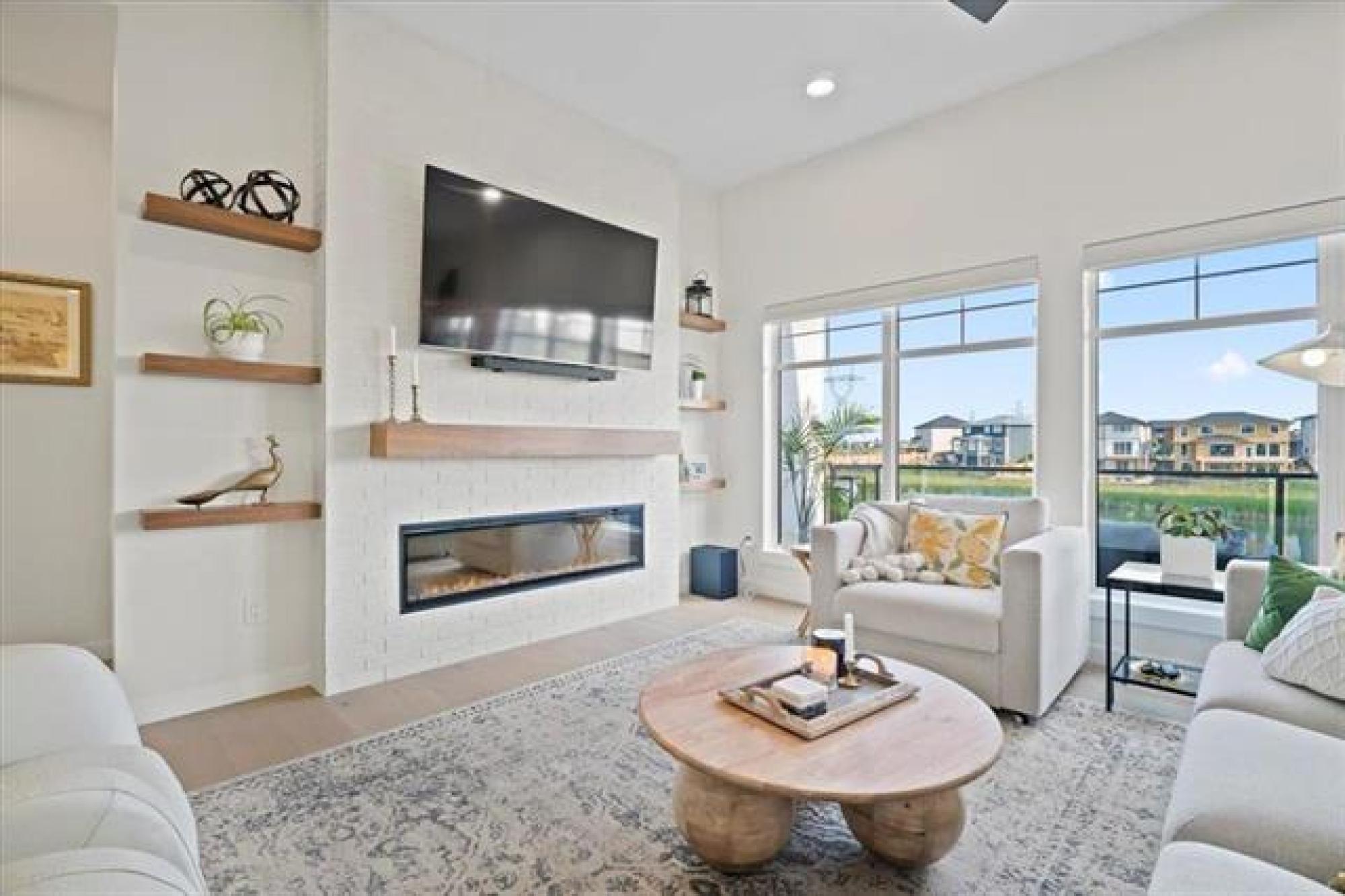 This stunning Sage Creek home by Artista Homes blends high-end design with everyday function. A walk out overlooking the lake! Featuring upgraded engineered hardwood, tile, and vinyl plank flooring—this carpet-free home is loaded with premium finishes throughout. The custom kitchen shines with quartz countertops, full-height quartz backsplash, upgraded cabinetry, and a built-in coffee bar. A tiled fireplace with walnut shelves and mantel anchors the great room, while upgraded lighting and wood floor registers add a refined touch. The primary suite offers a custom walk-in closet and a spa-inspired ensuite with a tiled shower. All bathrooms, the foyer, laundry, and mudroom feature quartz surfaces. Custom blinds, built-in closets, and cabinetry maximize style and storage. Downstairs, the fully finished basement includes an oversized fireplace, soundproofed bedroom, drywalled under-stair storage, and a finished storage room. Outside, enjoy extended front and rear decks, rod iron fencing, front landscaping, and Celabrite permanent outdoor lighting. Pre-wired for hot tub, deck speakers, A/V, and security. Impeccably built and packed with upgrades—63 Siskin Bay is Sage Creek living at its finest.