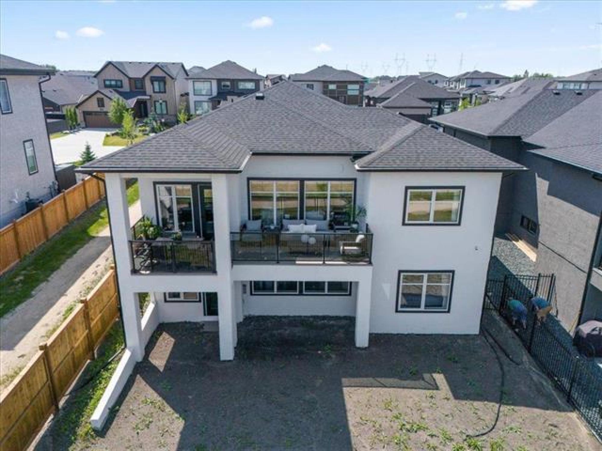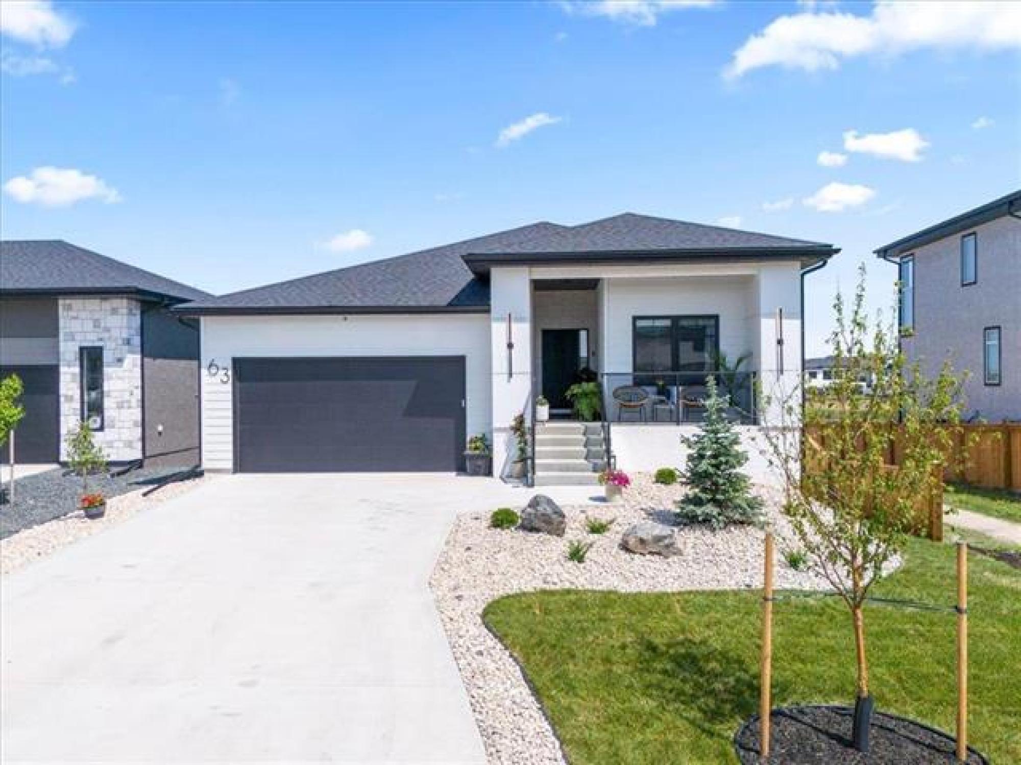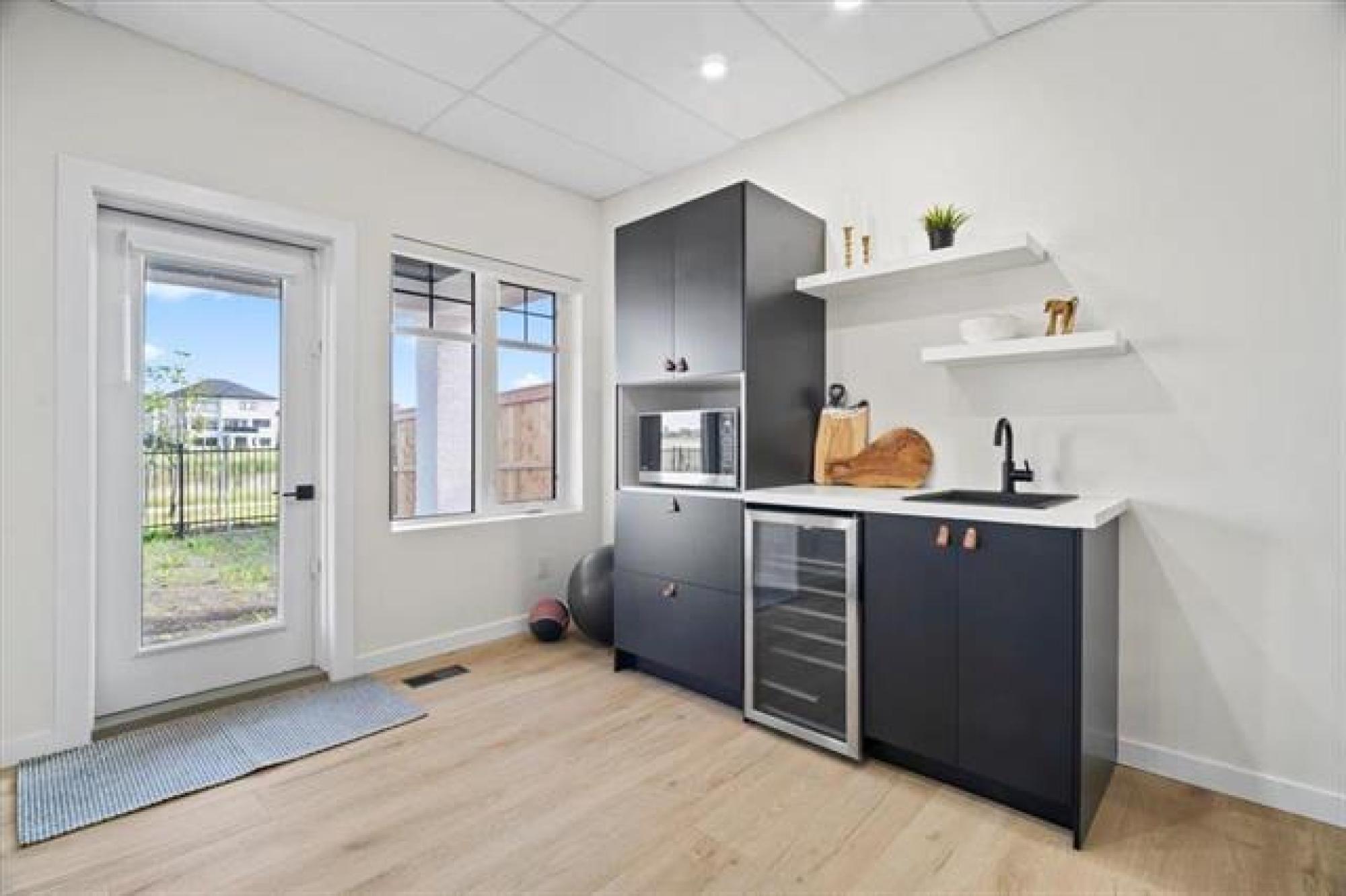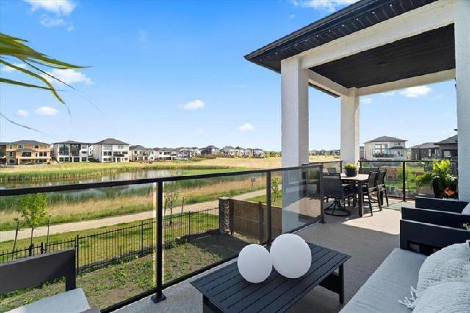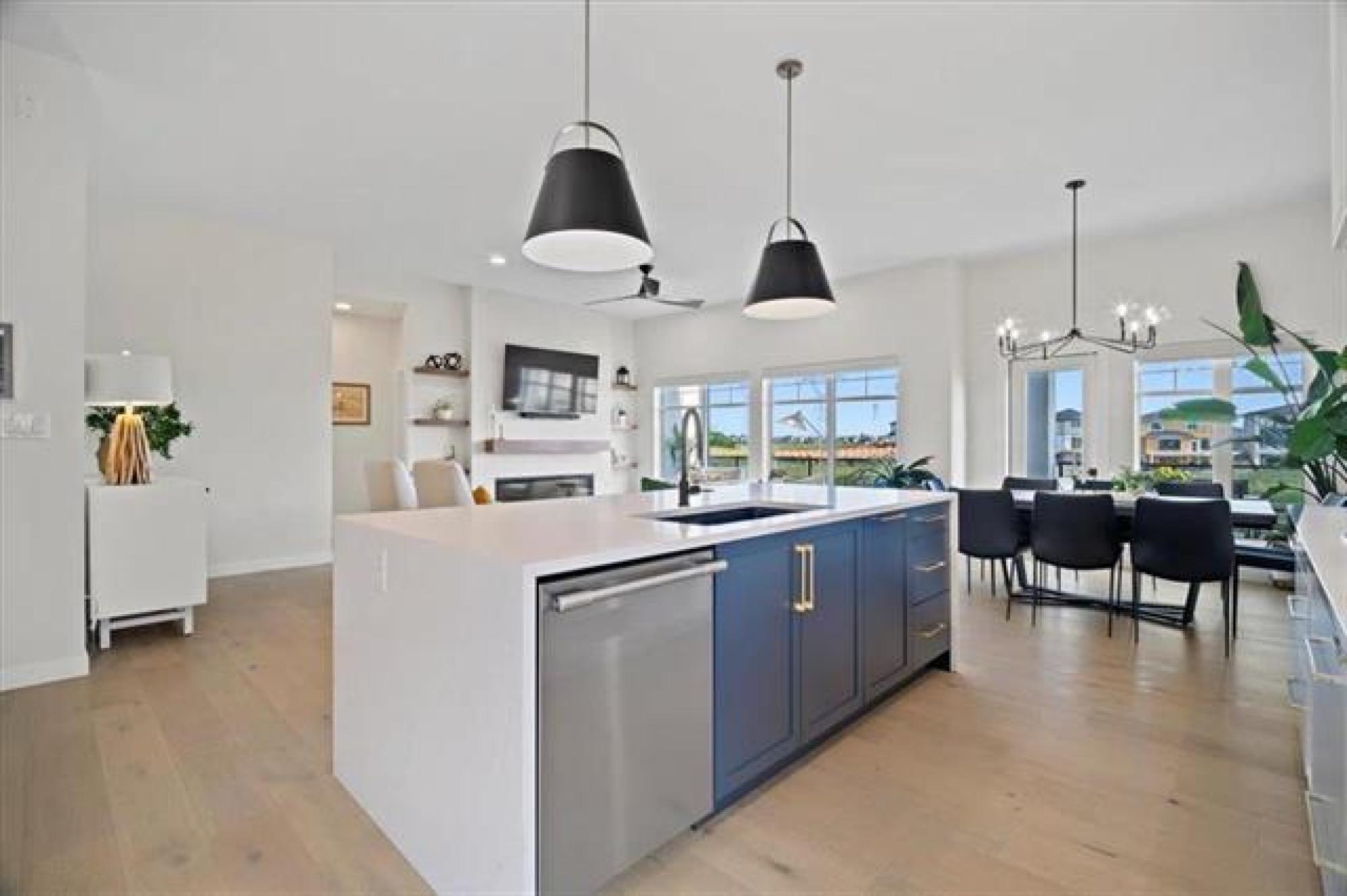 This stunning Sage Creek home by Artista Homes blends high-end design with everyday function. A walk out overlooking the lake! Featuring upgraded engineered hardwood, tile, and vinyl plank flooring—this carpet-free home is loaded with premium finishes throughout. The custom kitchen shines with quartz countertops, full-height quartz backsplash, upgraded cabinetry, and a built-in coffee bar. A tiled fireplace with walnut shelves and mantel anchors the great room, while upgraded lighting and wood floor registers add a refined touch. The primary suite offers a custom walk-in closet and a spa-inspired ensuite with a tiled shower. All bathrooms, the foyer, laundry, and mudroom feature quartz surfaces. Custom blinds, built-in closets, and cabinetry maximize style and storage. Downstairs, the fully finished basement includes an oversized fireplace, soundproofed bedroom, drywalled under-stair storage, and a finished storage room. Outside, enjoy extended front and rear decks, rod iron fencing, front landscaping, and Celabrite permanent outdoor lighting. Pre-wired for hot tub, deck speakers, A/V, and security. Impeccably built and packed with upgrades—63 Siskin Bay is Sage Creek living at its finest.