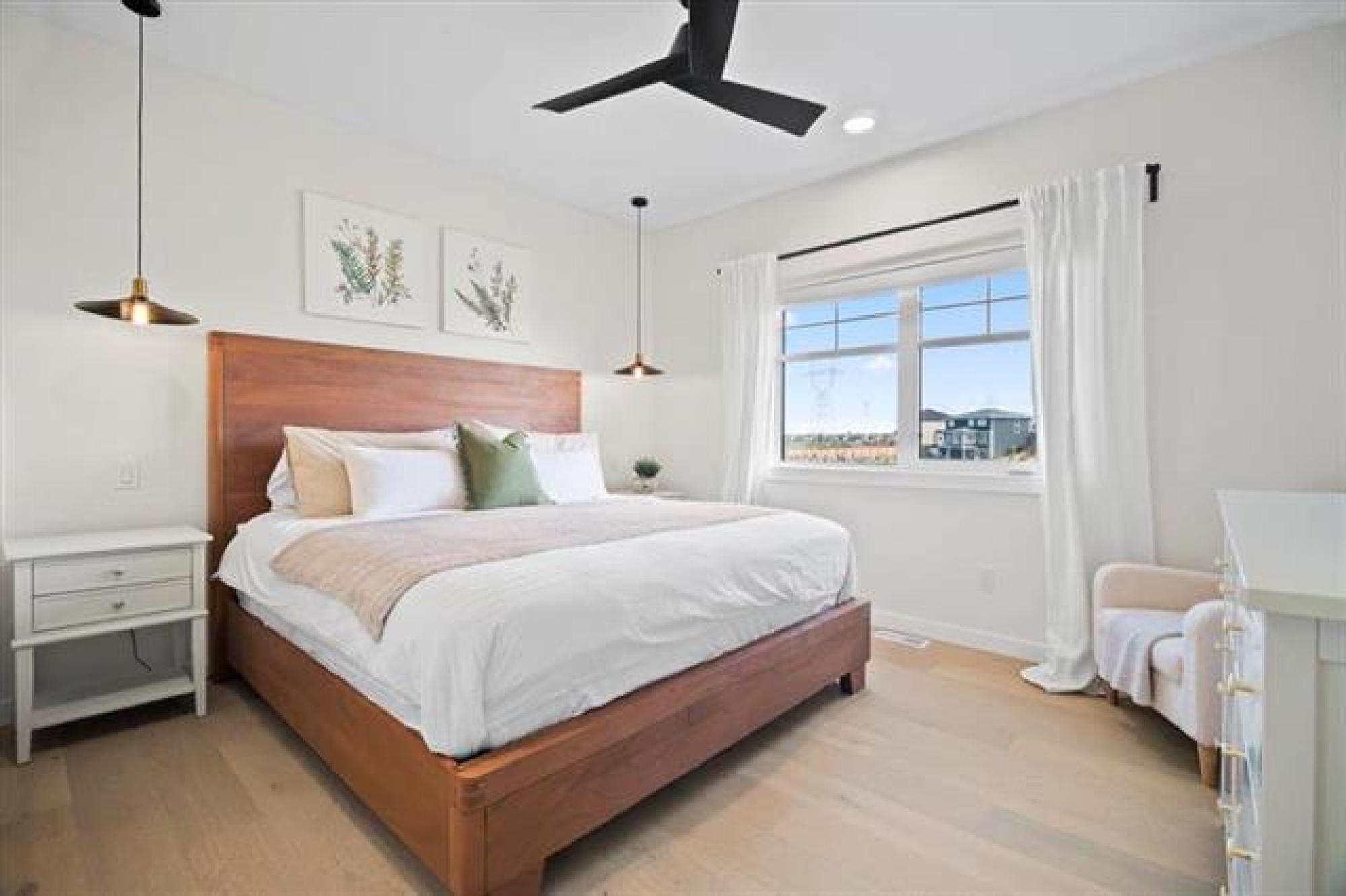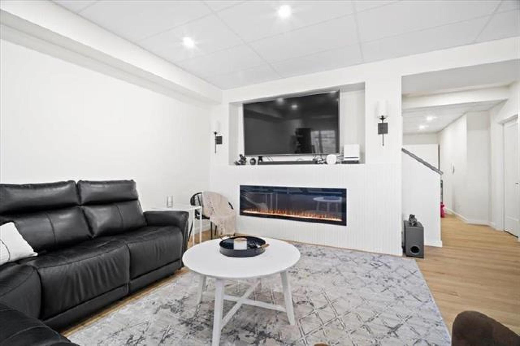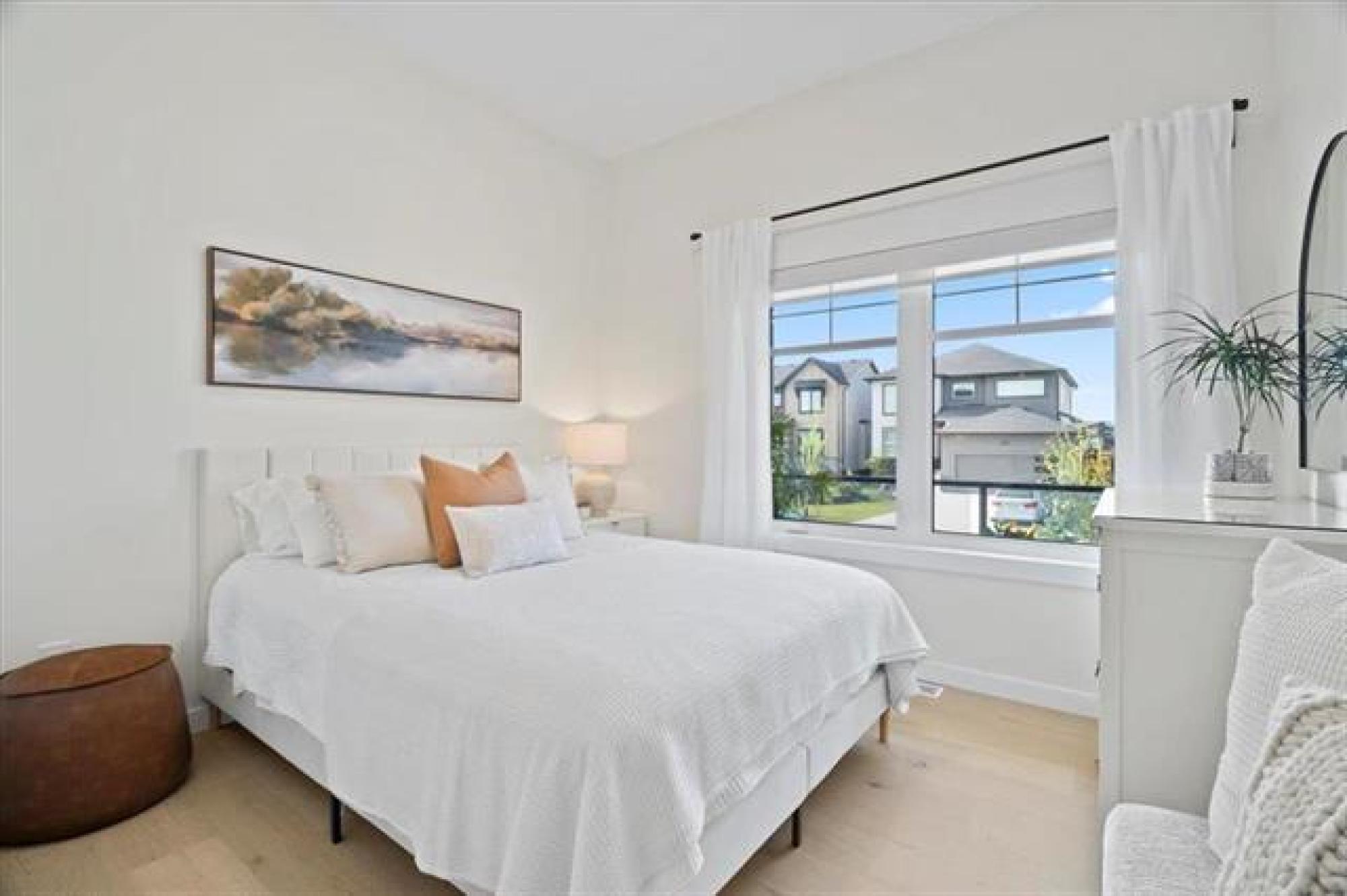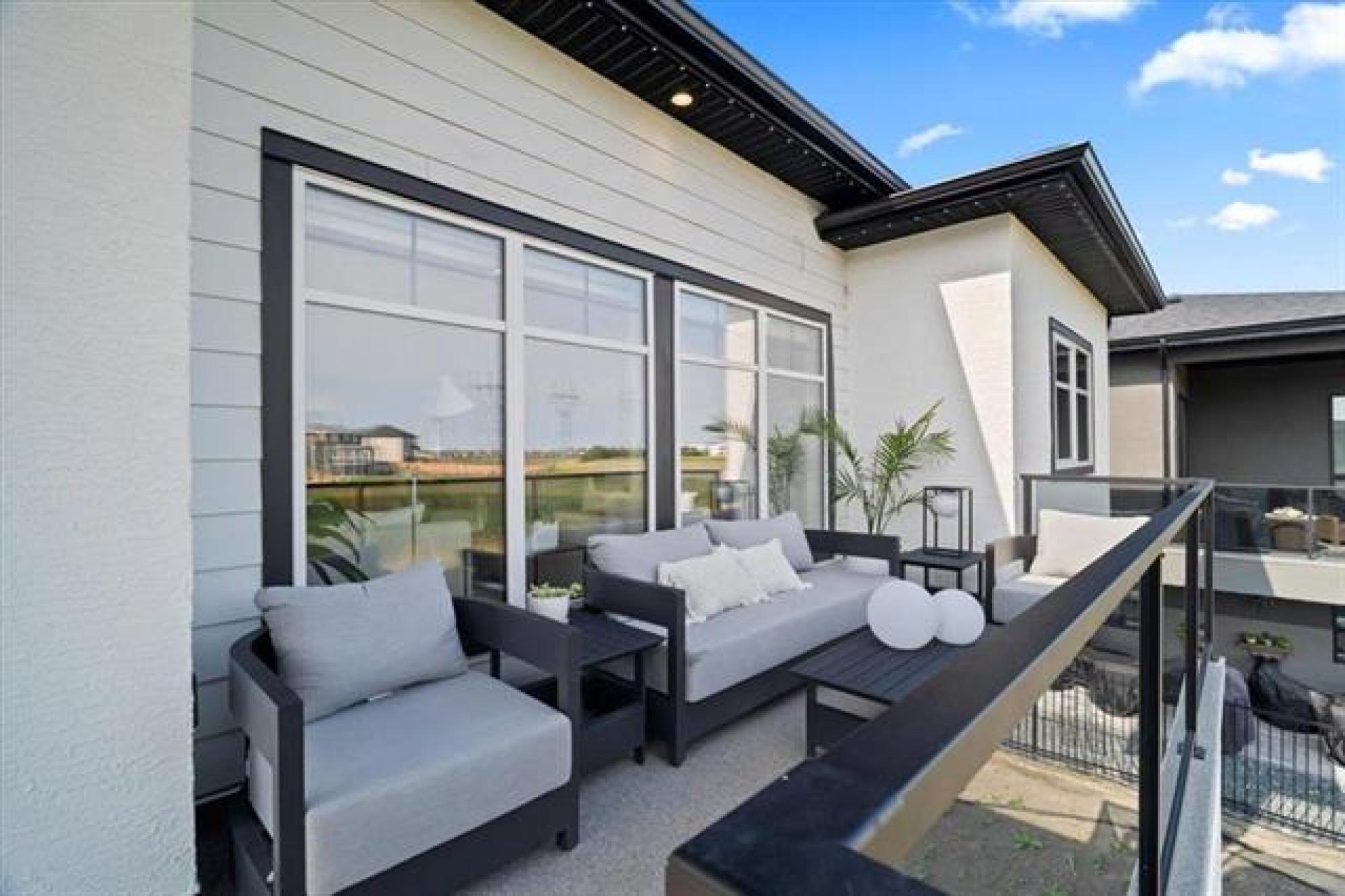 This stunning Sage Creek home by Artista Homes blends high-end design with everyday function. A walk out overlooking the lake! Featuring upgraded engineered hardwood, tile, and vinyl plank flooring—this carpet-free home is loaded with premium finishes throughout. The custom kitchen shines with quartz countertops, full-height quartz backsplash, upgraded cabinetry, and a built-in coffee bar. A tiled fireplace with walnut shelves and mantel anchors the great room, while upgraded lighting and wood floor registers add a refined touch. The primary suite offers a custom walk-in closet and a spa-inspired ensuite with a tiled shower. All bathrooms, the foyer, laundry, and mudroom feature quartz surfaces. Custom blinds, built-in closets, and cabinetry maximize style and storage. Downstairs, the fully finished basement includes an oversized fireplace, soundproofed bedroom, drywalled under-stair storage, and a finished storage room. Outside, enjoy extended front and rear decks, rod iron fencing, front landscaping, and Celabrite permanent outdoor lighting. Pre-wired for hot tub, deck speakers, A/V, and security. Impeccably built and packed with upgrades—63 Siskin Bay is Sage Creek living at its finest.