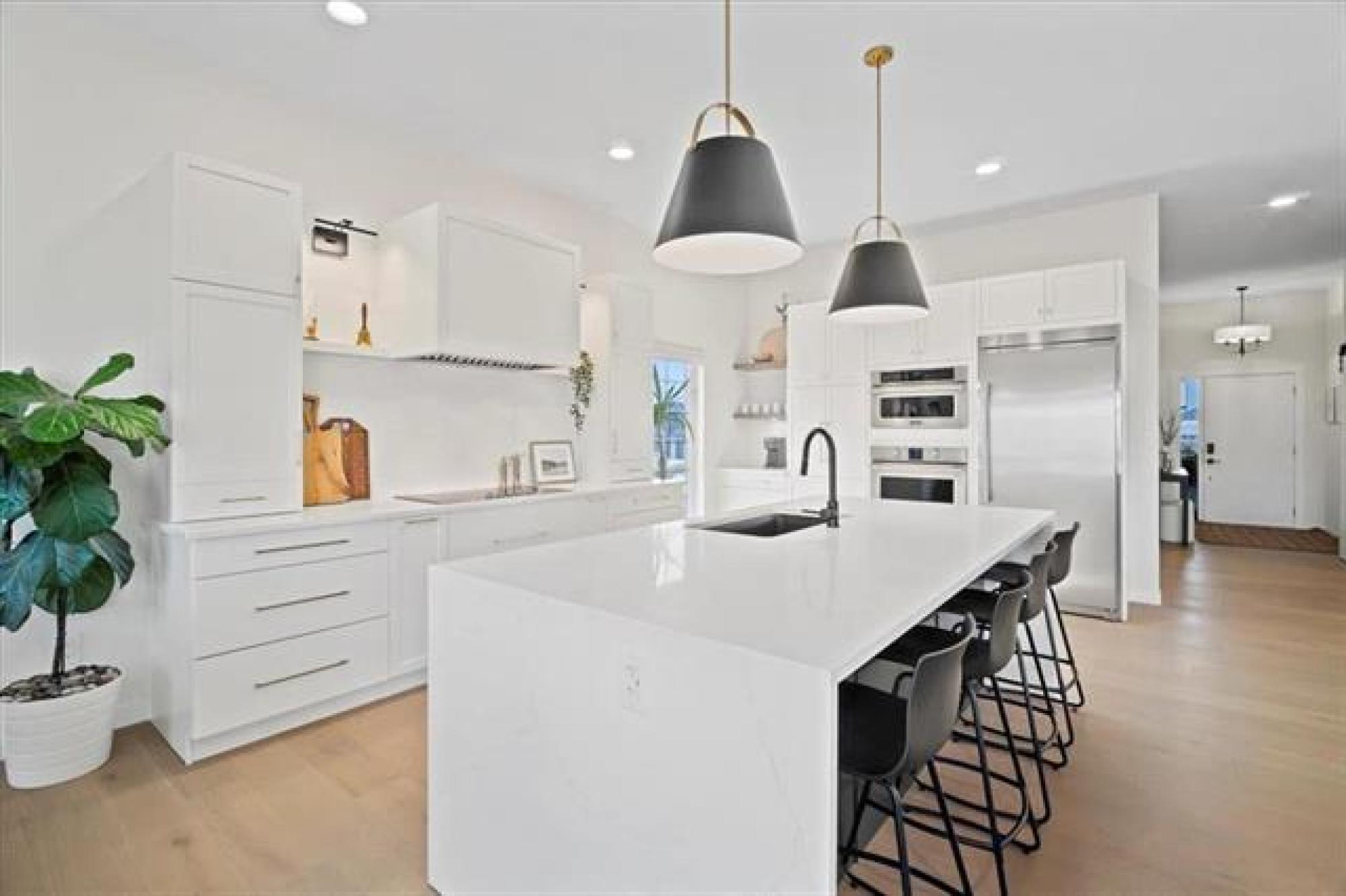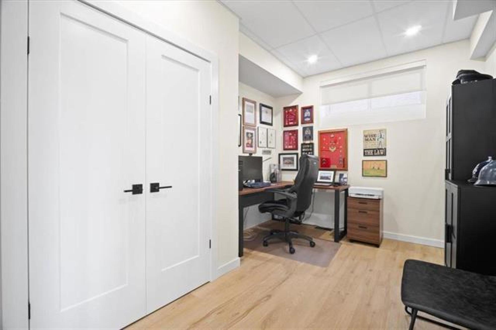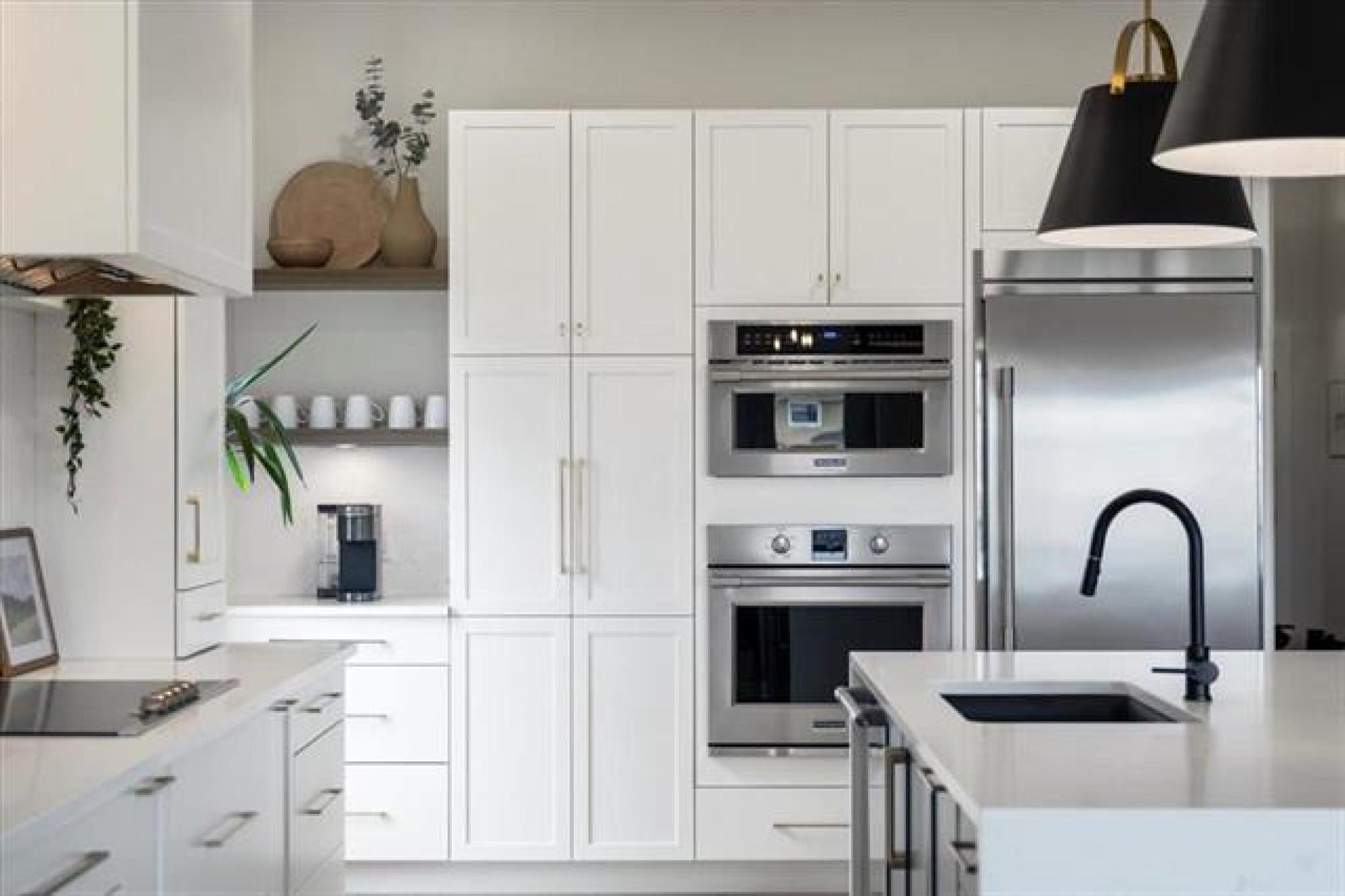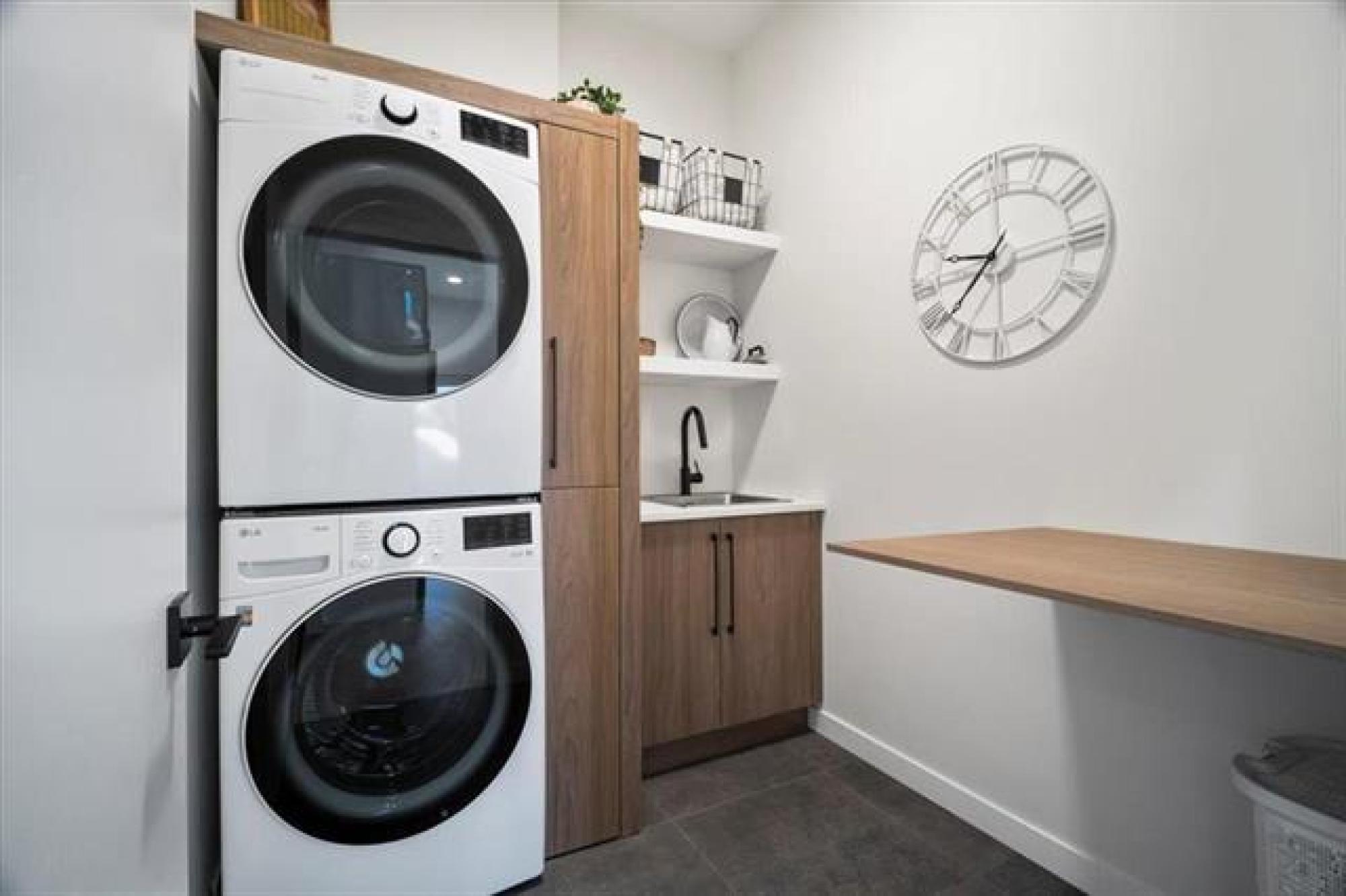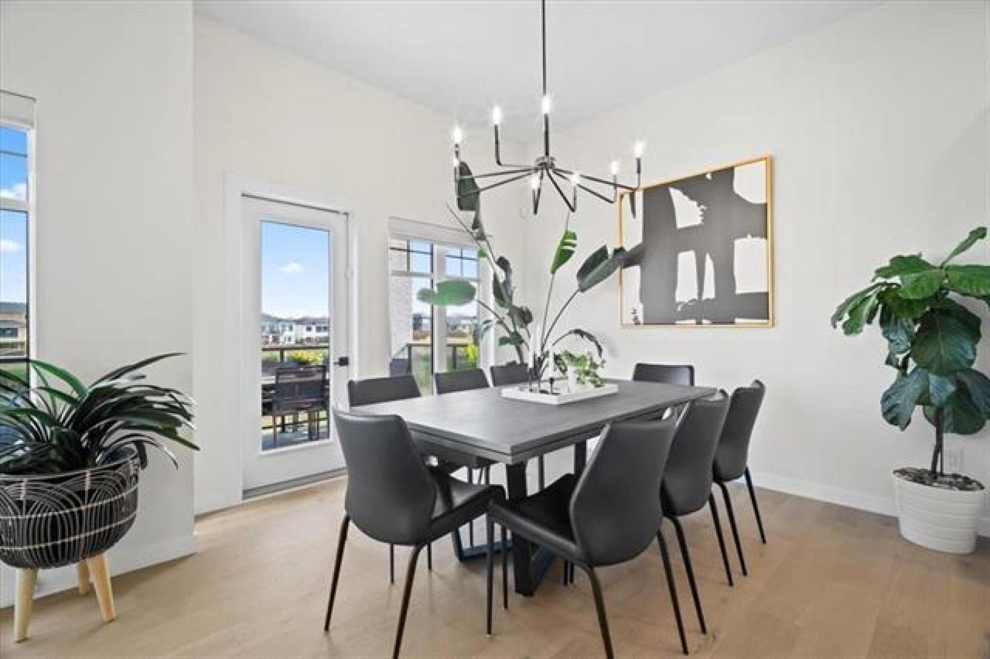 This stunning Sage Creek home by Artista Homes blends high-end design with everyday function. A walk out overlooking the lake! Featuring upgraded engineered hardwood, tile, and vinyl plank flooring—this carpet-free home is loaded with premium finishes throughout. The custom kitchen shines with quartz countertops, full-height quartz backsplash, upgraded cabinetry, and a built-in coffee bar. A tiled fireplace with walnut shelves and mantel anchors the great room, while upgraded lighting and wood floor registers add a refined touch. The primary suite offers a custom walk-in closet and a spa-inspired ensuite with a tiled shower. All bathrooms, the foyer, laundry, and mudroom feature quartz surfaces. Custom blinds, built-in closets, and cabinetry maximize style and storage. Downstairs, the fully finished basement includes an oversized fireplace, soundproofed bedroom, drywalled under-stair storage, and a finished storage room. Outside, enjoy extended front and rear decks, rod iron fencing, front landscaping, and Celabrite permanent outdoor lighting. Pre-wired for hot tub, deck speakers, A/V, and security. Impeccably built and packed with upgrades—63 Siskin Bay is Sage Creek living at its finest.