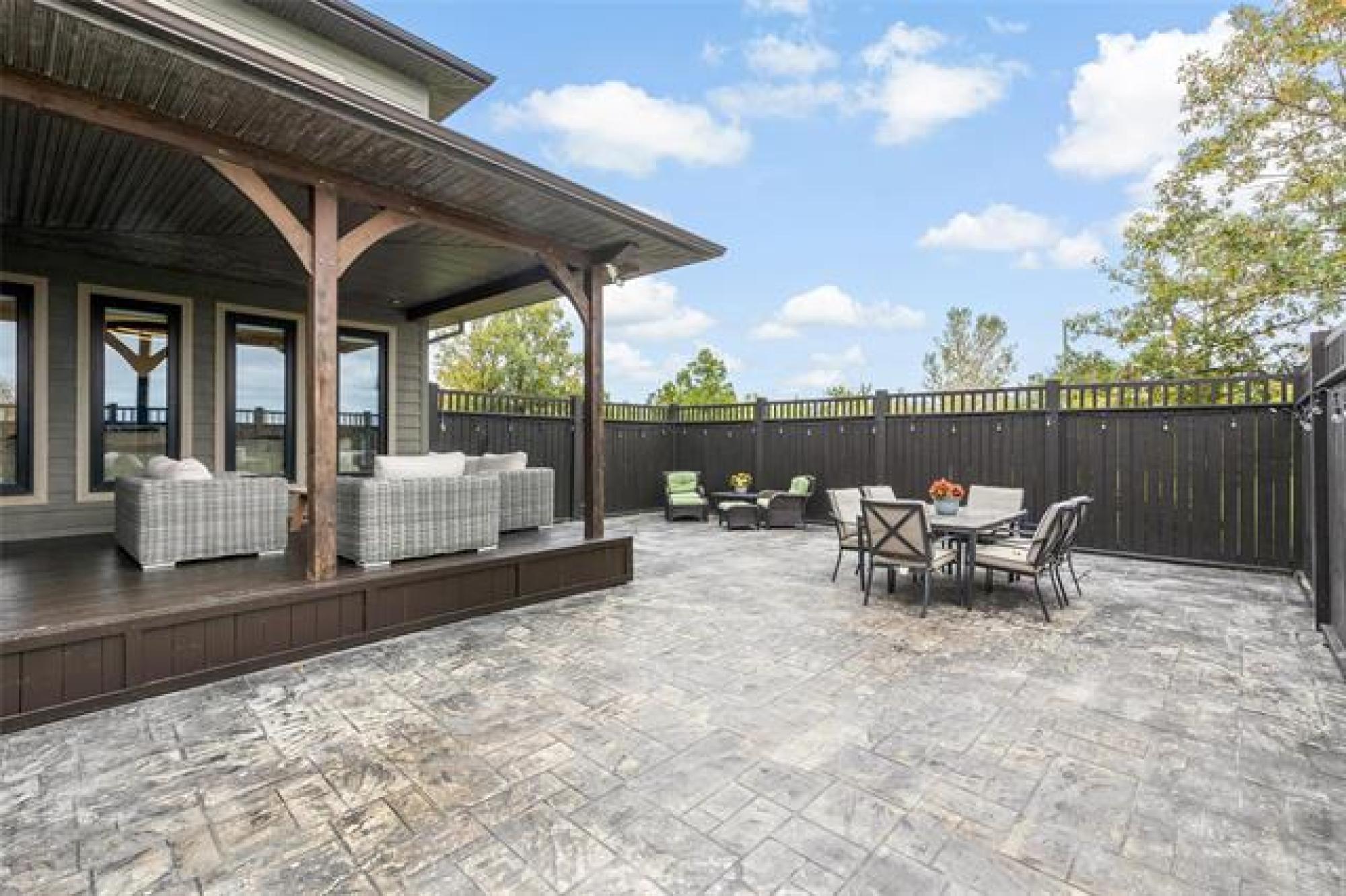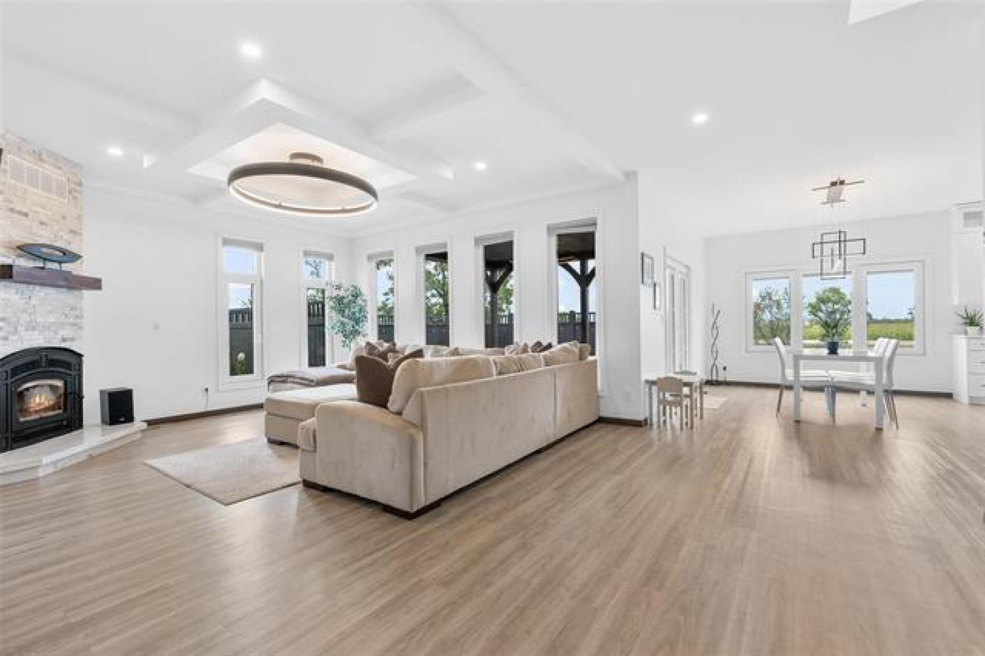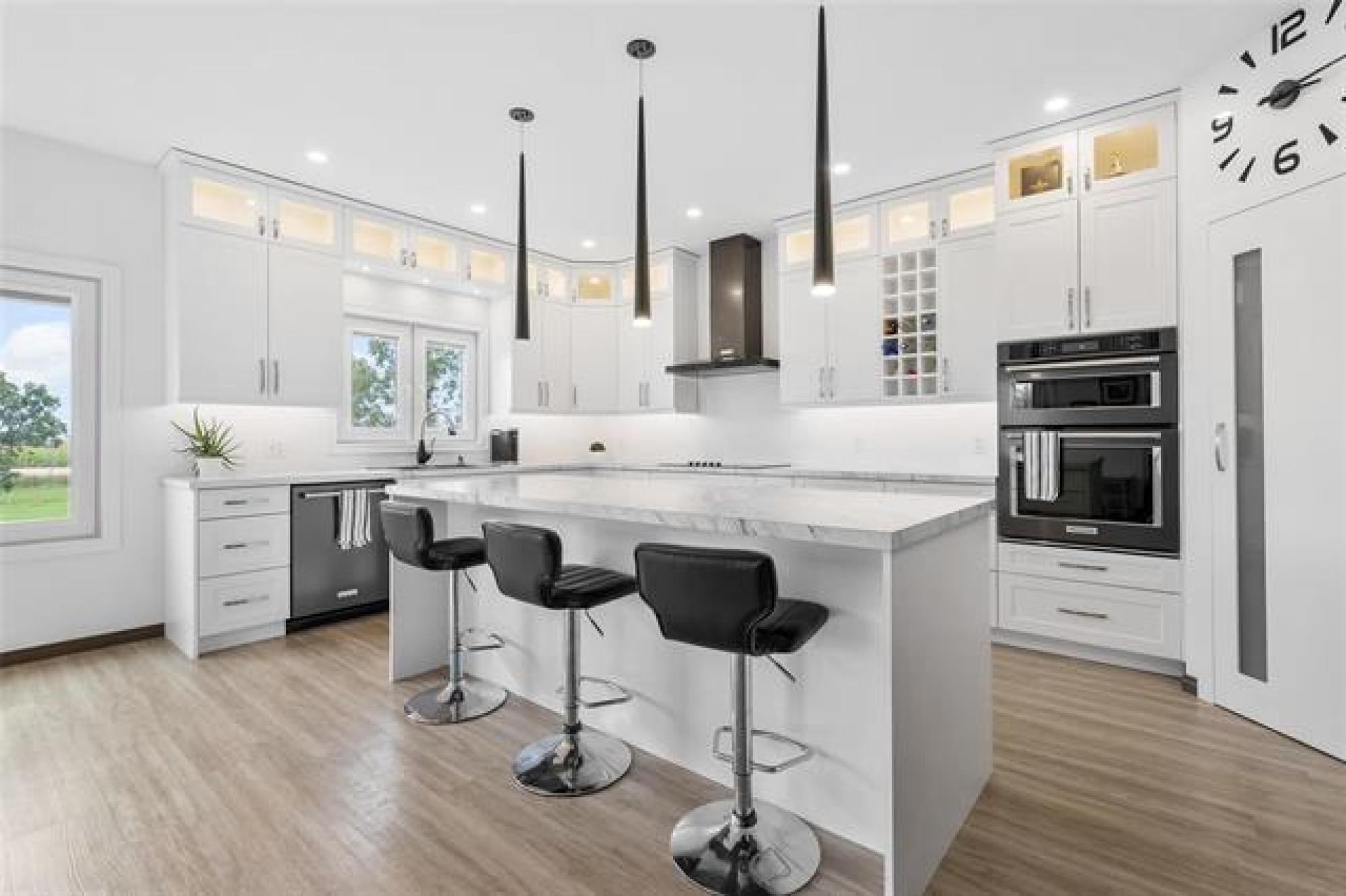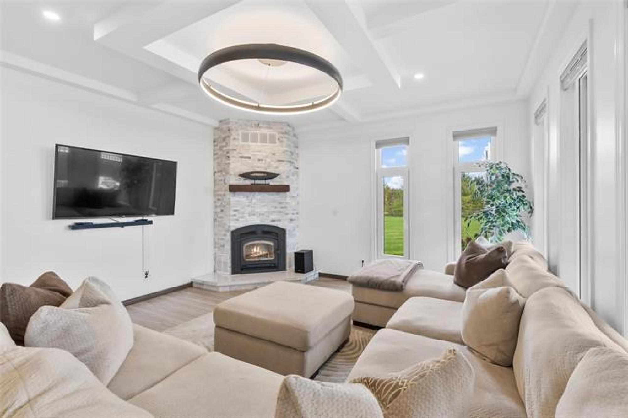 Grand 2,995 SF two-storey home with 5 bedrooms, set on a stunning 2+ acre property! This charming and elegant country home offers space to spread out and enjoy. Incredible curb appeal with stone and timberframe accents welcomes you in. Inside, the spacious living room features a cozy wood-burning fireplace with a striking brick surround, framed by large windows that flood the space with natural light. The open dining area has patio doors leading to a covered deck, making it ideal for gatherings. The massive kitchen is a true showstopper with crisp white cabinets, huge island with seating, corner pantry and pristine stainless steel appliances. A main floor bedroom offers flexible space for guests or a home office. Upstairs, the primary suite boasts a luxurious 5 piece ensuite with jetted tub and walk-in shower. Three additional bedrooms and a full bathroom provide plenty of room for family or guests. Step outside and enjoy your own private oasis. A 16x14 covered deck flows to a stamped concrete patio—perfect for relaxing evenings. The fully treed backyard with mature oaks offers privacy and plenty of room to roam. Call today to make this dream property yours!