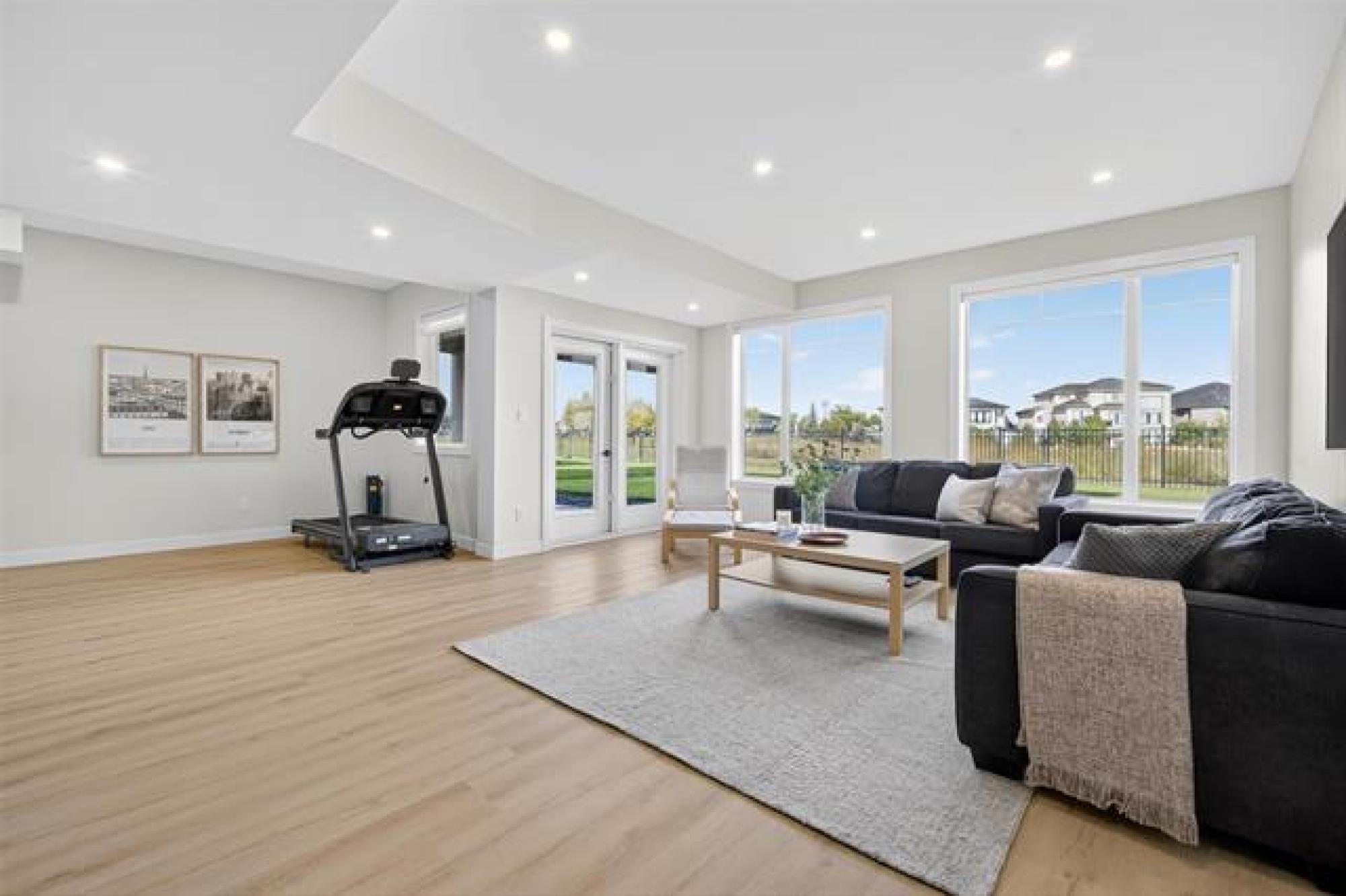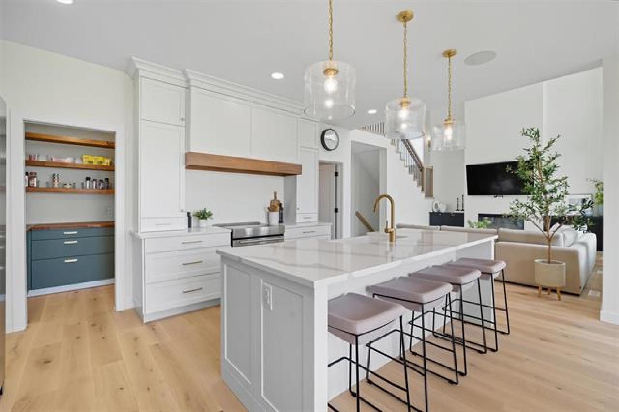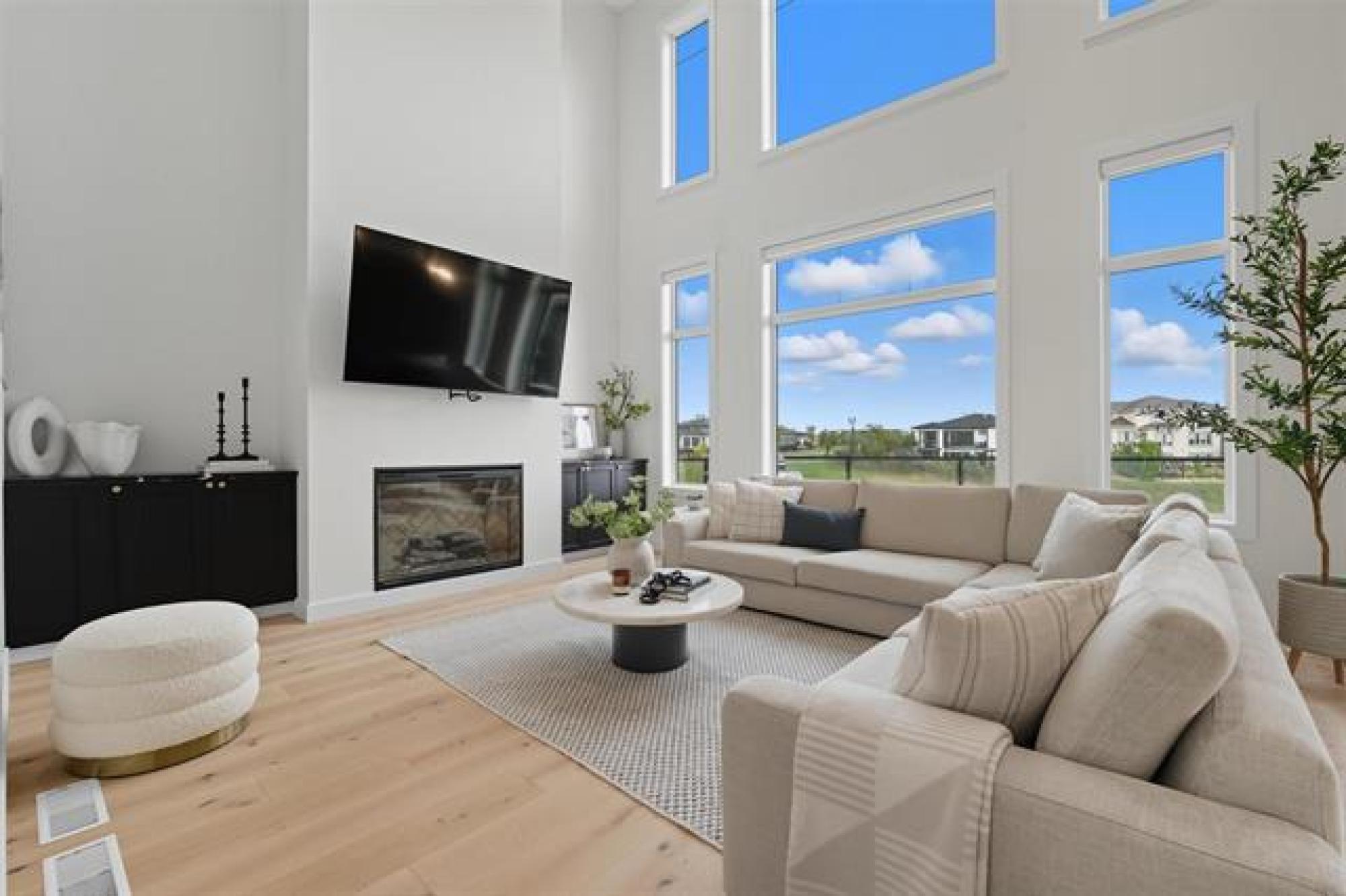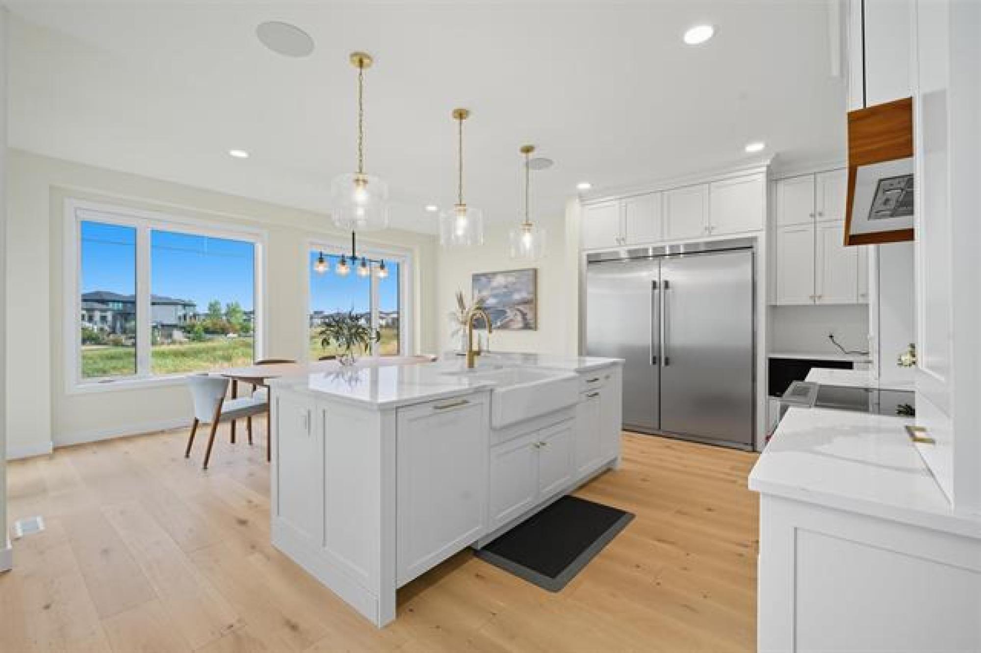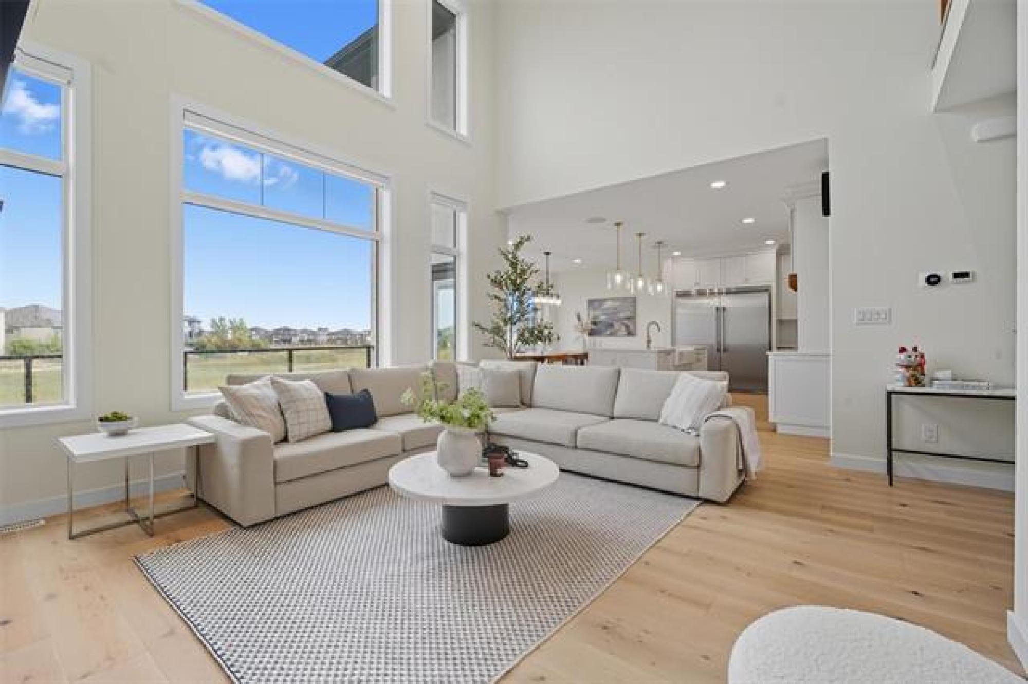 Welcome to this stunning two-storey home with a fully finished walkout basement, designed to impress at every turn. Step inside to soaring 18-ft ceilings with a wall of windows that flood the main living area with natural light. The chef’s kitchen is a true showpiece, featuring quartz countertops, custom pantry cabinetry, and a double fridge/freezer — perfectly designed for entertaining and everyday living. Upstairs, you’ll find four spacious bedrooms, including a luxurious primary suite with a spa-inspired ensuite offering a stand-alone tub, double sinks, and a glass shower. The large walk-in closet is thoughtfully outfitted with custom organizers.The walkout lower level extends your living space with an additional bedroom and bathroom, plus a generous rec room with a striking feature wall and wall of windows with views of the lake — perfect for family gatherings or quiet nights in. This home seamlessly blends style, comfort, and function, making it the perfect choice for your next chapter.