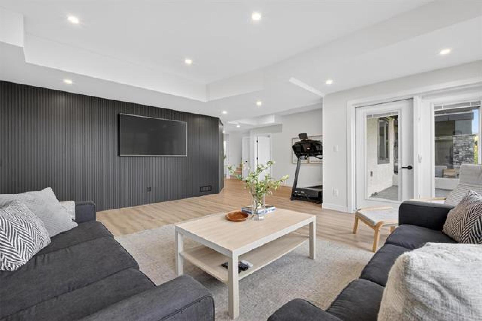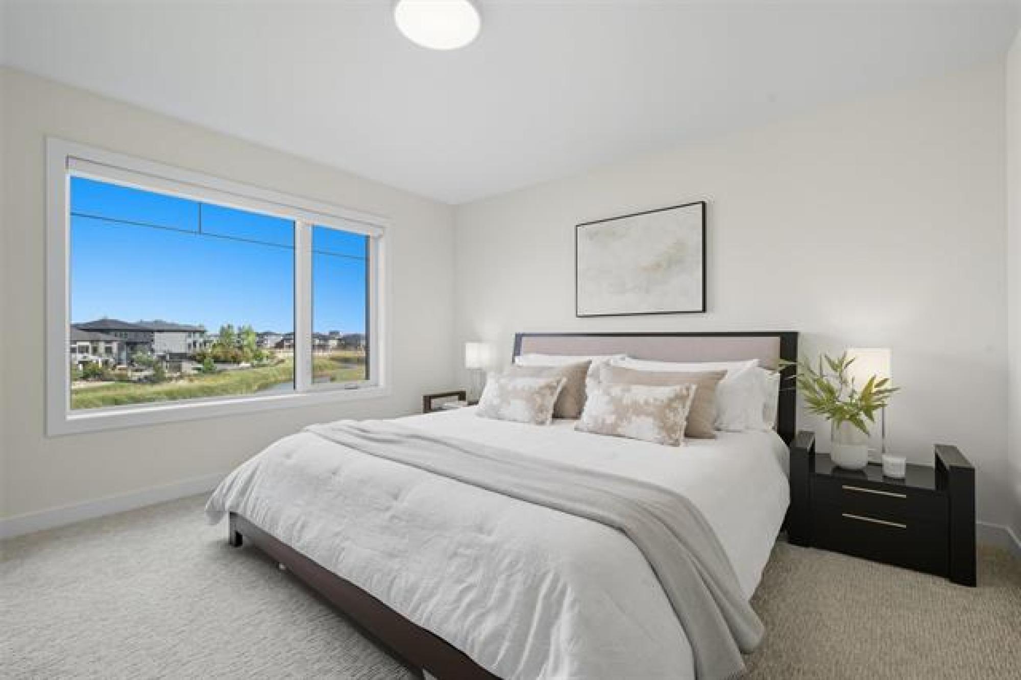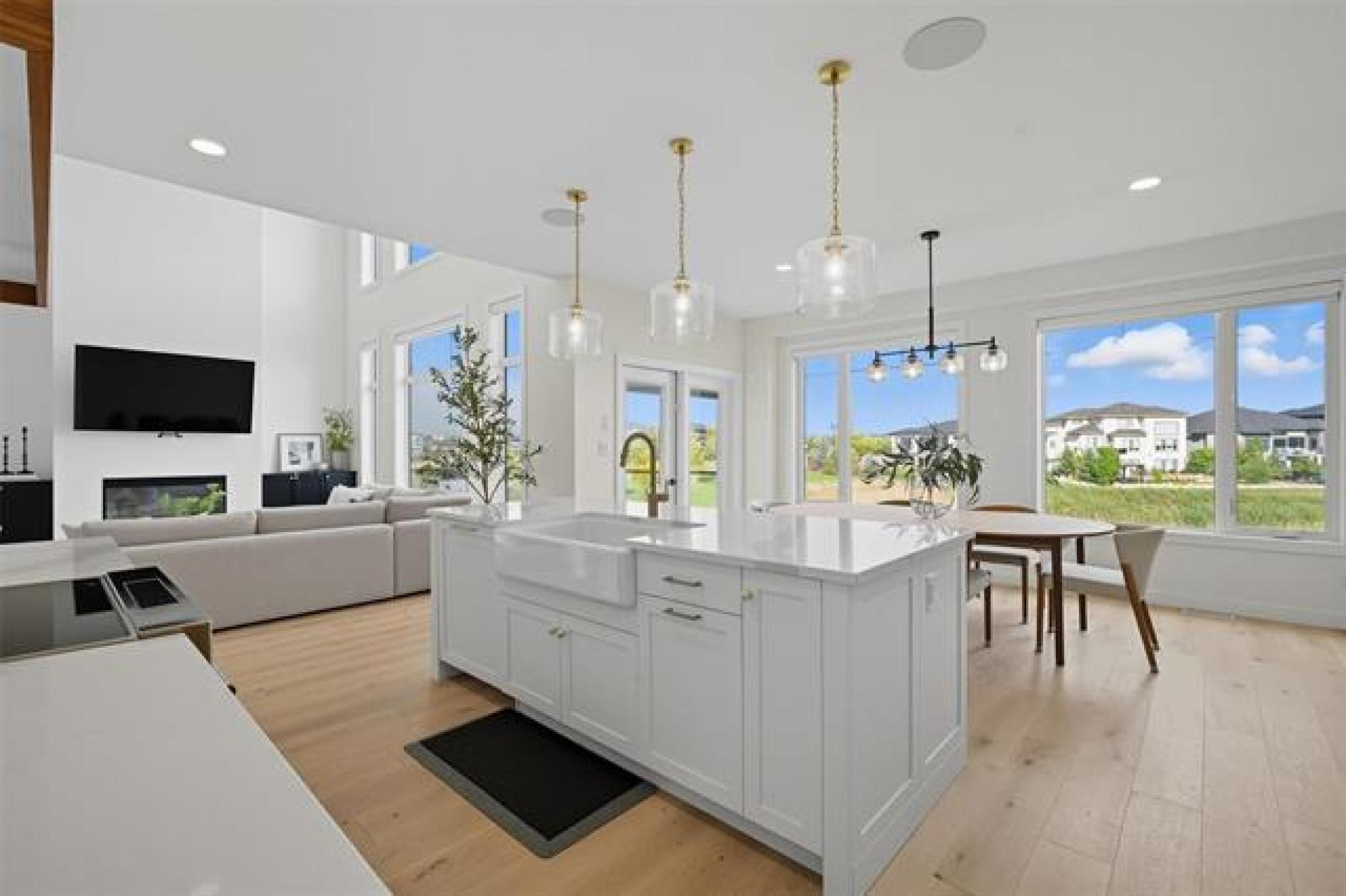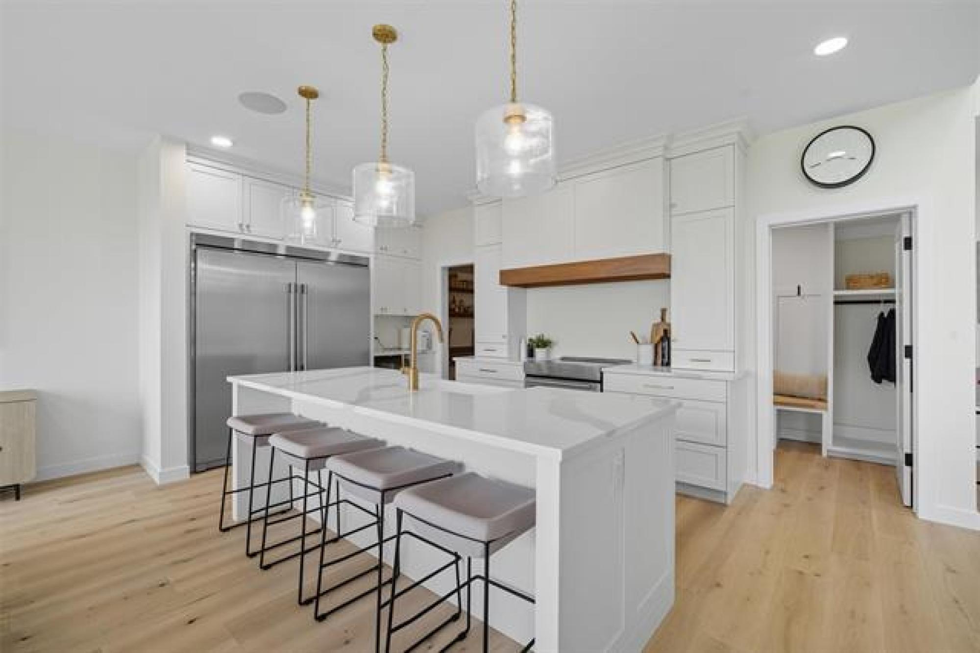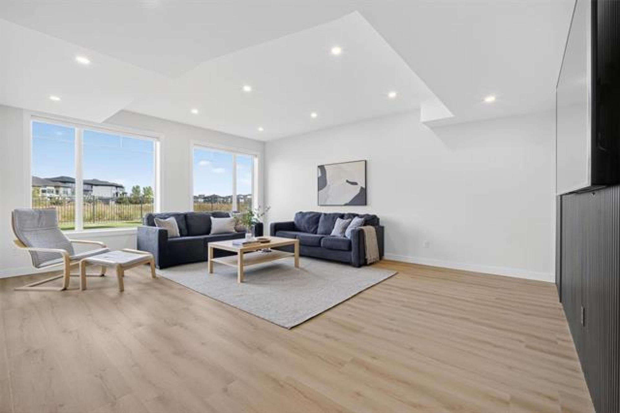 Welcome to this stunning two-storey home with a fully finished walkout basement, designed to impress at every turn. Step inside to soaring 18-ft ceilings with a wall of windows that flood the main living area with natural light. The chef’s kitchen is a true showpiece, featuring quartz countertops, custom pantry cabinetry, and a double fridge/freezer — perfectly designed for entertaining and everyday living. Upstairs, you’ll find four spacious bedrooms, including a luxurious primary suite with a spa-inspired ensuite offering a stand-alone tub, double sinks, and a glass shower. The large walk-in closet is thoughtfully outfitted with custom organizers.The walkout lower level extends your living space with an additional bedroom and bathroom, plus a generous rec room with a striking feature wall and wall of windows with views of the lake — perfect for family gatherings or quiet nights in. This home seamlessly blends style, comfort, and function, making it the perfect choice for your next chapter.