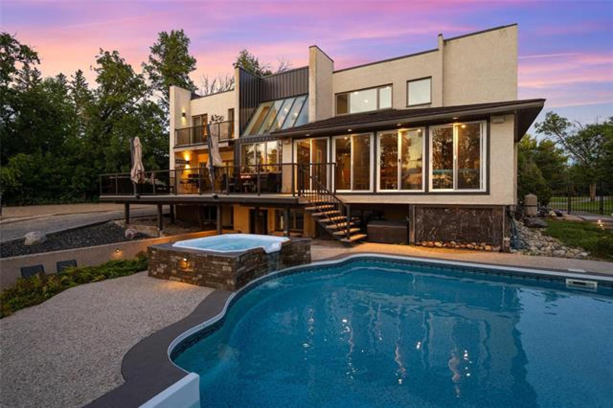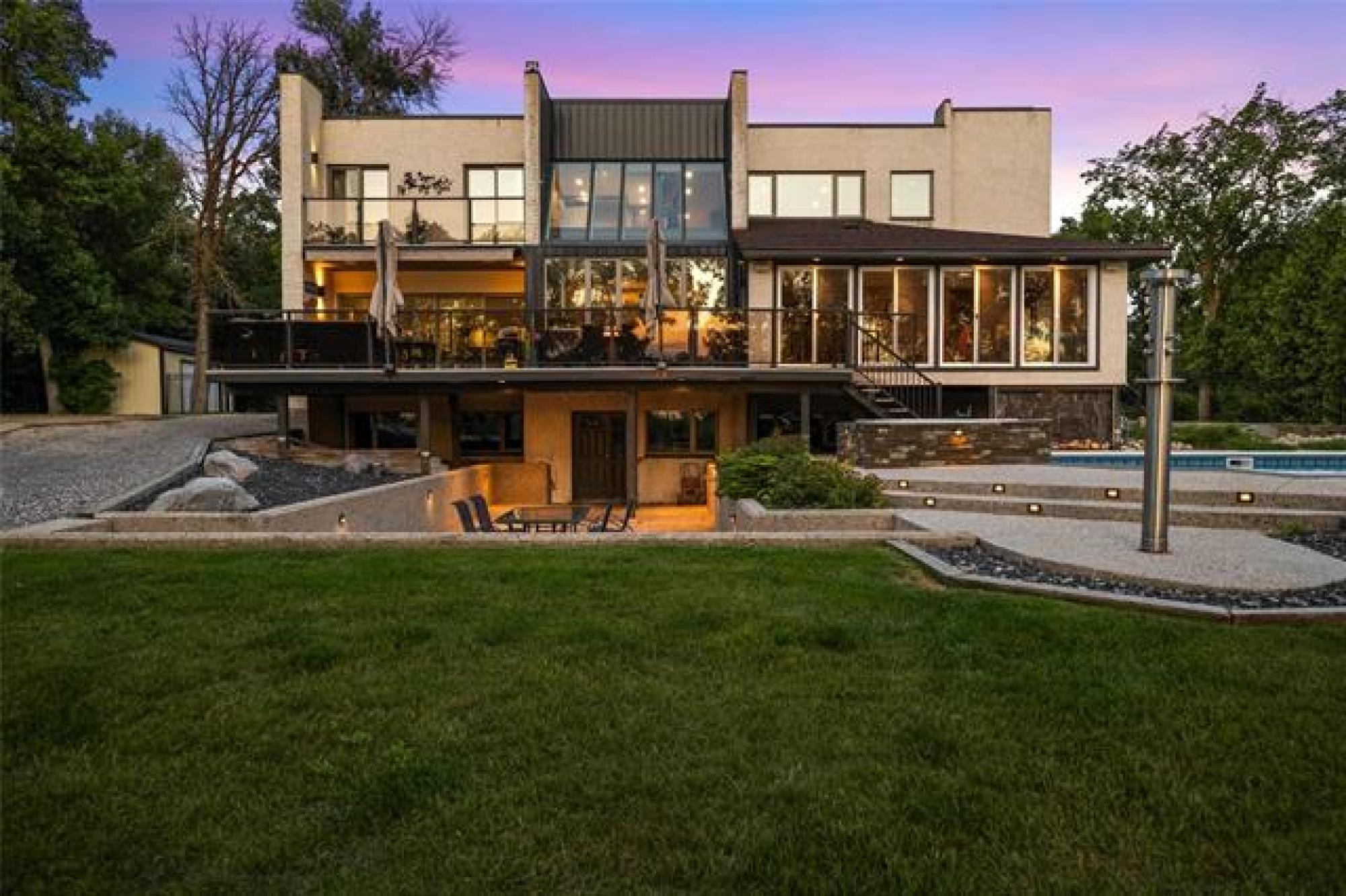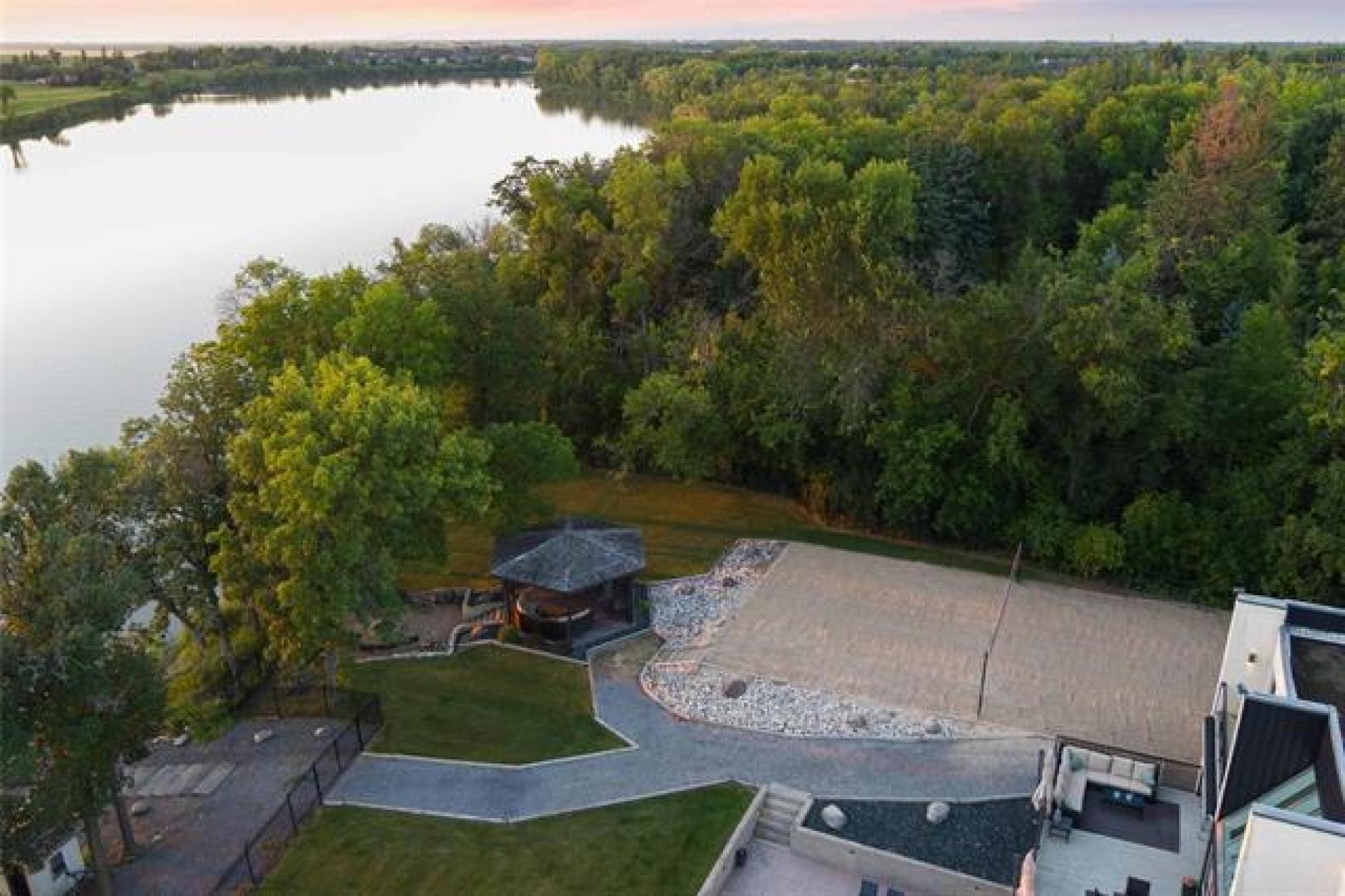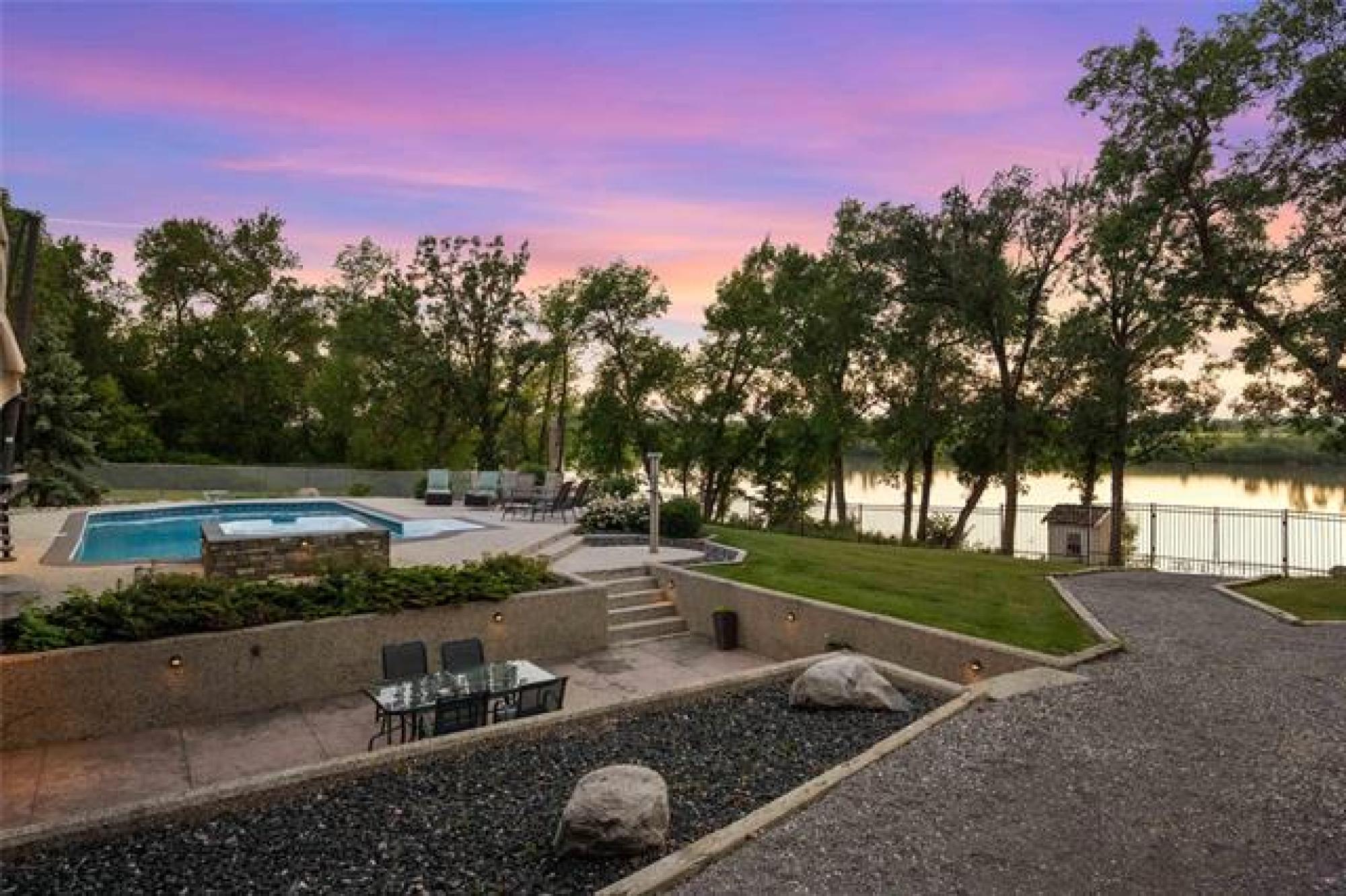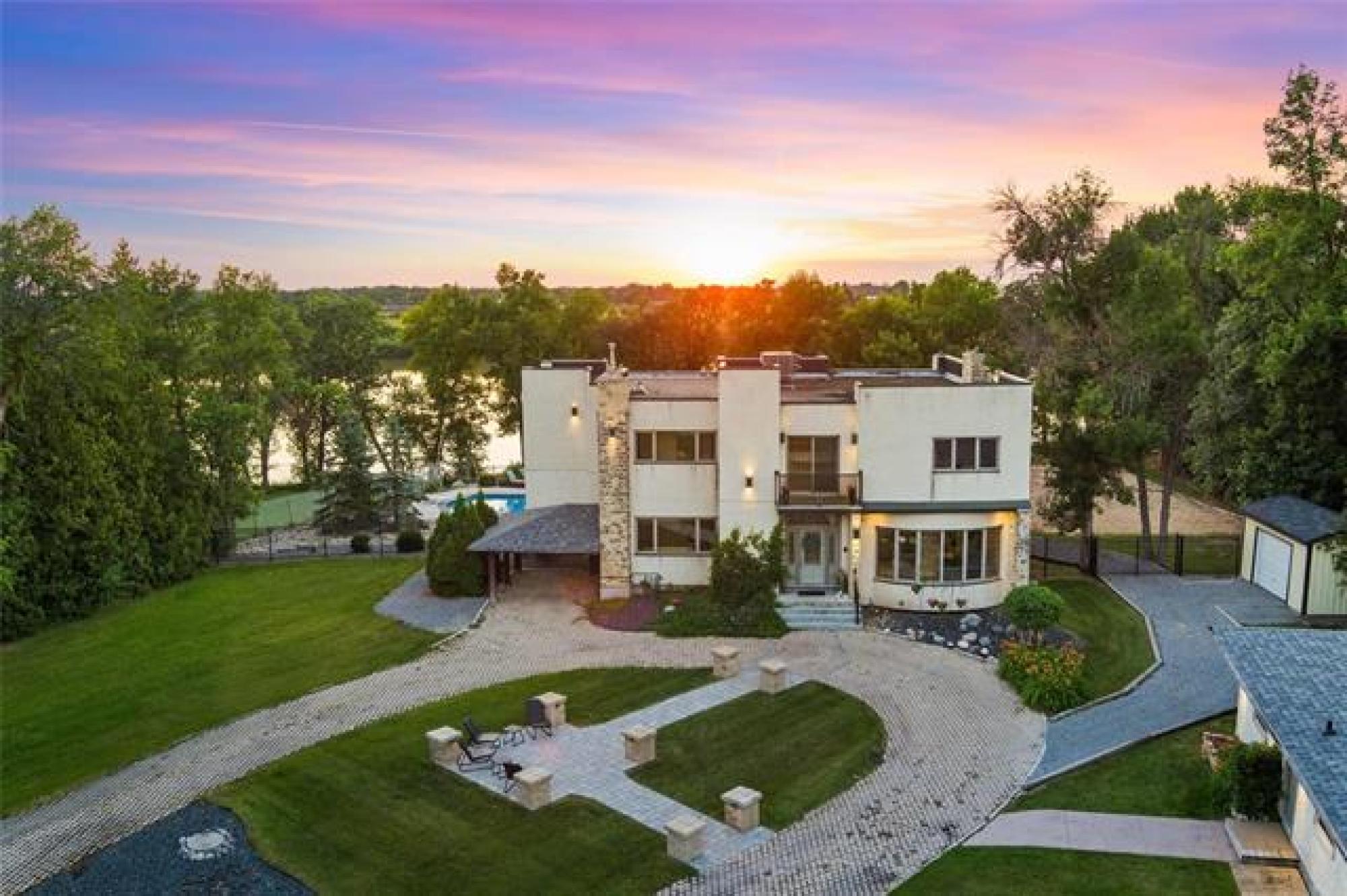 Discover this exquisite 4,110 SF riverfront two-storey estate set on 2.5 acres in desirable East St. Paul. Expansive windows bathe the home in natural light, showcasing an inviting living area with a cozy fireplace and an elegant, open dining space. The gourmet kitchen impresses with quartz countertops, a grand island, built-in stainless steel appliances, dual ovens, and an oversized fridge. Upstairs, a spacious loft leads to the serene primary suite featuring a private balcony, floor-to-ceiling mirrored closets, and a spa-inspired 4-piece ensuite. Three additional bedrooms and a dual vanity bathroom complete the upper level. The lower level offers an expansive rec room with a 3-piece bath, ideal for family gatherings and entertaining. A versatile workshop, currently a gym, and a quadruple detached garage provide exceptional flexibility and storage. Step into the sunroom and out to your private resort-style oasis with an in-ground pool, hot tub, volleyball court, outdoor bar, raised deck, cozy fire pit and private dock. This extraordinary property embodies timeless elegance, comfort, and luxury in one of East St. Paul’s most coveted settings.