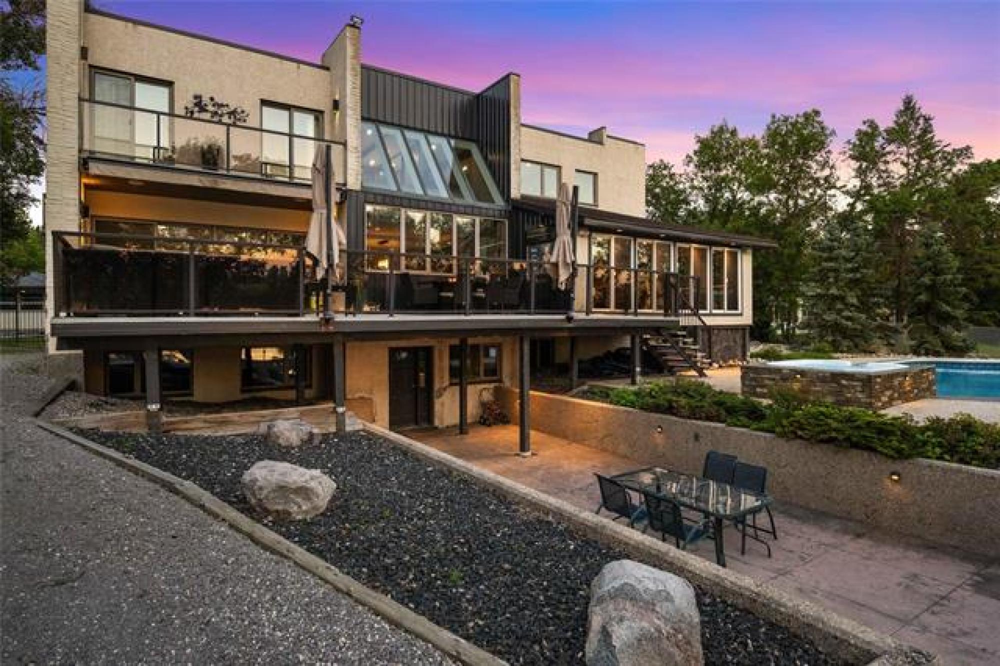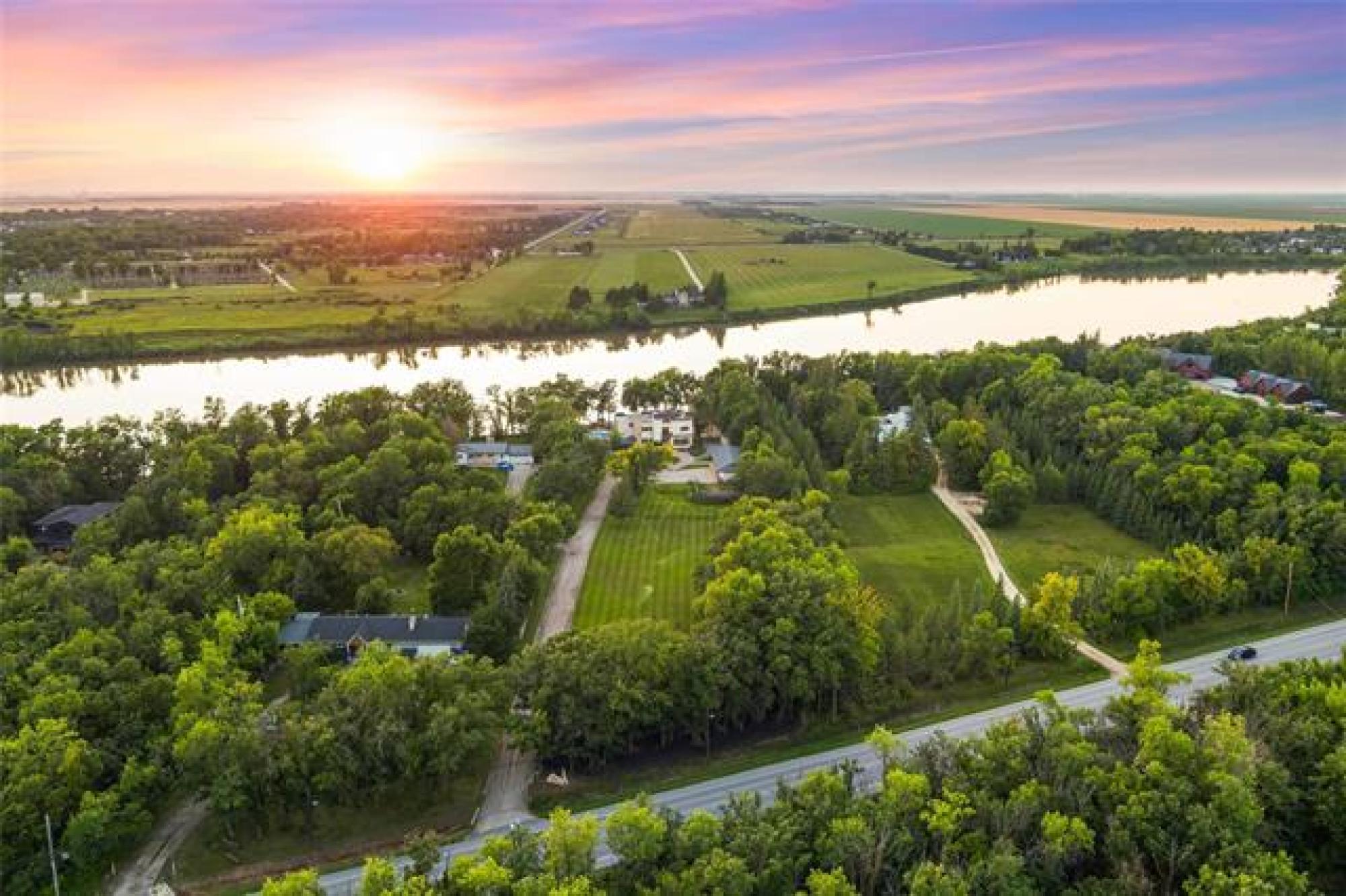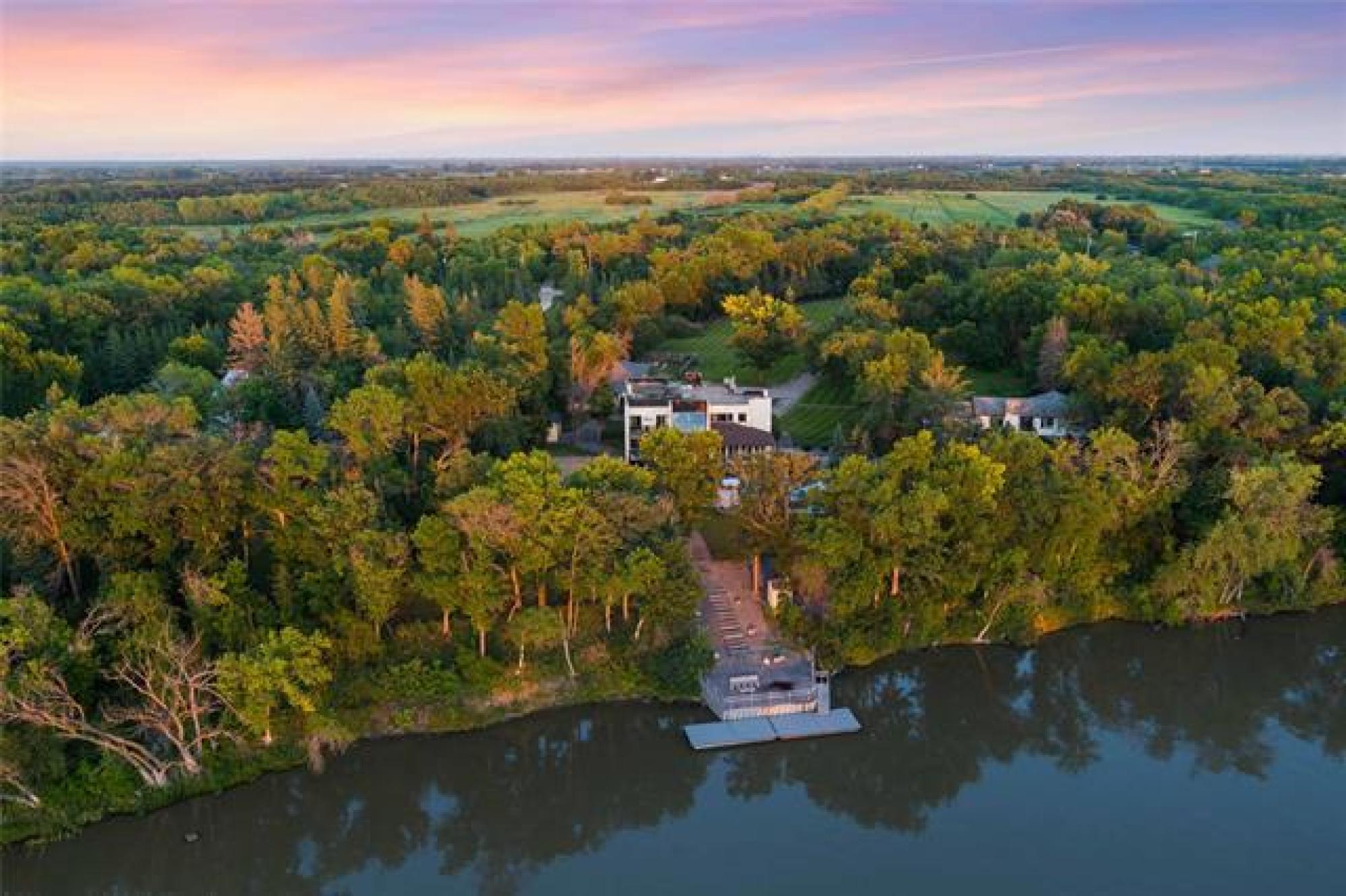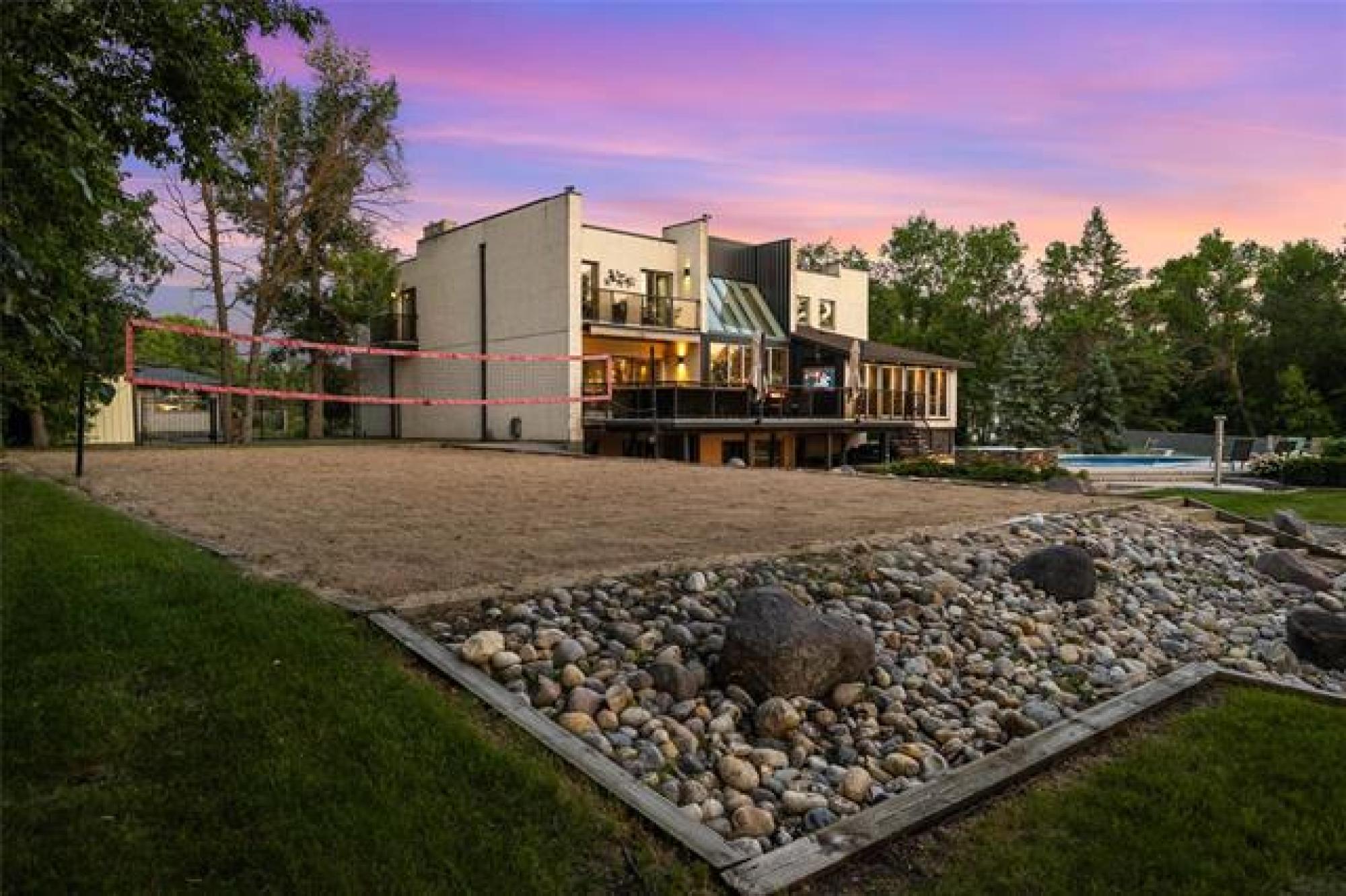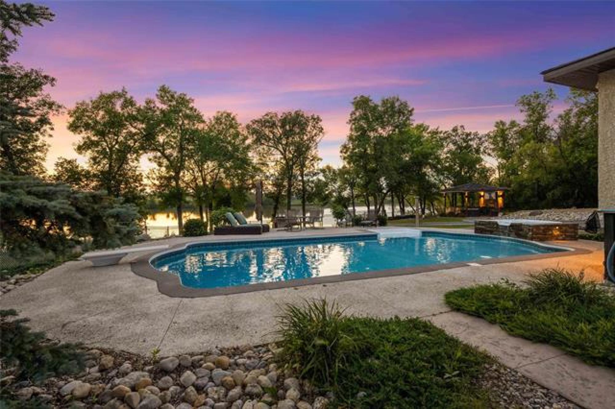 Discover this exquisite 4,110 SF riverfront two-storey estate set on 2.5 acres in desirable East St. Paul. Expansive windows bathe the home in natural light, showcasing an inviting living area with a cozy fireplace and an elegant, open dining space. The gourmet kitchen impresses with quartz countertops, a grand island, built-in stainless steel appliances, dual ovens, and an oversized fridge. Upstairs, a spacious loft leads to the serene primary suite featuring a private balcony, floor-to-ceiling mirrored closets, and a spa-inspired 4-piece ensuite. Three additional bedrooms and a dual vanity bathroom complete the upper level. The lower level offers an expansive rec room with a 3-piece bath, ideal for family gatherings and entertaining. A versatile workshop, currently a gym, and a quadruple detached garage provide exceptional flexibility and storage. Step into the sunroom and out to your private resort-style oasis with an in-ground pool, hot tub, volleyball court, outdoor bar, raised deck, cozy fire pit and private dock. This extraordinary property embodies timeless elegance, comfort, and luxury in one of East St. Paul’s most coveted settings.