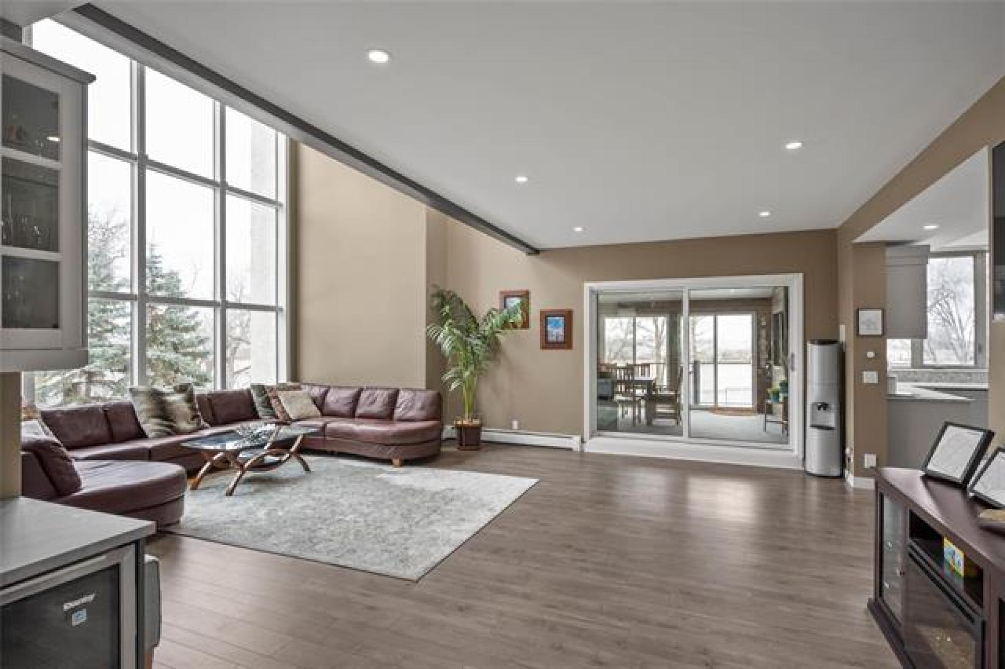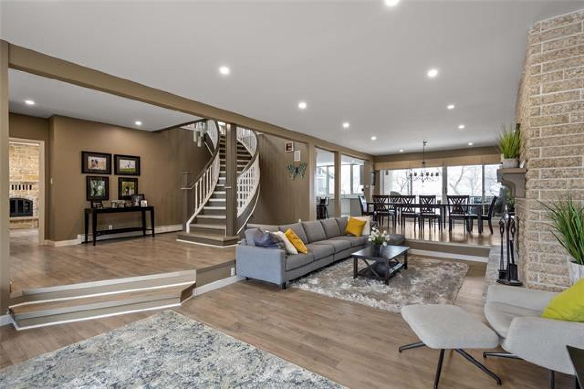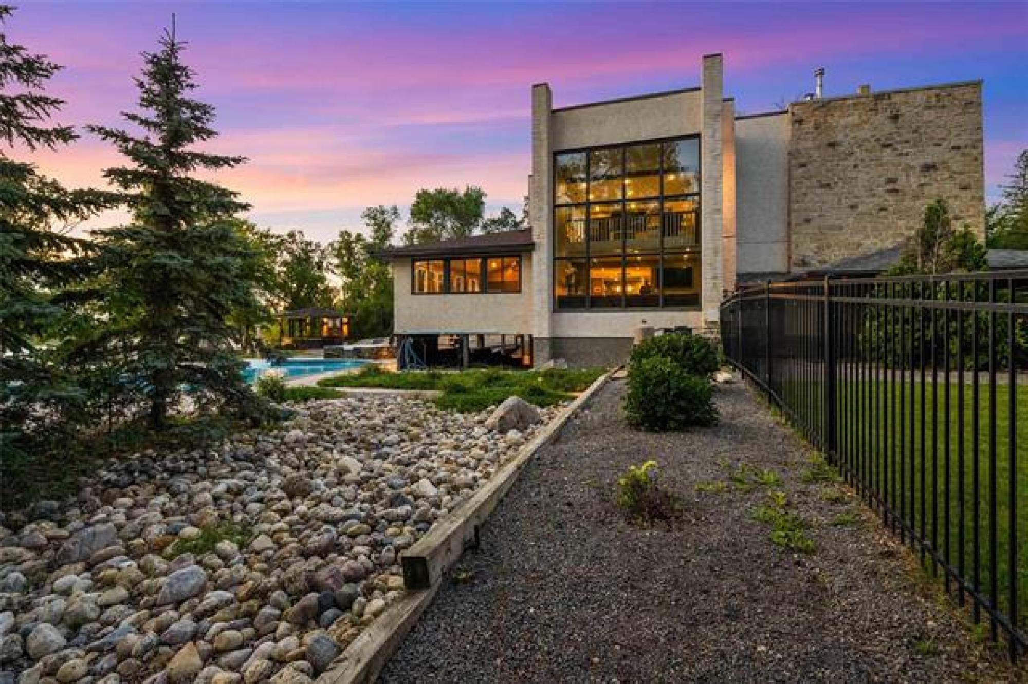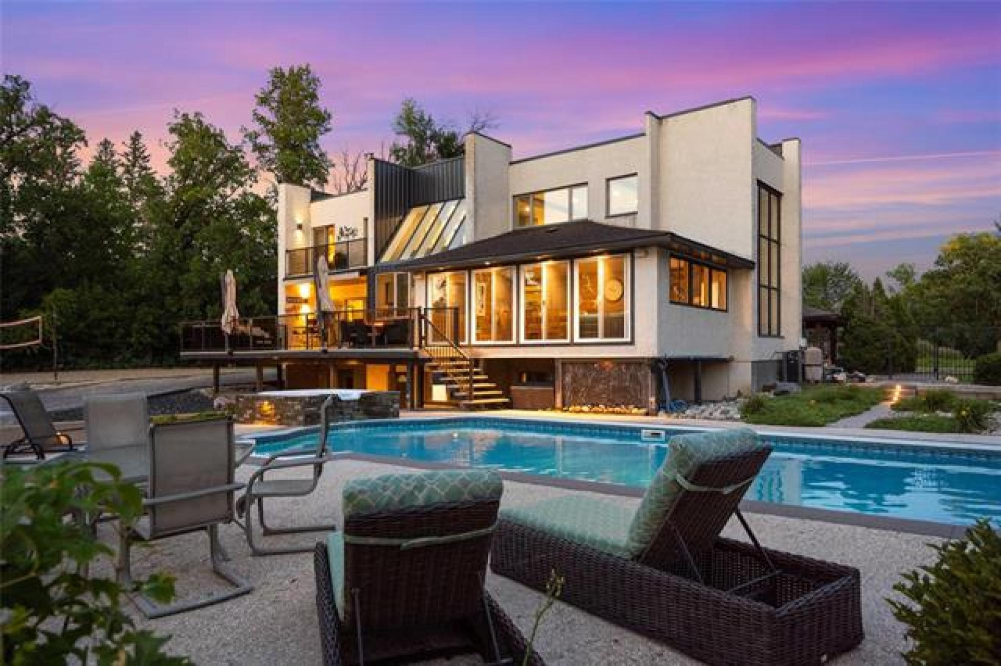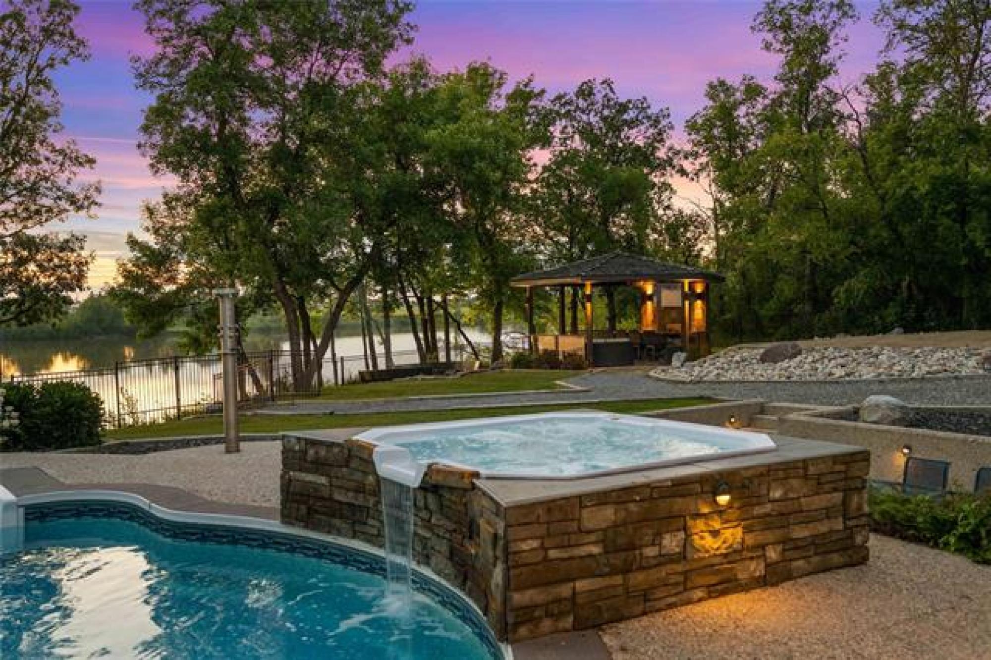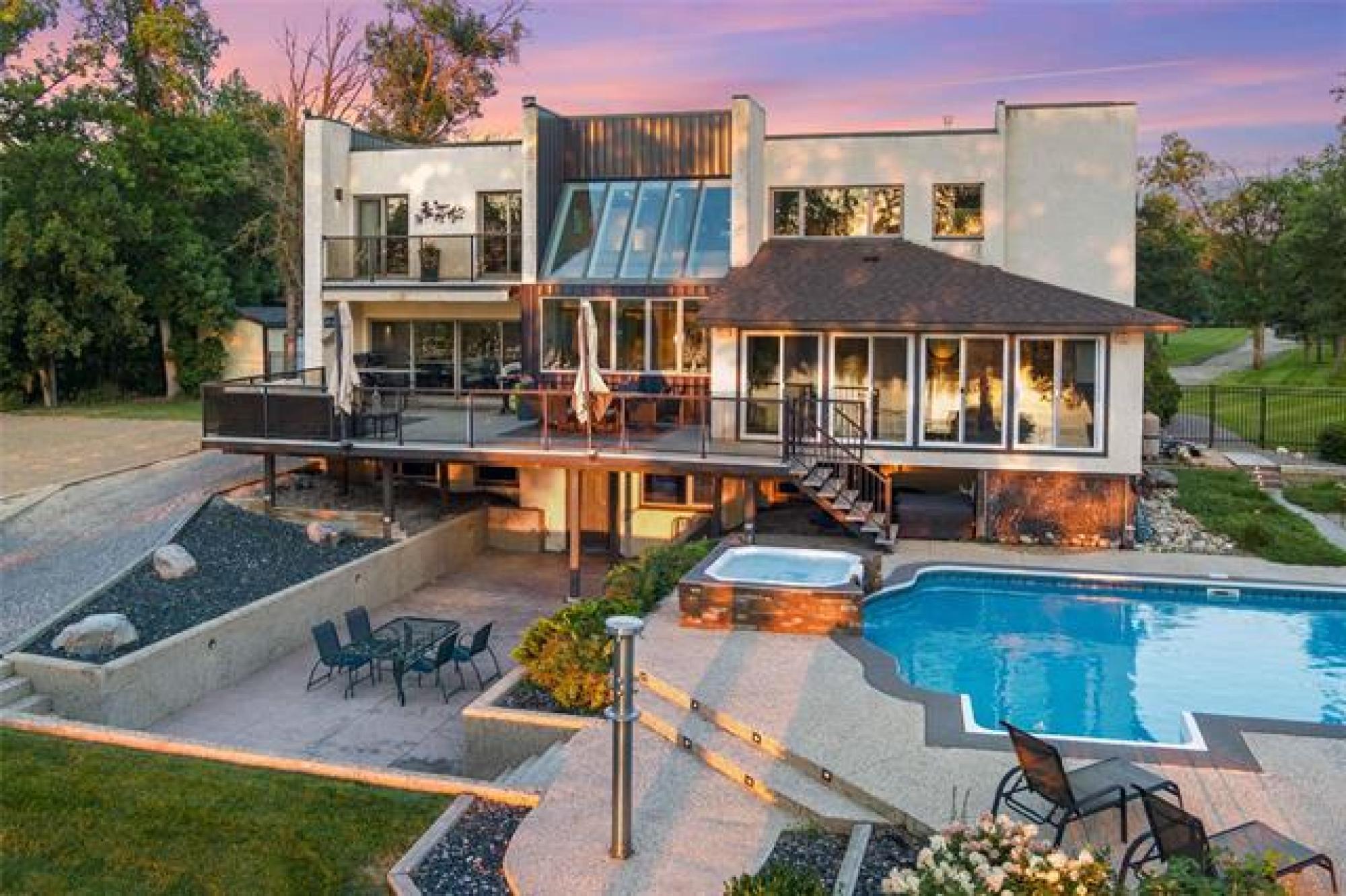 Discover this exquisite 4,110 SF riverfront two-storey estate set on 2.5 acres in desirable East St. Paul. Expansive windows bathe the home in natural light, showcasing an inviting living area with a cozy fireplace and an elegant, open dining space. The gourmet kitchen impresses with quartz countertops, a grand island, built-in stainless steel appliances, dual ovens, and an oversized fridge. Upstairs, a spacious loft leads to the serene primary suite featuring a private balcony, floor-to-ceiling mirrored closets, and a spa-inspired 4-piece ensuite. Three additional bedrooms and a dual vanity bathroom complete the upper level. The lower level offers an expansive rec room with a 3-piece bath, ideal for family gatherings and entertaining. A versatile workshop, currently a gym, and a quadruple detached garage provide exceptional flexibility and storage. Step into the sunroom and out to your private resort-style oasis with an in-ground pool, hot tub, volleyball court, outdoor bar, raised deck, cozy fire pit and private dock. This extraordinary property embodies timeless elegance, comfort, and luxury in one of East St. Paul’s most coveted settings.