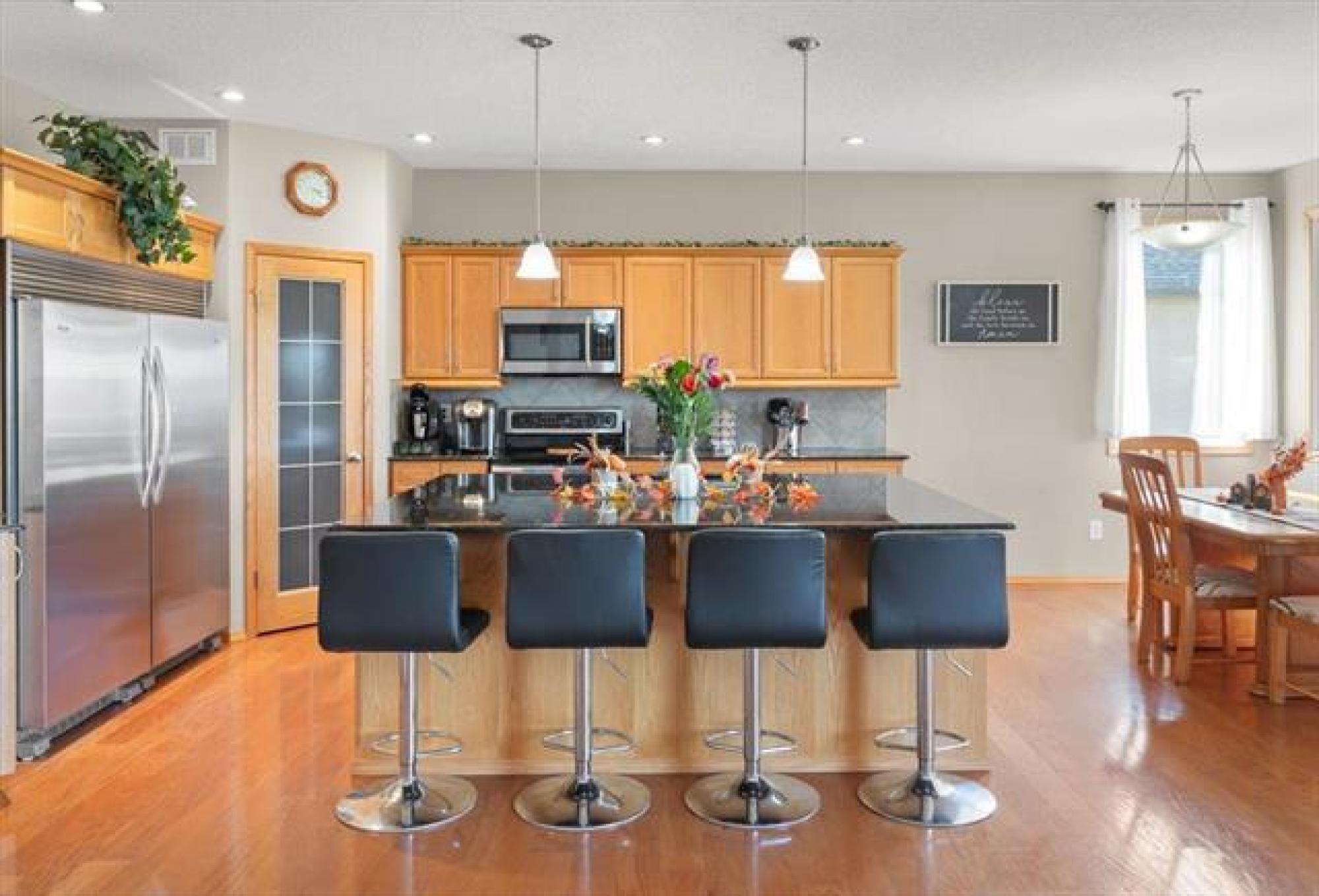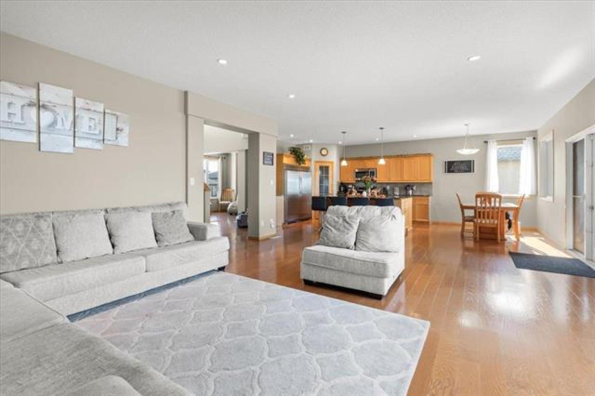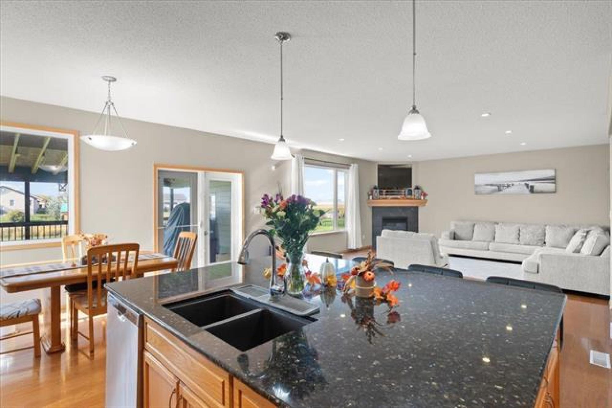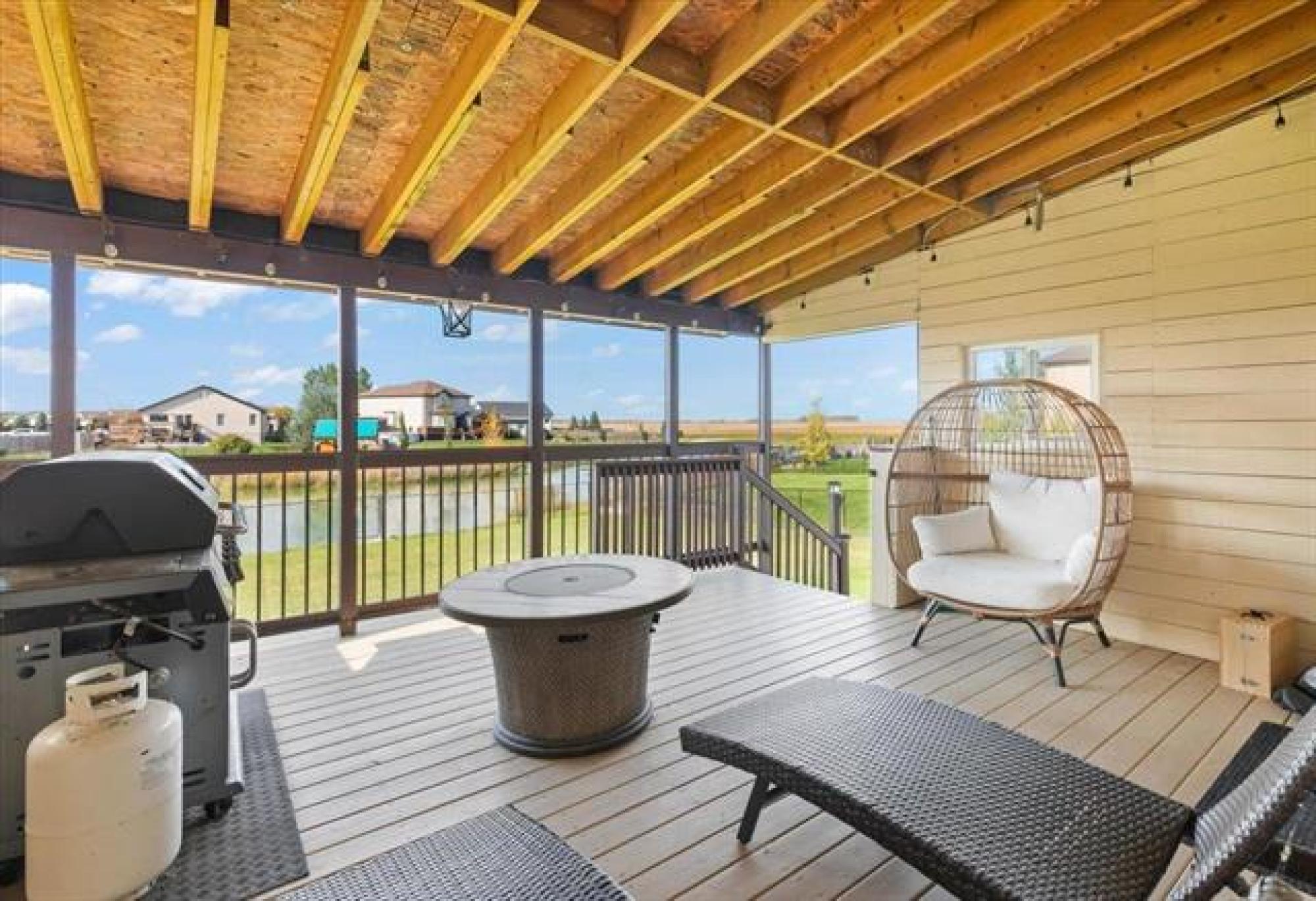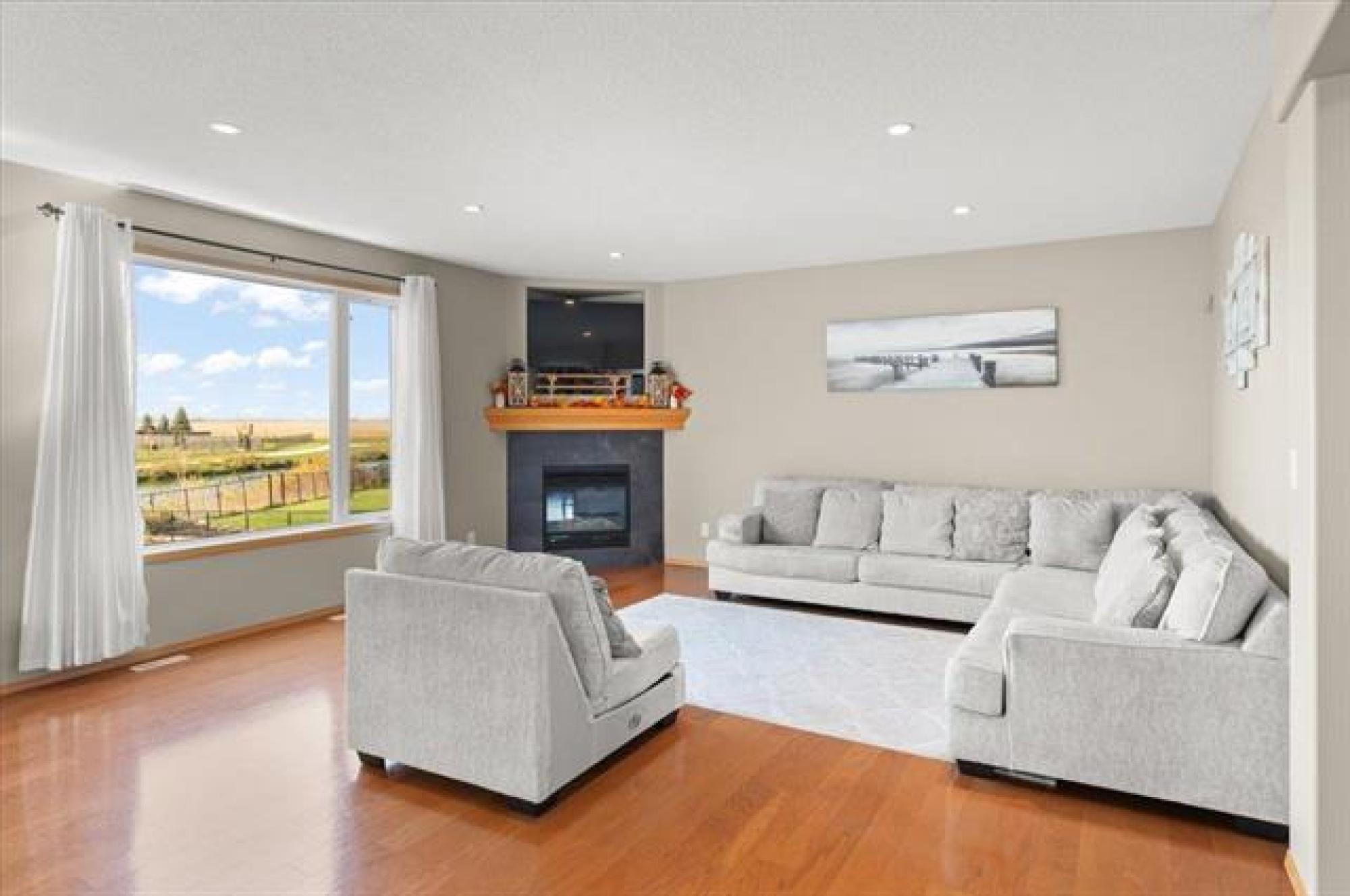 This stunning family residence blends luxury with livability, offering six bedrooms and 3.5 bathrooms across three fully finished levels - all backing onto pond! The main floor impresses with 9' ceilings, a chef’s kitchen with a massive granite island, tiled backsplash, walk-in pantry and oversized gourmet fridge/freezer; dining with engineered hardwood floors and patio access to a covered deck perfect for BBQ in all weather! The grand 19.5' great room centers on a cozy gas fireplace, while a convenient mudroom from the triple garage and a 2-piece powder room add everyday ease. A front-facing office/den provides flexible space. Upstairs, the oversized primary suite features a luxurious 5 piece ensuite with soaker tub, dual vanities and oversized shower with rainfall and adjustable jets. Two additional bedrooms, laundry room WITH WINDOW and a generous bonus room complete the second floor. The lower level includes a rec room, three more bedrooms and a full bathroom. Outside, the covered deck and fenced yard overlook a tranquil pond—perfect for entertaining or quiet evenings. Plenty of storage space beside the garage leading into the backyard with expanded parking for RV, Boat and all the toys!