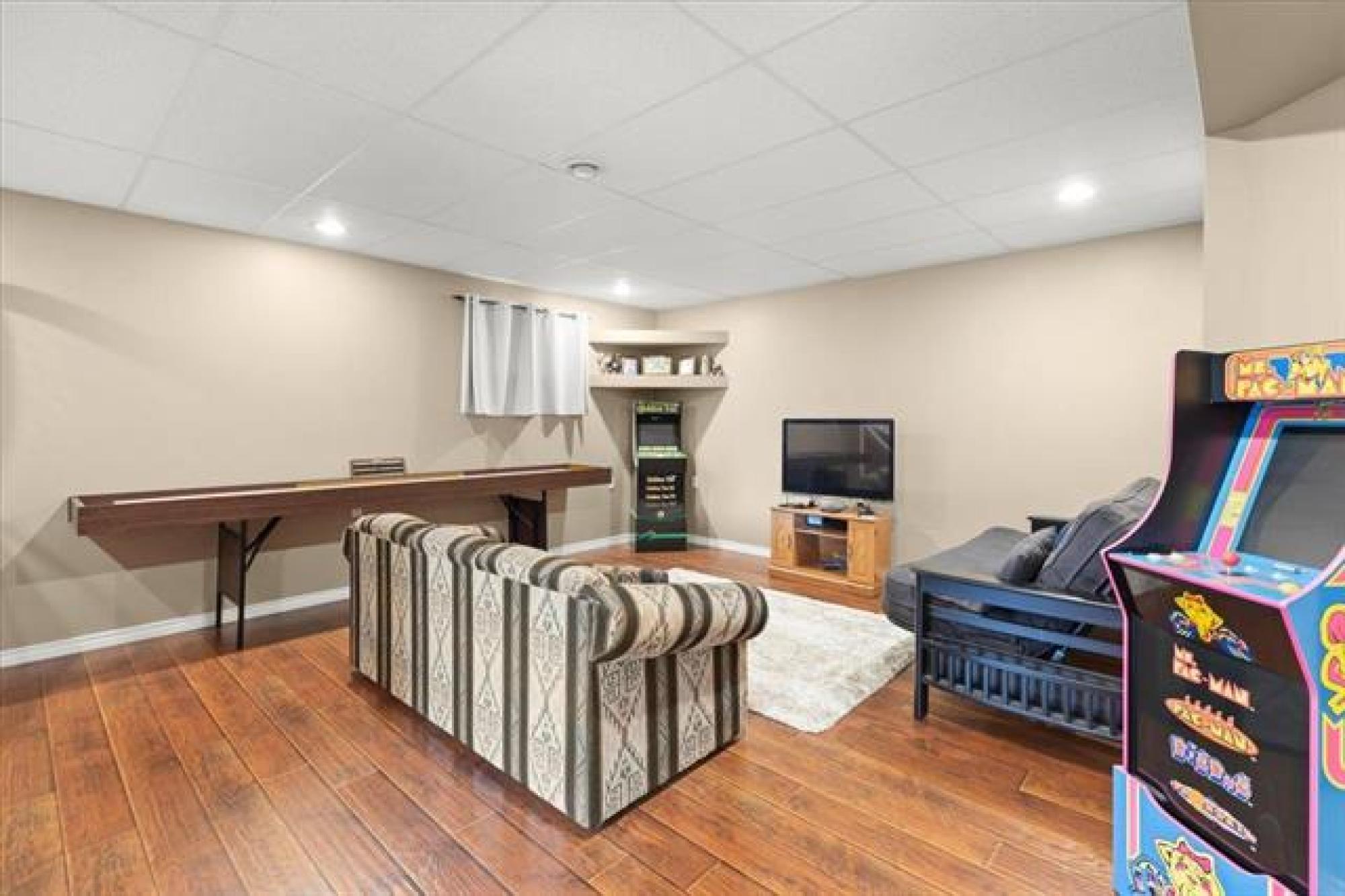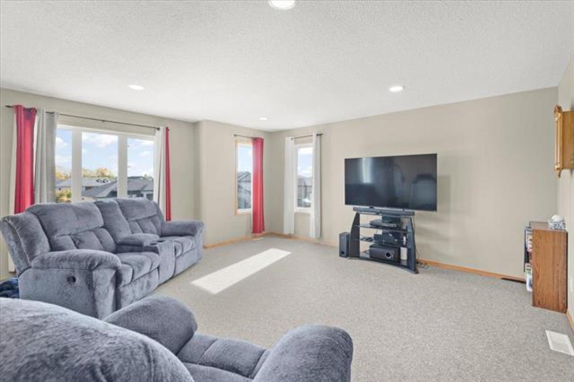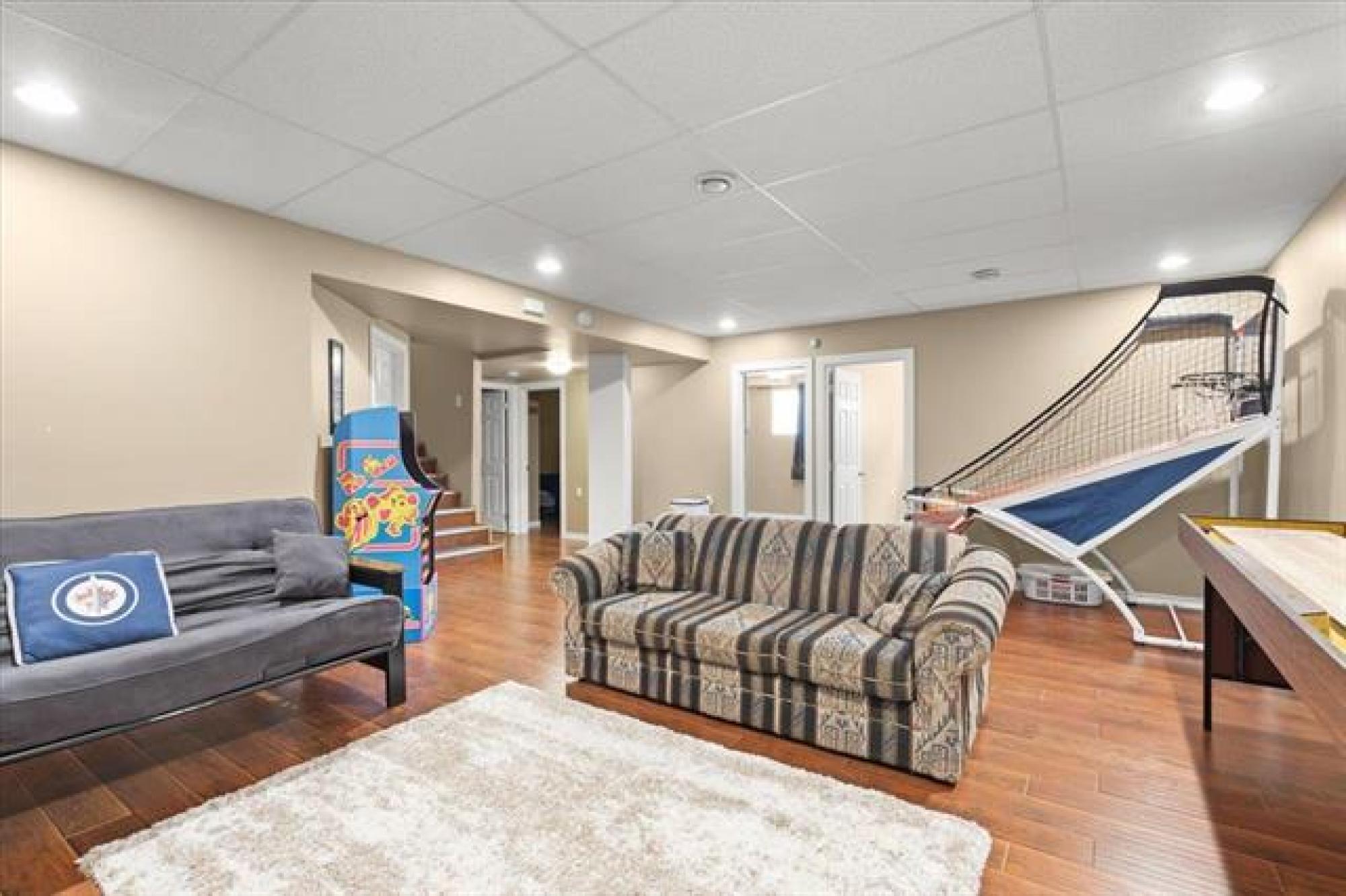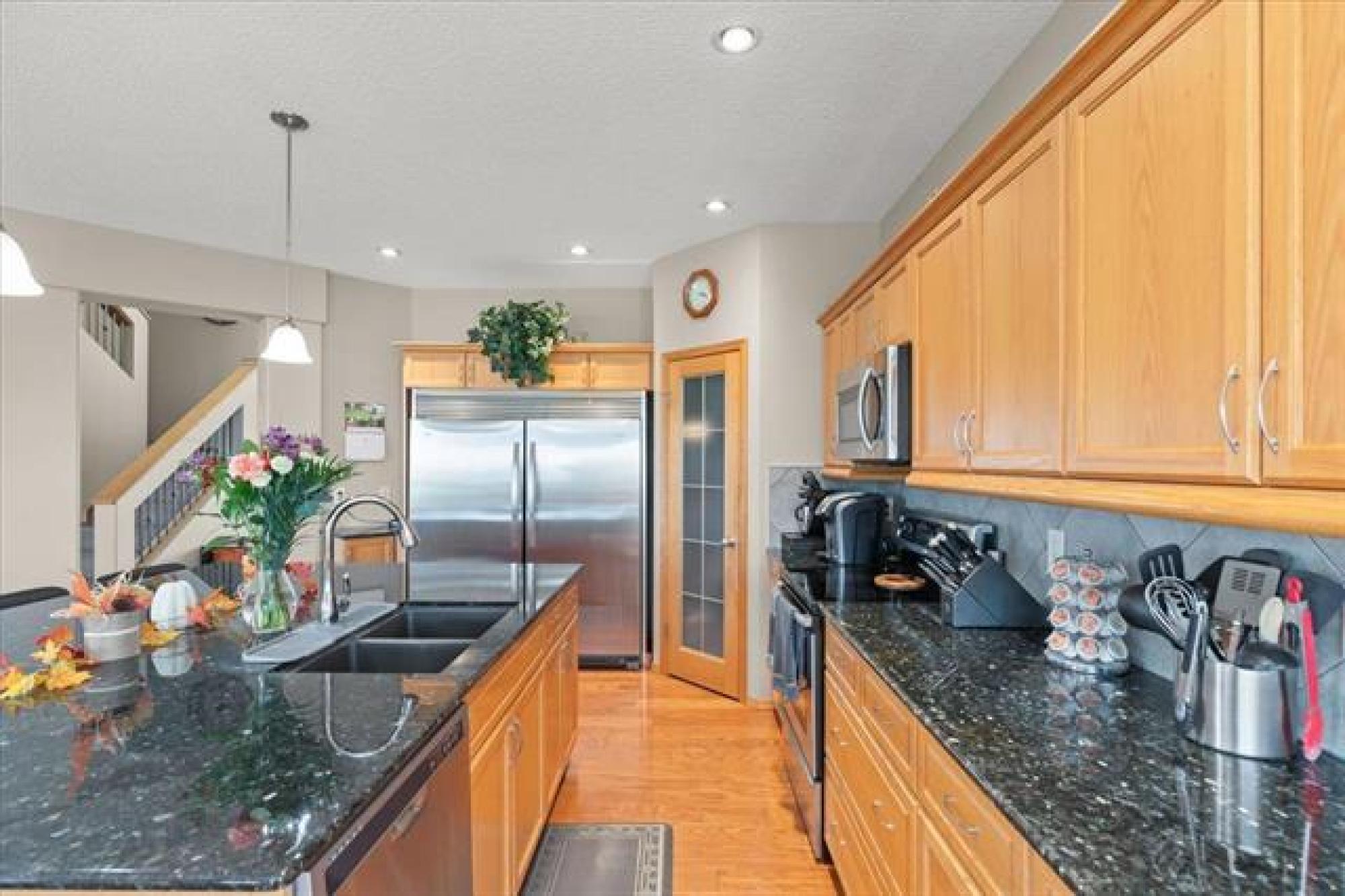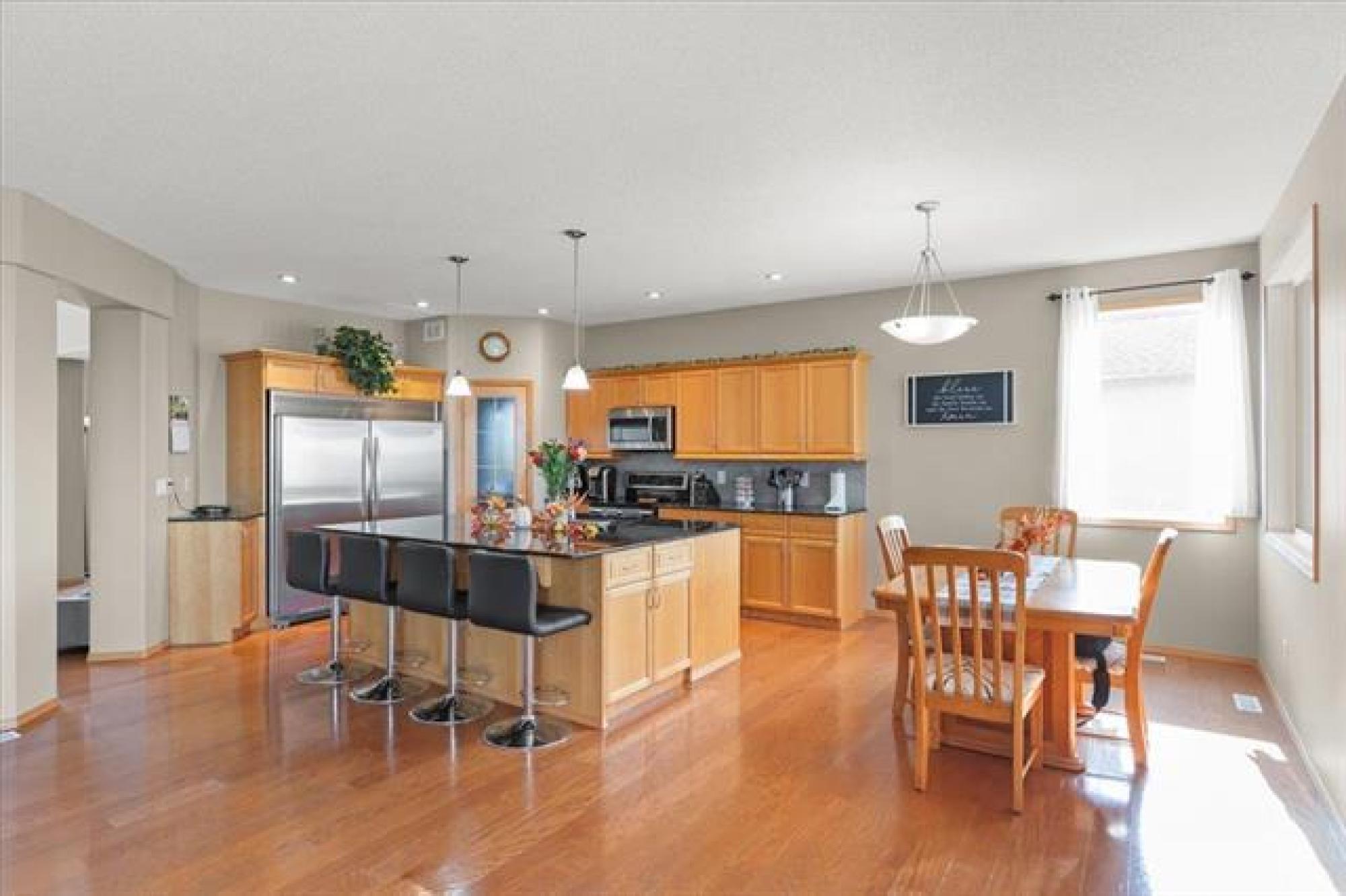 This stunning family residence blends luxury with livability, offering six bedrooms and 3.5 bathrooms across three fully finished levels - all backing onto pond! The main floor impresses with 9' ceilings, a chef’s kitchen with a massive granite island, tiled backsplash, walk-in pantry and oversized gourmet fridge/freezer; dining with engineered hardwood floors and patio access to a covered deck perfect for BBQ in all weather! The grand 19.5' great room centers on a cozy gas fireplace, while a convenient mudroom from the triple garage and a 2-piece powder room add everyday ease. A front-facing office/den provides flexible space. Upstairs, the oversized primary suite features a luxurious 5 piece ensuite with soaker tub, dual vanities and oversized shower with rainfall and adjustable jets. Two additional bedrooms, laundry room WITH WINDOW and a generous bonus room complete the second floor. The lower level includes a rec room, three more bedrooms and a full bathroom. Outside, the covered deck and fenced yard overlook a tranquil pond—perfect for entertaining or quiet evenings. Plenty of storage space beside the garage leading into the backyard with expanded parking for RV, Boat and all the toys!