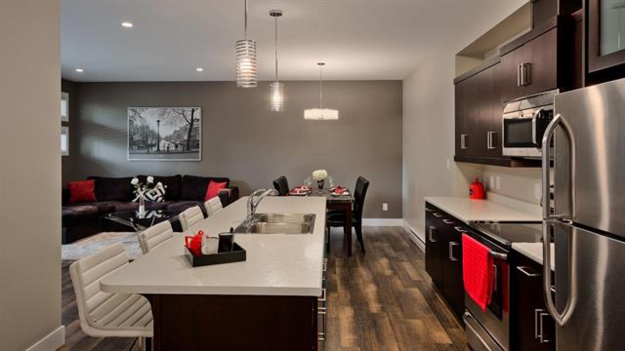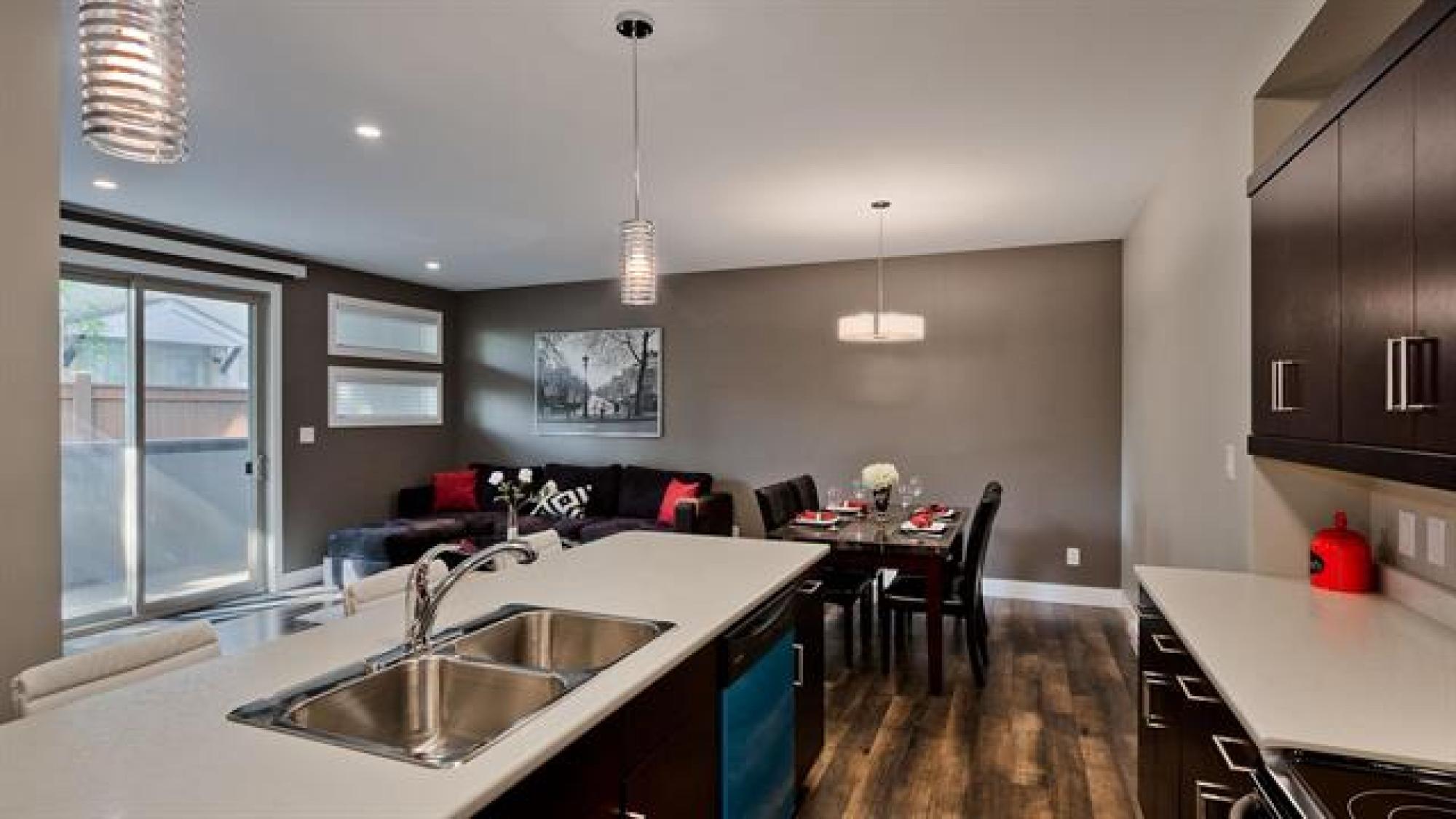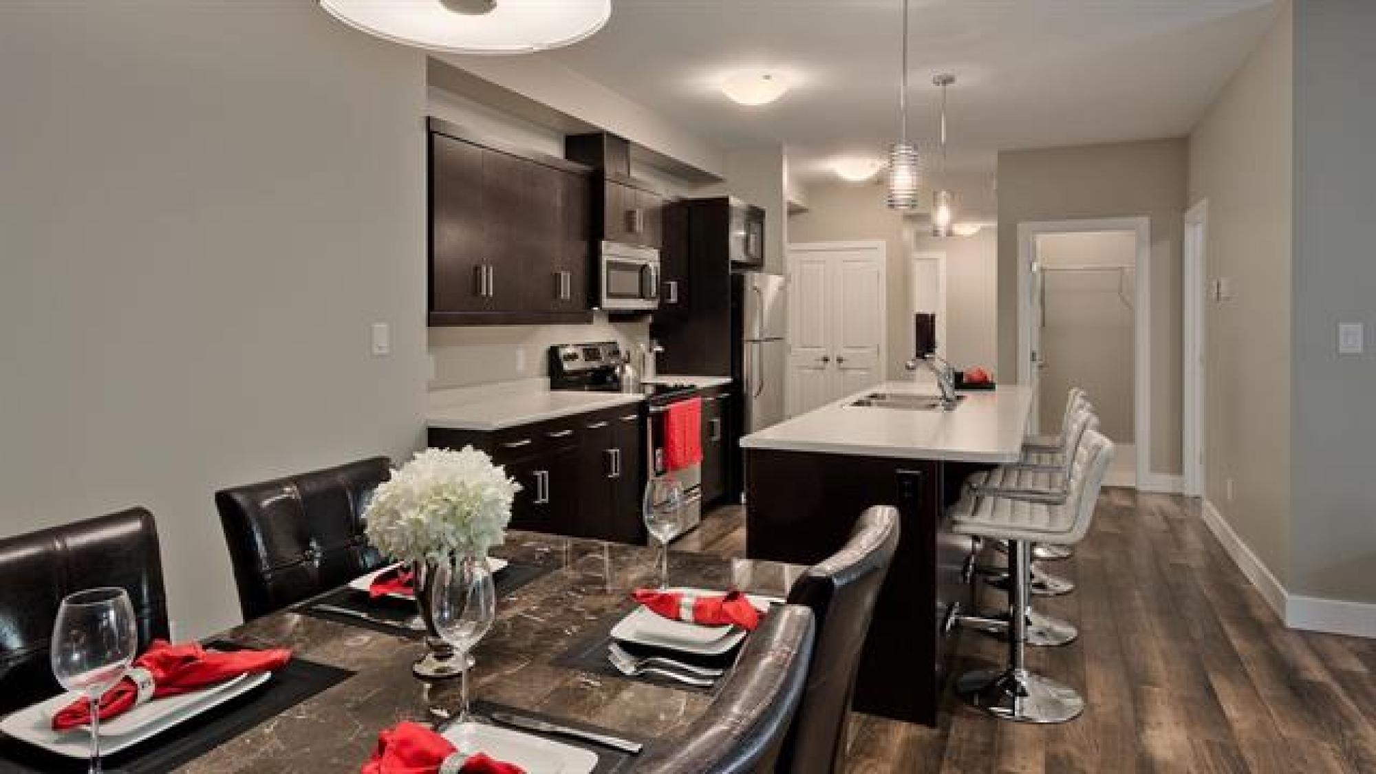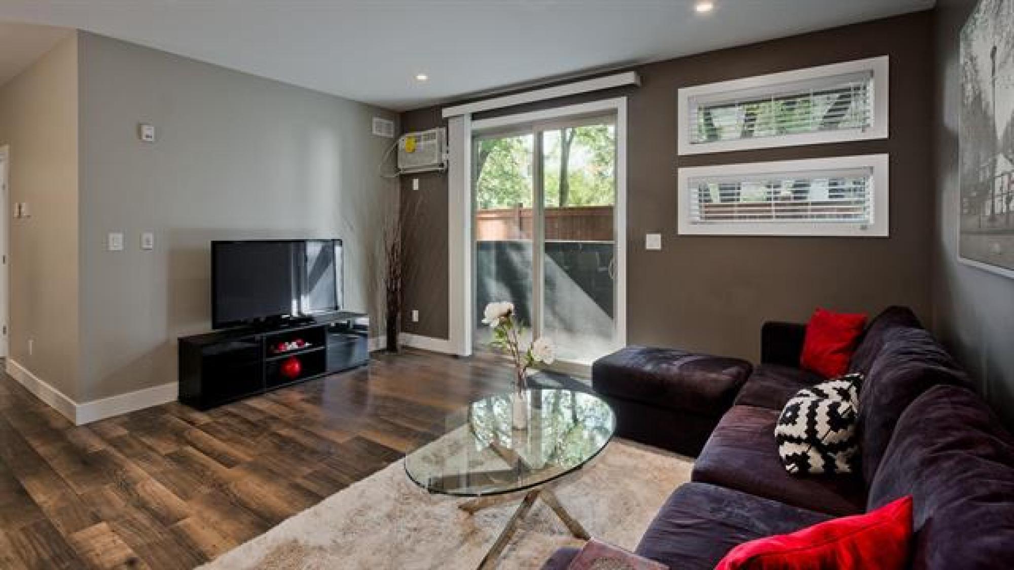 Artfully designed for modern living, this 919 square foot 2 bedroom top floor condo blends style with smart functionality. TWO parking stalls included! Front entry leading to a sleek galley kitchen and extended eating island—perfect for casual dining. The open-concept layout features warm laminate floors, 9’ ceilings, and an 8’ sliding door that opens to a private balcony with views of mature trees and downtown. The primary bedroom is thoughtfully separated from the entertaining area for added privacy. A laundry/storage room adds everyday convenience. With only one shared wall, each unit is built with peace and quiet in mind. Features include HRV, wall A/C, in-suite washer & dryer, stainless steel appliances, window coverings, and parking. Bold architecture and inviting common spaces make 5 FIVE 5 a place you’ll be proud to call home. *Staged interior pictures are from main floor suite with the same floor plan *