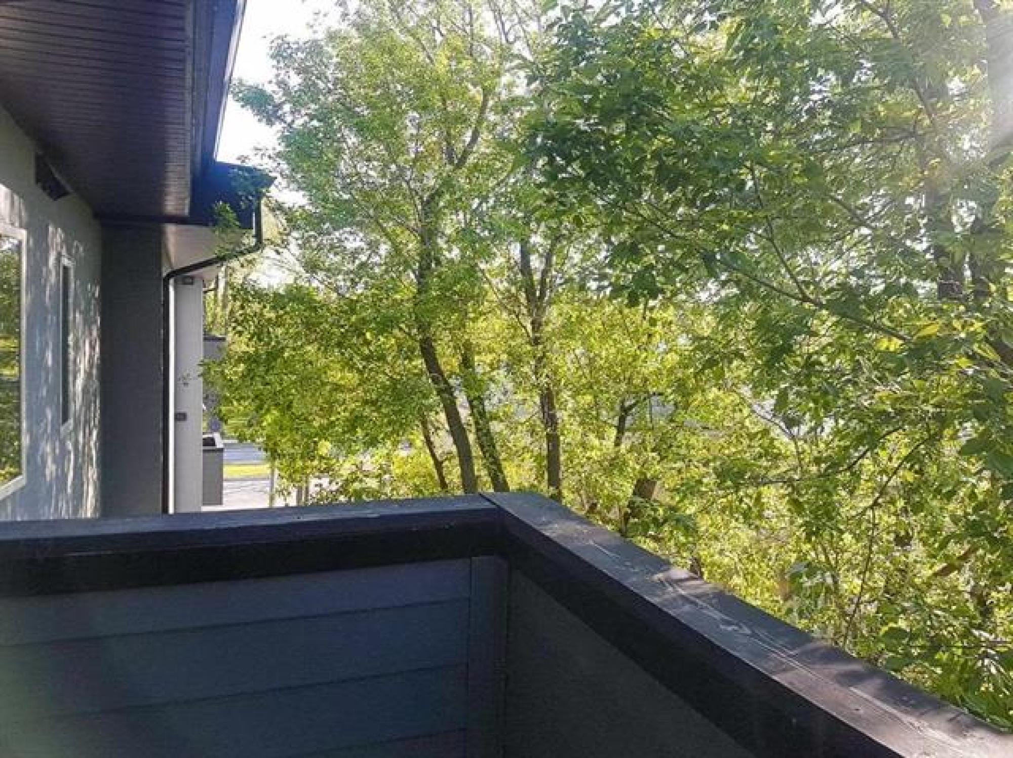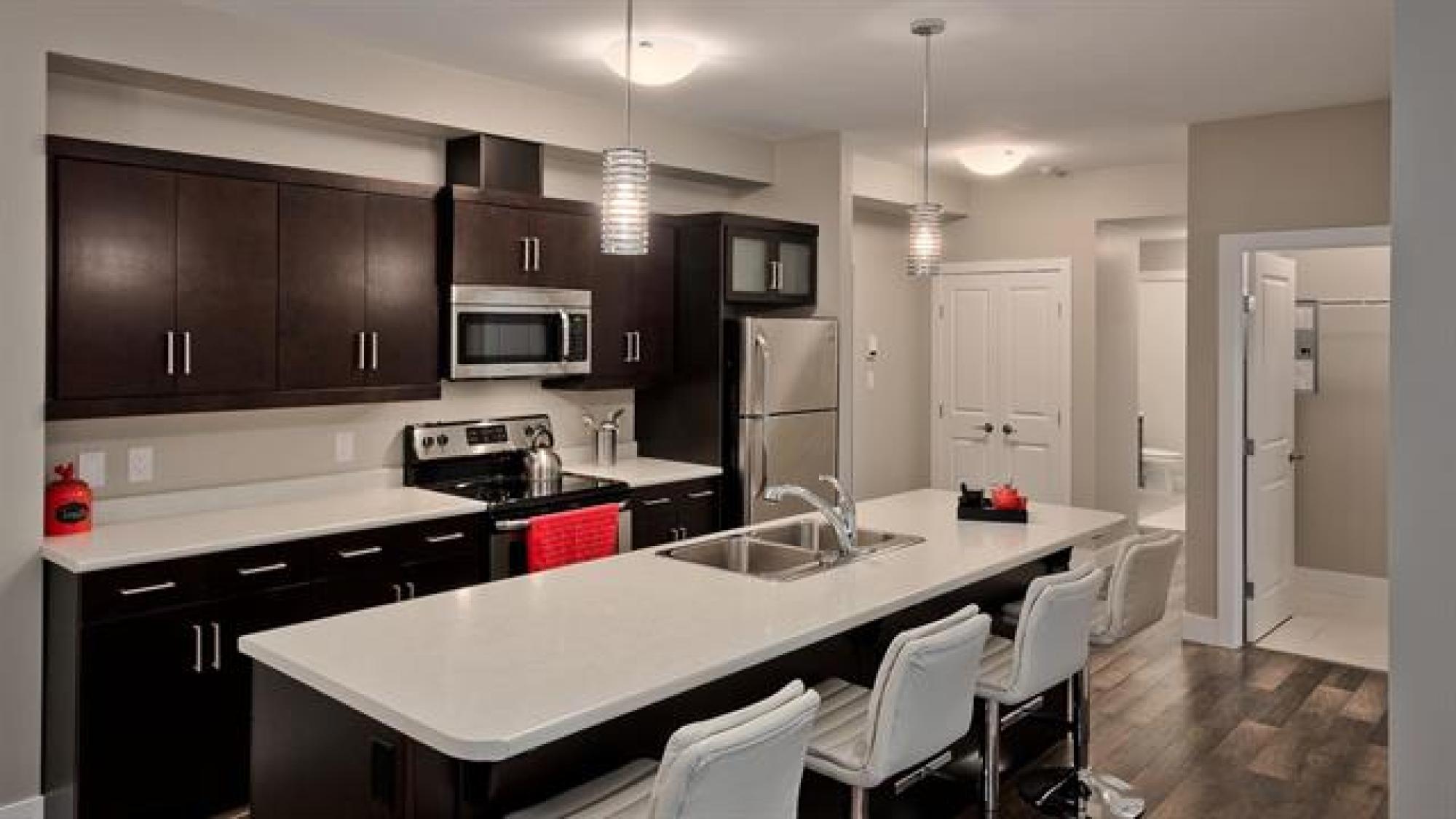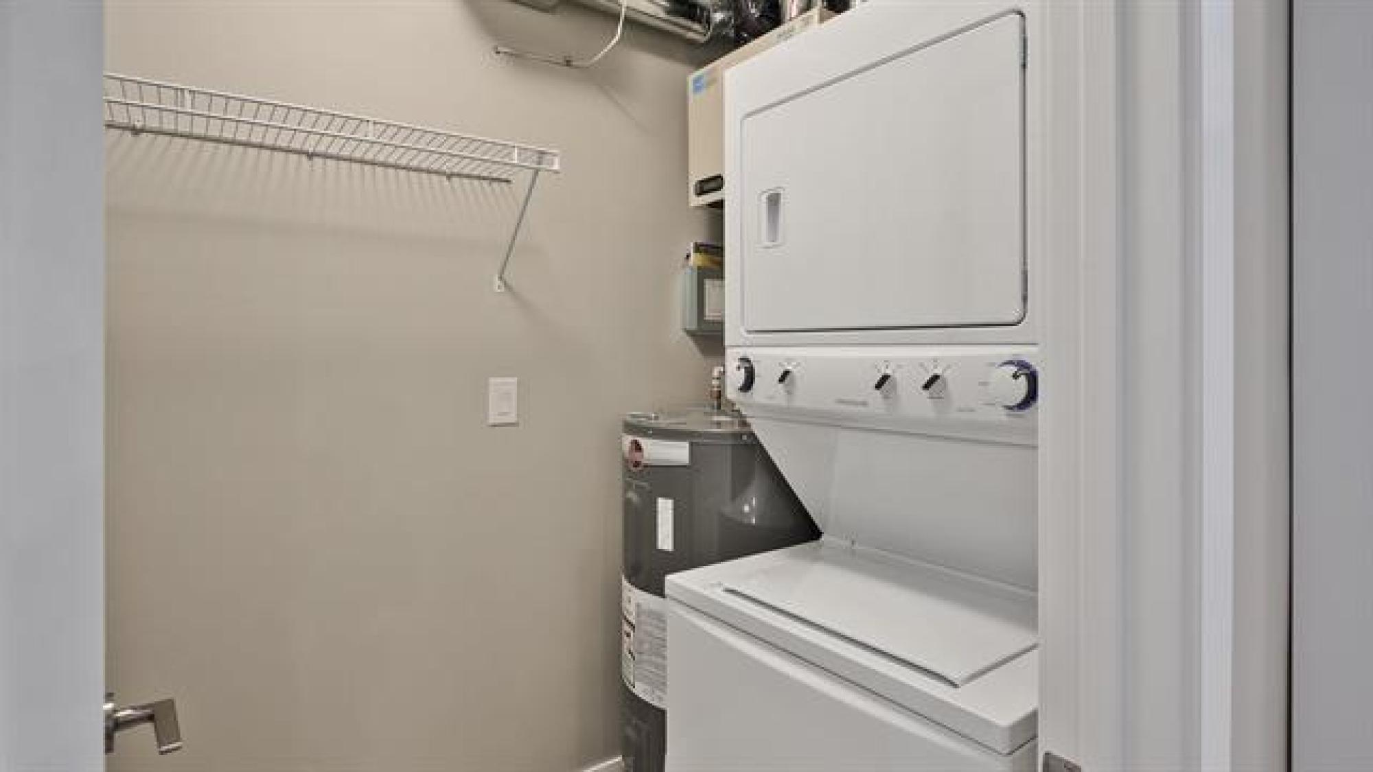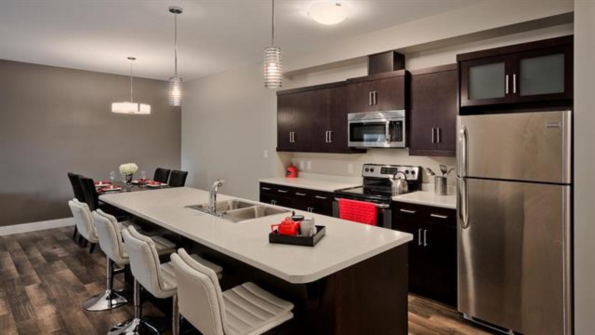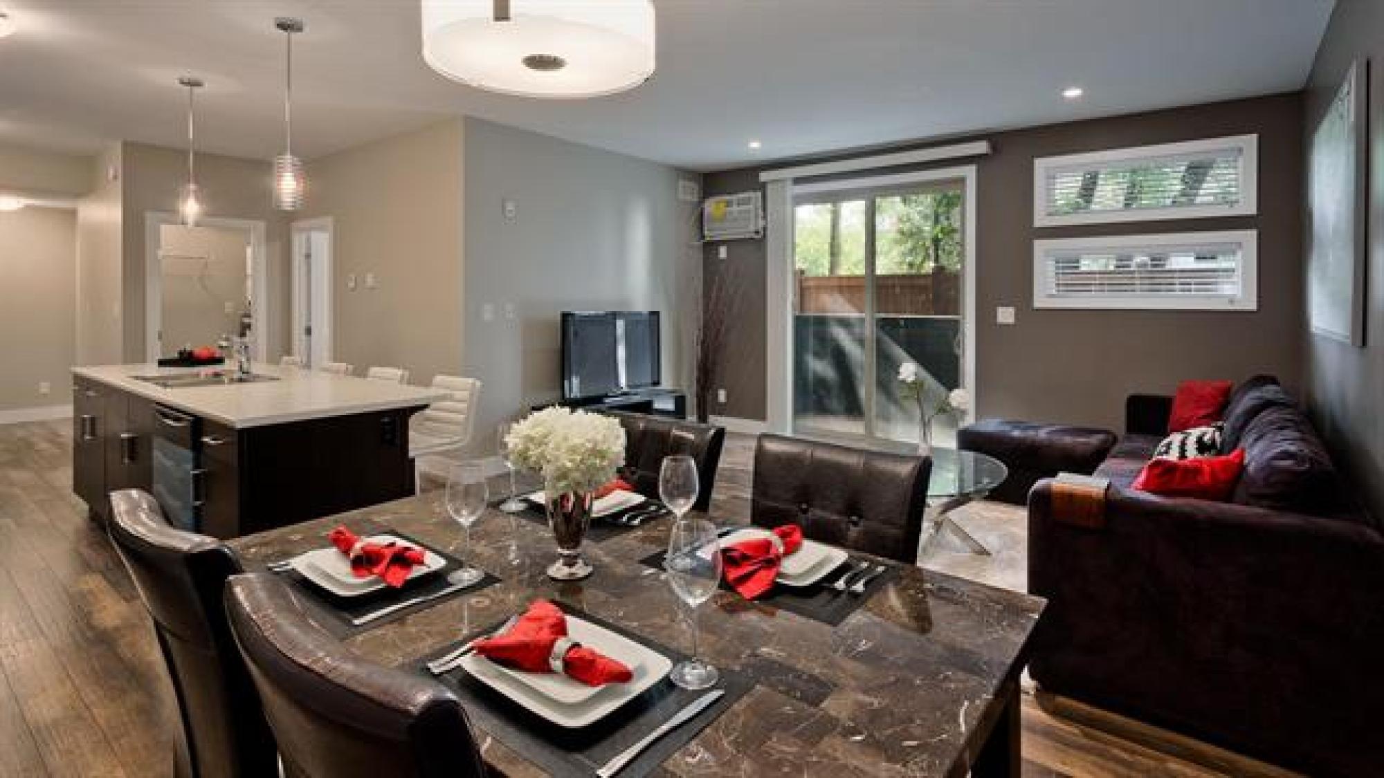 Artfully designed for modern living, this 919 square foot 2 bedroom top floor condo blends style with smart functionality. TWO parking stalls included! Front entry leading to a sleek galley kitchen and extended eating island—perfect for casual dining. The open-concept layout features warm laminate floors, 9’ ceilings, and an 8’ sliding door that opens to a private balcony with views of mature trees and downtown. The primary bedroom is thoughtfully separated from the entertaining area for added privacy. A laundry/storage room adds everyday convenience. With only one shared wall, each unit is built with peace and quiet in mind. Features include HRV, wall A/C, in-suite washer & dryer, stainless steel appliances, window coverings, and parking. Bold architecture and inviting common spaces make 5 FIVE 5 a place you’ll be proud to call home. *Staged interior pictures are from main floor suite with the same floor plan *
