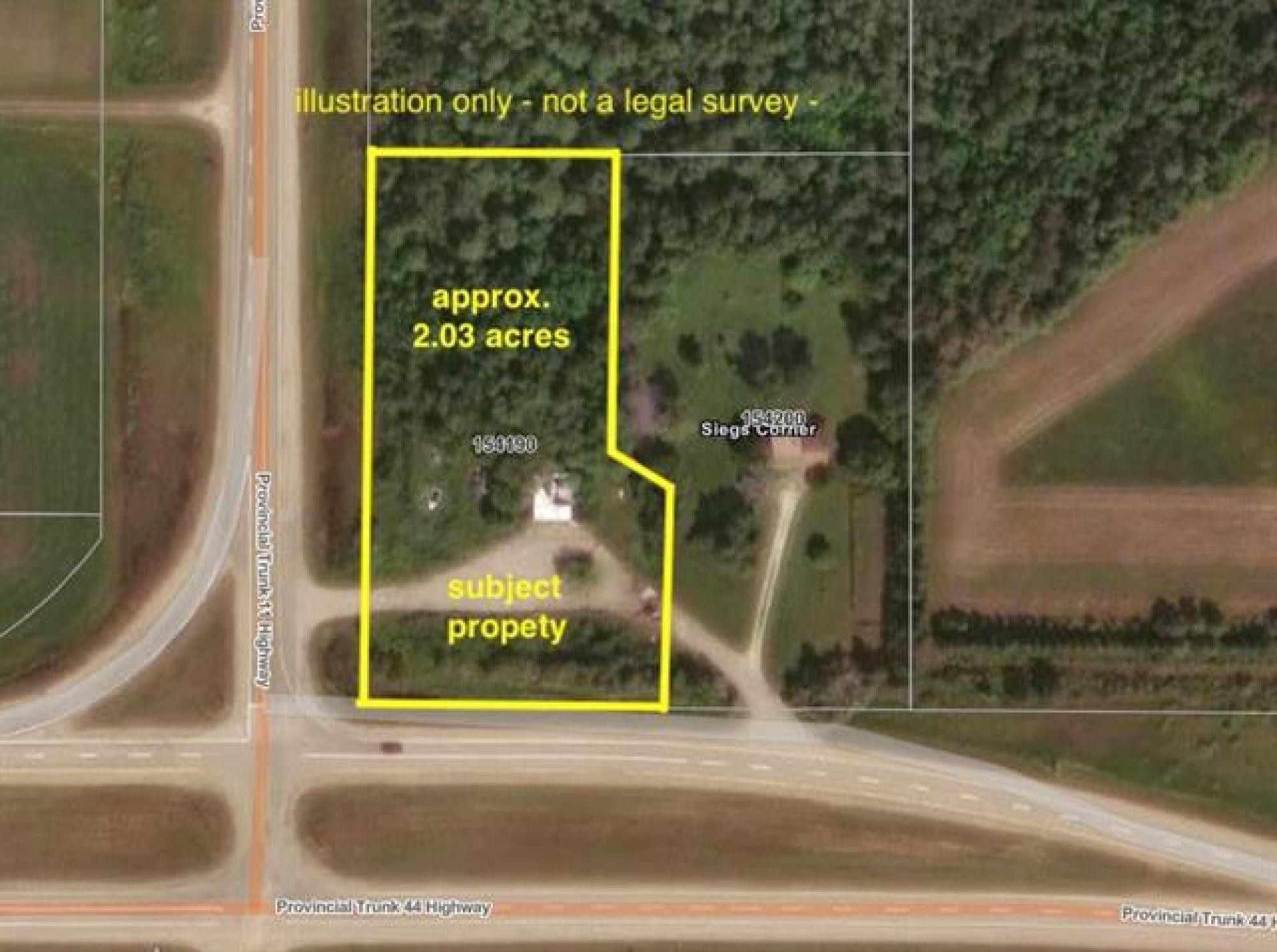 This high traffic 2 acre property at the corner of Highway 11N and Highway 44 is an extremely rare opportunity just 50 minutes east of Winnipeg and on the way to the Whiteshell. With great potential for a commercial venture or even a new home site, the location offers excellent visibility and convenience. (AG Limited Zoning - RM of Whitemouth) The north two thirds of the property is beautifully treed with mature forest, adding privacy and natural charm. On the south portion sits the former Benny’s Service, featuring an older concrete block garage structure that may still offer usable space. The roof is caving in, but someone with a vision still may want to use this shell as a start. A large asphalt parking area also remains and could be nicely enhanced with some landscaping work. All existing items and buildings on the property (excluding the chain link fencing & business signs on the highway) are included in the sale and being offered in AS IS condition. Buyers are encouraged to conduct their own due diligence regarding ALL aspects of this unique property. ***PLEASE DO NOT TRESSPASS INTO THE BUILDING - THE ROOF IS FALLING IN AND ABUNDANT HAZARDS***