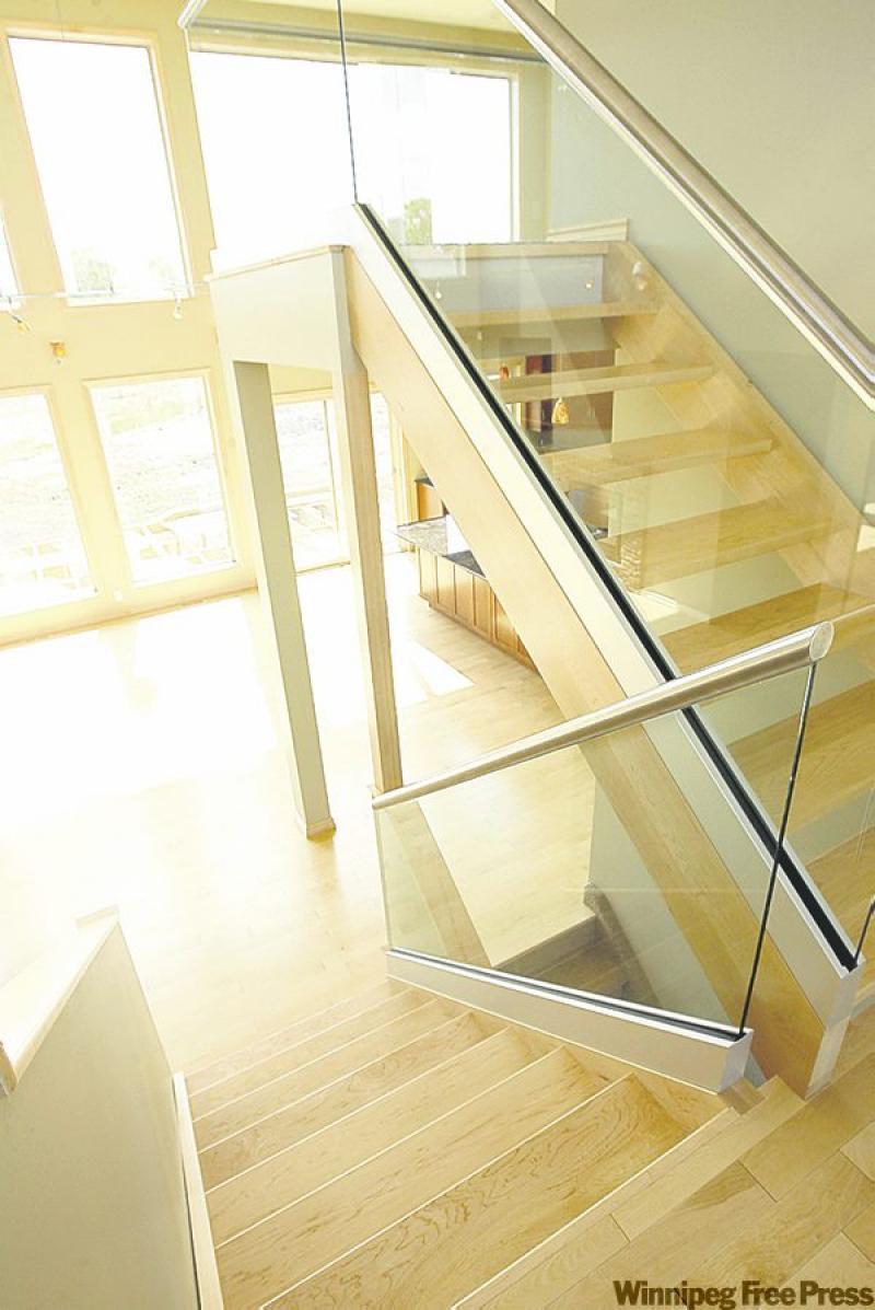 The guard rails are made of a structural glass system, lined with a stainless steel top rail, while the open-stair design of the staircase features solid maple stairs. Both add to the home's sense of open space and natural light.