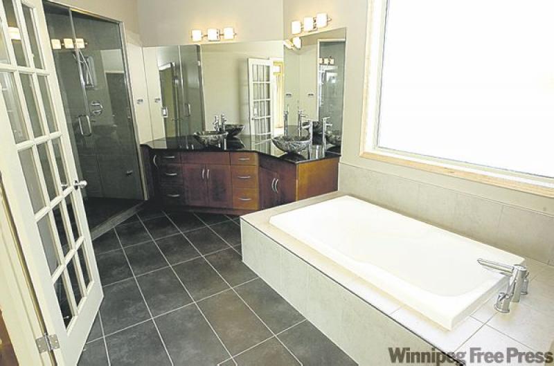 The floor is heated and covered with porcelain, oversized tiles. His and hers vessel sinks are set atop a granite countertop. A pedestal bathtub sits underneath a large frosted-glass window, providing soft, natural light. And the toilet is separated from the rest of the room in a small water closet, large enough to hold a good selection of reading material.