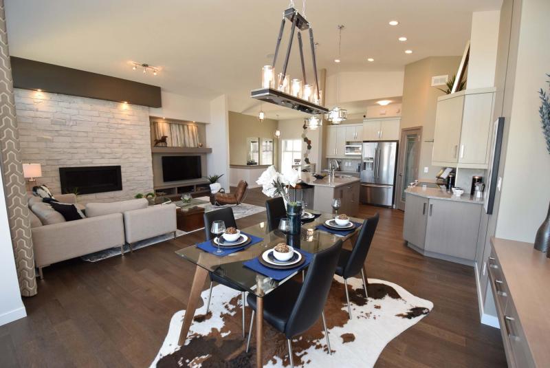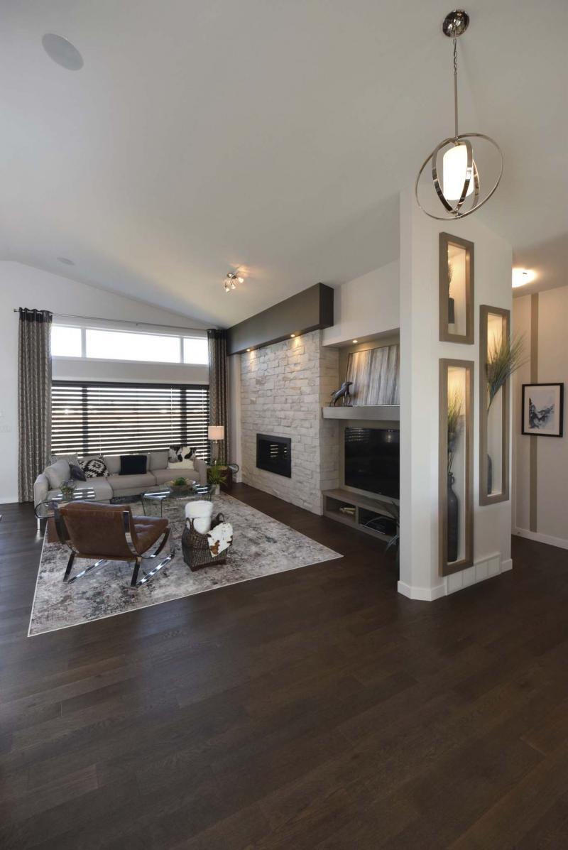 While the rich hardwoods blend beautifully with the other finishes — taupe and off-white walls, light/dark Portobello maple cabinets, two-tone taupe quartz countertops, a gorgeous herringbone tile backsplash and gas fireplace with taupe cultured stone surround — a glass-filled rear wall allows tons of natural light to stream into the great room.