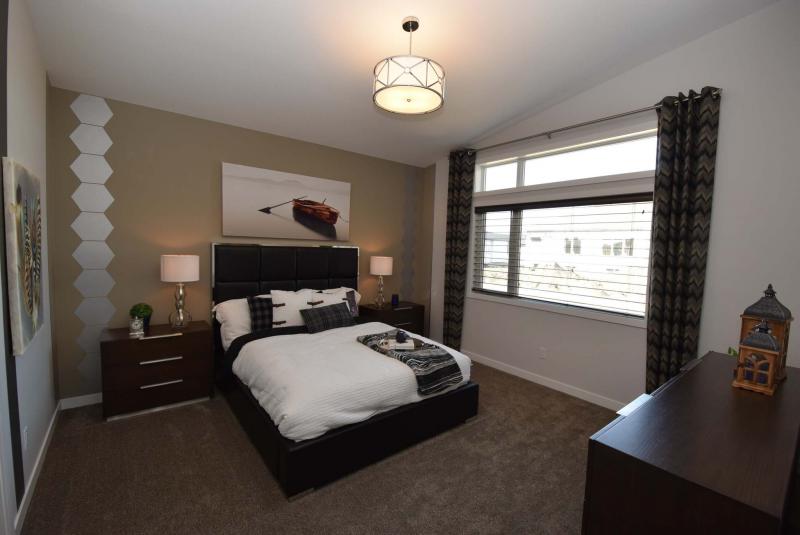 "The master suite features a vaulted ceiling for extra volume, a huge window with transom above to let in extra light and a warm taupe feature wall behind the bed," Phillips says. "It also has a big walk-in closet with built-in wooden shelving and drawers — another standard feature."