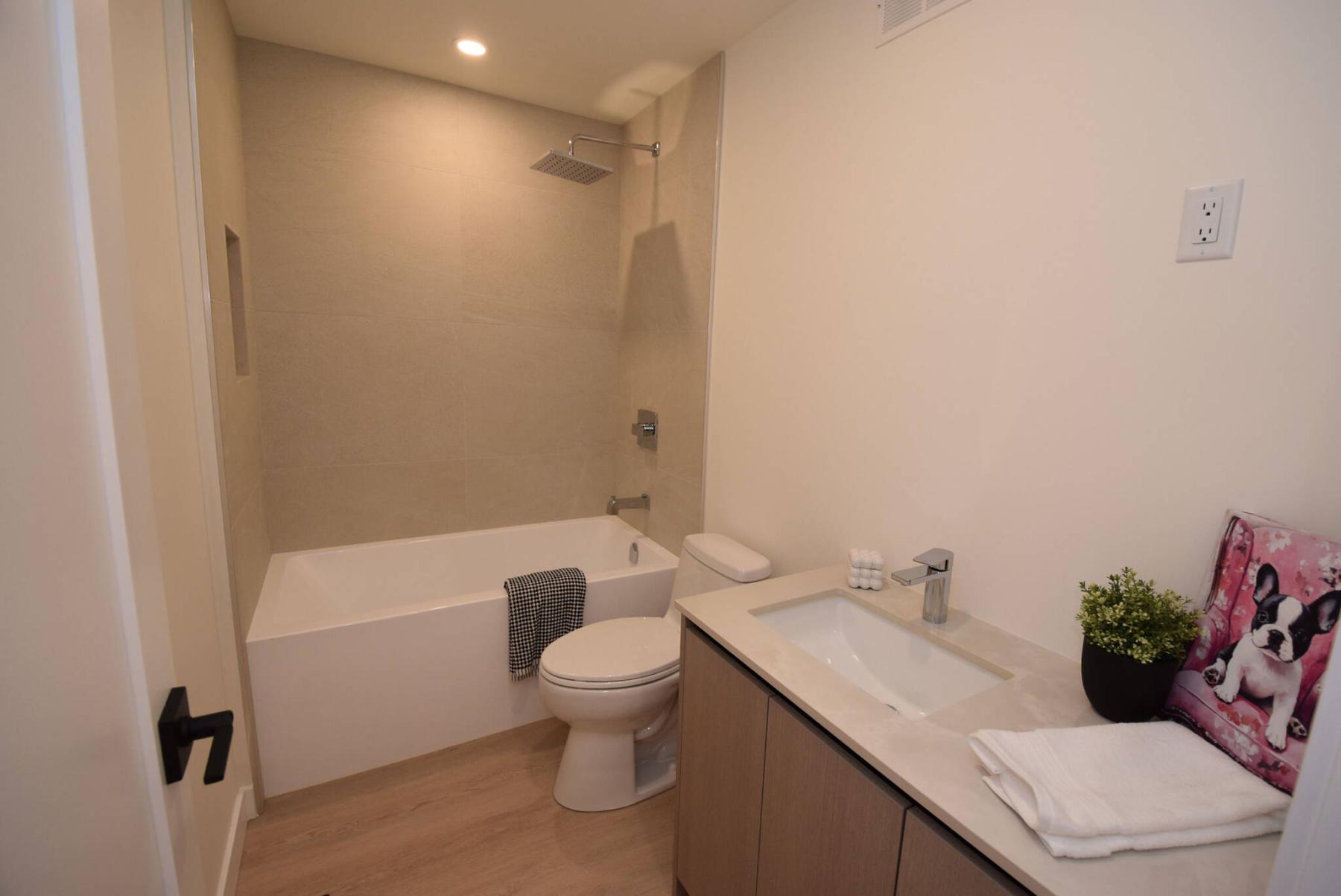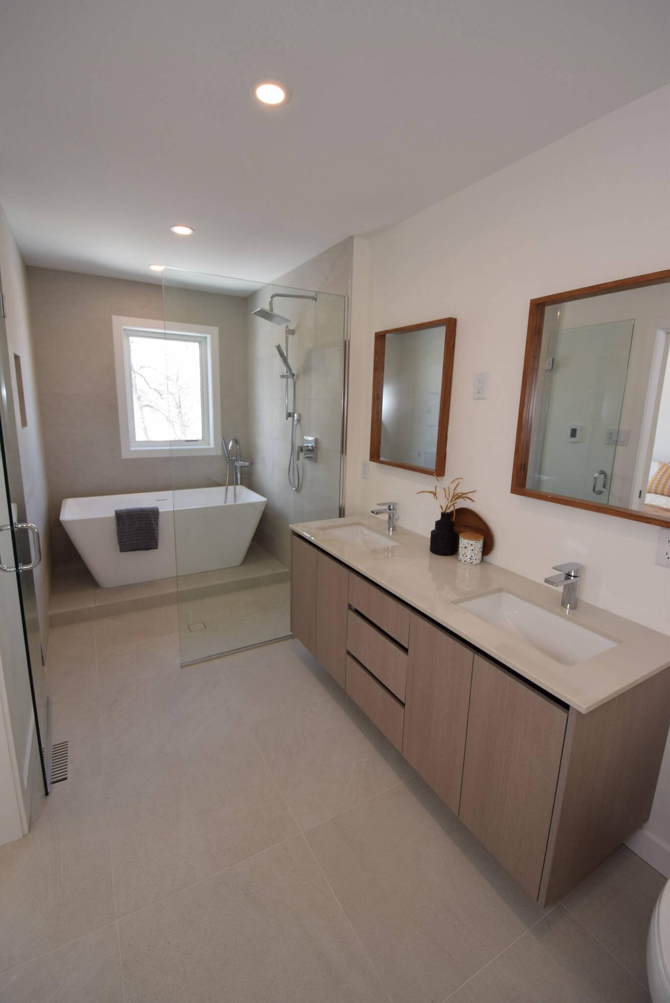 No corners were cut in the lower level bathroom, which (like the ensuite) features Dekton countertops and an elegant tile backsplash that defines the soaker tub/shower combo.