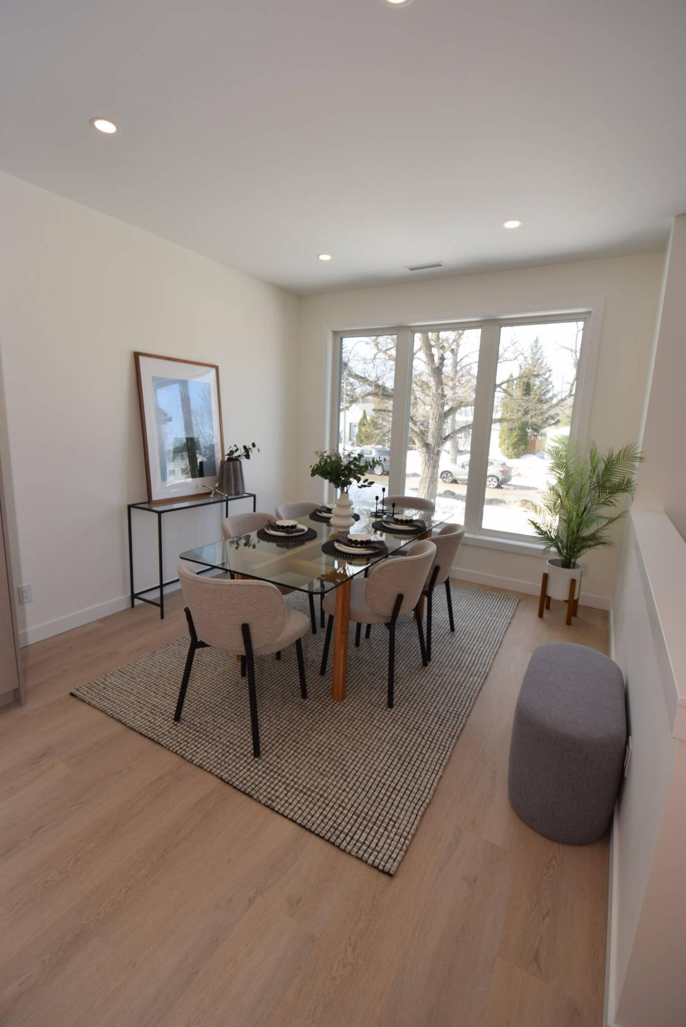 A huge window behind the expansive dining area lets in tons of natural light in Casa Mia Living’s two-story River Heights North design.