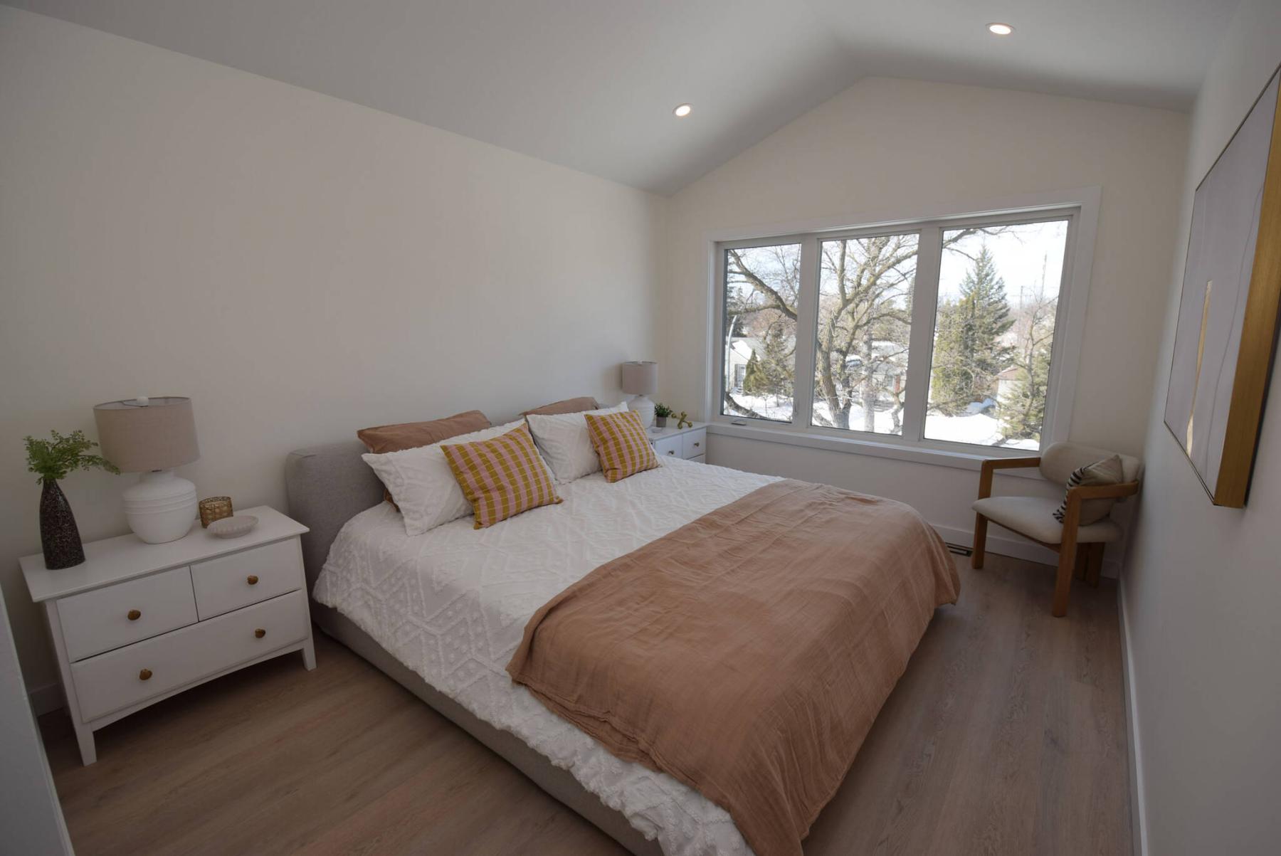 Naturally bright and set beneath a vaulted ceiling, the primary bedroom is a stylish, light-filled retreat.