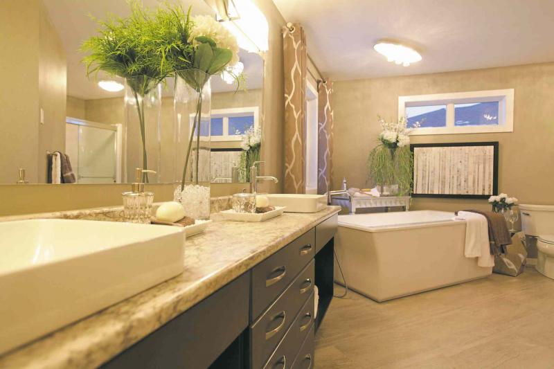 "It's a beautiful space that was designed to make you feel like you have your own day spa," Brar said. "It features a taupe tile floor, angled soaker tub placed between two windows (on the rear wall and adjacent wall), five-foot shower and dark maple vanity with dual raised sinks. There's also a huge walk-in closet with tons of built-in storage next to it."